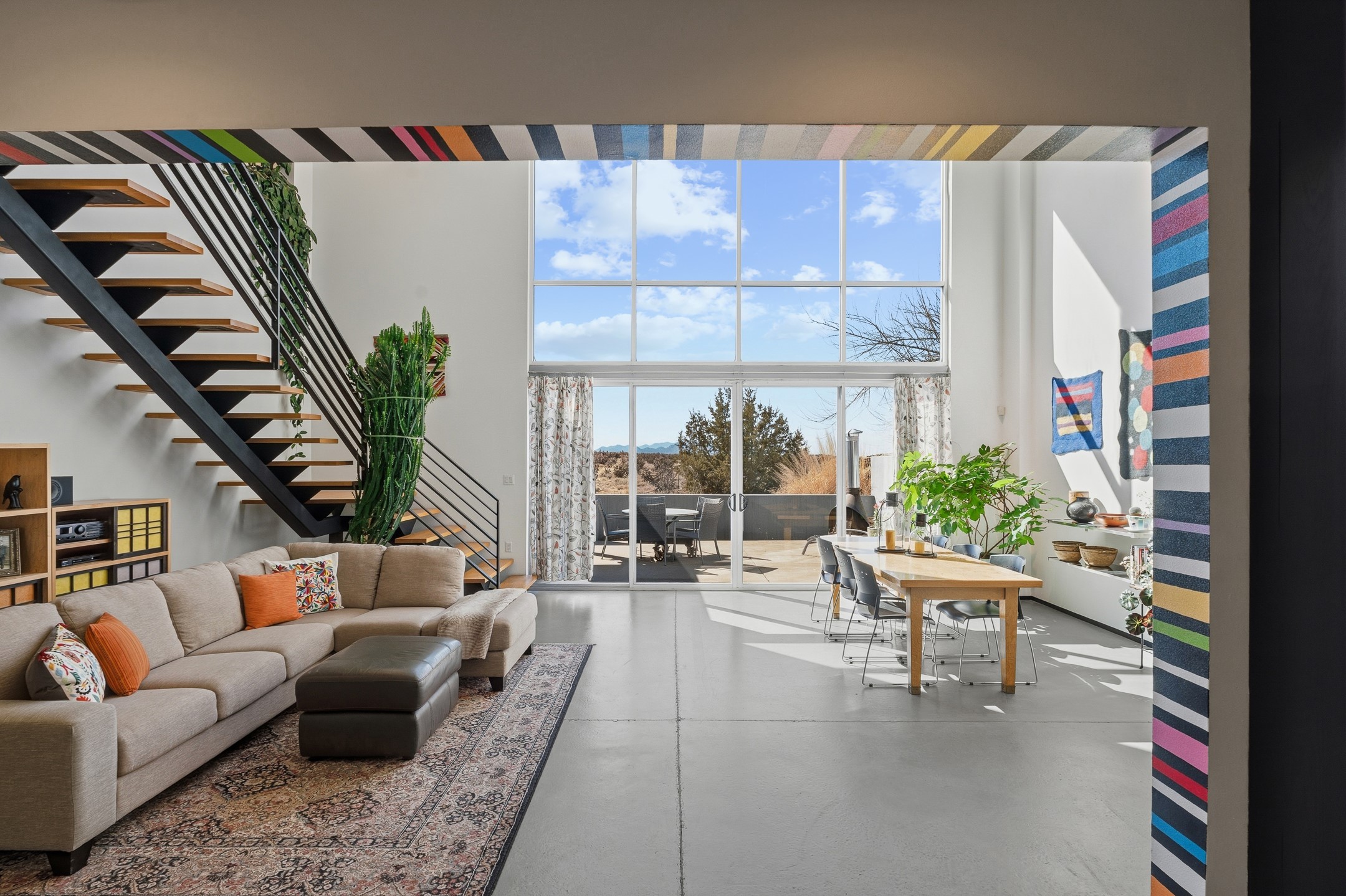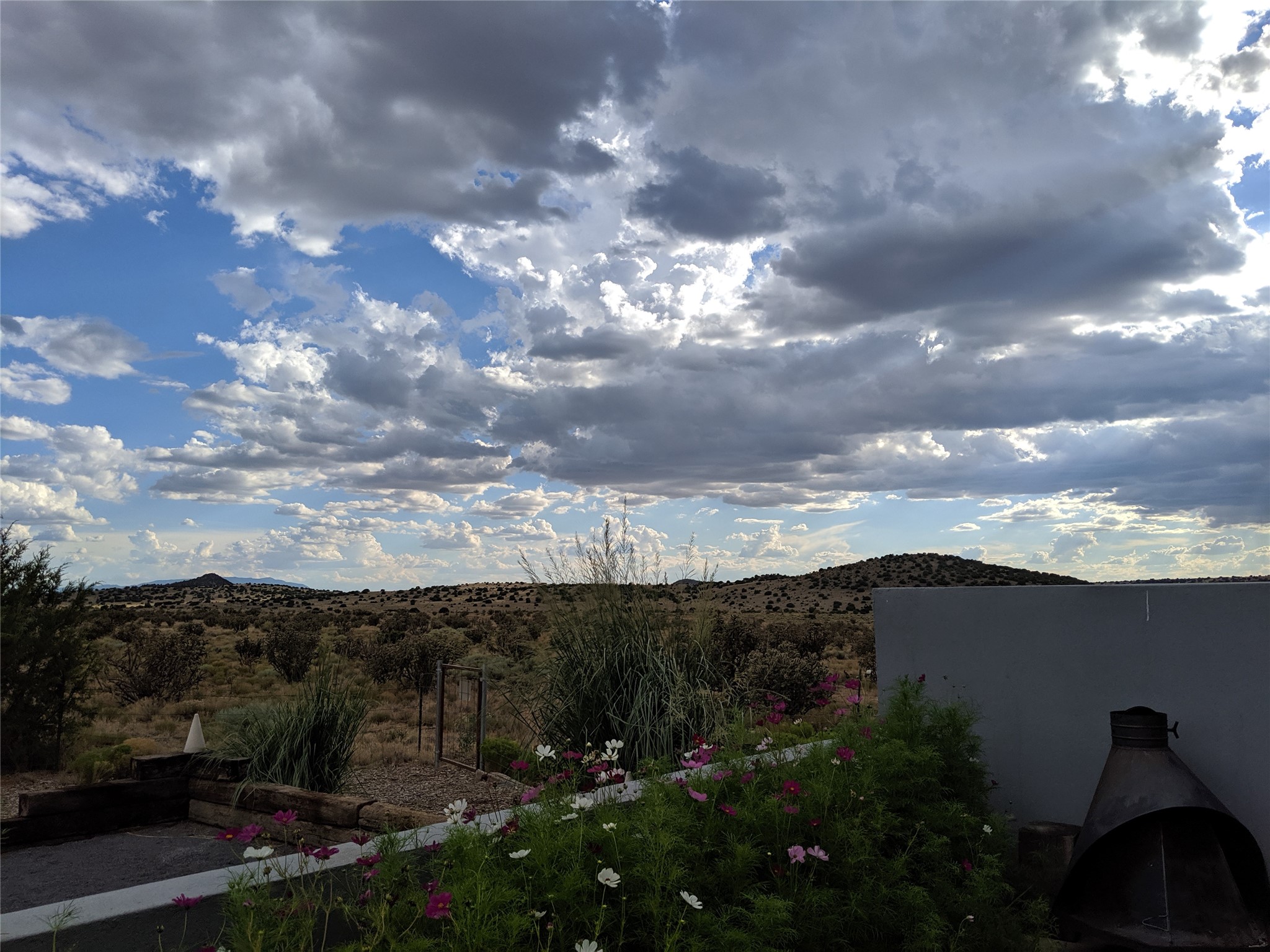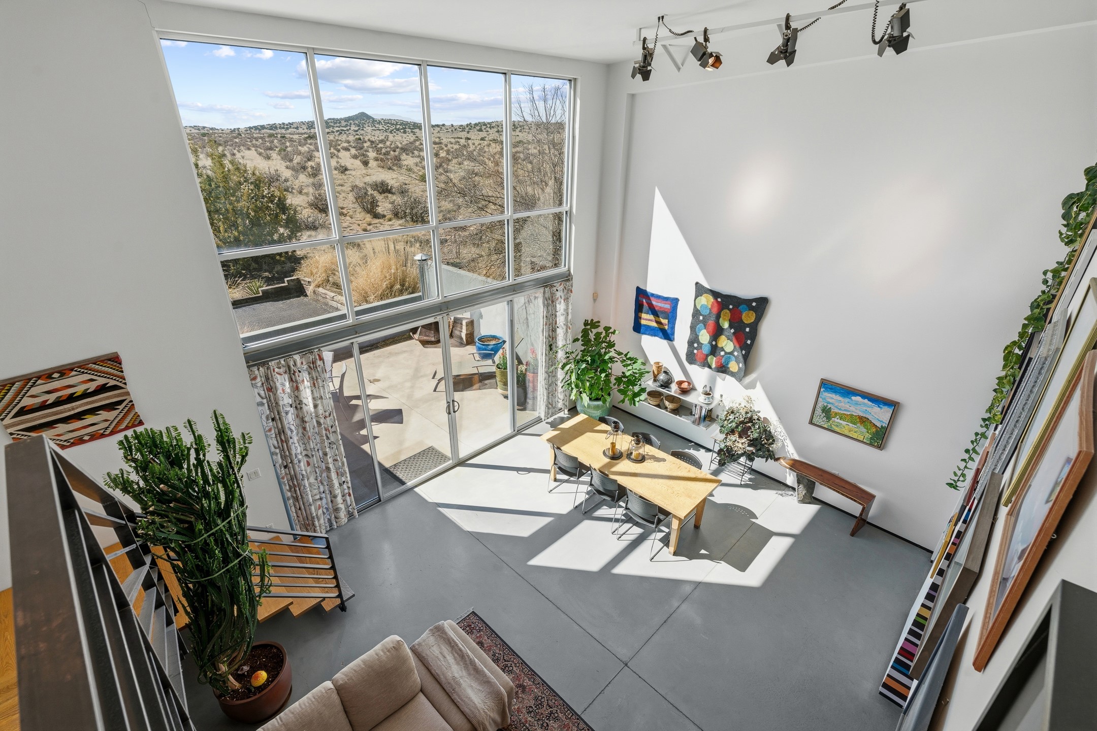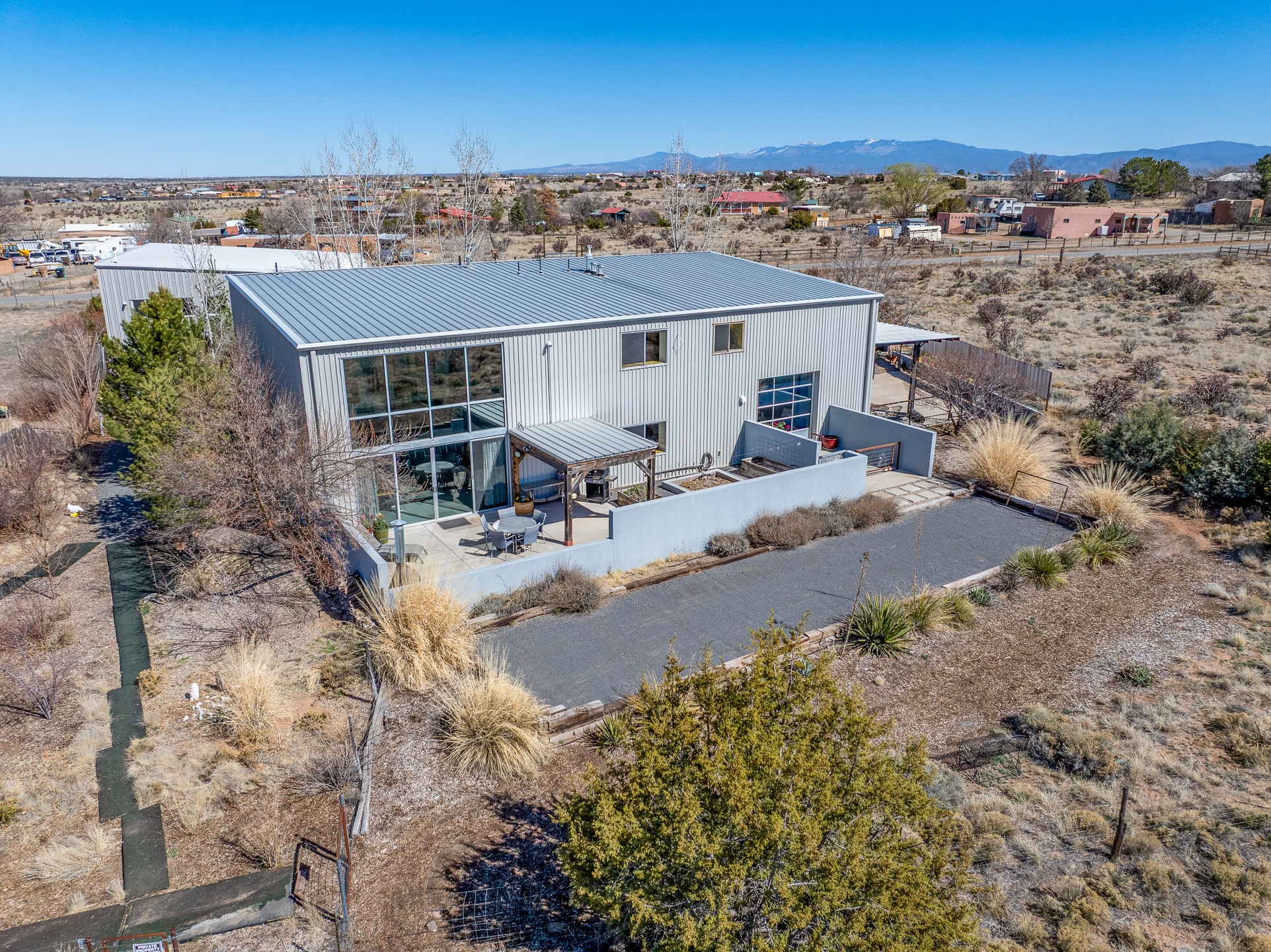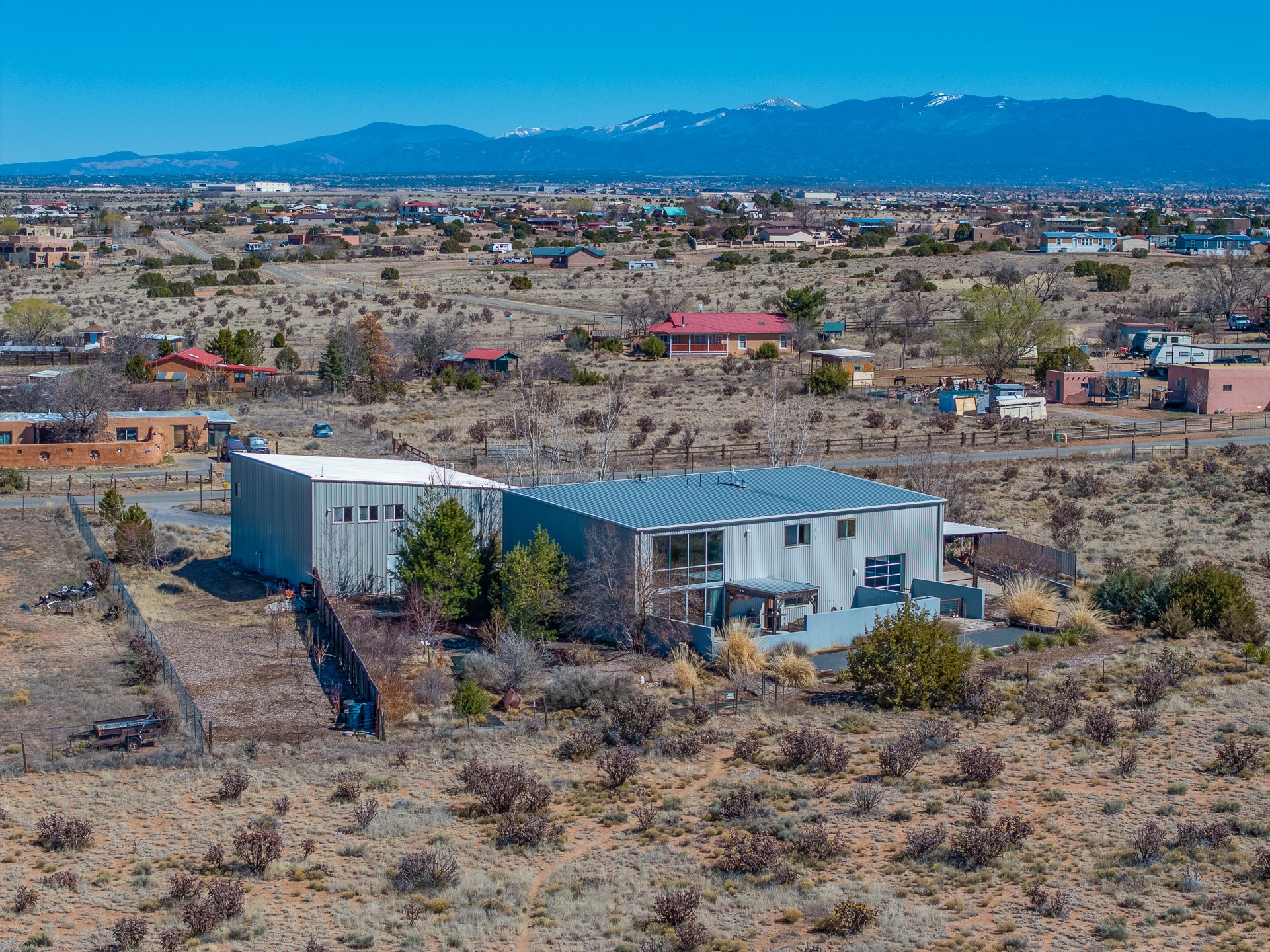 Sculptor-designed Modern Compound with Guesthouse, Shop with Unobstructed Views bordering BLM Land. Built in 2007 with exceptional craftsmanship, this custom steel-and-concrete home offers a rare blend of modern design, energy efficiency, & privacy on the edge of undevelopable BLM land. Commercial- grade windows & doors, 12" insulated walls (R-50), radiant in-floor heat, & mini-splits provide year-round comfort. Whole house catalytic carbon filtration for PFAS & contaminants. The main house features soaring 18-19.5' ceilings, concrete floors, passive solar living/dining spaces with dramatic 16' windows, & unobstructed views of the Ortiz Mountains, Cerrillos Hills, & Sandias. A chef's kitchen anchors thehome with stainless counters & island, cherry cabinetry, Viking range, Bosch dishwasher, double ovens, & a walk-in pantry. Quiet spaces include a library-style study/bedroom with built-ins on the main level, upstairs loft bedroom and TV/study areas, spa-like bath with slate and glass shower, and abundant storage. Sound-proofed construction separates the main house from the guesthouse for true privacy. The fully equipped guesthouse offers flexible living with radiant heat & mini splits, a full kitchen, steam shower, jetted tub, one bedroom plus a study, & dramatic operable glass garage doors which open to private patios--ideal for guests, rental income, or multigenerational living. A 3,100 sq ft insulated red iron steel shop (2014) with high-psi concrete floors for heavy equipment, pellet stove, plumbing (1/2 bath), including 1,100 sq ft loft, and 3-phase power is perfect for artists, or serious tradespeople. Outside, enjoy a fully fenced, irrigated landscape.A gardener's dream! with over 80 native & fruit trees, an edible forest garden with serviceberries, buffaloberry, elderberry, gooseberry, red and yellow currants, raspberries, native plum & cherry. The setting is expansive, & visually stunning, with seasonal cactus blooms across the protected BLM land with easy access to trails and the Santa Fe River.