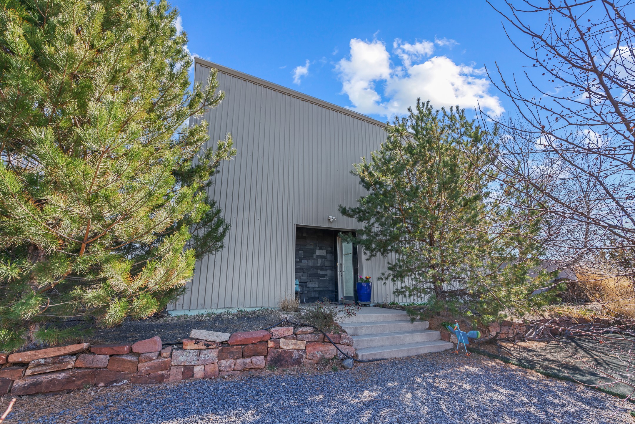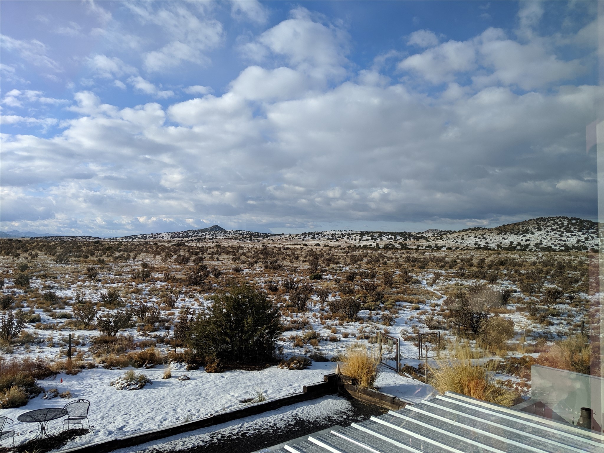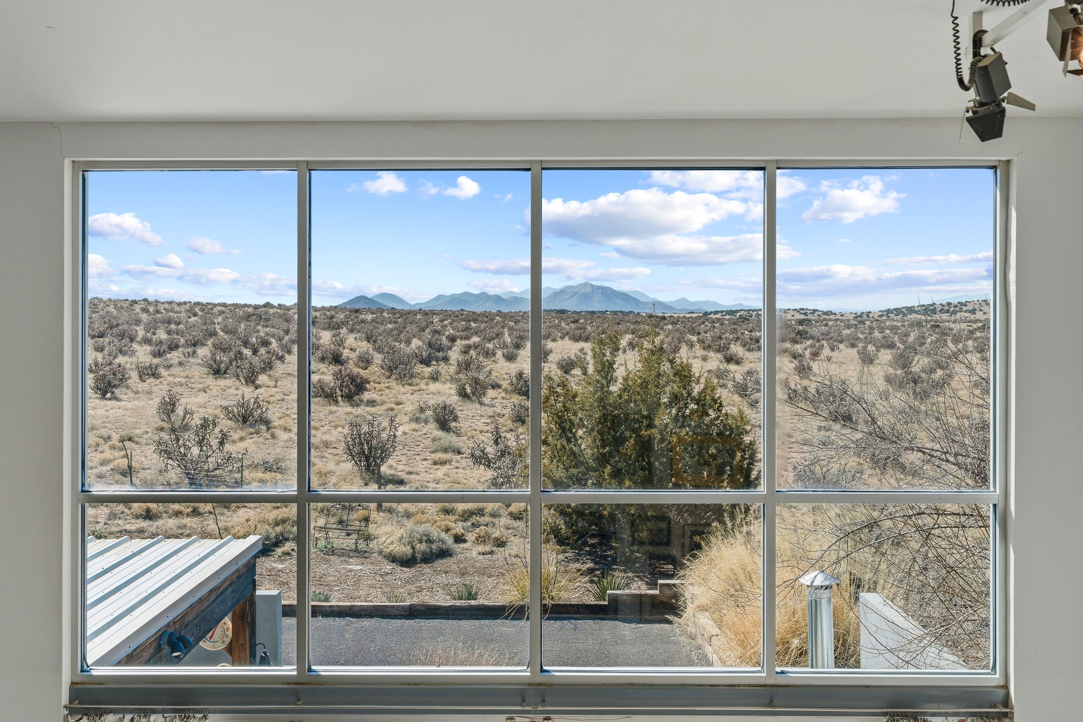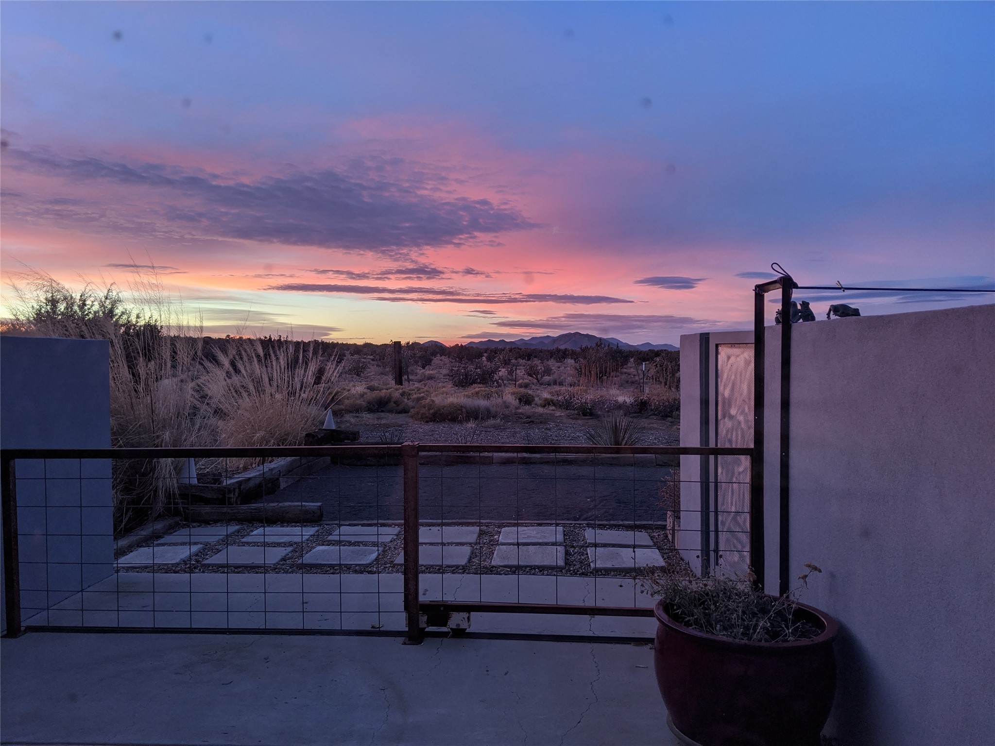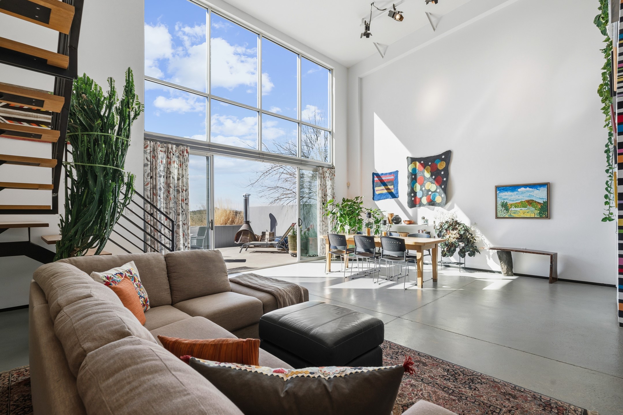 Sculptor-designed Modern Compound with Guesthouse, Shop with Unobstructed Views bordering BLM Land. Built in 2007 with exceptional craftsmanship, this custom steel-and-concrete home offers a rare blend of modern design, energy efficiency, & privacy on the edge of undevelopable BLM land. Commercial- grade windows & doors, 12" insulated walls (R-50), radiant in-floor heat, & mini-splits provide year-round comfort. Whole house catalytic carbon filtration for PFAS & contaminants. The main house features soaring 18-19.5' ceilings, concrete floors, passive solar living/dining spaces with dramatic 16' windows, & unobstructed views of the Ortiz Mountains, Cerrillos Hills, & Sandias. A chef's kitchen anchors thehome with stainless counters & island, cherry cabinetry, Viking range, Bosch dishwasher, double ovens, & a walk-in pantry. Quiet spaces include a library-style study/bedroom with built-ins on the main level, upstairs loft bedroom and TV/study areas, spa-like bath with slate and glass shower, and abundant storage. Sound-proofed construction separates the main house from the guesthouse for true privacy. The fully equipped guesthouse offers flexible living with radiant heat & mini splits, a full kitchen, steam shower, jetted tub, one bedroom plus a study, & dramatic operable glass garage doors which open to private patios--ideal for guests, rental income, or multigenerational living. A 3,100 sq ft insulated red iron steel shop (2014) with high-psi concrete floors for heavy equipment, pellet stove, plumbing (1/2 bath), including 1,100 sq ft loft, and 3-phase power is perfect for artists, or serious tradespeople. Outside, enjoy a fully fenced, irrigated landscape.A gardener's dream! with over 80 native & fruit trees, an edible forest garden with serviceberries, buffaloberry, elderberry, gooseberry, red and yellow currants, raspberries, native plum & cherry. The setting is expansive, & visually stunning, with seasonal cactus blooms across the protected BLM land with easy access to trails and the Santa Fe River.