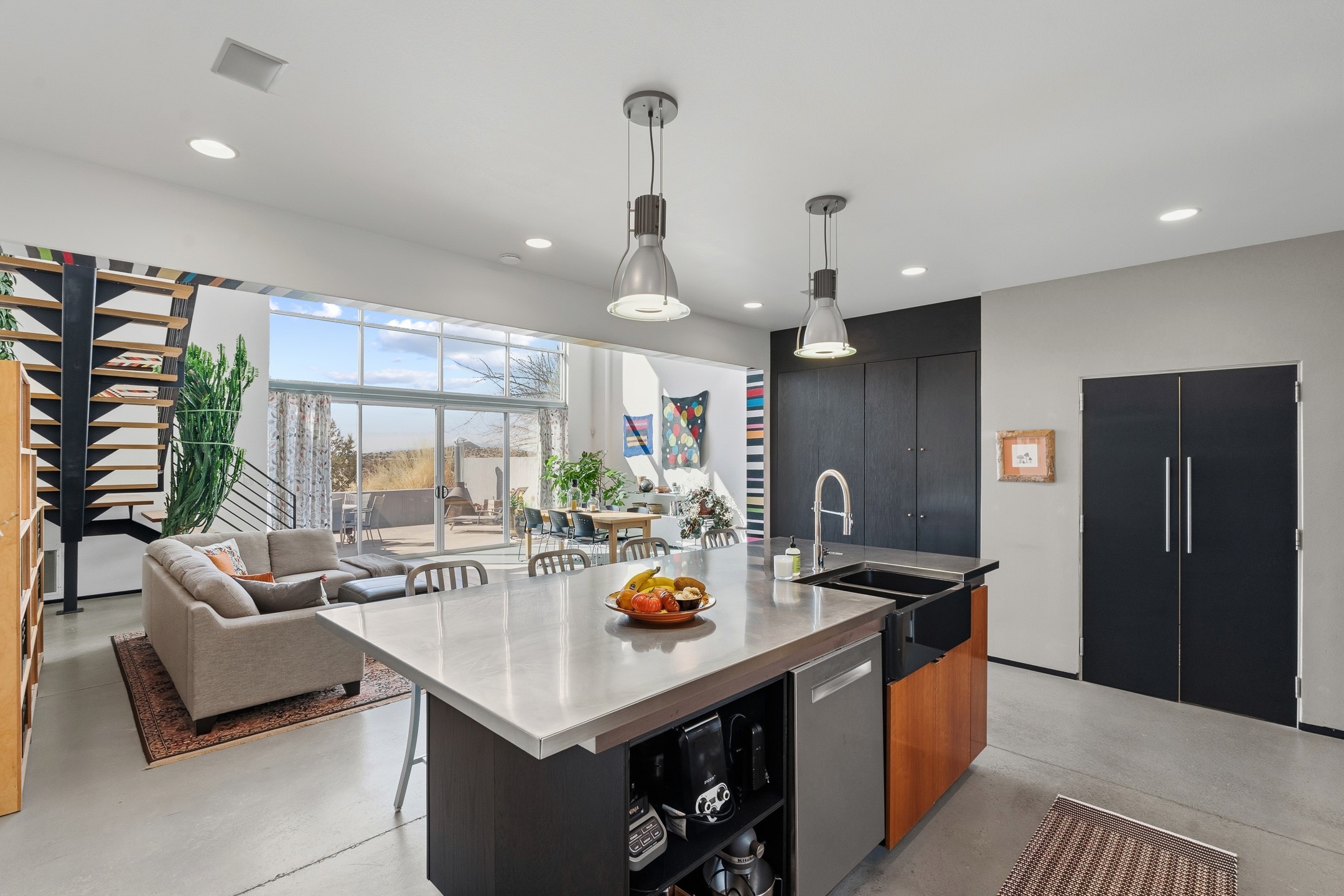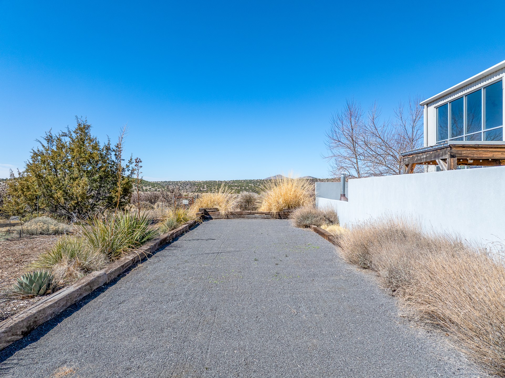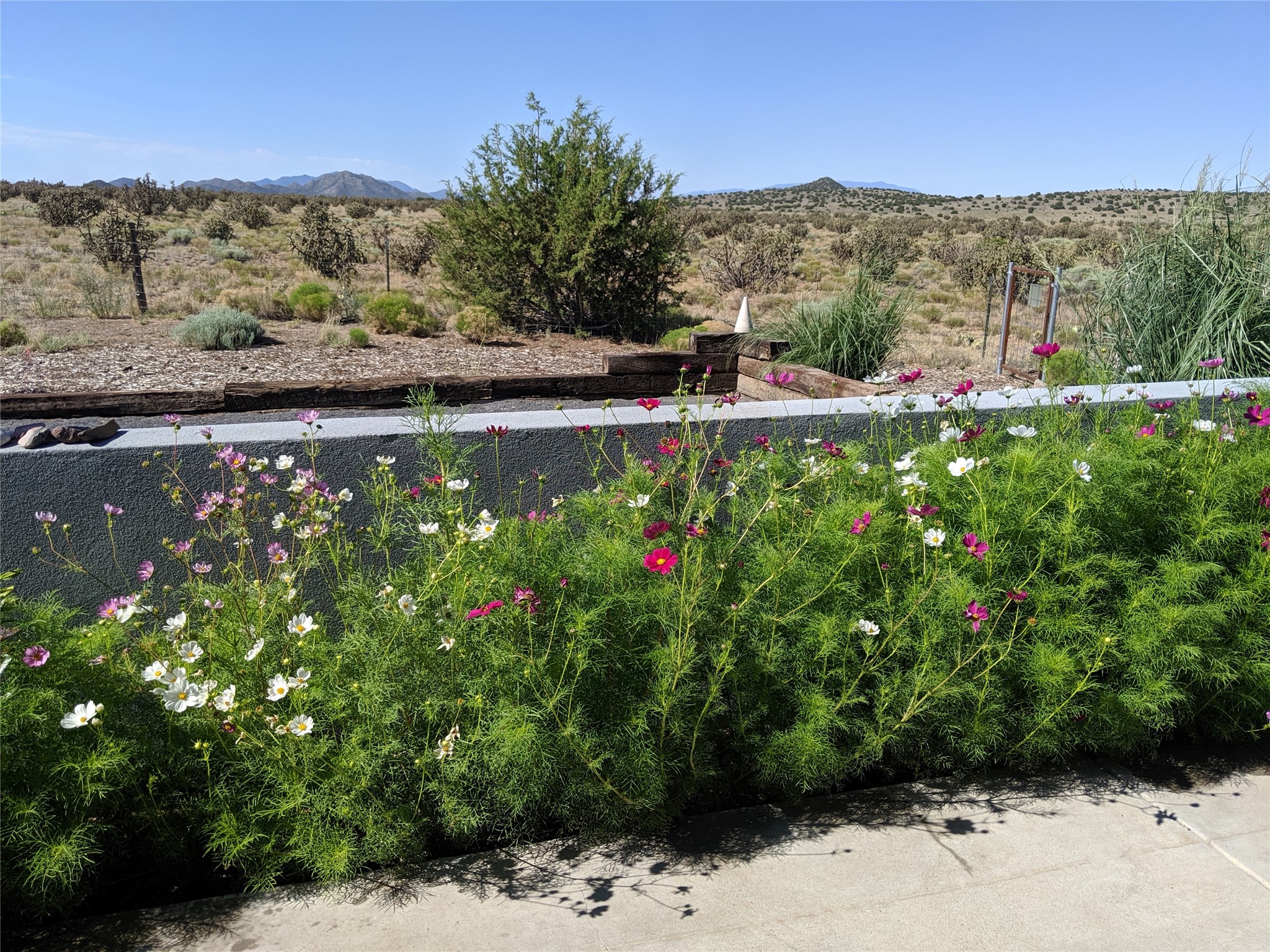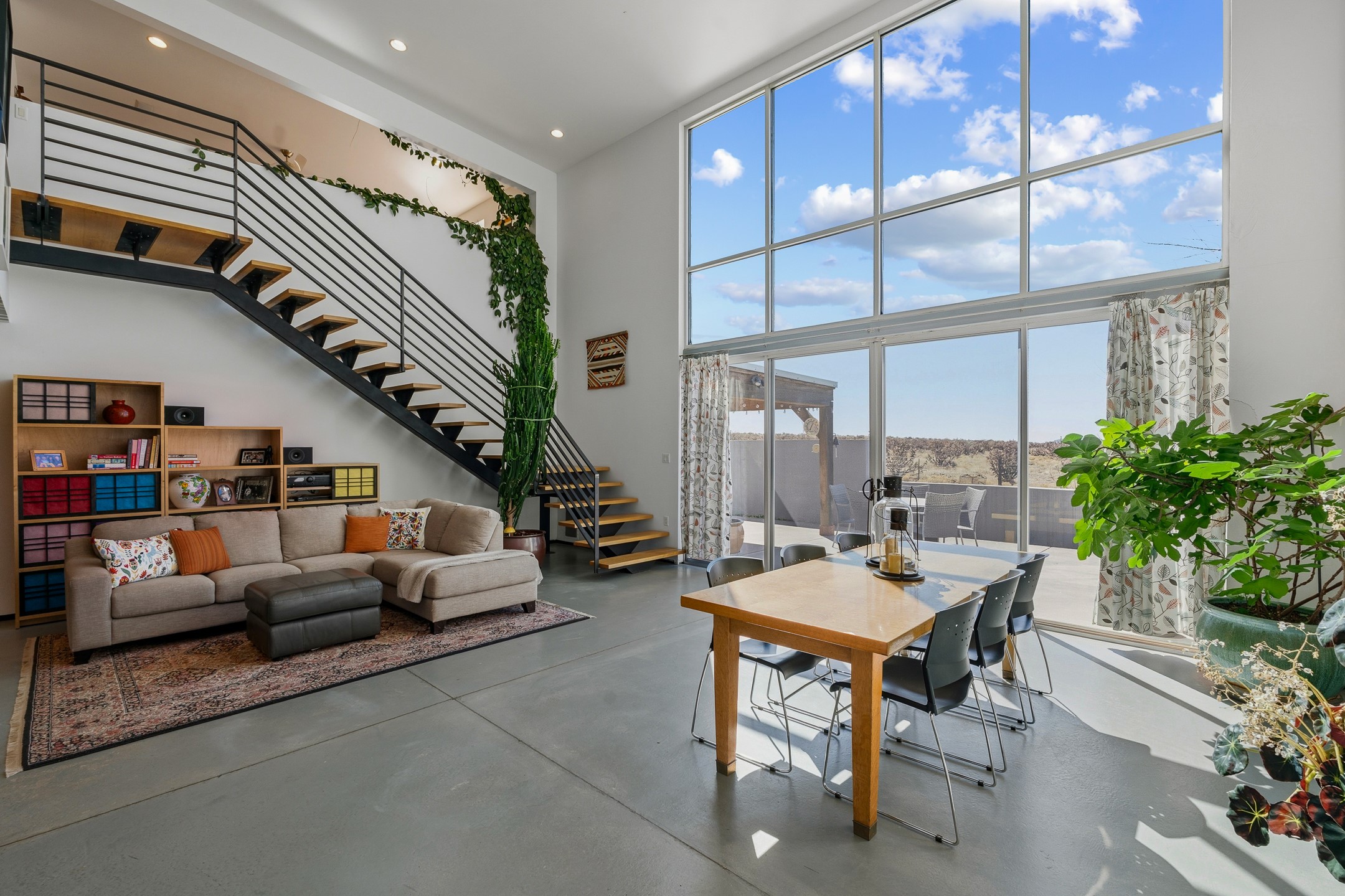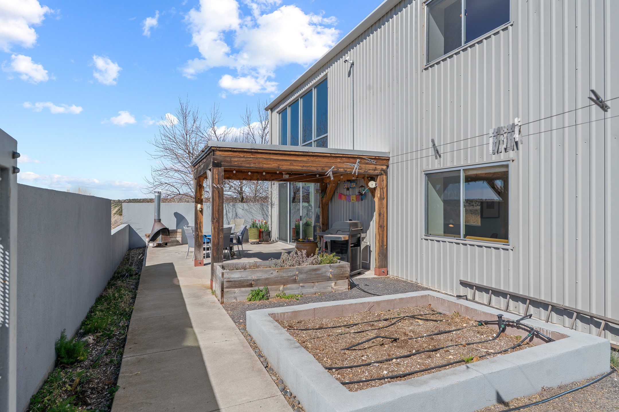 Sculptor-designed Modern Compound with Guesthouse, Shop with Unobstructed Views bordering BLM Land. Built in 2007 with exceptional craftsmanship, this custom steel-and-concrete home offers a rare blend of modern design, energy efficiency, & privacy on the edge of undevelopable BLM land. Commercial- grade windows & doors, 12" insulated walls (R-50), radiant in-floor heat, & mini-splits provide year-round comfort. Whole house catalytic carbon filtration for PFAS & contaminants. The main house features soaring 18-19.5' ceilings, concrete floors, passive solar living/dining spaces with dramatic 16' windows, & unobstructed views of the Ortiz Mountains, Cerrillos Hills, & Sandias. A chef's kitchen anchors thehome with stainless counters & island, cherry cabinetry, Viking range, Bosch dishwasher, double ovens, & a walk-in pantry. Quiet spaces include a library-style study/bedroom with built-ins on the main level, upstairs loft bedroom and TV/study areas, spa-like bath with slate and glass shower, and abundant storage. Sound-proofed construction separates the main house from the guesthouse for true privacy. The fully equipped guesthouse offers flexible living with radiant heat & mini splits, a full kitchen, steam shower, jetted tub, one bedroom plus a study, & dramatic operable glass garage doors which open to private patios--ideal for guests, rental income, or multigenerational living. A 3,100 sq ft insulated red iron steel shop (2014) with high-psi concrete floors for heavy equipment, pellet stove, plumbing (1/2 bath), including 1,100 sq ft loft, and 3-phase power is perfect for artists, or serious tradespeople. Outside, enjoy a fully fenced, irrigated landscape.A gardener's dream! with over 80 native & fruit trees, an edible forest garden with serviceberries, buffaloberry, elderberry, gooseberry, red and yellow currants, raspberries, native plum & cherry. The setting is expansive, & visually stunning, with seasonal cactus blooms across the protected BLM land with easy access to trails and the Santa Fe River.