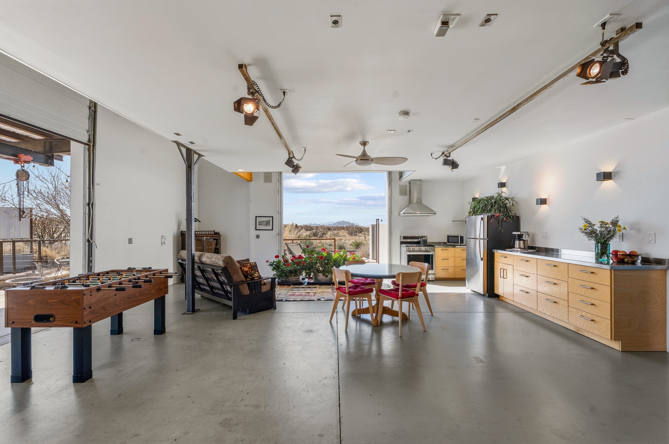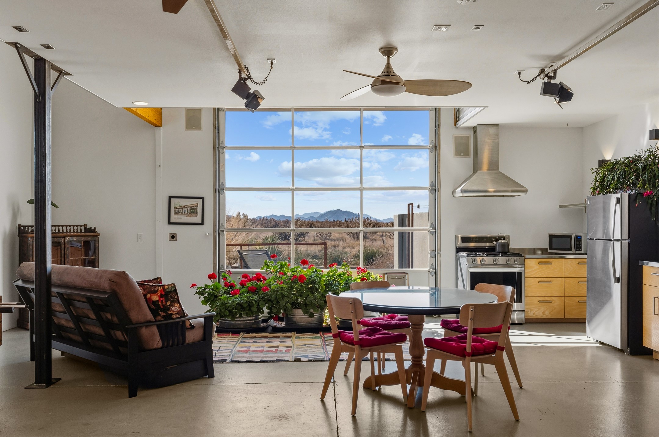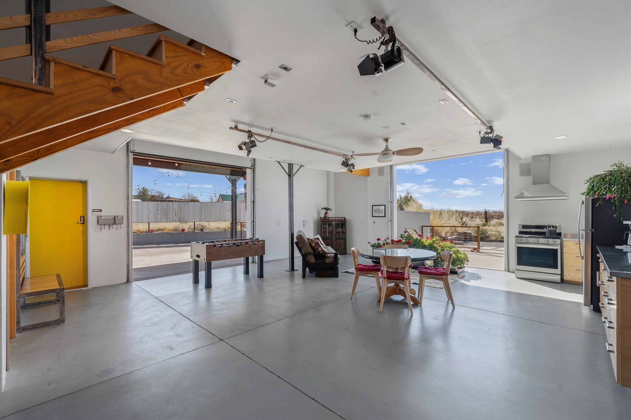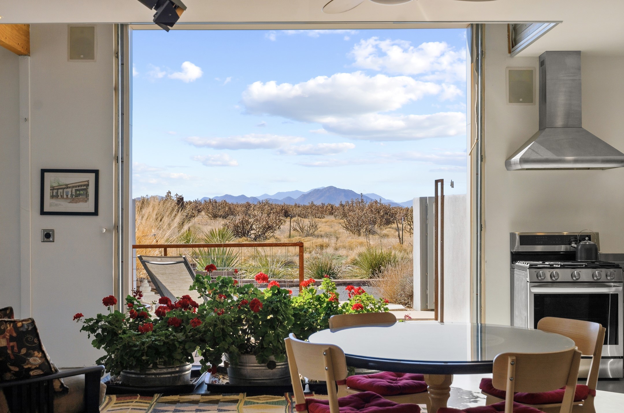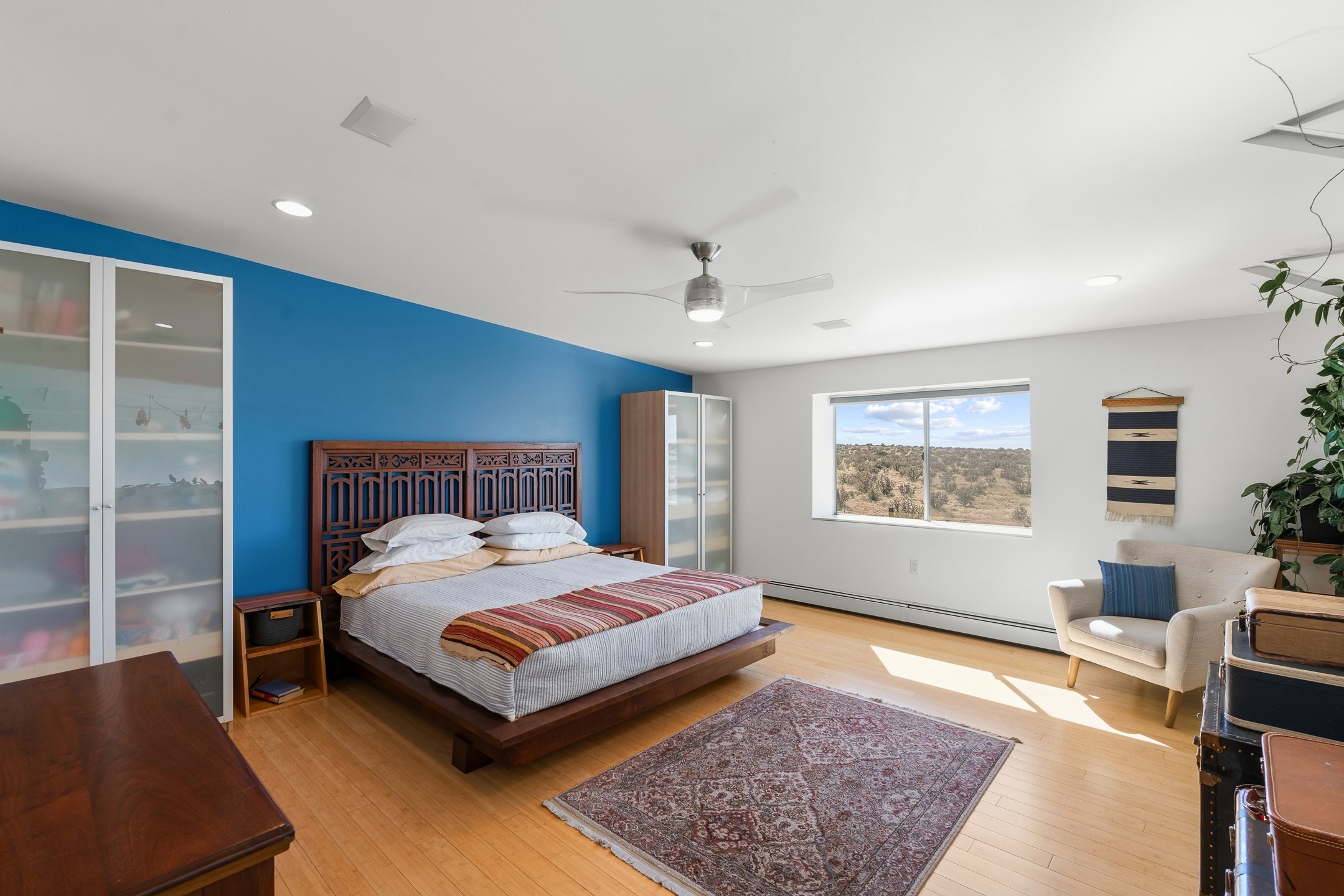 Sculptor-designed Modern Compound with Guesthouse, Shop with Unobstructed Views bordering BLM Land. Built in 2007 with exceptional craftsmanship, this custom steel-and-concrete home offers a rare blend of modern design, energy efficiency, & privacy on the edge of undevelopable BLM land. Commercial- grade windows & doors, 12" insulated walls (R-50), radiant in-floor heat, & mini-splits provide year-round comfort. Whole house catalytic carbon filtration for PFAS & contaminants. The main house features soaring 18-19.5' ceilings, concrete floors, passive solar living/dining spaces with dramatic 16' windows, & unobstructed views of the Ortiz Mountains, Cerrillos Hills, & Sandias. A chef's kitchen anchors thehome with stainless counters & island, cherry cabinetry, Viking range, Bosch dishwasher, double ovens, & a walk-in pantry. Quiet spaces include a library-style study/bedroom with built-ins on the main level, upstairs loft bedroom and TV/study areas, spa-like bath with slate and glass shower, and abundant storage. Sound-proofed construction separates the main house from the guesthouse for true privacy. The fully equipped guesthouse offers flexible living with radiant heat & mini splits, a full kitchen, steam shower, jetted tub, one bedroom plus a study, & dramatic operable glass garage doors which open to private patios--ideal for guests, rental income, or multigenerational living. A 3,100 sq ft insulated red iron steel shop (2014) with high-psi concrete floors for heavy equipment, pellet stove, plumbing (1/2 bath), including 1,100 sq ft loft, and 3-phase power is perfect for artists, or serious tradespeople. Outside, enjoy a fully fenced, irrigated landscape.A gardener's dream! with over 80 native & fruit trees, an edible forest garden with serviceberries, buffaloberry, elderberry, gooseberry, red and yellow currants, raspberries, native plum & cherry. The setting is expansive, & visually stunning, with seasonal cactus blooms across the protected BLM land with easy access to trails and the Santa Fe River.