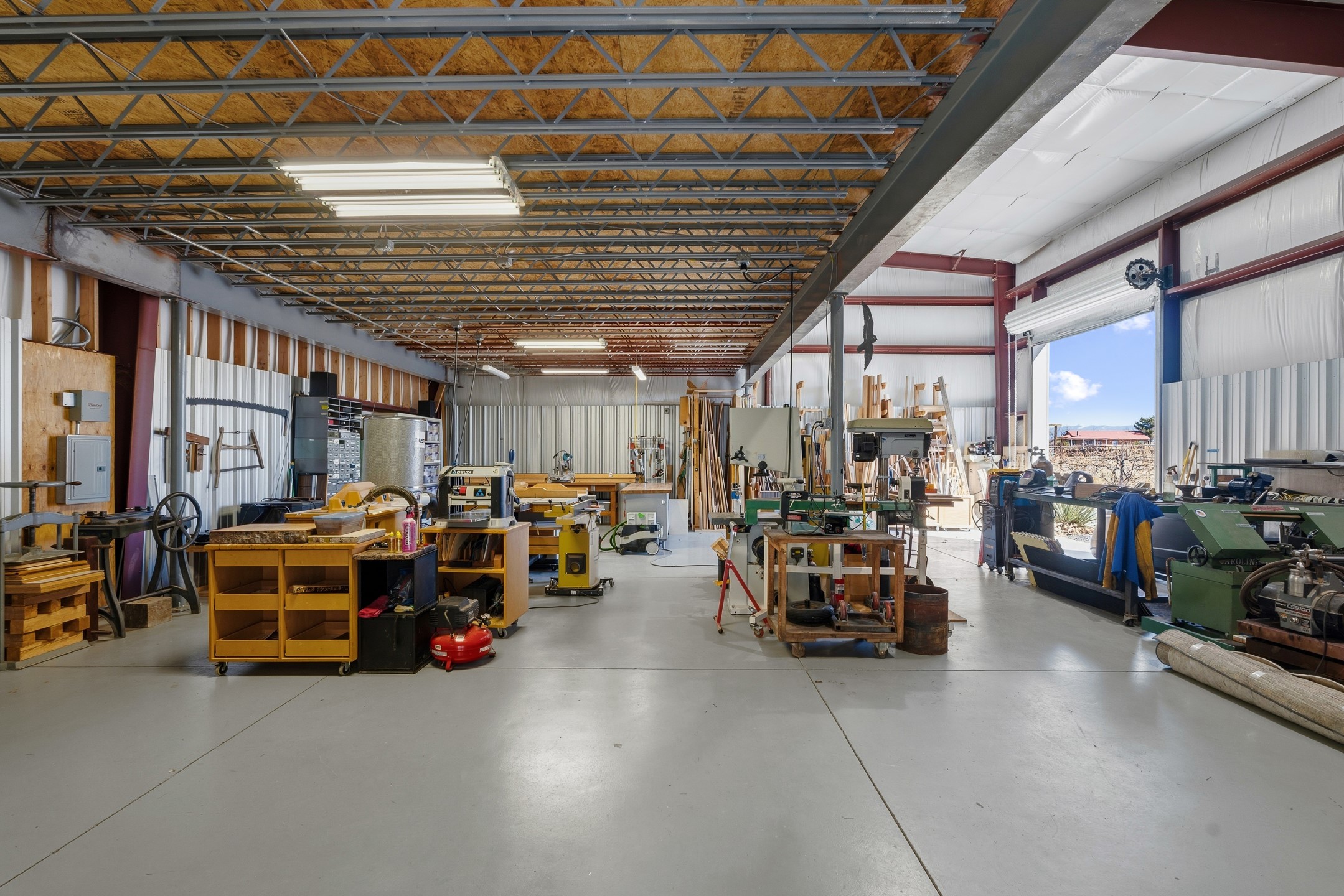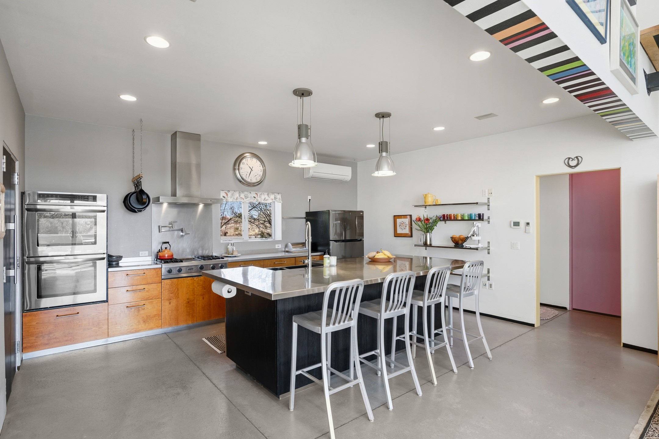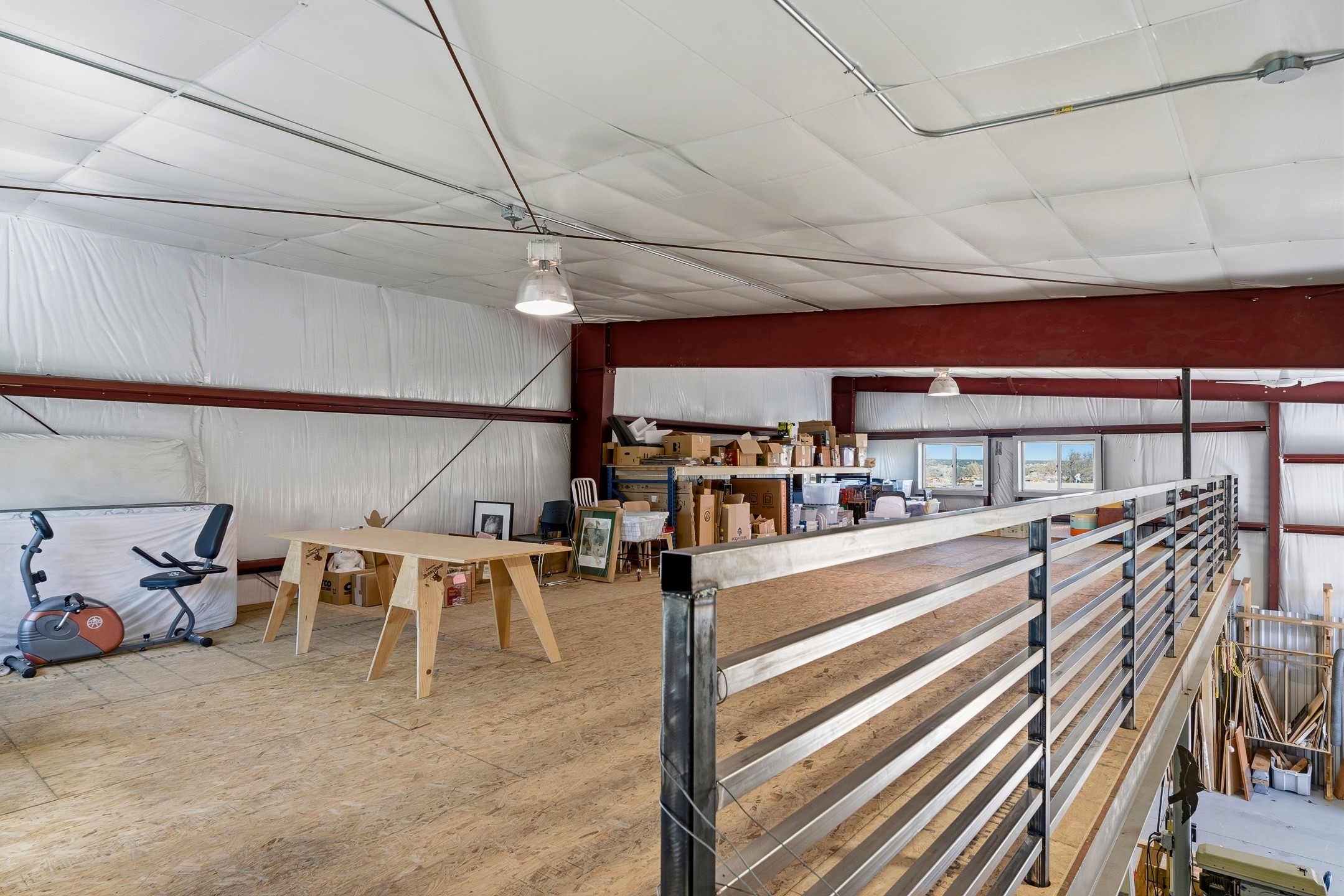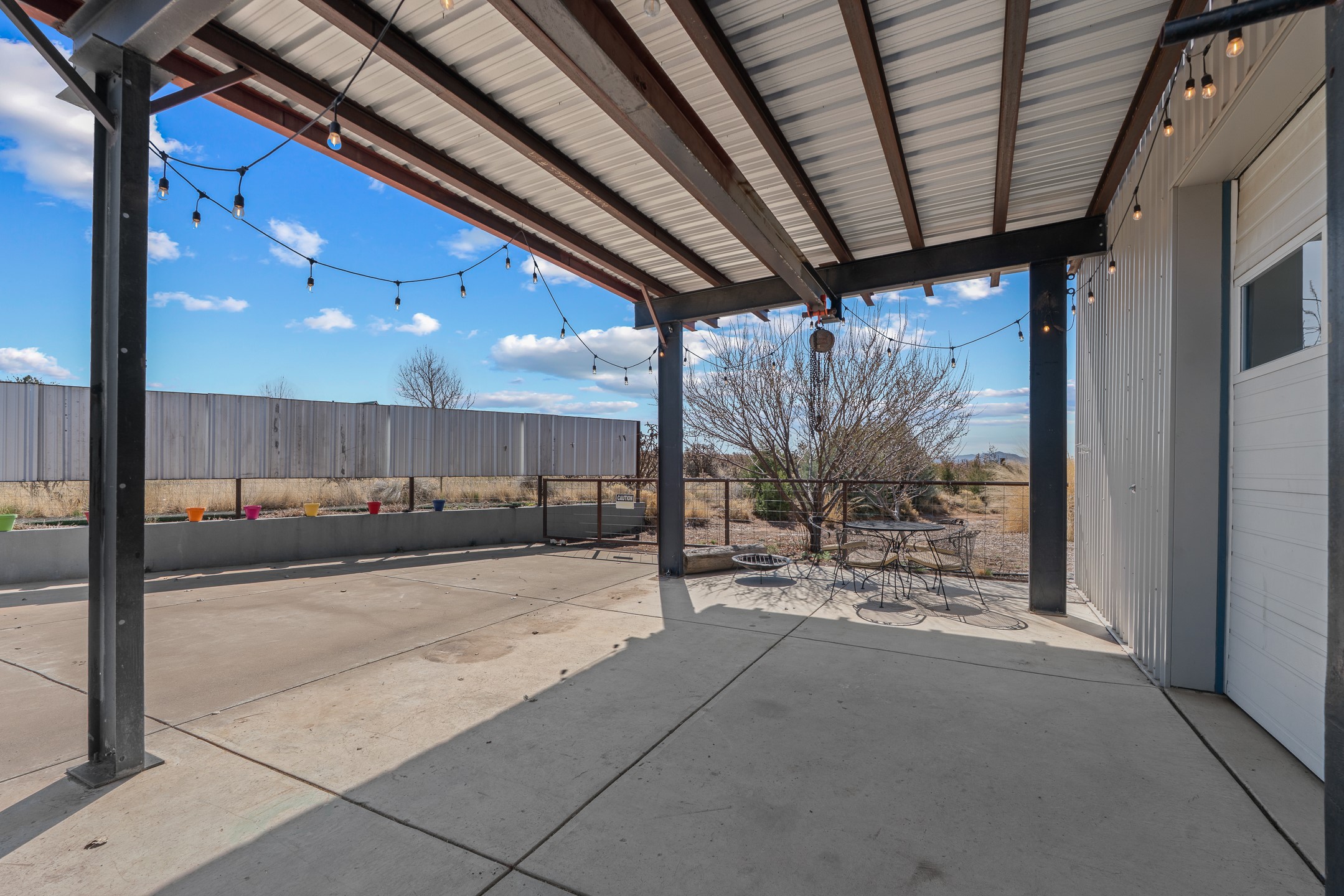 Sculptor-designed Modern Compound with Guesthouse, Shop with Unobstructed Views bordering BLM Land. Built in 2007 with exceptional craftsmanship, this custom steel-and-concrete home offers a rare blend of modern design, energy efficiency, & privacy on the edge of undevelopable BLM land. Commercial- grade windows & doors, 12" insulated walls (R-50), radiant in-floor heat, & mini-splits provide year-round comfort. Whole house catalytic carbon filtration for PFAS & contaminants. The main house features soaring 18-19.5' ceilings, concrete floors, passive solar living/dining spaces with dramatic 16' windows, & unobstructed views of the Ortiz Mountains, Cerrillos Hills, & Sandias. A chef's kitchen anchors thehome with stainless counters & island, cherry cabinetry, Viking range, Bosch dishwasher, double ovens, & a walk-in pantry. Quiet spaces include a library-style study/bedroom with built-ins on the main level, upstairs loft bedroom and TV/study areas, spa-like bath with slate and glass shower, and abundant storage. Sound-proofed construction separates the main house from the guesthouse for true privacy. The fully equipped guesthouse offers flexible living with radiant heat & mini splits, a full kitchen, steam shower, jetted tub, one bedroom plus a study, & dramatic operable glass garage doors which open to private patios--ideal for guests, rental income, or multigenerational living. A 3,100 sq ft insulated red iron steel shop (2014) with high-psi concrete floors for heavy equipment, pellet stove, plumbing (1/2 bath), including 1,100 sq ft loft, and 3-phase power is perfect for artists, or serious tradespeople. Outside, enjoy a fully fenced, irrigated landscape.A gardener's dream! with over 80 native & fruit trees, an edible forest garden with serviceberries, buffaloberry, elderberry, gooseberry, red and yellow currants, raspberries, native plum & cherry. The setting is expansive, & visually stunning, with seasonal cactus blooms across the protected BLM land with easy access to trails and the Santa Fe River.