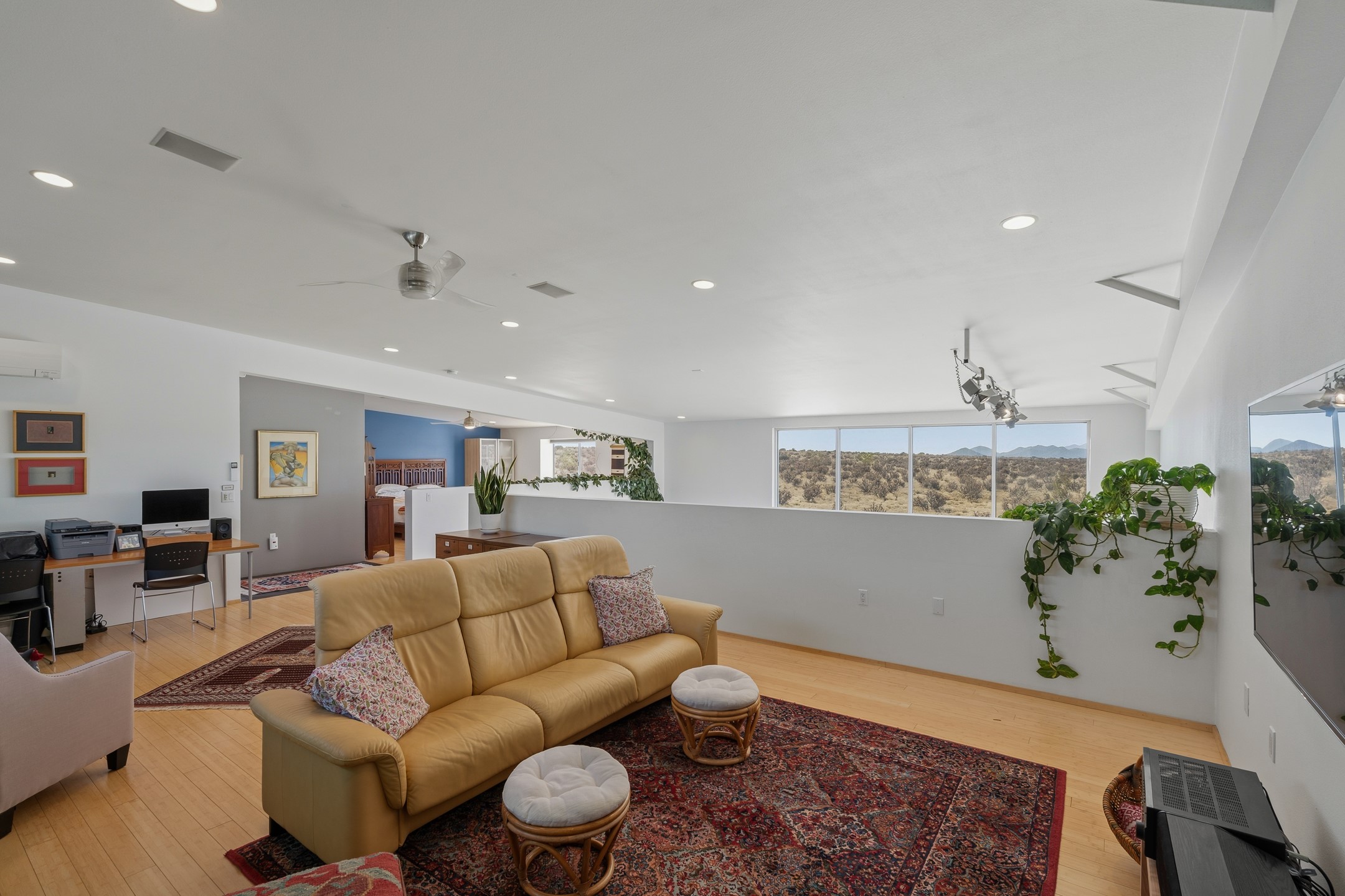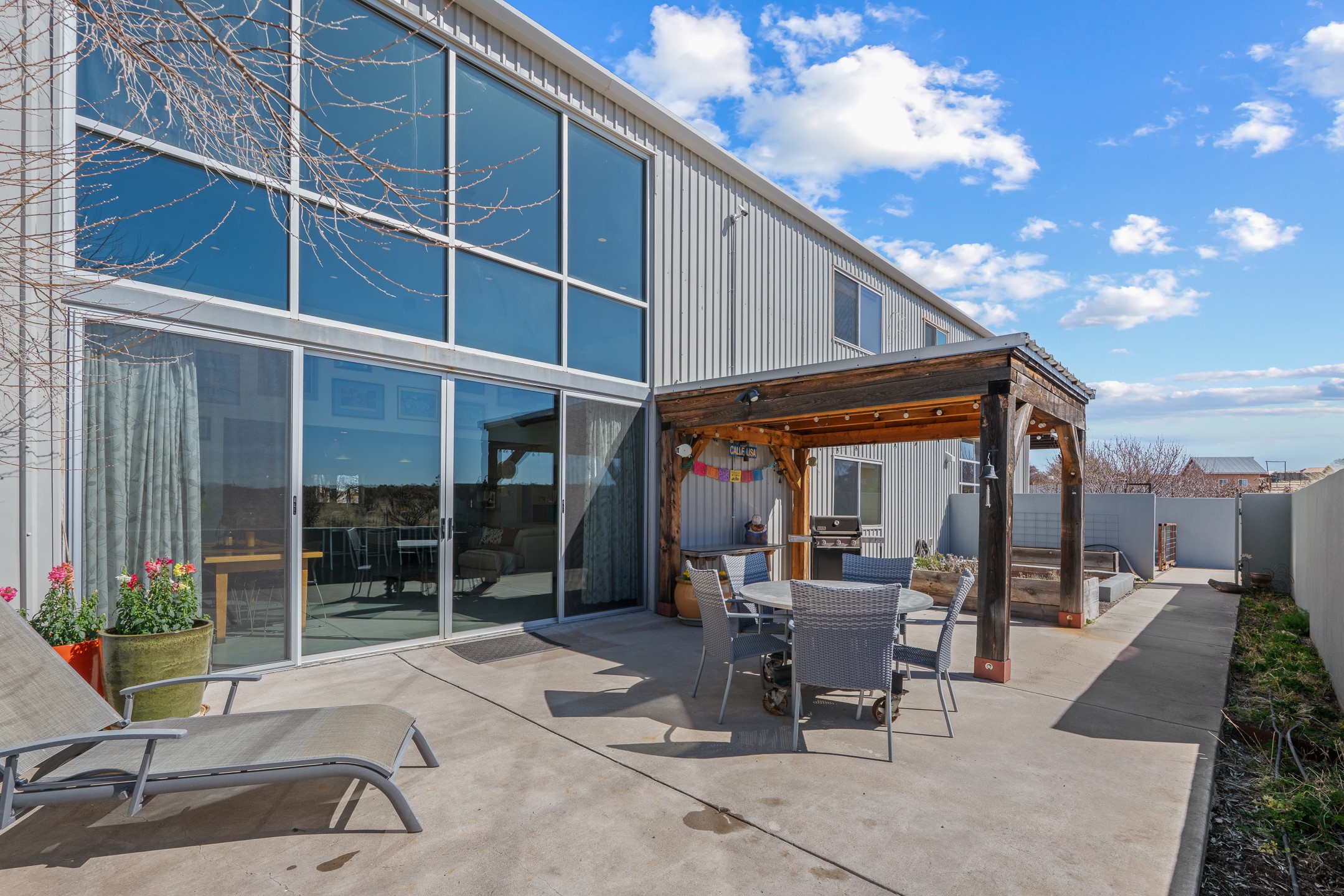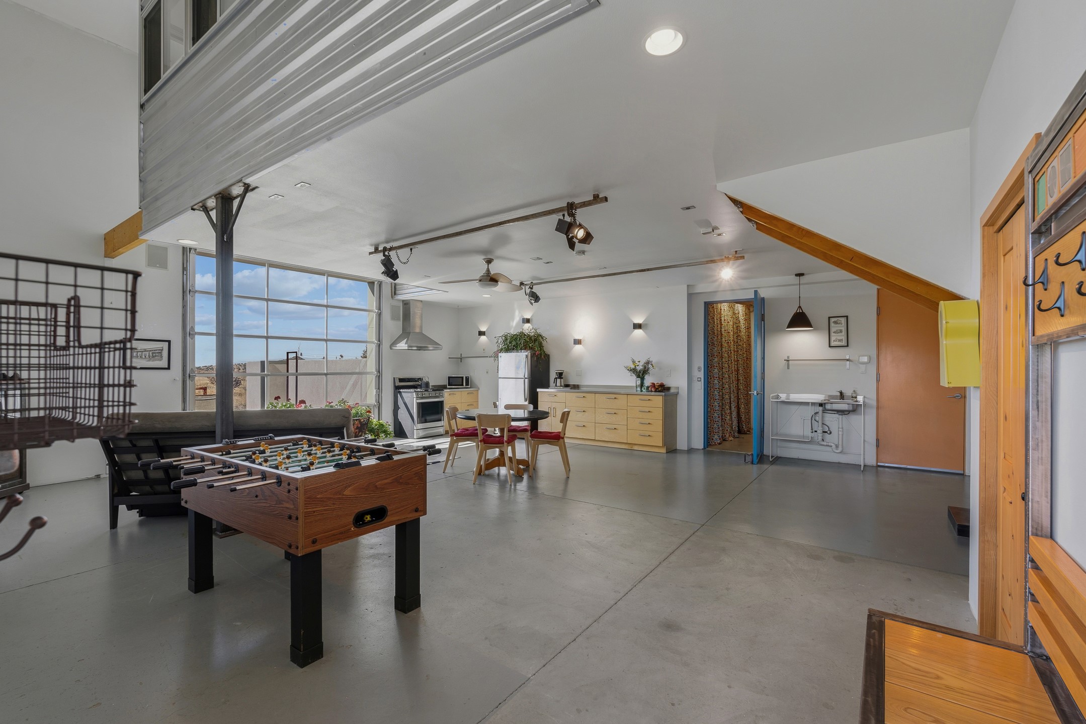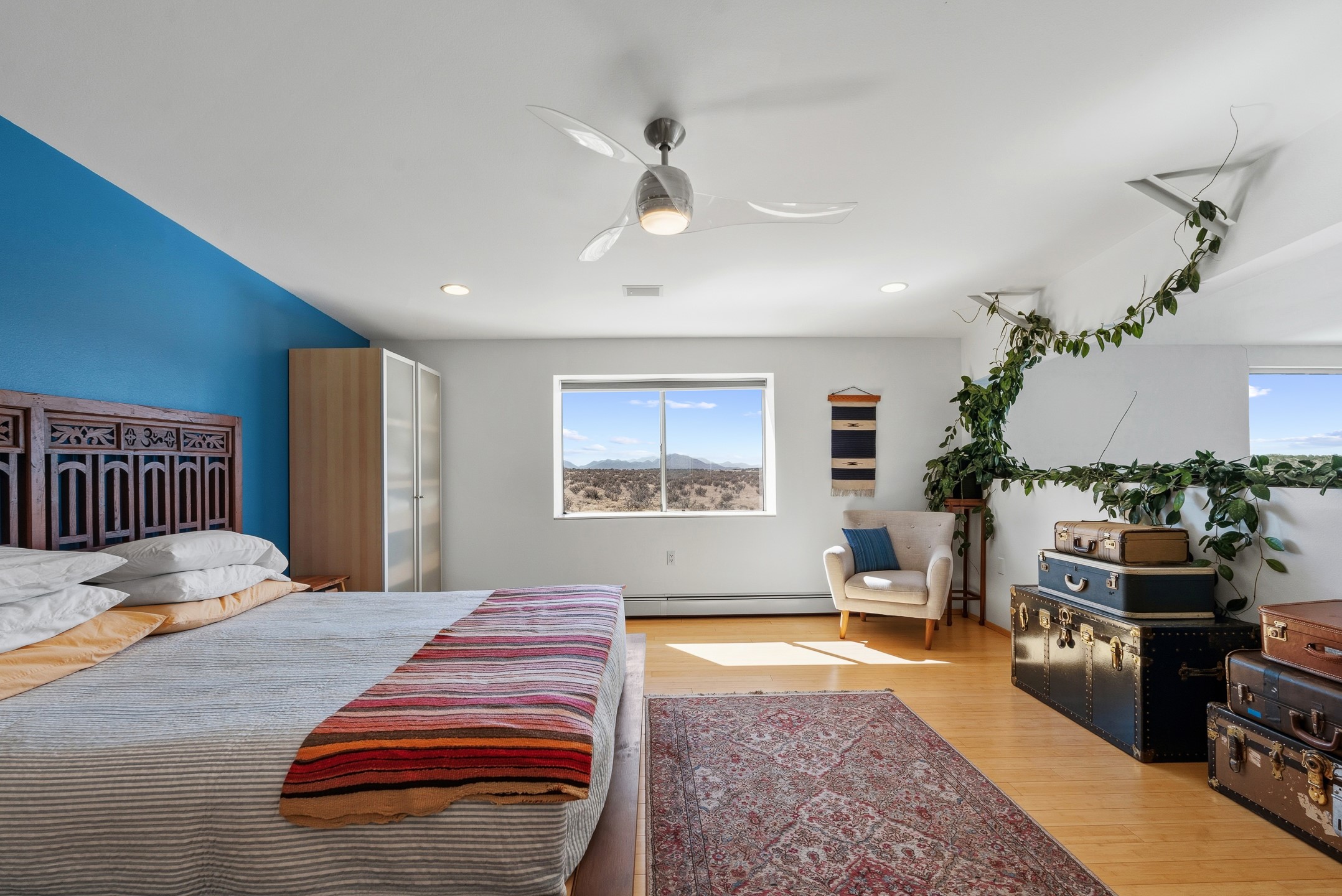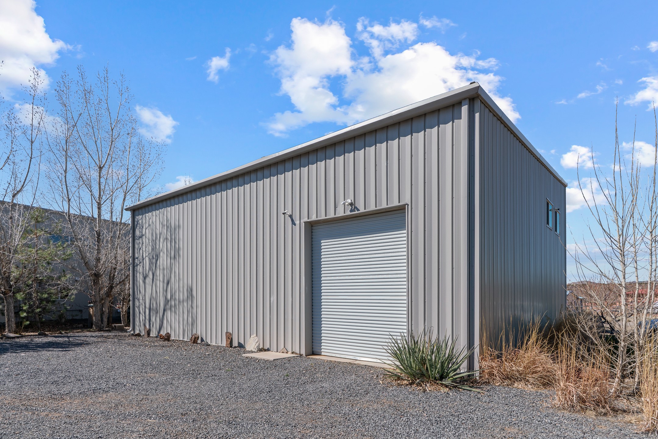 Sculptor-designed Modern Compound with Guesthouse, Shop with Unobstructed Views bordering BLM Land. Built in 2007 with exceptional craftsmanship, this custom steel-and-concrete home offers a rare blend of modern design, energy efficiency, & privacy on the edge of undevelopable BLM land. Commercial- grade windows & doors, 12" insulated walls (R-50), radiant in-floor heat, & mini-splits provide year-round comfort. Whole house catalytic carbon filtration for PFAS & contaminants. The main house features soaring 18-19.5' ceilings, concrete floors, passive solar living/dining spaces with dramatic 16' windows, & unobstructed views of the Ortiz Mountains, Cerrillos Hills, & Sandias. A chef's kitchen anchors thehome with stainless counters & island, cherry cabinetry, Viking range, Bosch dishwasher, double ovens, & a walk-in pantry. Quiet spaces include a library-style study/bedroom with built-ins on the main level, upstairs loft bedroom and TV/study areas, spa-like bath with slate and glass shower, and abundant storage. Sound-proofed construction separates the main house from the guesthouse for true privacy. The fully equipped guesthouse offers flexible living with radiant heat & mini splits, a full kitchen, steam shower, jetted tub, one bedroom plus a study, & dramatic operable glass garage doors which open to private patios--ideal for guests, rental income, or multigenerational living. A 3,100 sq ft insulated red iron steel shop (2014) with high-psi concrete floors for heavy equipment, pellet stove, plumbing (1/2 bath), including 1,100 sq ft loft, and 3-phase power is perfect for artists, or serious tradespeople. Outside, enjoy a fully fenced, irrigated landscape.A gardener's dream! with over 80 native & fruit trees, an edible forest garden with serviceberries, buffaloberry, elderberry, gooseberry, red and yellow currants, raspberries, native plum & cherry. The setting is expansive, & visually stunning, with seasonal cactus blooms across the protected BLM land with easy access to trails and the Santa Fe River.