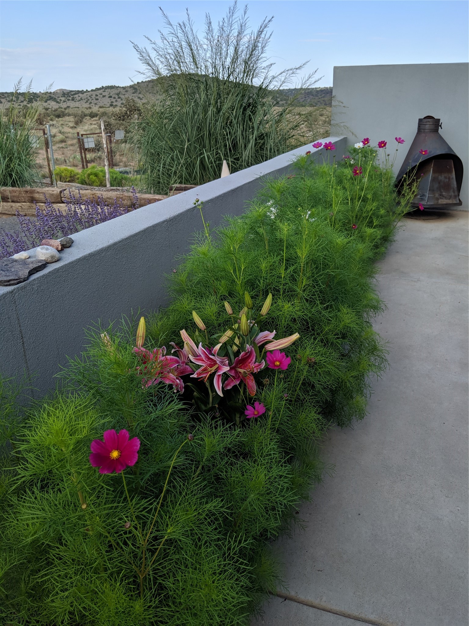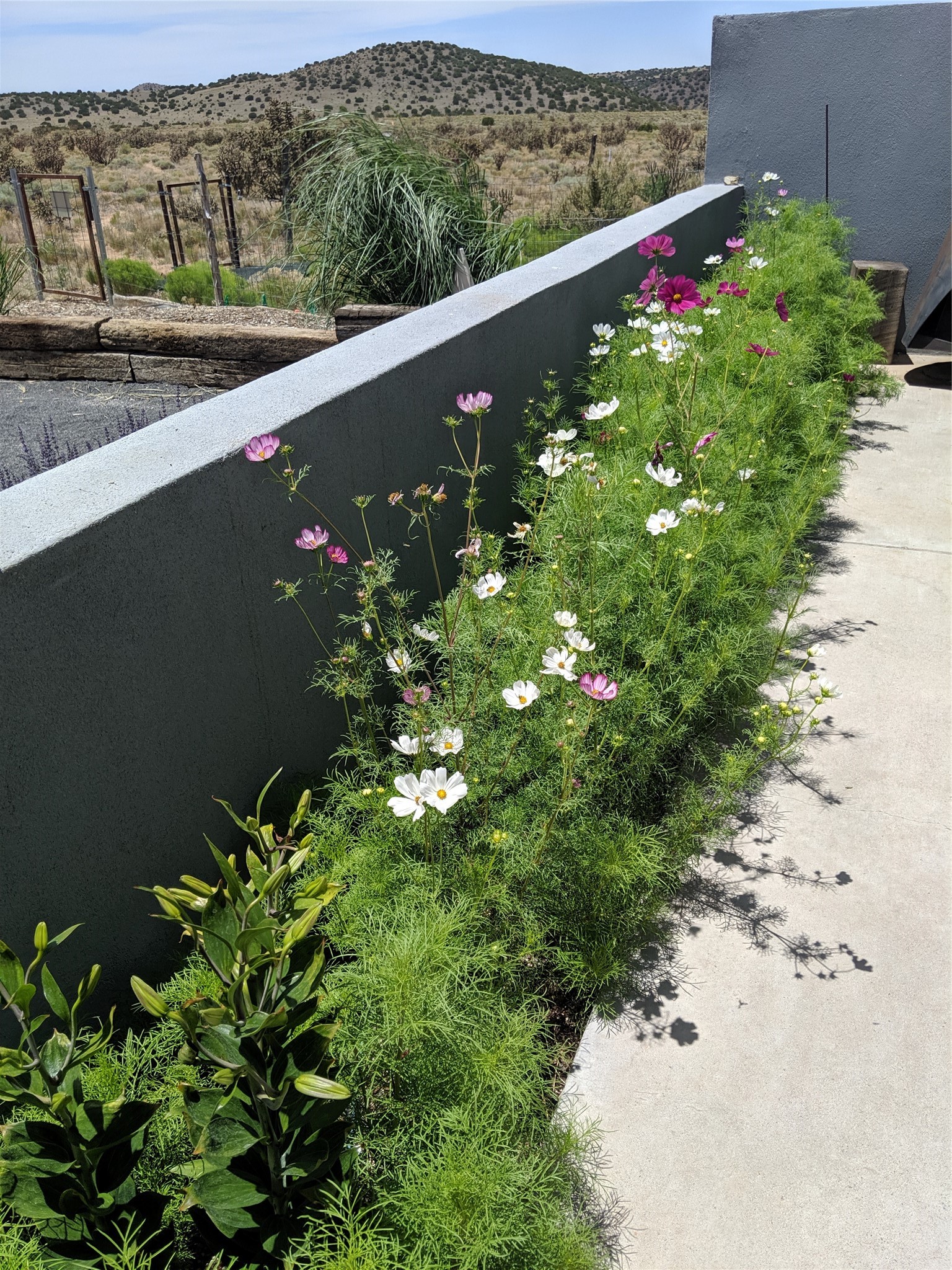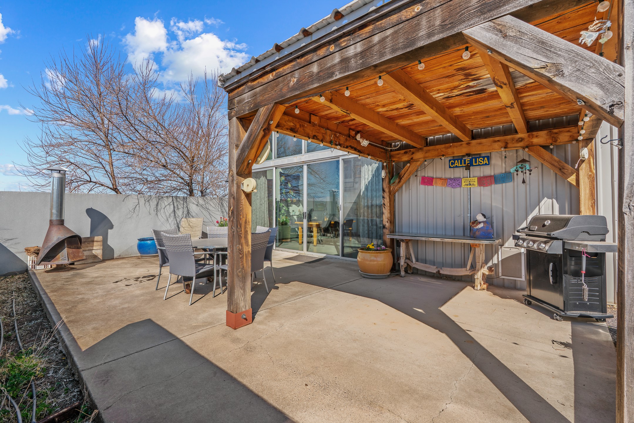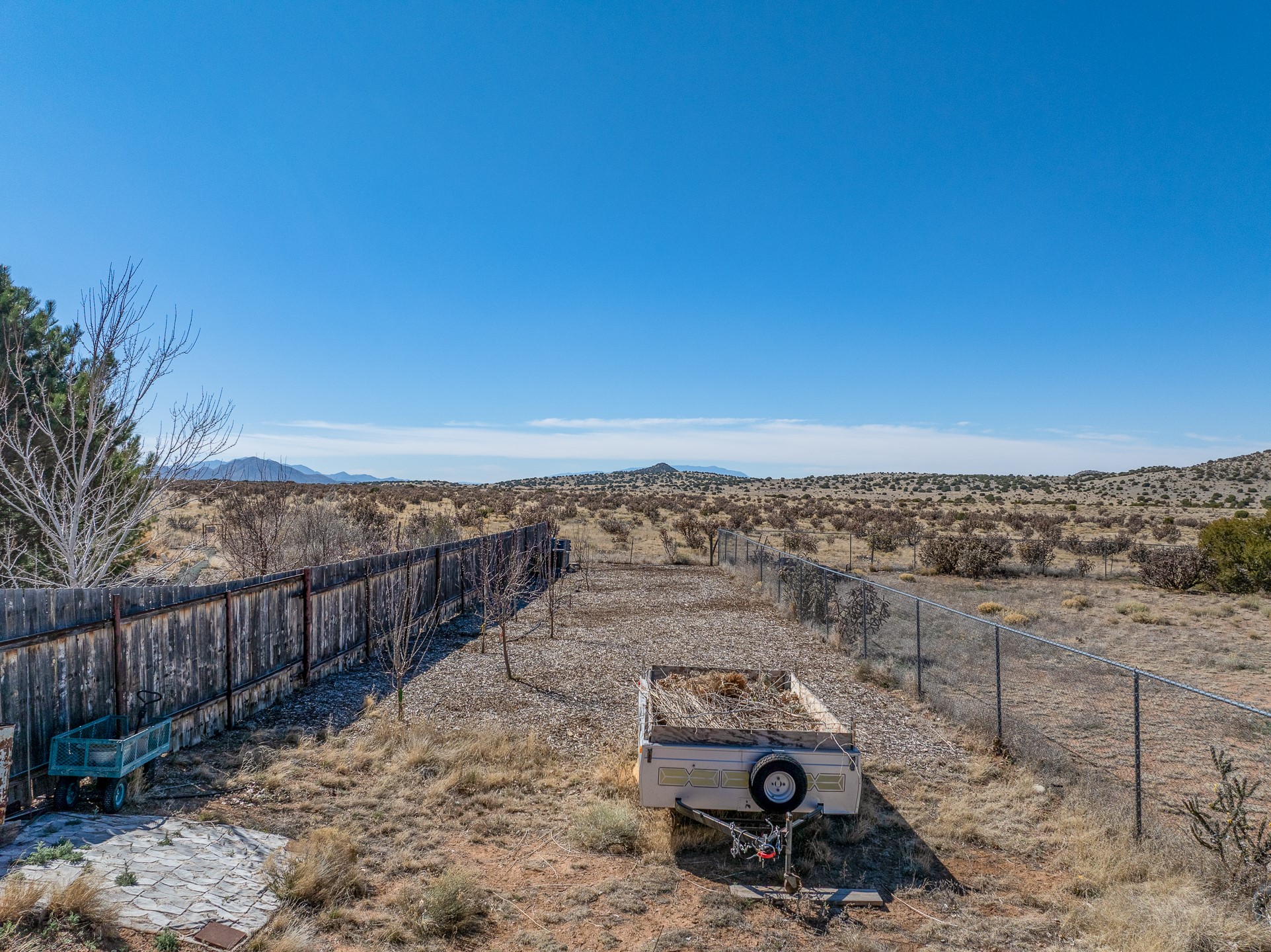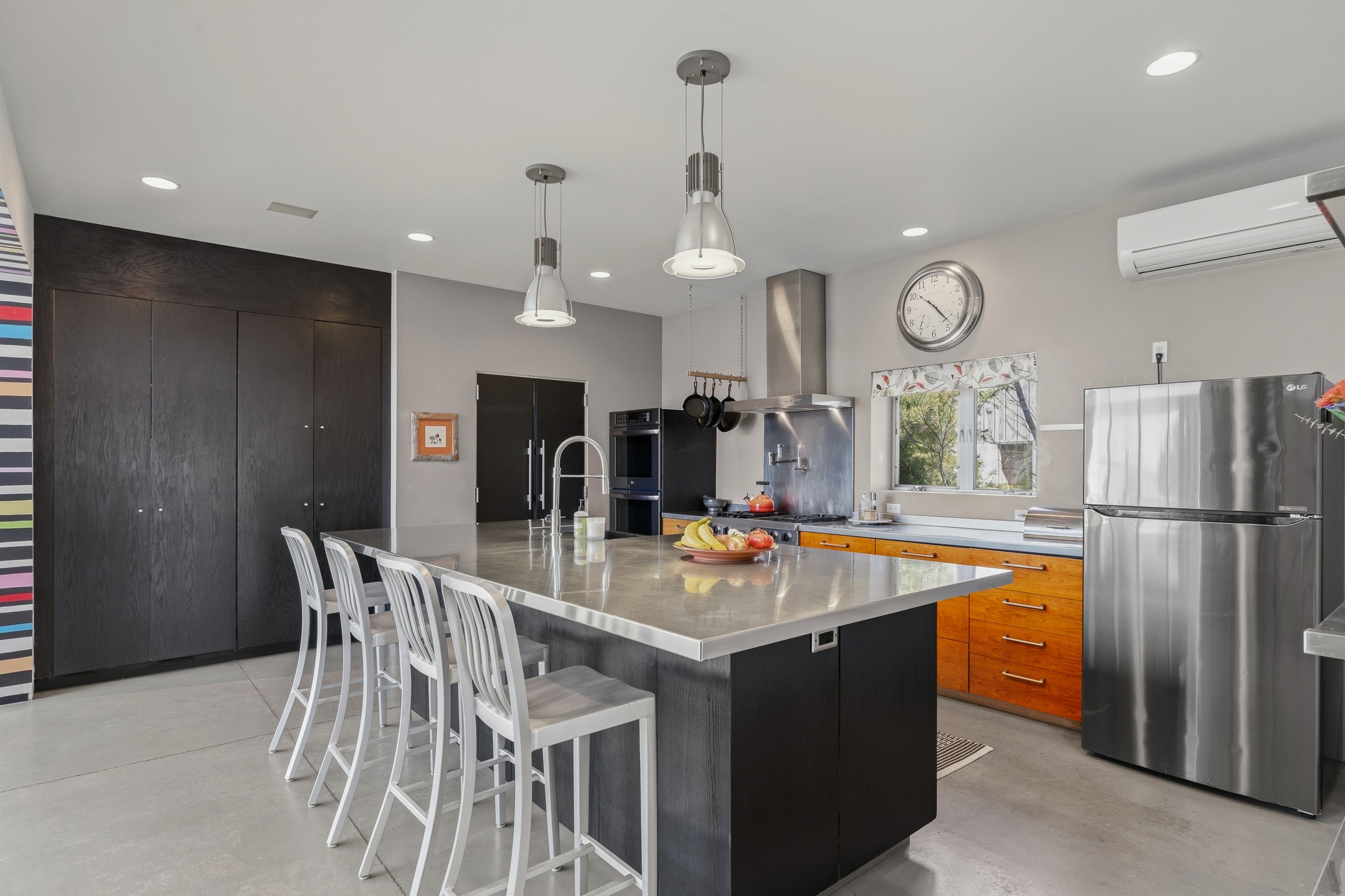Sculptor-designed Modern Compound with Guesthouse, Shop with Unobstructed Views bordering BLM Land. Built in 2007 with exceptional craftsmanship, this custom steel-and-concrete home offers a rare blend of modern design, energy efficiency, & privacy on the edge of undevelopable BLM land. Commercial- grade windows & doors, 12" insulated walls (R-50), radiant in-floor heat, & mini-splits provide year-round comfort. Whole house catalytic carbon filtration for PFAS & contaminants. The main house features soaring 18-19.5' ceilings, concrete floors, passive solar living/dining spaces with dramatic 16' windows, & unobstructed views of the Ortiz Mountains, Cerrillos Hills, & Sandias. A chef's kitchen anchors thehome with stainless counters & island, cherry cabinetry, Viking range, Bosch dishwasher, double ovens, & a walk-in pantry. Quiet spaces include a library-style study/bedroom with built-ins on the main level, upstairs loft bedroom and TV/study areas, spa-like bath with slate and glass shower, and abundant storage. Sound-proofed construction separates the main house from the guesthouse for true privacy. The fully equipped guesthouse offers flexible living with radiant heat & mini splits, a full kitchen, steam shower, jetted tub, one bedroom plus a study, & dramatic operable glass garage doors which open to private patios--ideal for guests, rental income, or multigenerational living. A 3,100 sq ft insulated red iron steel shop (2014) with high-psi concrete floors for heavy equipment, pellet stove, plumbing (1/2 bath), including 1,100 sq ft loft, and 3-phase power is perfect for artists, or serious tradespeople. Outside, enjoy a fully fenced, irrigated landscape.A gardener's dream! with over 80 native & fruit trees, an edible forest garden with serviceberries, buffaloberry, elderberry, gooseberry, red and yellow currants, raspberries, native plum & cherry. The setting is expansive, & visually stunning, with seasonal cactus blooms across the protected BLM land with easy access to trails and the Santa Fe River.