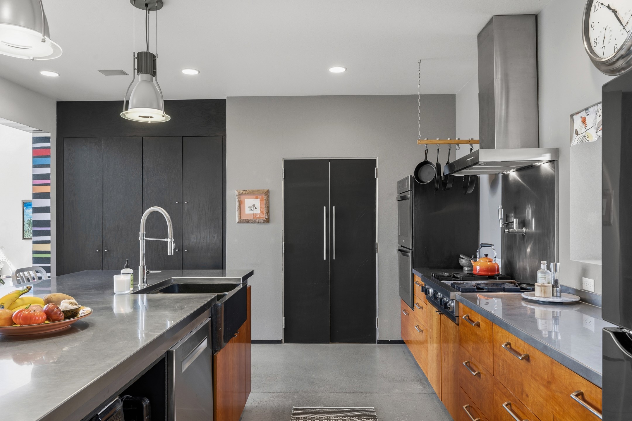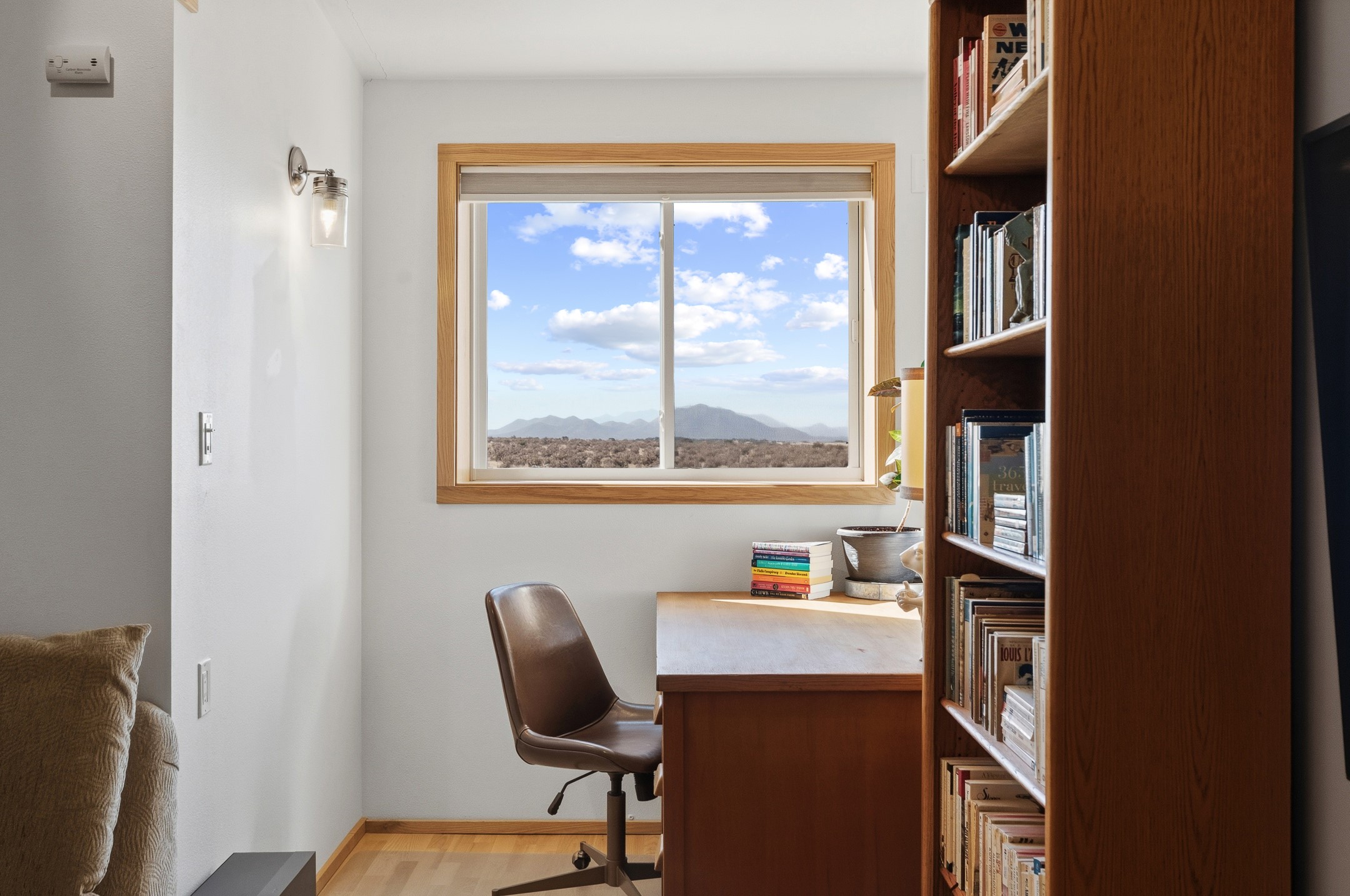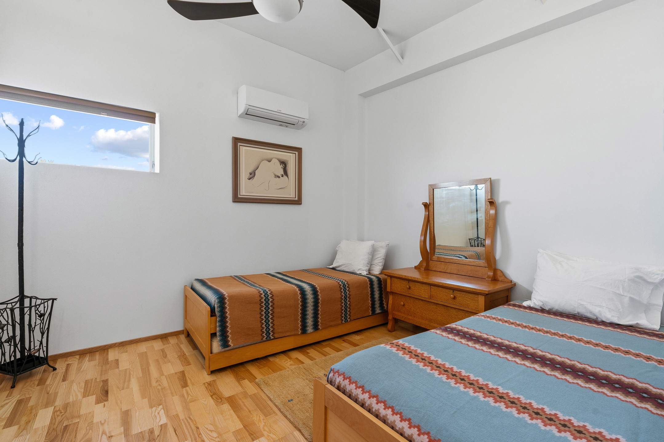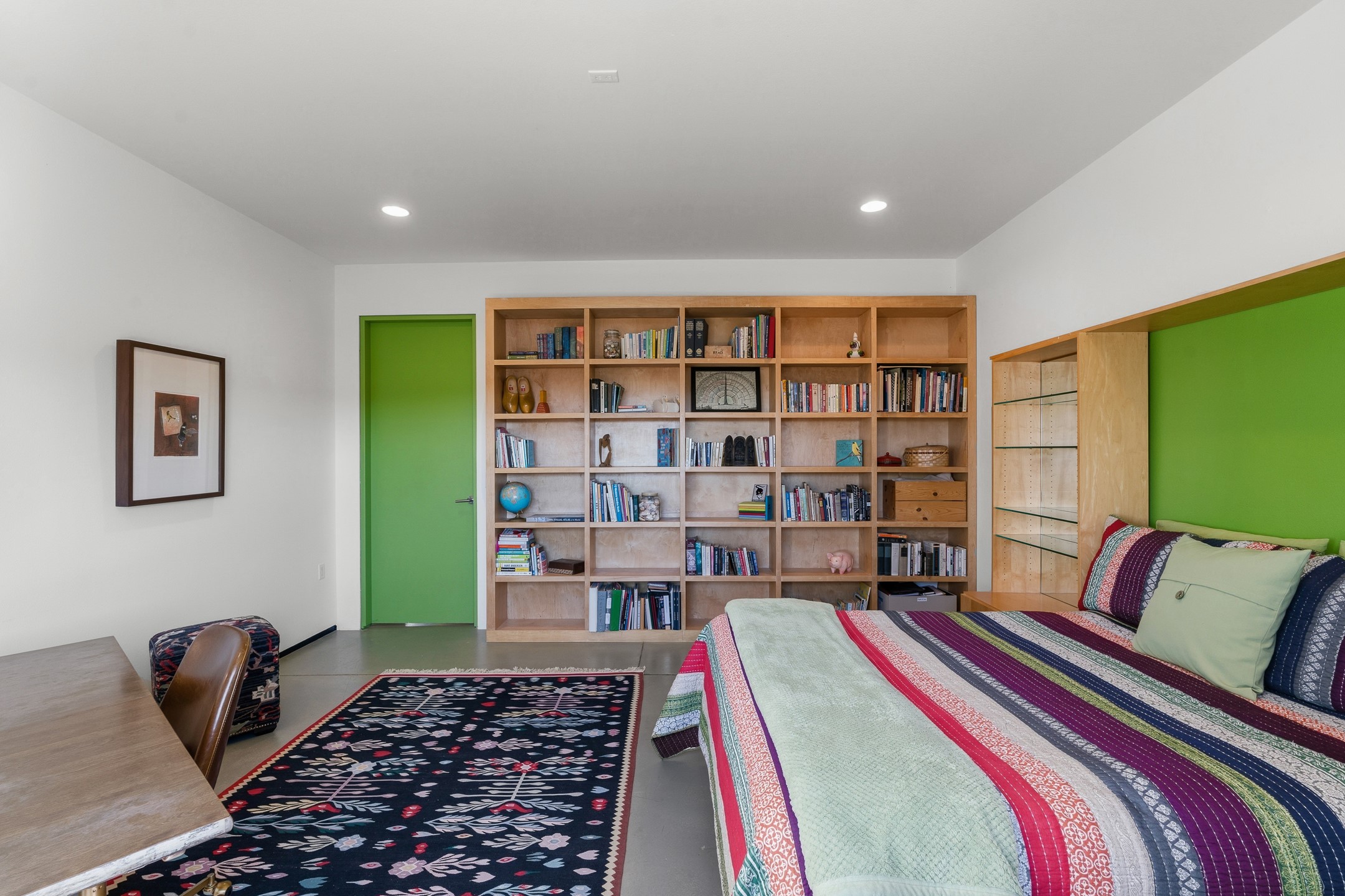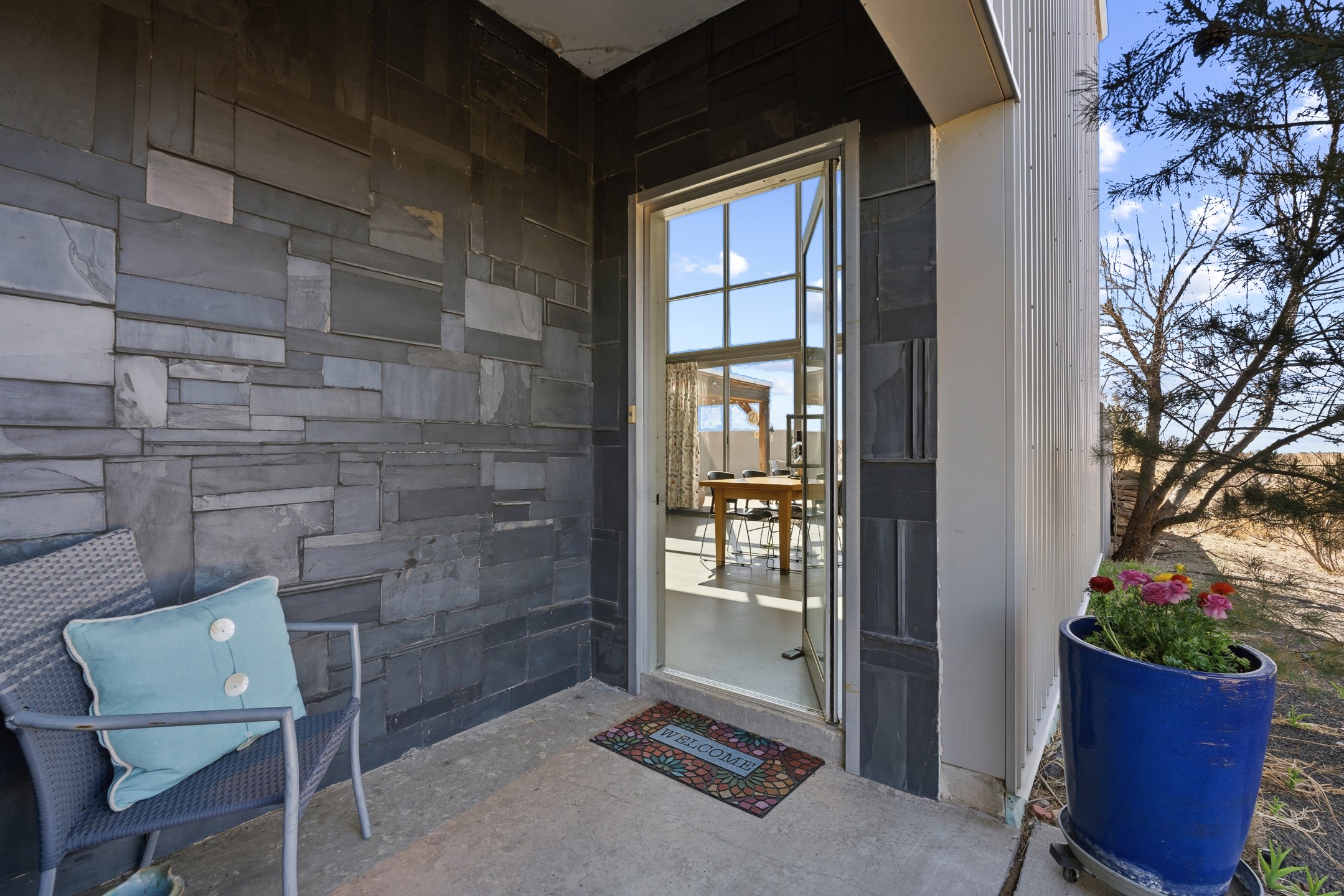 Sculptor-designed Modern Compound with Guesthouse, Shop with Unobstructed Views bordering BLM Land. Built in 2007 with exceptional craftsmanship, this custom steel-and-concrete home offers a rare blend of modern design, energy efficiency, & privacy on the edge of undevelopable BLM land. Commercial- grade windows & doors, 12" insulated walls (R-50), radiant in-floor heat, & mini-splits provide year-round comfort. Whole house catalytic carbon filtration for PFAS & contaminants. The main house features soaring 18-19.5' ceilings, concrete floors, passive solar living/dining spaces with dramatic 16' windows, & unobstructed views of the Ortiz Mountains, Cerrillos Hills, & Sandias. A chef's kitchen anchors thehome with stainless counters & island, cherry cabinetry, Viking range, Bosch dishwasher, double ovens, & a walk-in pantry. Quiet spaces include a library-style study/bedroom with built-ins on the main level, upstairs loft bedroom and TV/study areas, spa-like bath with slate and glass shower, and abundant storage. Sound-proofed construction separates the main house from the guesthouse for true privacy. The fully equipped guesthouse offers flexible living with radiant heat & mini splits, a full kitchen, steam shower, jetted tub, one bedroom plus a study, & dramatic operable glass garage doors which open to private patios--ideal for guests, rental income, or multigenerational living. A 3,100 sq ft insulated red iron steel shop (2014) with high-psi concrete floors for heavy equipment, pellet stove, plumbing (1/2 bath), including 1,100 sq ft loft, and 3-phase power is perfect for artists, or serious tradespeople. Outside, enjoy a fully fenced, irrigated landscape.A gardener's dream! with over 80 native & fruit trees, an edible forest garden with serviceberries, buffaloberry, elderberry, gooseberry, red and yellow currants, raspberries, native plum & cherry. The setting is expansive, & visually stunning, with seasonal cactus blooms across the protected BLM land with easy access to trails and the Santa Fe River.