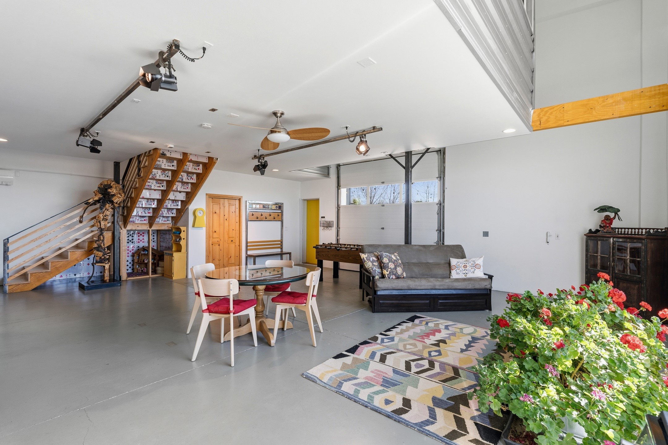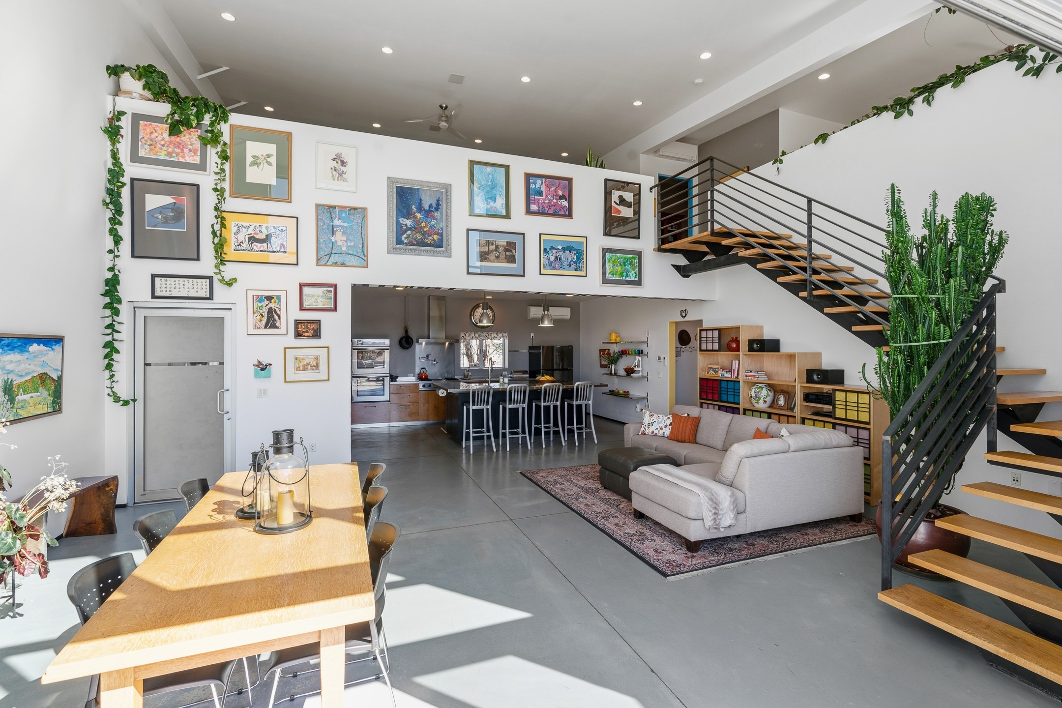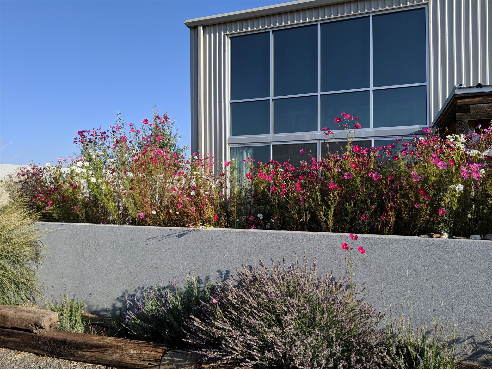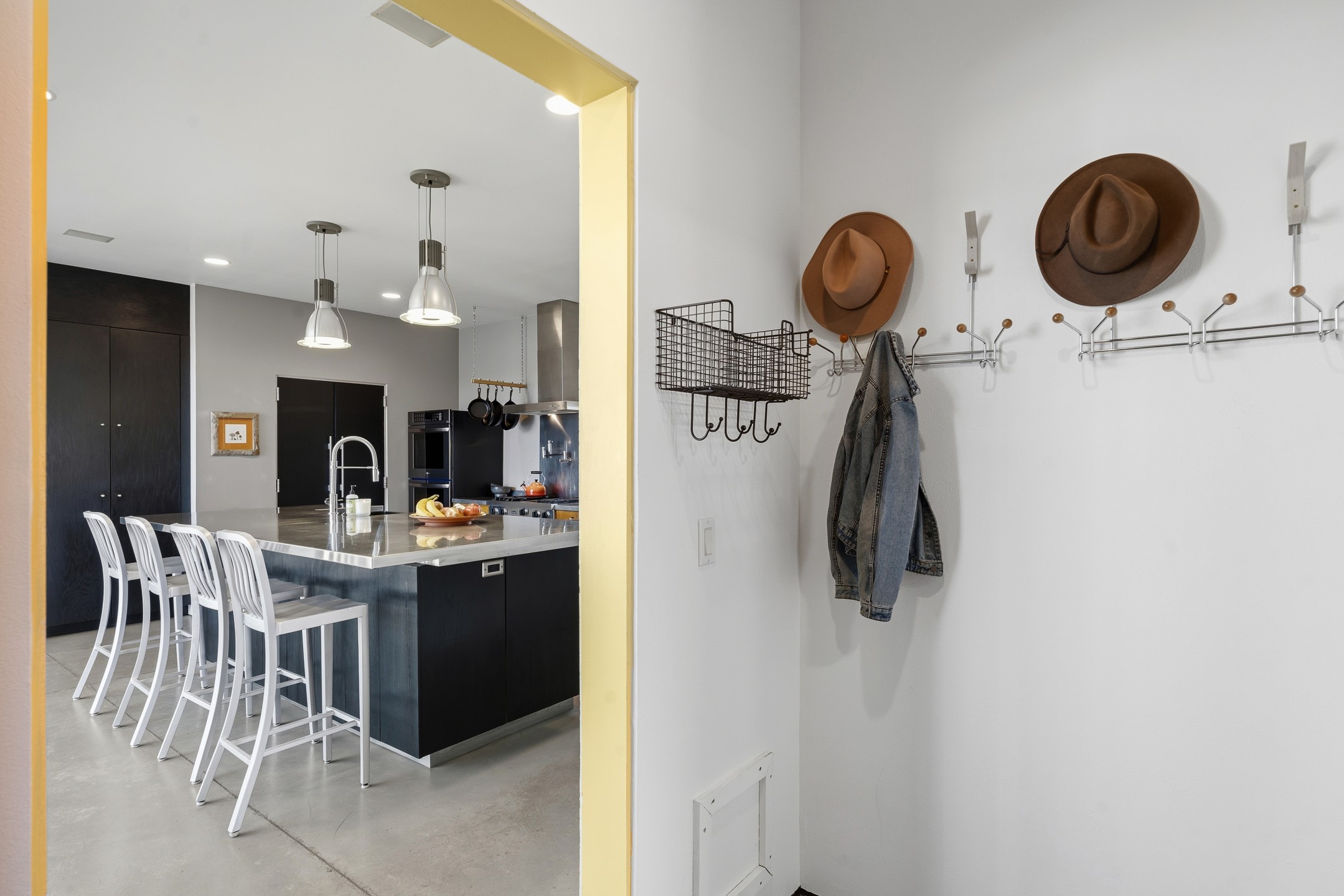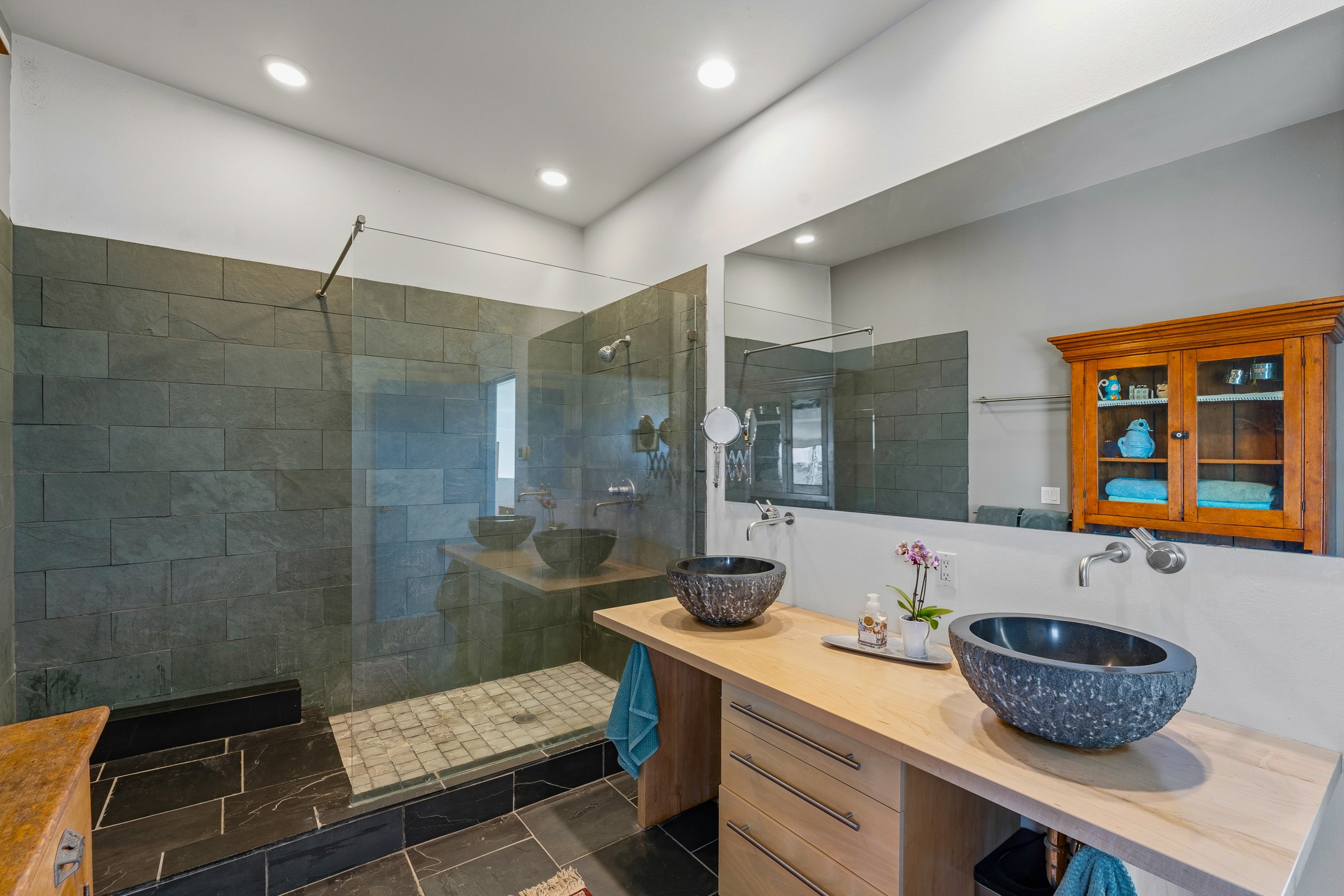 Sculptor-designed Modern Compound with Guesthouse, Shop with Unobstructed Views bordering BLM Land. Built in 2007 with exceptional craftsmanship, this custom steel-and-concrete home offers a rare blend of modern design, energy efficiency, & privacy on the edge of undevelopable BLM land. Commercial- grade windows & doors, 12" insulated walls (R-50), radiant in-floor heat, & mini-splits provide year-round comfort. Whole house catalytic carbon filtration for PFAS & contaminants. The main house features soaring 18-19.5' ceilings, concrete floors, passive solar living/dining spaces with dramatic 16' windows, & unobstructed views of the Ortiz Mountains, Cerrillos Hills, & Sandias. A chef's kitchen anchors thehome with stainless counters & island, cherry cabinetry, Viking range, Bosch dishwasher, double ovens, & a walk-in pantry. Quiet spaces include a library-style study/bedroom with built-ins on the main level, upstairs loft bedroom and TV/study areas, spa-like bath with slate and glass shower, and abundant storage. Sound-proofed construction separates the main house from the guesthouse for true privacy. The fully equipped guesthouse offers flexible living with radiant heat & mini splits, a full kitchen, steam shower, jetted tub, one bedroom plus a study, & dramatic operable glass garage doors which open to private patios--ideal for guests, rental income, or multigenerational living. A 3,100 sq ft insulated red iron steel shop (2014) with high-psi concrete floors for heavy equipment, pellet stove, plumbing (1/2 bath), including 1,100 sq ft loft, and 3-phase power is perfect for artists, or serious tradespeople. Outside, enjoy a fully fenced, irrigated landscape.A gardener's dream! with over 80 native & fruit trees, an edible forest garden with serviceberries, buffaloberry, elderberry, gooseberry, red and yellow currants, raspberries, native plum & cherry. The setting is expansive, & visually stunning, with seasonal cactus blooms across the protected BLM land with easy access to trails and the Santa Fe River.