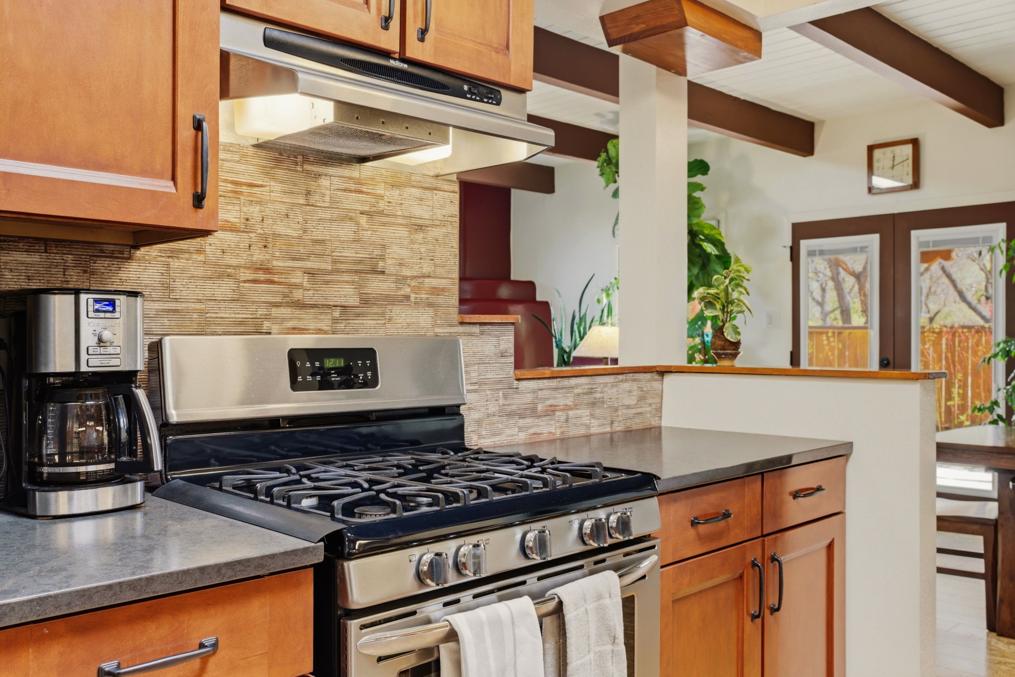 Impeccably maintained and filled with natural light, this single-story, end-unit townhouse offers the perfect blend of comfort, style, and Santa Fe charm. Featuring 2 bedrooms and 2 baths, the home has been thoughtfully updated throughout, including a newer 3-year-old roof, newer stucco, recently replaced and enlarged windows, and a newer furnace and A/C system.The stunning kitchen is a true centerpiece, boasting newer appliances with a gas range, a farmhouse sink, pantry with convenient pull-out drawers, beautiful tile backsplash, and elegant stone countertops--ideal for both everyday living and entertaining. The inviting living room showcases a classic corner kiva fireplace, warm beamed ceilings, and French doors that open to a beautifully landscaped flagstone patio, creating seamless indoor-outdoor living.Cork flooring adds warmth and durability to the main living areas, while both carpeted bedrooms feature oversized windows that bring in abundant light. The primary suite enjoys peaceful views of open space with glimpses of the Sangre de Cristo Mountains. The updated guest bathroom includes a laundry closet with a 2025 washer and dryer for added convenience.Completing the property is a detached two-car garage. Located in the desirable Park Plazas community, residents enjoy miles of walking trails, tennis courts, an off-leash dog park, a community garden, RV storage, and attentive HOA management--all just minutes from shopping, dining, and everything Santa Fe has to offer. This home is an absolute gem in a beautiful community.