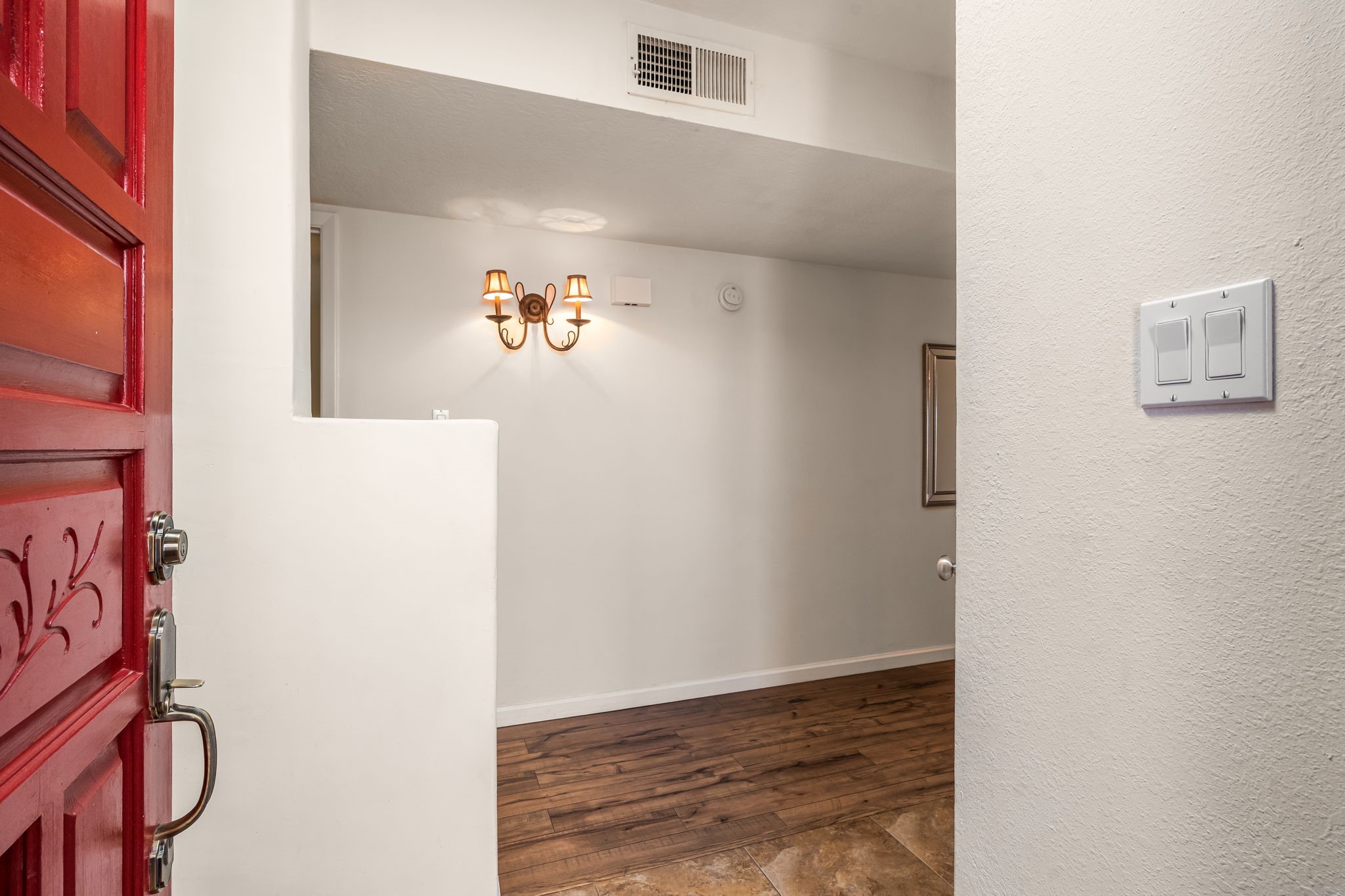 Filled with natural light and lovingly cared for over the past 30 years, this inviting single-story townhouse offers comfort, beauty, and an exceptional Park Plazas setting. With open space on three sides, the home enjoys a wonderful sense of privacy along with views of the Jemez Mountains, where sunsets are especially beautiful, as well as glimpses of the Sangre de Cristo range. Inside, the living and dining room feel warm and welcoming with beautiful laminate flooring, a corner Kiva fireplace, and sliding doors that open to a covered portal--an ideal place to relax and take in the surroundings. The kitchen has been thoughtfully updated with newer appliances, including a convection oven, Silestone countertops, a subway tile backsplash, a granite composite farm sink, and two skylights that bring in even more light. A sunny breakfast area with a cozy window seat adds to the home's charm. The spacious primary bedroom is bright and peaceful, and the updated bath features granite counters and a beautifully tiled walk-in shower. Additionally, there is a lovely second bedroom and full bath as well as a detached 2 car garage. This home is sparkling and ready for its new owner. Located in the centrally situated Park Plazas neighborhood, residents enjoy miles of walking trails, tennis courts, an off-leash dog park, and easy access to shopping, dining, and the Santa Fe Plaza.