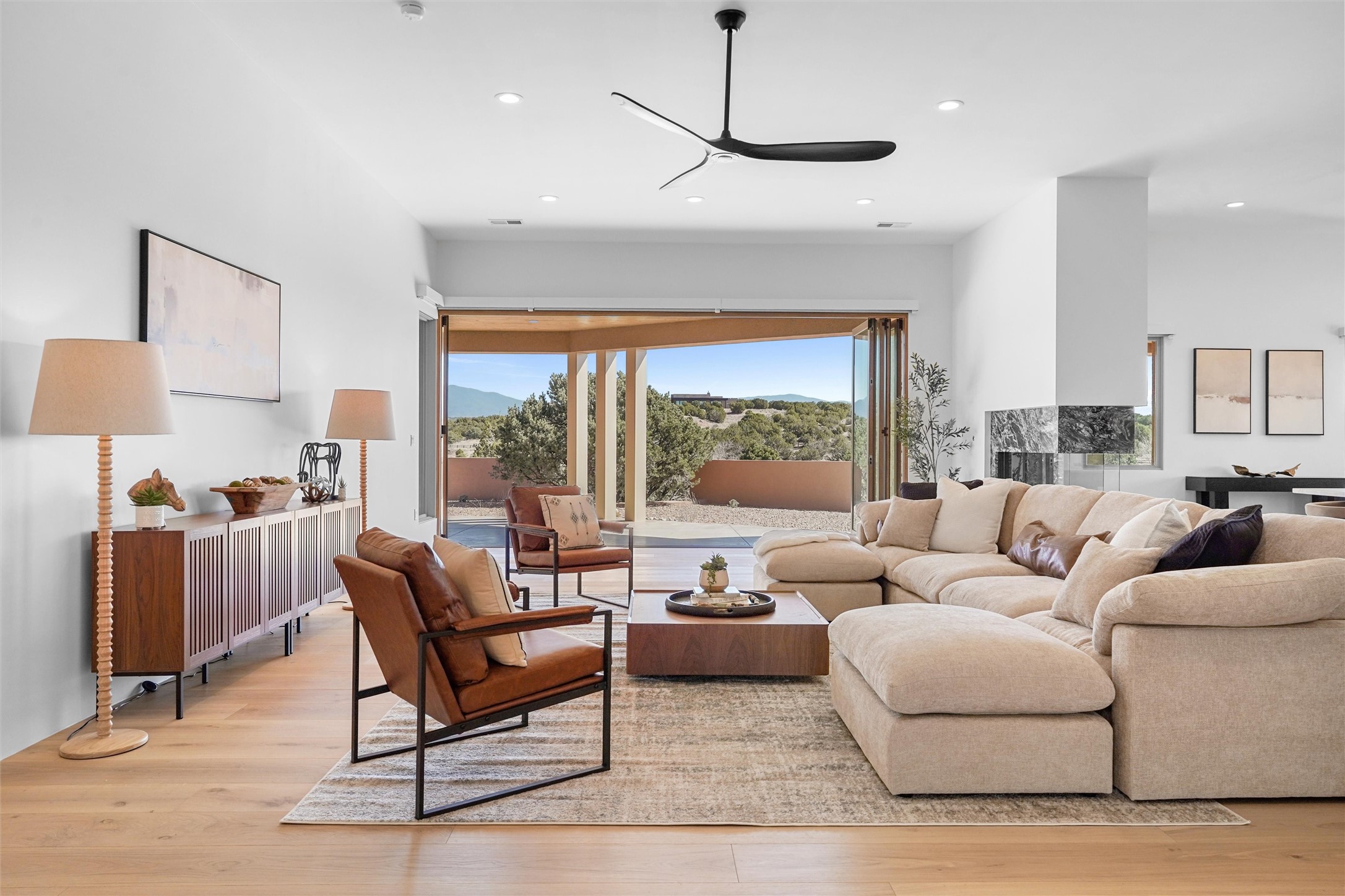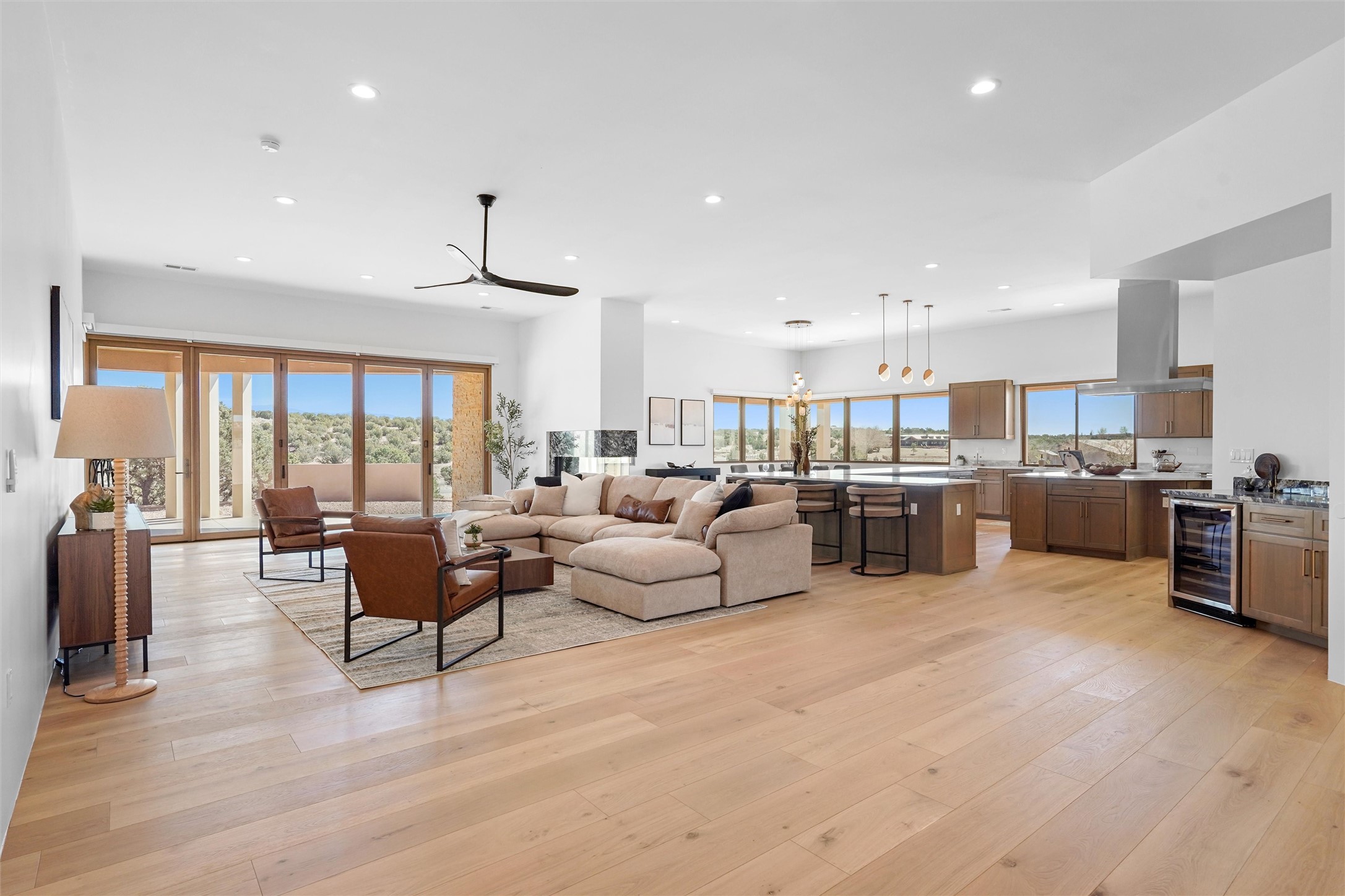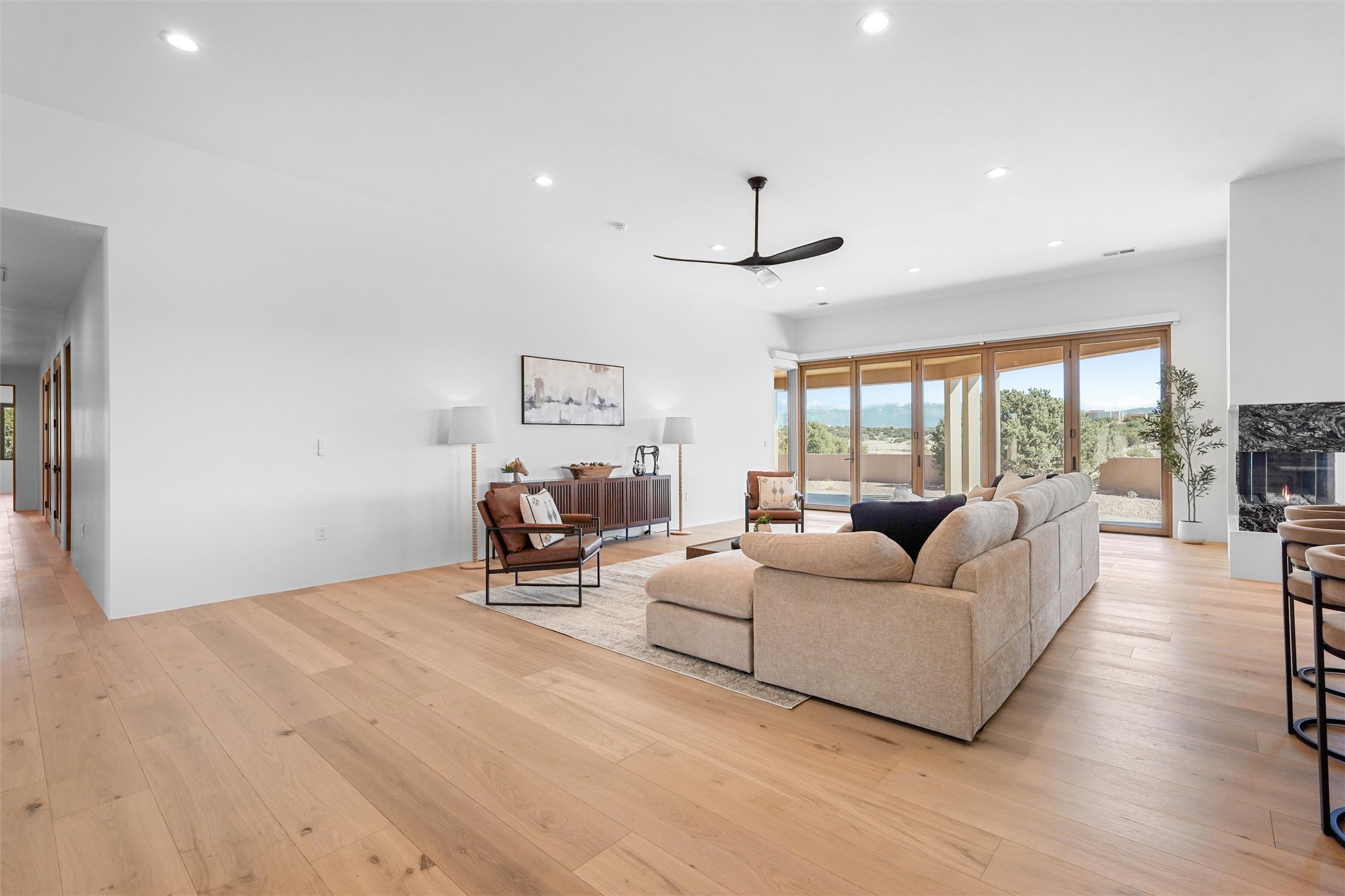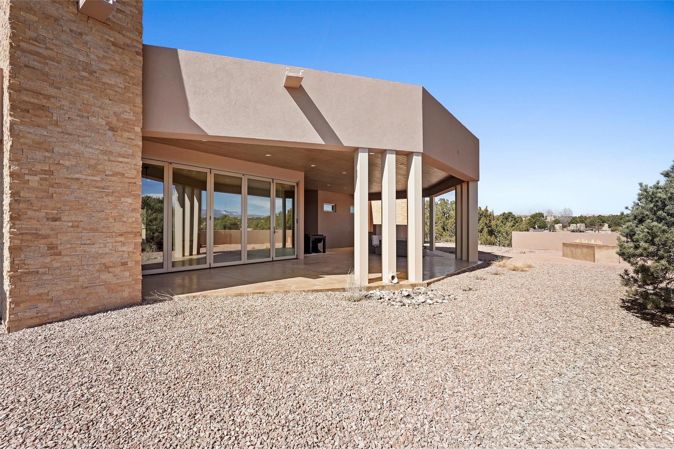 Completed in late 2025 and set on 2 acres in Las Campanas, this single level residence captures expansive views of the Sangre de Cristo Mountains and the nearby equestrian center. Built by Contreras Construction, a respected local builder known for integrity, the home reflects planning and attention to detail throughout. This home offers 4,209 square feet with three bedrooms, five bathrooms, a dedicated office, and a three-car garage with epoxy-coated flooring. The main living and dining spaces are centered around a two-way fireplace that creates a natural focal point for gathering. The kitchen features Thermador appliances, quartzite countertops, and a butler's pantry that provides additional storage and preparation space. Folding glass doors open the main living area to the outdoor patio, allowing the interior spaces to flow easily outside. The primary suite includes a fireplace and spacious bathroom including a soaking tub, rain shower, Toto bidet toilet, and porcelain tile finishes. Closet pull-downs and built-in storage elements provide practical organization throughout the home.Outdoor living areas were designed to take advantage of the surrounding views. The patio includes a built-in gas grill, mini refrigerator, and fire pit positioned for enjoying the mountain setting and open sky. Located within the gated Las Campanas community, this property offers privacy, quiet surroundings, and convenient access to Santa Fe's dining, galleries, and cultural destinations.