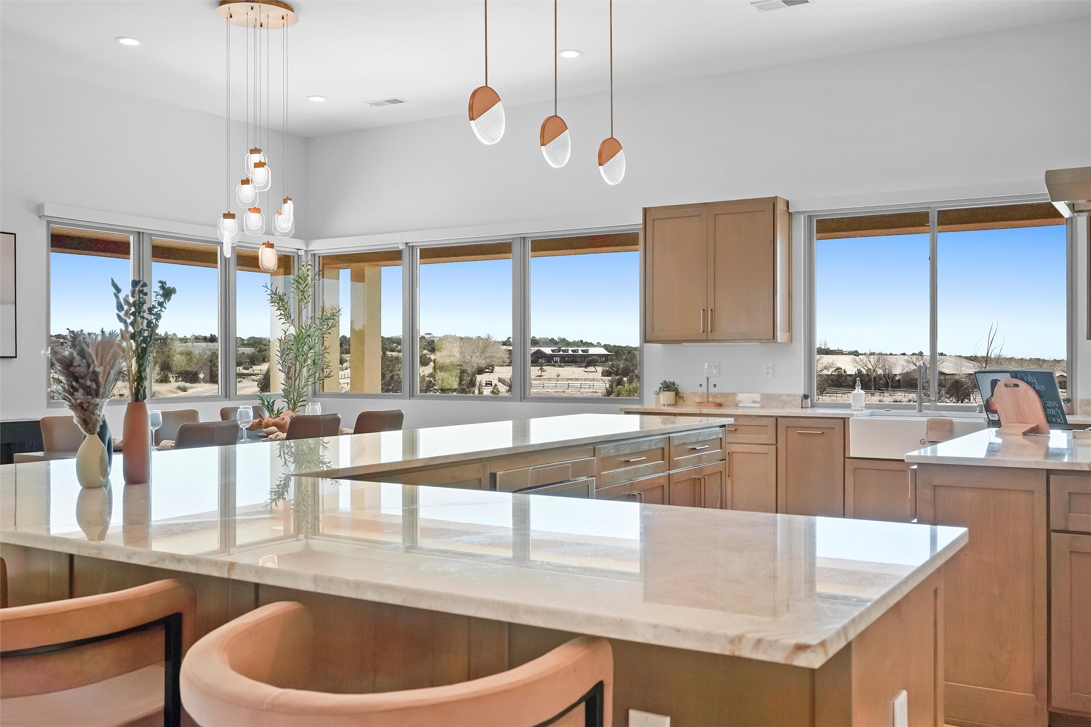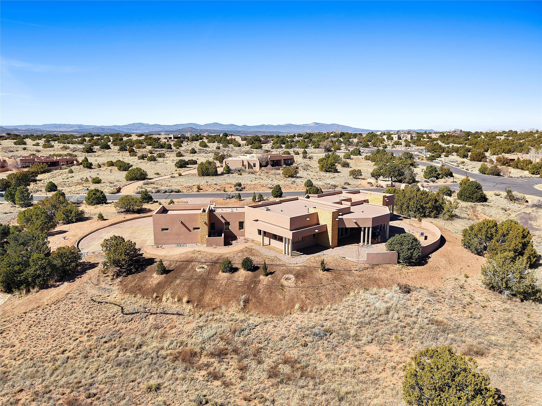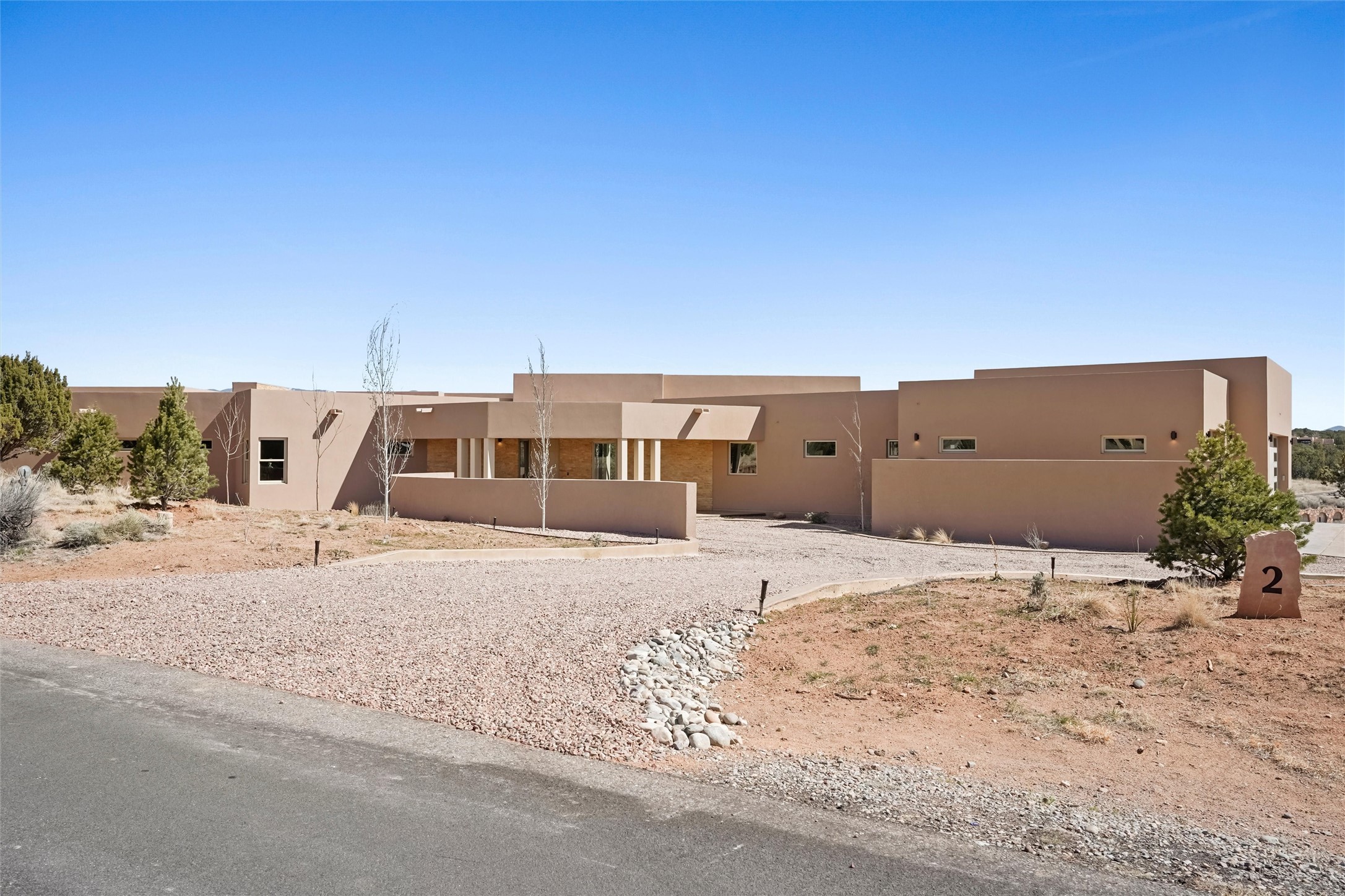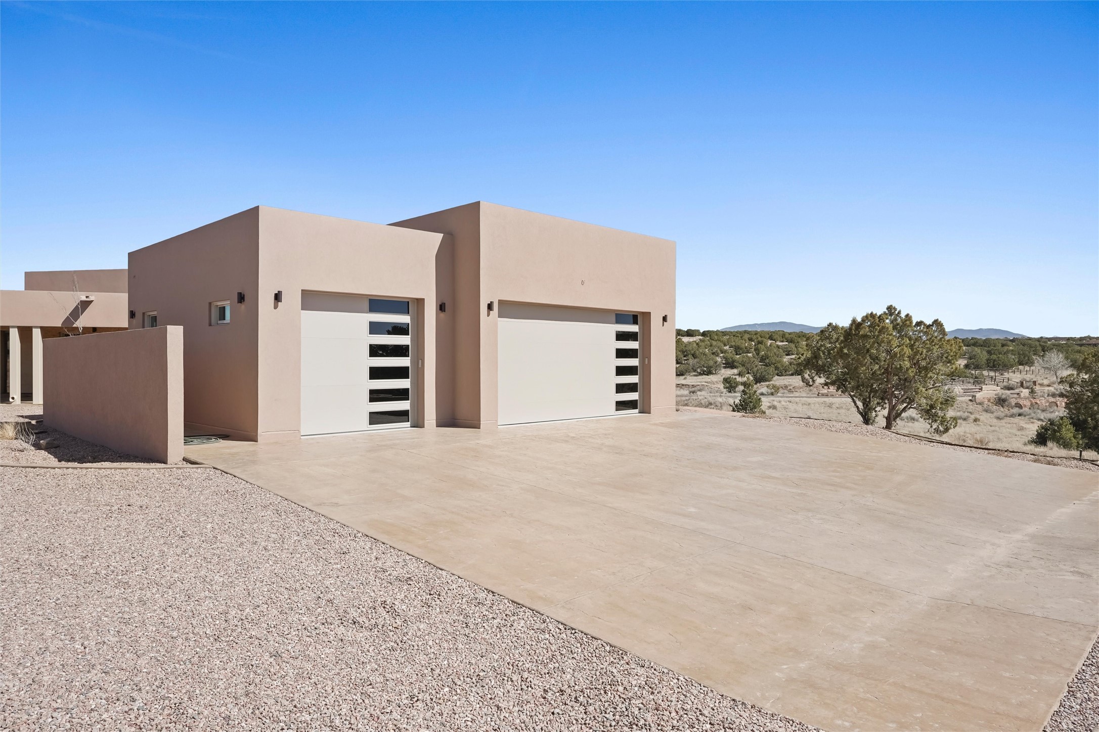 Completed in late 2025 and set on 2 acres in Las Campanas, this single level residence captures expansive views of the Sangre de Cristo Mountains and the nearby equestrian center. Built by Contreras Construction, a respected local builder known for integrity, the home reflects planning and attention to detail throughout. This home offers 4,209 square feet with three bedrooms, five bathrooms, a dedicated office, and a three-car garage with epoxy-coated flooring. The main living and dining spaces are centered around a two-way fireplace that creates a natural focal point for gathering. The kitchen features Thermador appliances, quartzite countertops, and a butler's pantry that provides additional storage and preparation space. Folding glass doors open the main living area to the outdoor patio, allowing the interior spaces to flow easily outside. The primary suite includes a fireplace and spacious bathroom including a soaking tub, rain shower, Toto bidet toilet, and porcelain tile finishes. Closet pull-downs and built-in storage elements provide practical organization throughout the home.Outdoor living areas were designed to take advantage of the surrounding views. The patio includes a built-in gas grill, mini refrigerator, and fire pit positioned for enjoying the mountain setting and open sky. Located within the gated Las Campanas community, this property offers privacy, quiet surroundings, and convenient access to Santa Fe's dining, galleries, and cultural destinations.