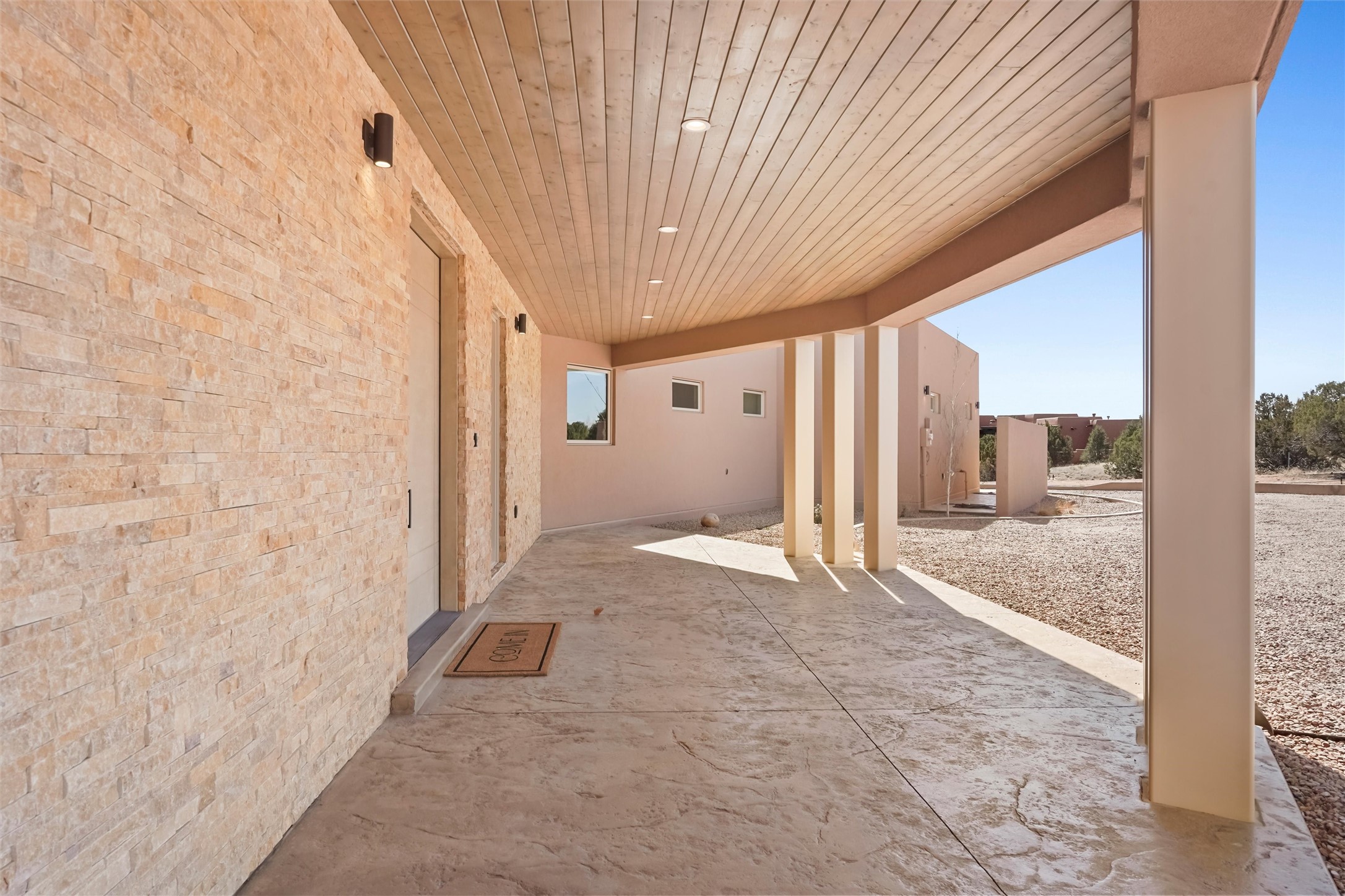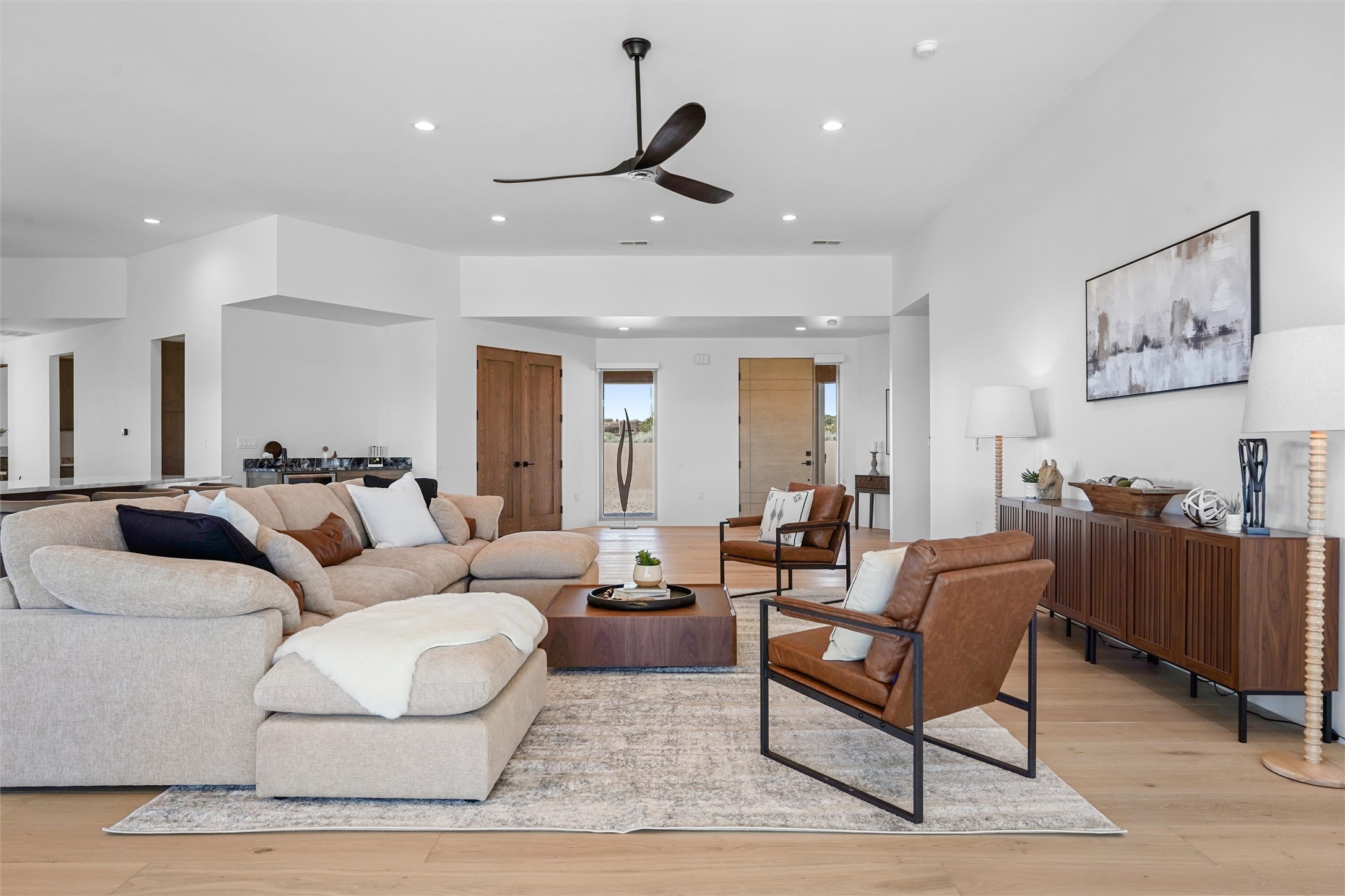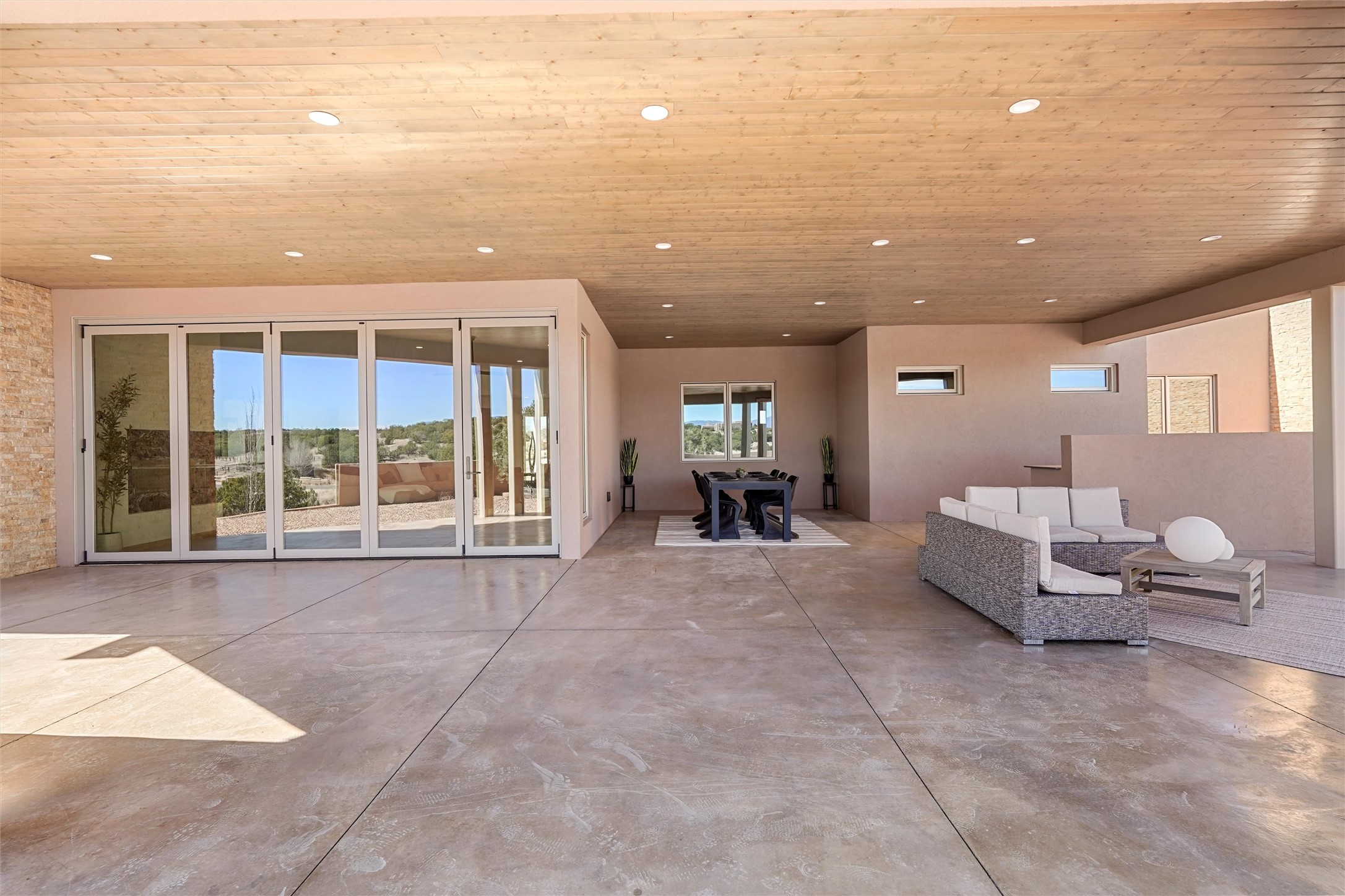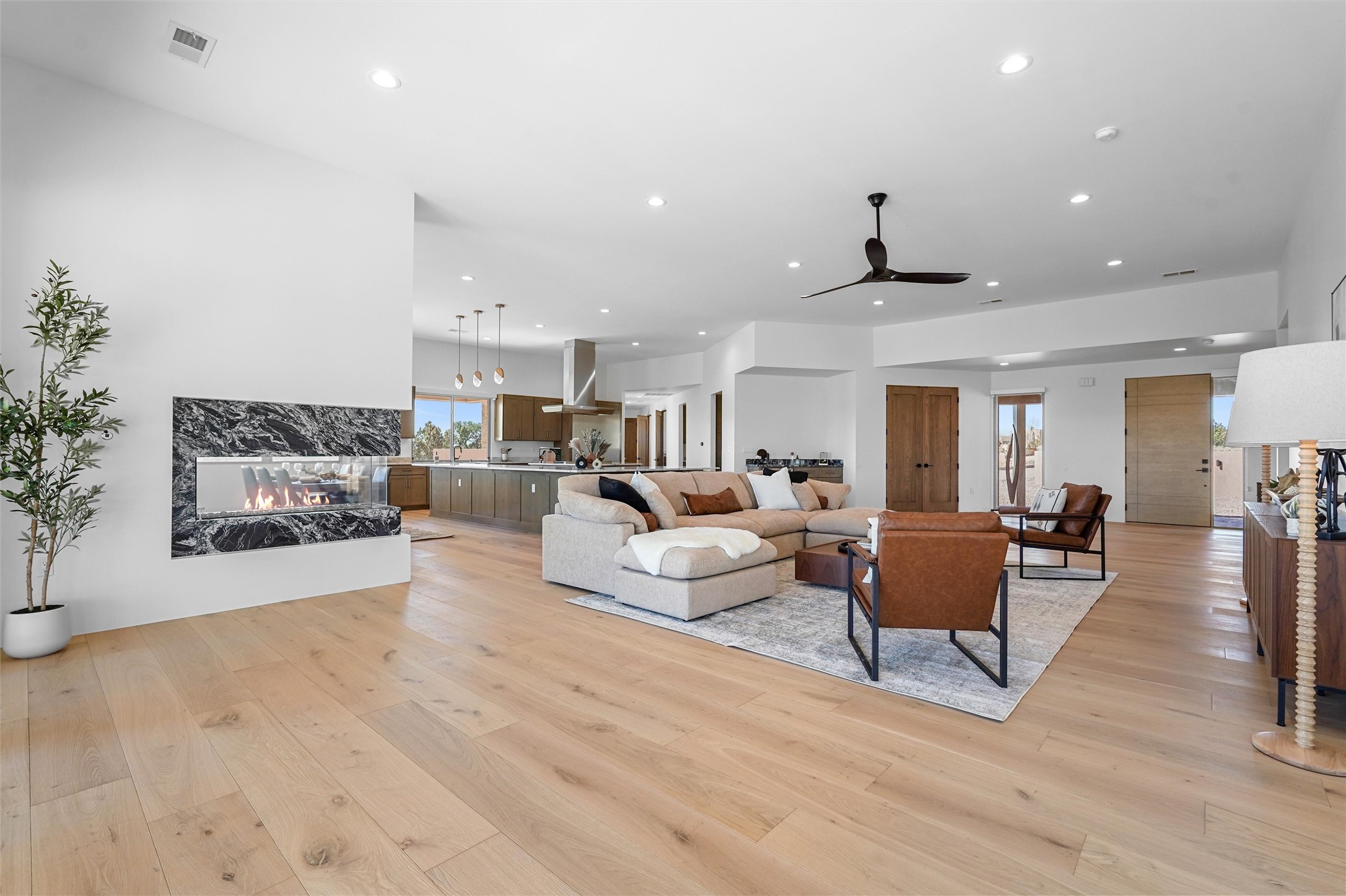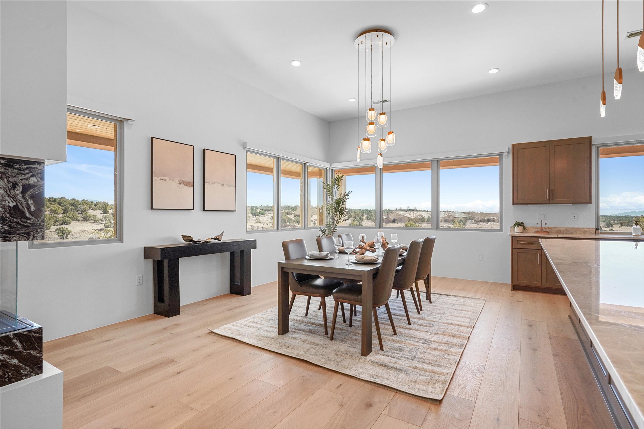 Completed in late 2025 and set on 2 acres in Las Campanas, this single level residence captures expansive views of the Sangre de Cristo Mountains and the nearby equestrian center. Built by Contreras Construction, a respected local builder known for integrity, the home reflects planning and attention to detail throughout. This home offers 4,209 square feet with three bedrooms, five bathrooms, a dedicated office, and a three-car garage with epoxy-coated flooring. The main living and dining spaces are centered around a two-way fireplace that creates a natural focal point for gathering. The kitchen features Thermador appliances, quartzite countertops, and a butler's pantry that provides additional storage and preparation space. Folding glass doors open the main living area to the outdoor patio, allowing the interior spaces to flow easily outside. The primary suite includes a fireplace and spacious bathroom including a soaking tub, rain shower, Toto bidet toilet, and porcelain tile finishes. Closet pull-downs and built-in storage elements provide practical organization throughout the home.Outdoor living areas were designed to take advantage of the surrounding views. The patio includes a built-in gas grill, mini refrigerator, and fire pit positioned for enjoying the mountain setting and open sky. Located within the gated Las Campanas community, this property offers privacy, quiet surroundings, and convenient access to Santa Fe's dining, galleries, and cultural destinations.