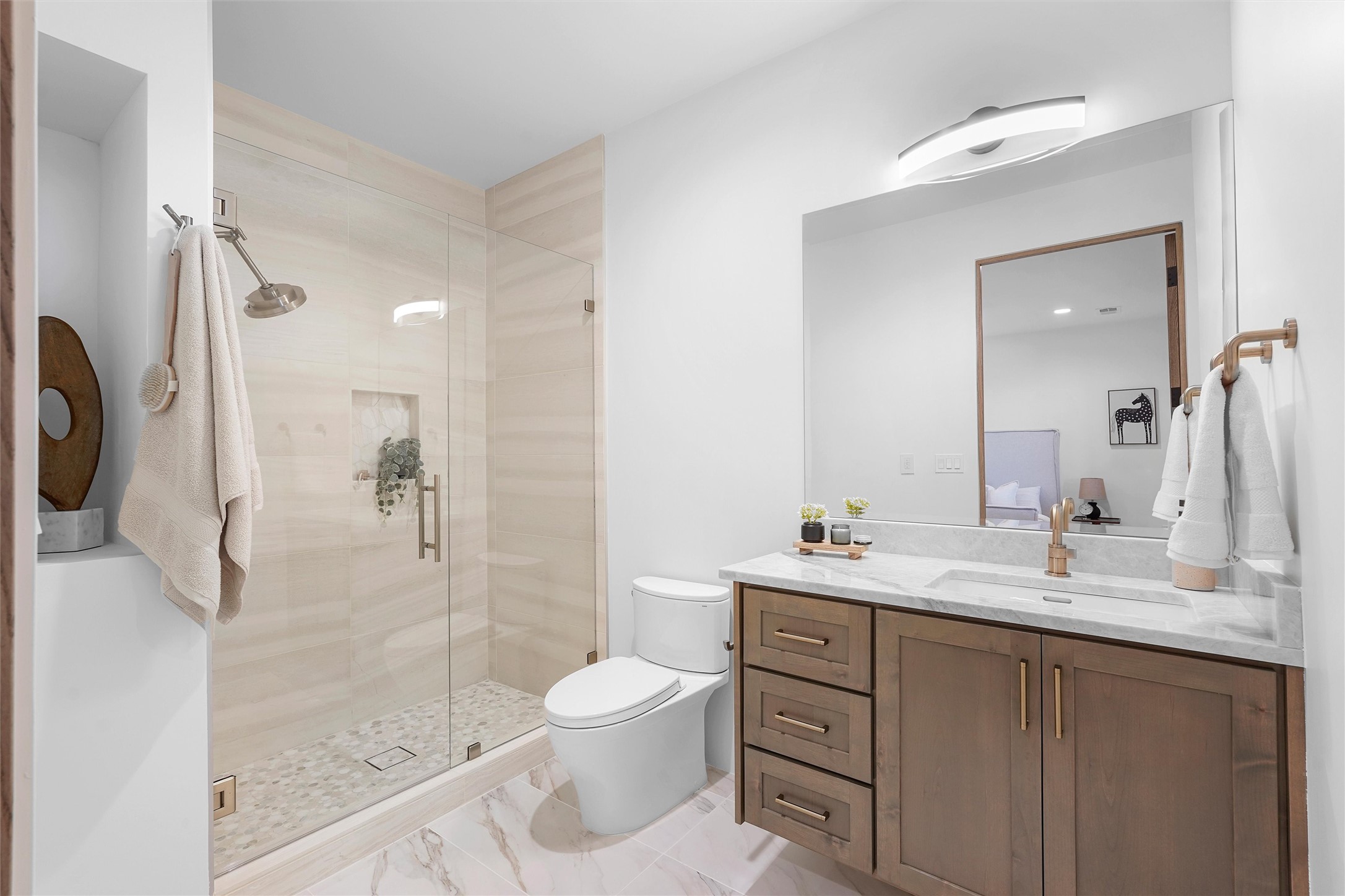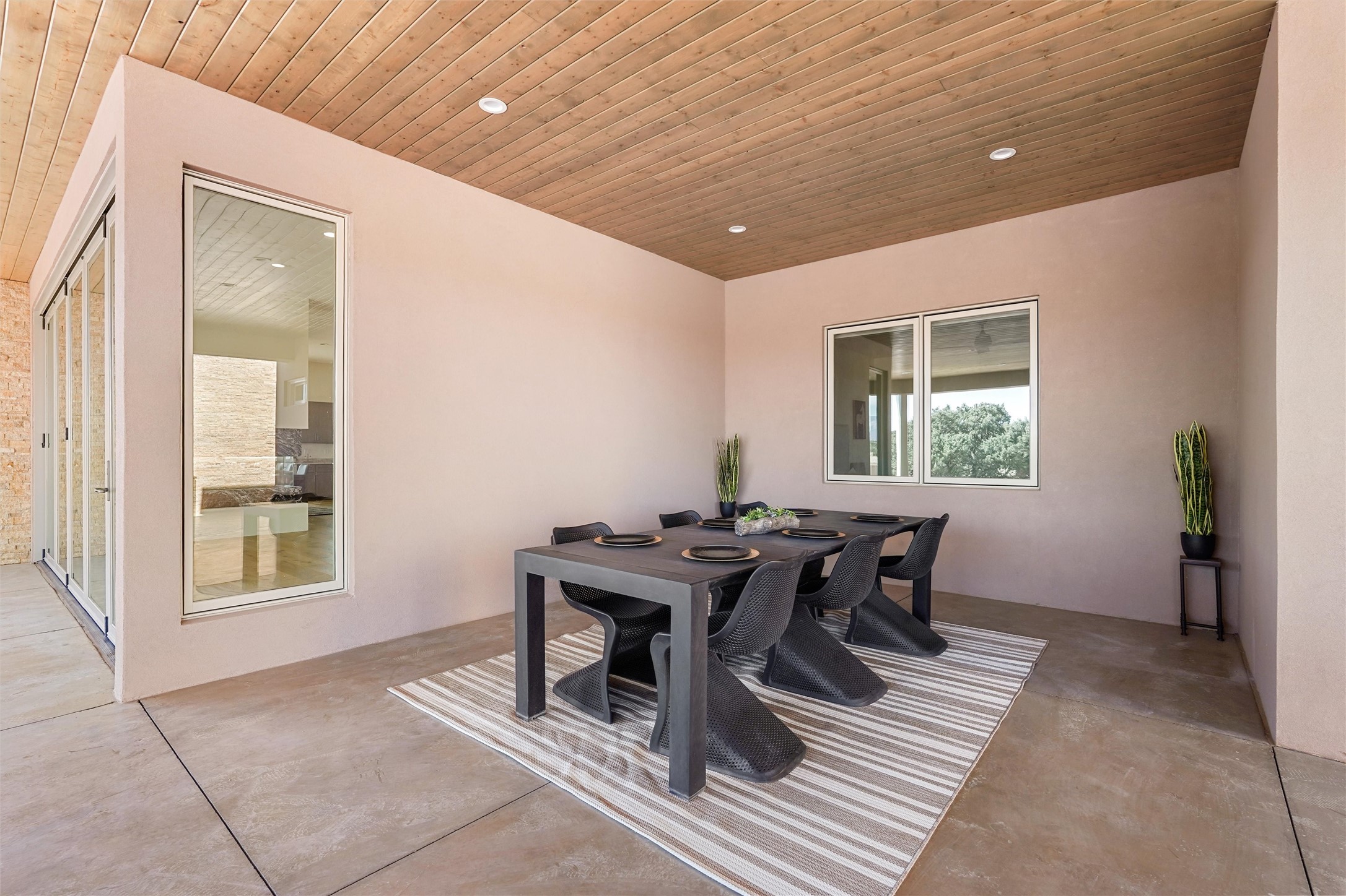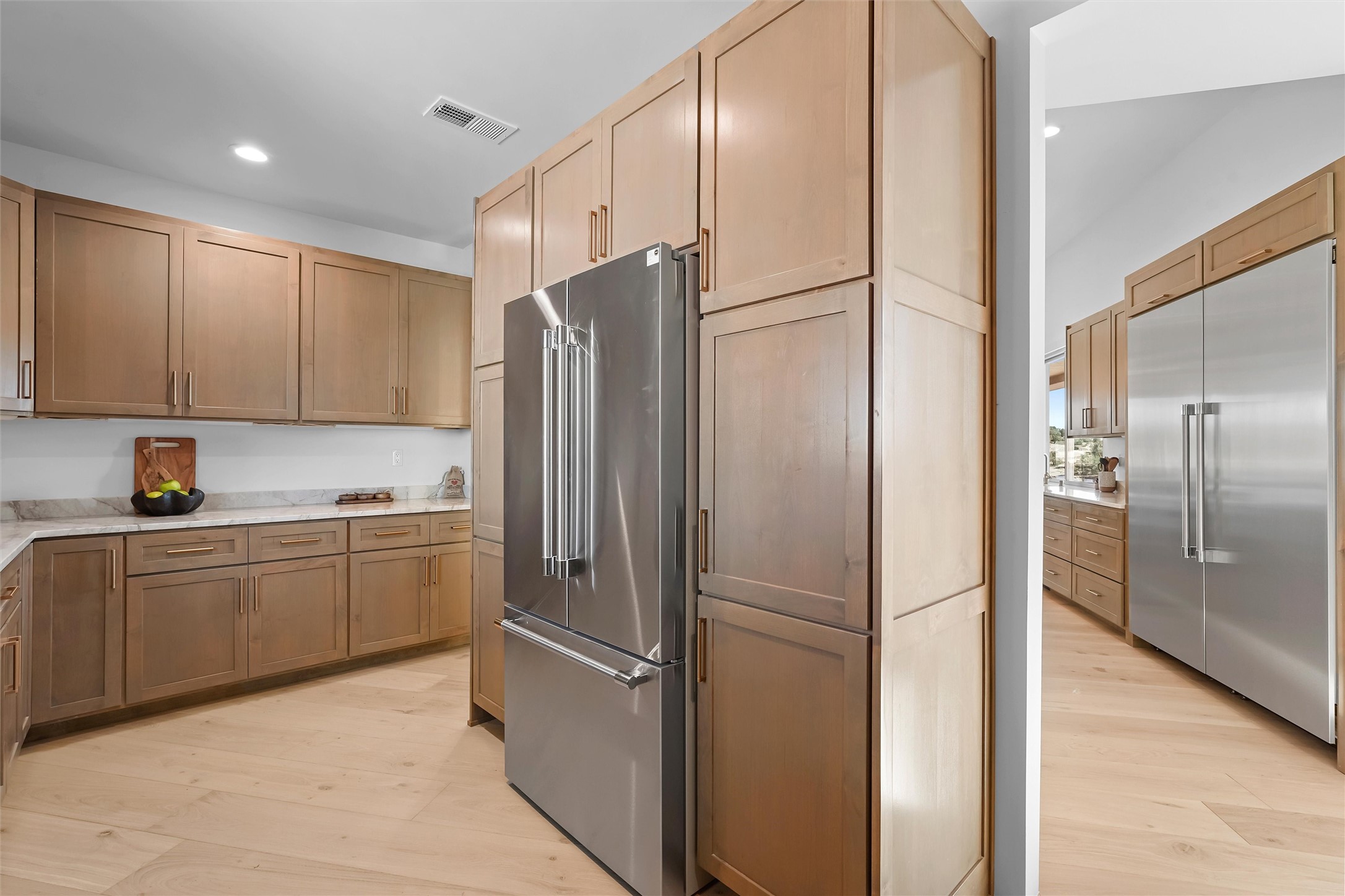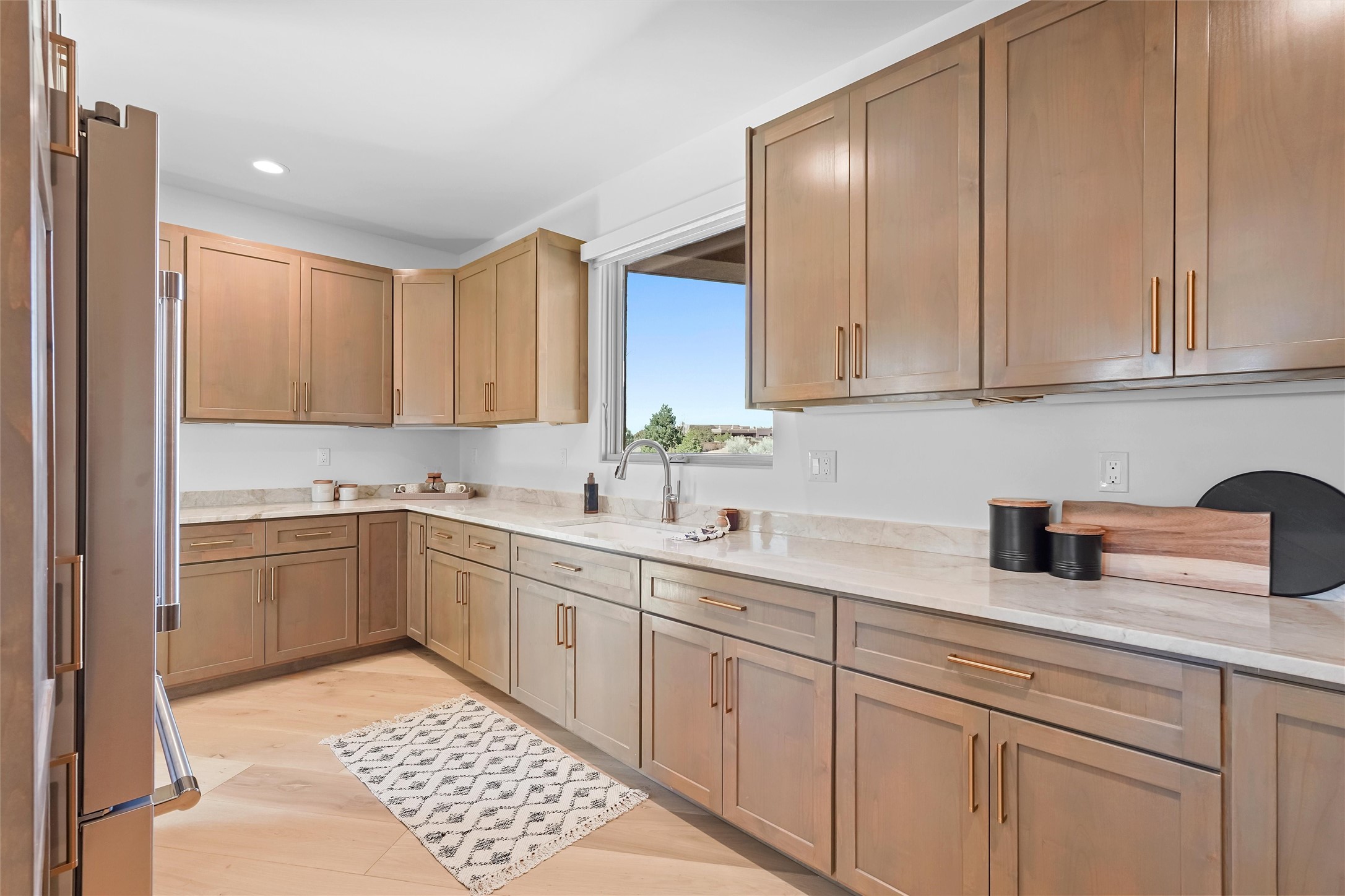 Completed in late 2025 and set on 2 acres in Las Campanas, this single level residence captures expansive views of the Sangre de Cristo Mountains and the nearby equestrian center. Built by Contreras Construction, a respected local builder known for integrity, the home reflects planning and attention to detail throughout. This home offers 4,209 square feet with three bedrooms, five bathrooms, a dedicated office, and a three-car garage with epoxy-coated flooring. The main living and dining spaces are centered around a two-way fireplace that creates a natural focal point for gathering. The kitchen features Thermador appliances, quartzite countertops, and a butler's pantry that provides additional storage and preparation space. Folding glass doors open the main living area to the outdoor patio, allowing the interior spaces to flow easily outside. The primary suite includes a fireplace and spacious bathroom including a soaking tub, rain shower, Toto bidet toilet, and porcelain tile finishes. Closet pull-downs and built-in storage elements provide practical organization throughout the home.Outdoor living areas were designed to take advantage of the surrounding views. The patio includes a built-in gas grill, mini refrigerator, and fire pit positioned for enjoying the mountain setting and open sky. Located within the gated Las Campanas community, this property offers privacy, quiet surroundings, and convenient access to Santa Fe's dining, galleries, and cultural destinations.