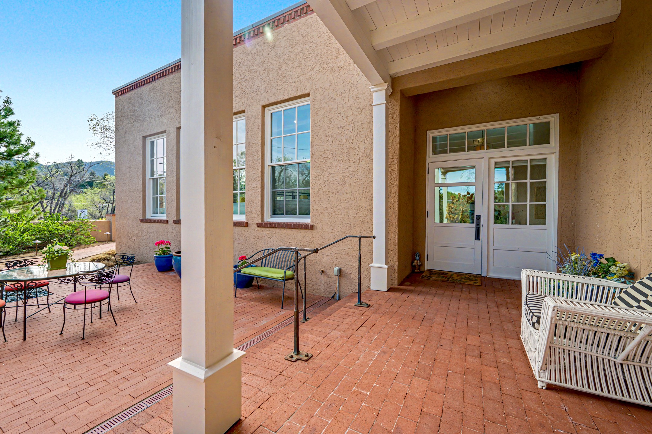 Own a rare piece of Santa Fe history. Situated on a desirable corner lot in one of Santa Fe's most sought-after neighborhoods, this exceptional condominium is part of the historic Manderfield enclave--originally designed in 1927 as a school by renowned architect John Gaw Meem. Thoughtfully reimagined by acclaimed architect Eric Enfield in collaboration with Prull Custom Homes, the property earned the prestigious 2018 Historic Preservation Award. This stunning 2,328-square-foot residence features two ensuite bedrooms and two-and-a-half baths, with soaring ceilings and abundant natural light throughout. The expansive galley kitchen is appointed with top-of-the-line appliances and custom cabinetry, seamlessly opening to a refined great room with hand-plastered walls, rich wood flooring, and a cozy gas fireplace. The oversized owner's suite offers a true retreat, complete with high ceilings, a gas fireplace, and large windows framing views of the Santa Fe foothills. Step outside to the largest courtyard in this luxury compound--an entertainer's dream. A territorial-style portal and beautifully landscaped wraparound outdoor space create the perfect setting for both intimate gatherings and relaxed evenings. Additional highlights include a coveted two-car garage and covered carport--an exceptional amenity in this area. Just moments away, enjoy a stroll down historic Canyon Road to world-class art galleries, or dine at the iconic Geronimo restaurant. This is Santa Fe living at its finest, where history, design, and location come together effortlessly.