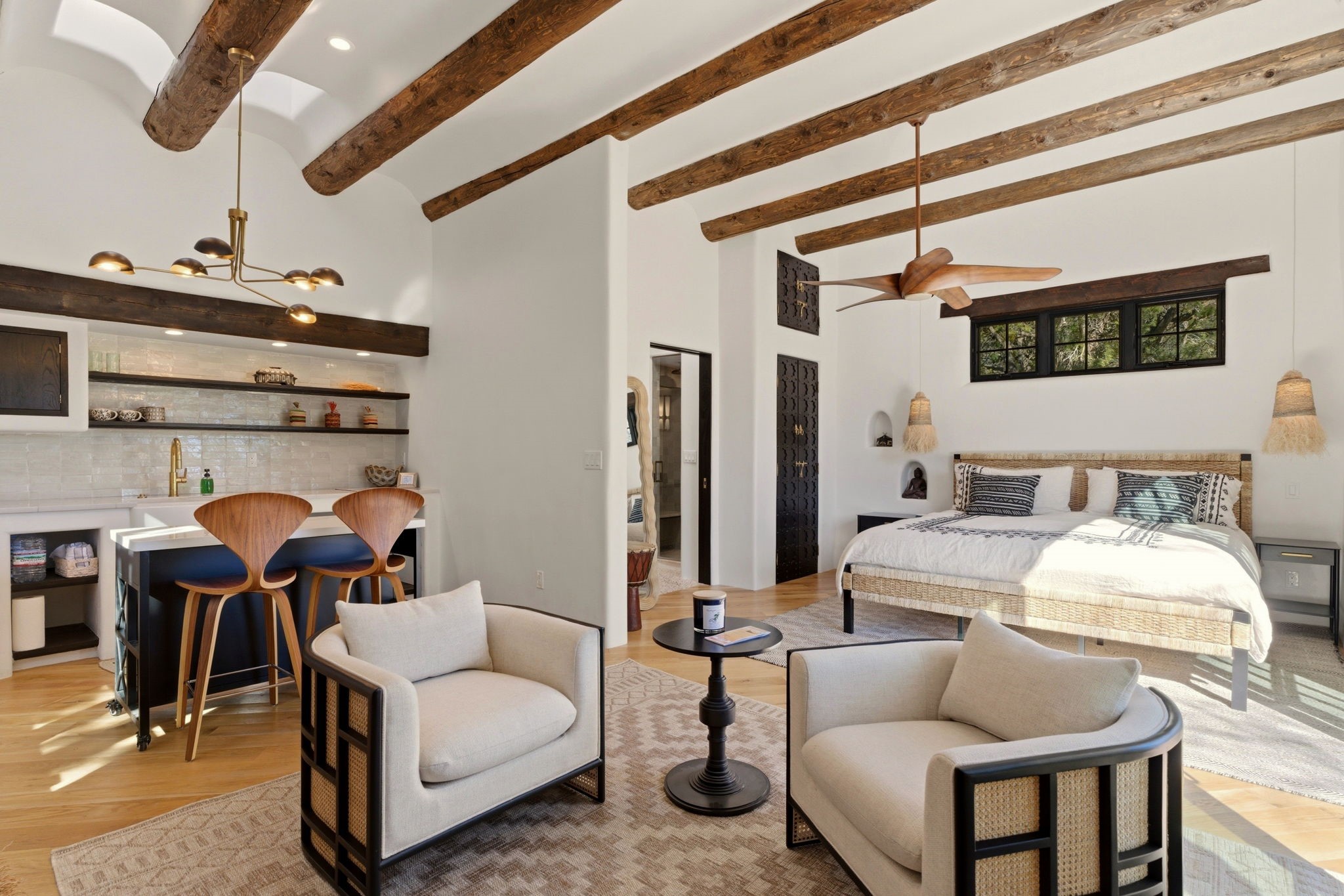 Set on approximately 2 private acres in one of Santa Fe's most coveted foothill enclaves, just a few quick minutes from Museum Hill and the Eastside, this exceptional compound unfolds as a beautifully composed private retreat defined by space, light, and remarkable natural surroundings. The property encompasses apx 3,610 sqft with a 3 BR / 4 BA configuration. The main residence spans roughly 3,040 sqft with 2 BR / 3 BA filled with natural light from skylights and expansive windows that frame Santa Fe's legendary deep blue skies, brilliant pink sunsets, and luminous night skies. Authentic Santa Fe elements are abundant throughout, including vigas, latillas, nichos, and 3 kiva fireplaces. Luxurious wood, brick, and tile flooring and a streamlined elegant chef's kitchen with stainless appliances anchor the home's inviting living spaces. Historic elements from its original 1947 construction lend character and warmth throughout, though recently and thoroughly updated and completely renovated and modernized. A separate guest house of approximately 570 sqft completely reimagined offers a beautifully stunning and private 1 BR / 1 BA retreat. Distinctive Moroccan-imported doors and hardware open to interiors highlighted by striking oversized invisible pocket doors and diagonal blonde wood floors with a steam shower, creating an inviting and stylish sanctuary for guests, creative pursuits, or quiet retreat. Air-conditioning cools in the height of summer's hottest days. At the center of its outdoor experience is a newly redone walled and private saltwater lap pool with an automatic retractable cover - an elegant retreat for quiet morning swims, sun-drenched afternoons, or moonlit evenings. Surrounding the pool are rare, lush grass lawns - an extraordinary luxury in Santa Fe - along with generous outdoor spaces and private patios designed for spontaneous entertaining and languid moments. This gated paradise provides exceptional privacy and abundant parking with direct, close access from the property to the Sun Mountain trail system - offering the rare privilege of stepping right from your backyard into one of Santa Fe's most beloved hiking landscapes. Here, expansive skies, breathtaking sunsets, and a deep sense of privacy create a lifestyle that is both rare and deeply restorative, Santa Fe itself truly embodied in an exceptional estate.