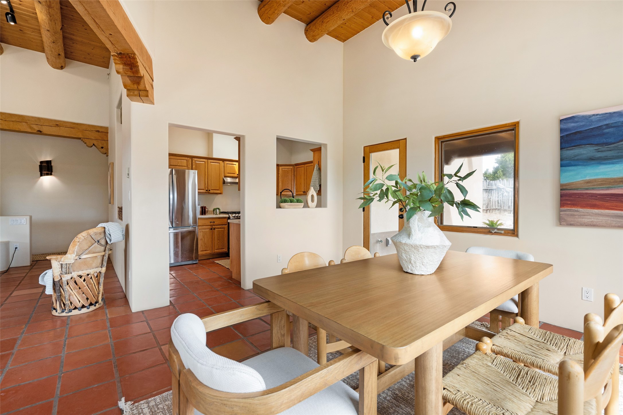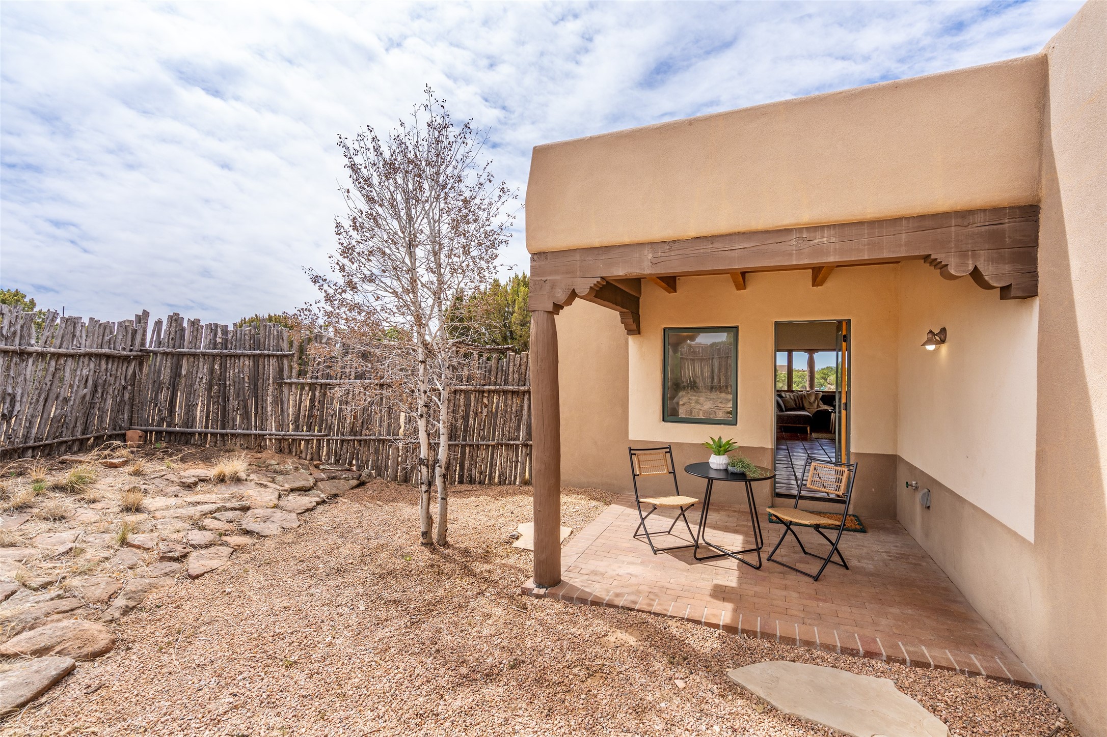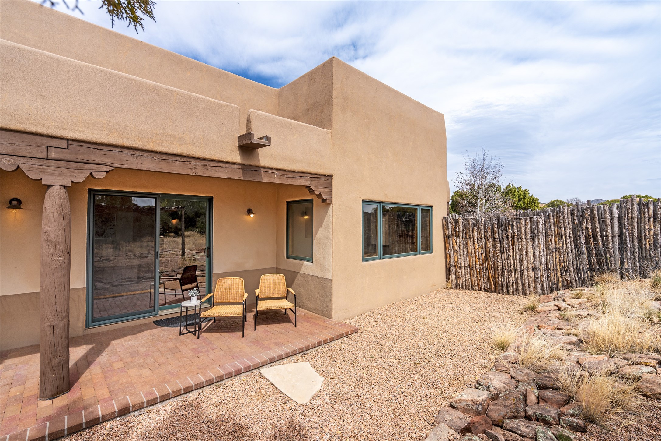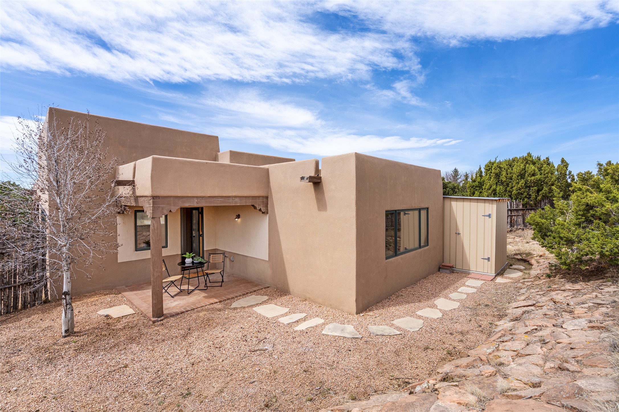 Step into this beautiful light-filled 3-bedroom, 2-bathroom home in the sought-after community of Eldorado. With soaring ceilings, a kiva fireplace, and Saltillo tile, this home is a perfect example of Pueblo Revival architecture and Santa Fe style.The separation of the primary and guest bedrooms make hosting easy, and the open living space creates a welcoming atmosphere for gatherings or quiet evenings at home.Outside, you'll find multiple outdoor living spaces perfect for enjoying the region's stunning sunsets, clear night skies, and peaceful surroundings. Whether it's morning coffee on the patio or hosting friends under the stars, this home makes it easy to enjoy indoor-outdoor living year-round. Enjoy easy access to the Rail Trail through your own private gate. Set on a spacious lot in Eldorado, residents enjoy access to miles of trails, open space, a community pool, dog parks, basketball and tennis courts and a true sense of community. The Eldorado Studio Tour is the largest in Santa Fe, and the backyard shed with electricity is ideal for a kiln or power tools. This is a great opportunity to own a bright, serene home that perfectly blends comfort, functionality, and the beauty of the Southwest.