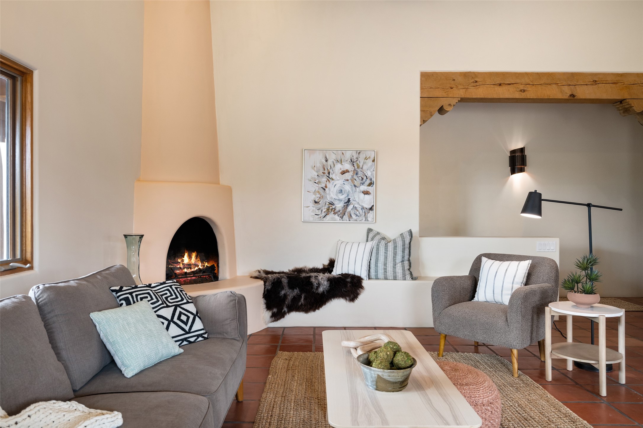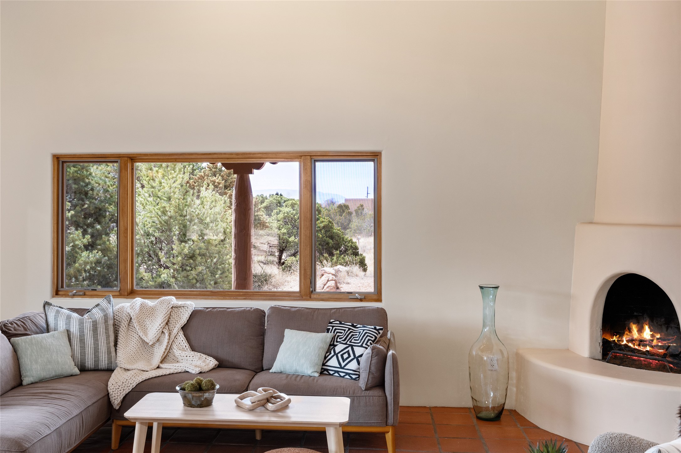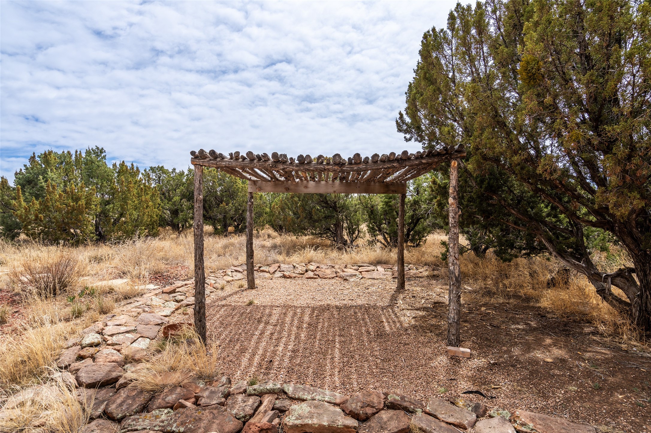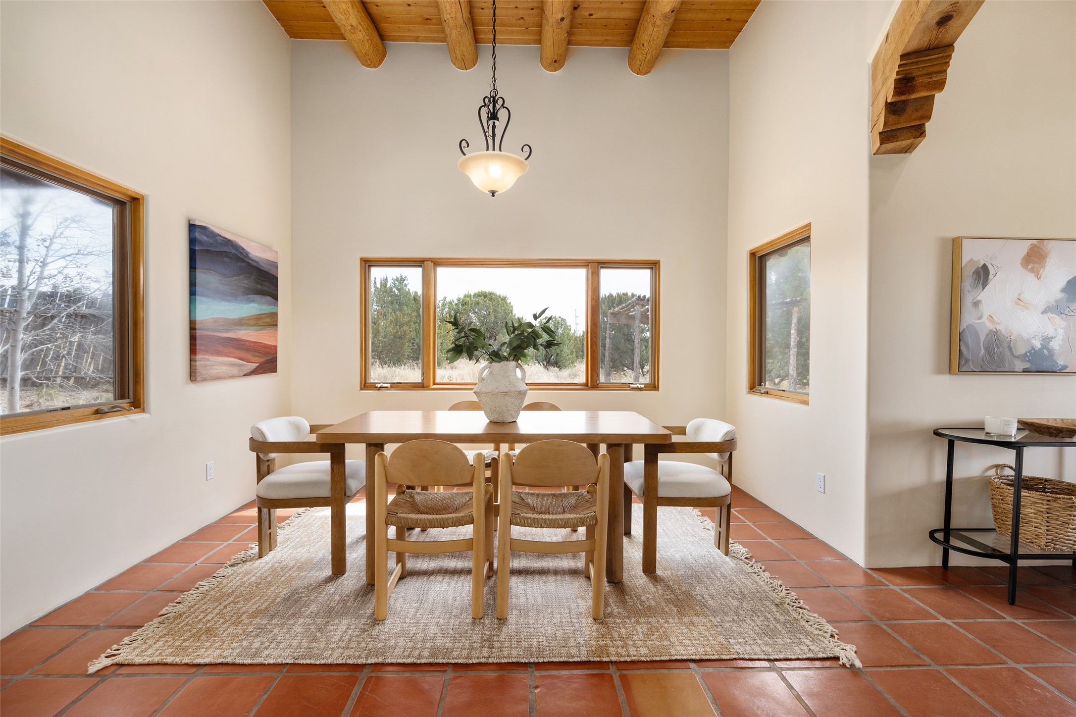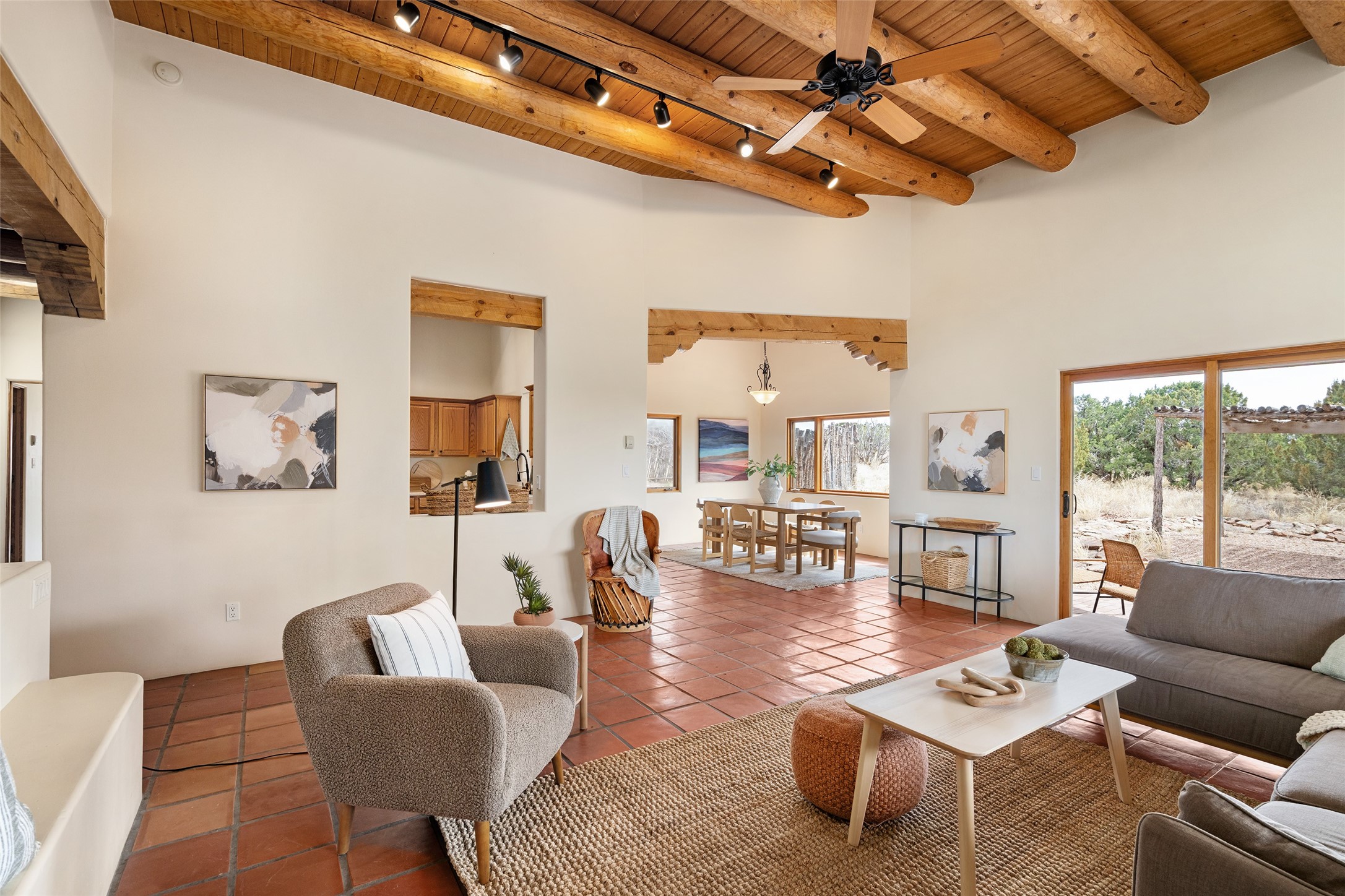 Step into this beautiful light-filled 3-bedroom, 2-bathroom home in the sought-after community of Eldorado. With soaring ceilings, a kiva fireplace, and Saltillo tile, this home is a perfect example of Pueblo Revival architecture and Santa Fe style.The separation of the primary and guest bedrooms make hosting easy, and the open living space creates a welcoming atmosphere for gatherings or quiet evenings at home.Outside, you'll find multiple outdoor living spaces perfect for enjoying the region's stunning sunsets, clear night skies, and peaceful surroundings. Whether it's morning coffee on the patio or hosting friends under the stars, this home makes it easy to enjoy indoor-outdoor living year-round. Enjoy easy access to the Rail Trail through your own private gate. Set on a spacious lot in Eldorado, residents enjoy access to miles of trails, open space, a community pool, dog parks, basketball and tennis courts and a true sense of community. The Eldorado Studio Tour is the largest in Santa Fe, and the backyard shed with electricity is ideal for a kiln or power tools. This is a great opportunity to own a bright, serene home that perfectly blends comfort, functionality, and the beauty of the Southwest.