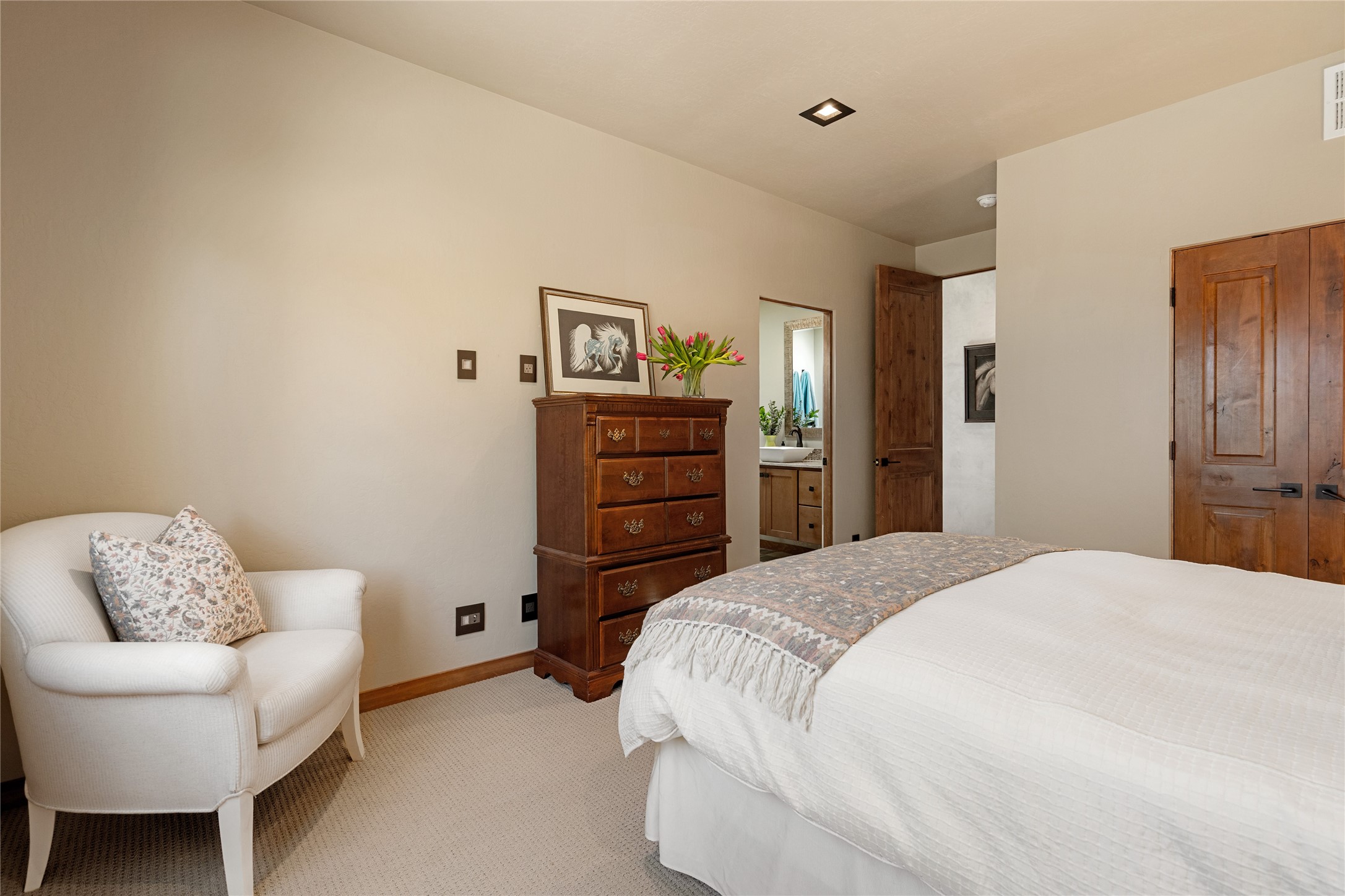 Discover a refined blend of timeless Southwestern charm and modern sophistication in this contemporary Pueblo-style home sited on 1.8+ serene acres with Jemez Mountain views. A private entry courtyard with a tranquil stone water feature welcomes you into beautifully appointed interiors featuring stone accents and high-end finishes throughout.At the heart of the home, the grand chef's kitchen is flooded with natural light from skylights and appointed with top-tier appliances, custom cabinetry and an open, entertainer-friendly layout gracefully flowing to the spacious living room, dining room and portal. The generous primary suite is a private retreat with a cozy gas fireplace, two walk-in closets, dedicated office space, a spa-inspired bath and direct access to its own portal. The well-separated guest wing includes two spacious bedrooms, each with en-suite baths for comfort and privacy. An additional large office/den with a separate entrance and private portal provides an ideal workspace or creative studio.Outdoor living is exceptional -- a spacious rear portal features a large fireplace, outdoor cooking, a pass-through to the wet bar and beverage center, a second water feature and ample room for al fresco dining and relaxation. Practical amenities include a three-car direct-entry garage and a roof-mounted Solar Pro System array. This property offers an unparalleled sanctuary for those seeking privacy, elegance and effortless indoor-outdoor living.