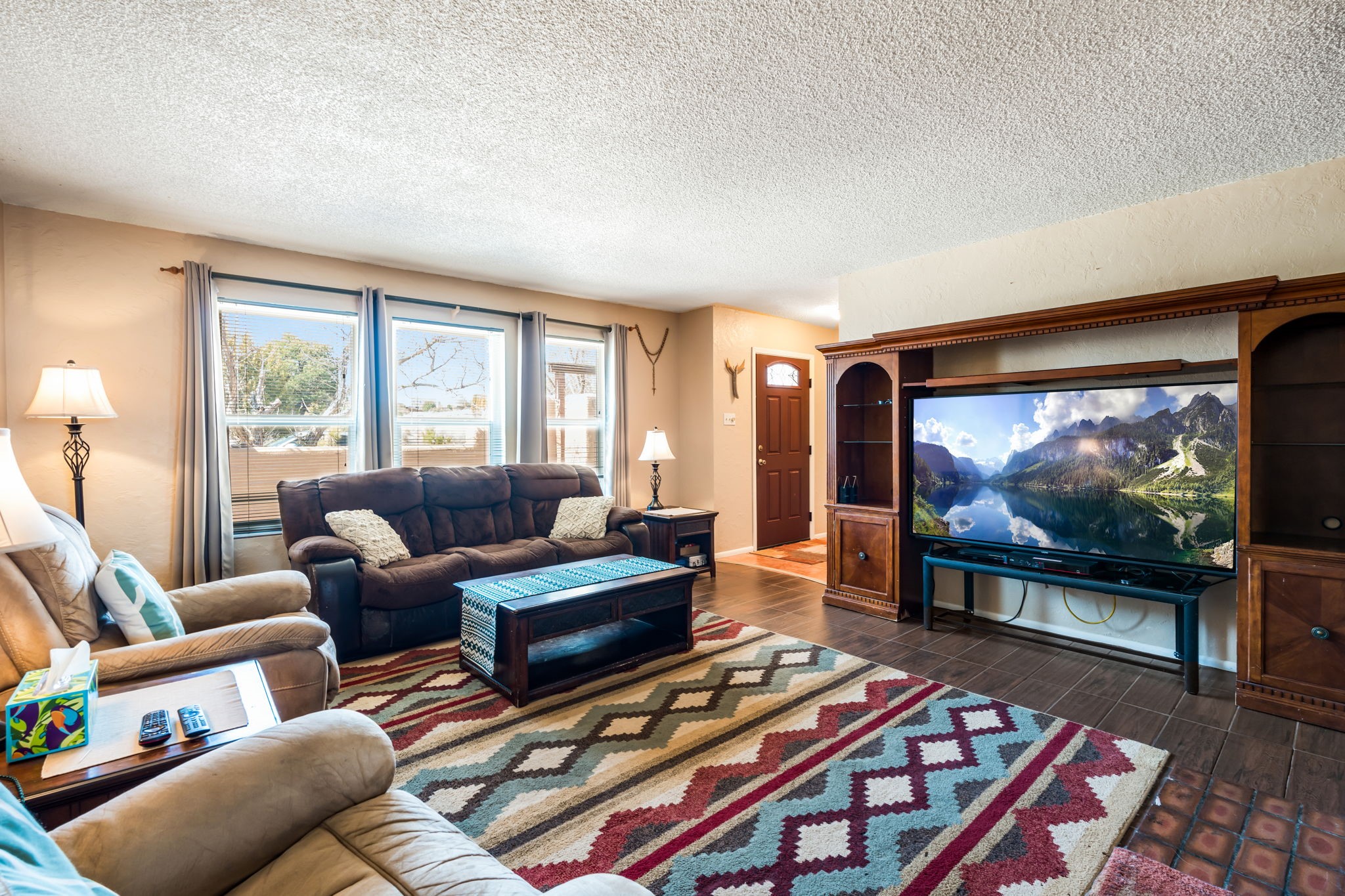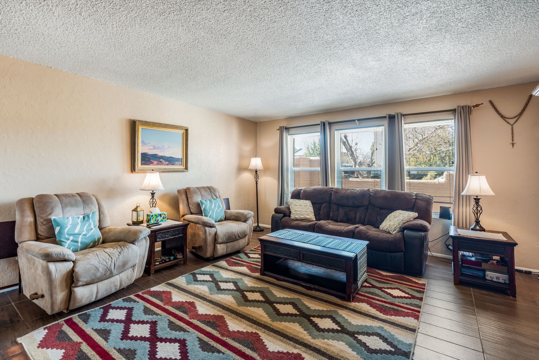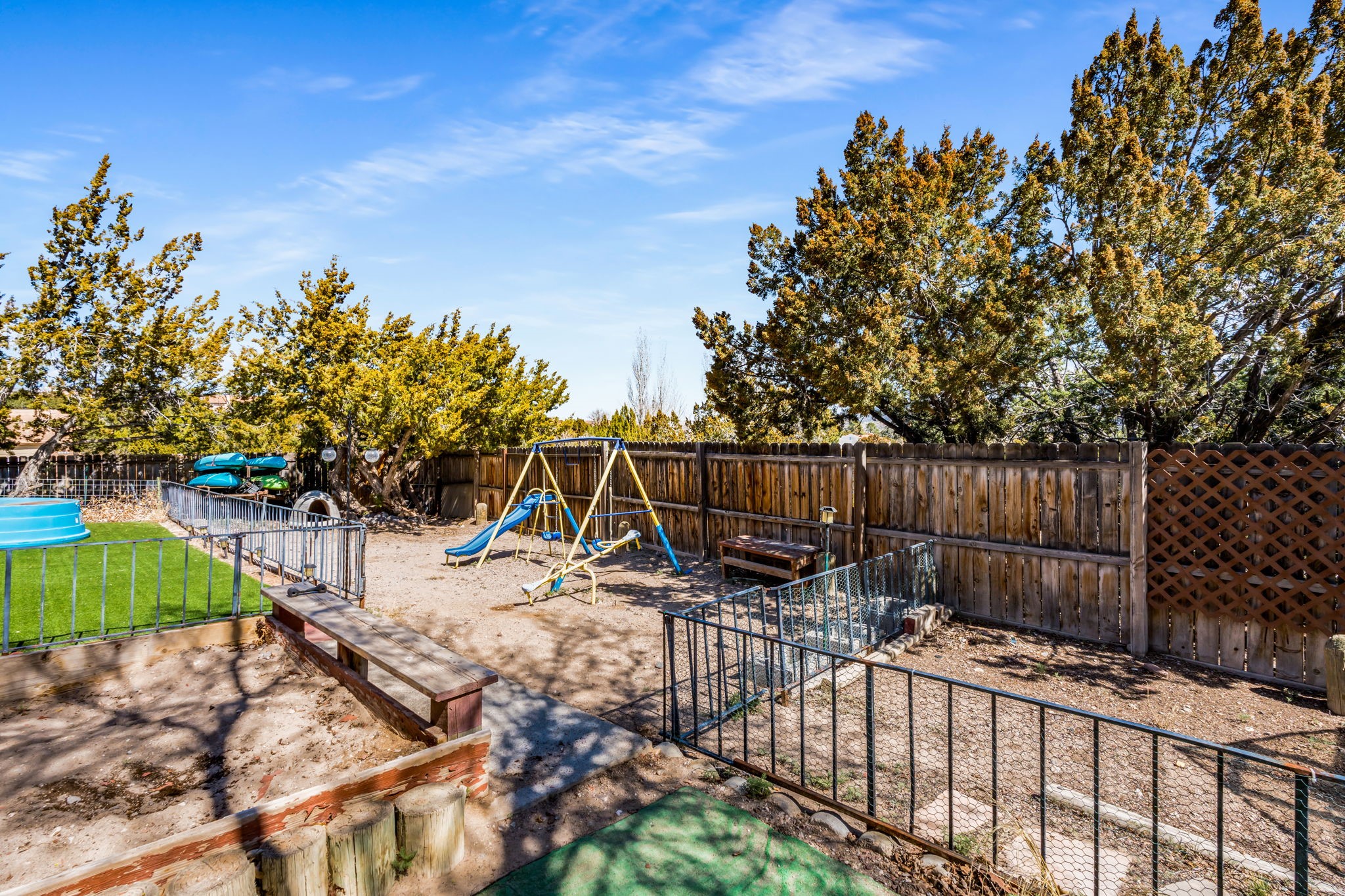 Lovely corner lot Pueblo-style home with large front and back yards and exceptional northern views of Cochiti. The home features a nicely sized living room with a wood burning fireplace and an open plan kitchen and dining that opens to a large deck and backyard with mountain views. The home has three bedrooms and two full baths, a separate laundry room and a connected workshop that will delight a handyperson, an artist or an exercise enthusiast. The home also features a paid-for solar system so utility costs are very, very low! Additionally, the home features central (forced) heat and air conditioning. Nearby Cochiti Lake is popular for fishing and has a beautiful golf course. Cochiti Lake is one the most affordable place to live in Northern New Mexico with easy access to Santa Fe and Alburquerque. Please note that all homes in Cochiti Lake are on a land lease. There is a $150 monthly fee for water, sewage and trash pickup and a $369 per quarter fee for the land lease.
