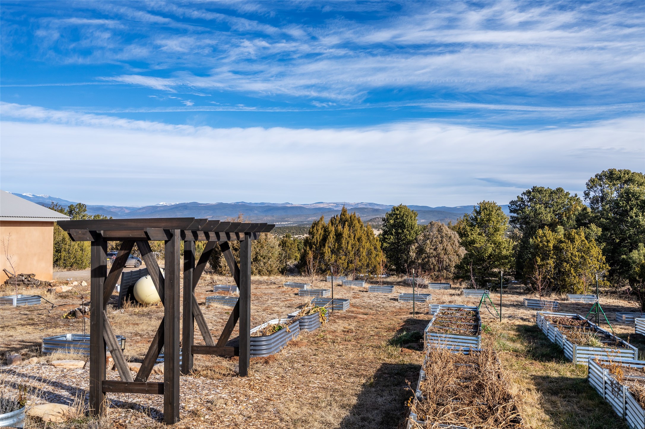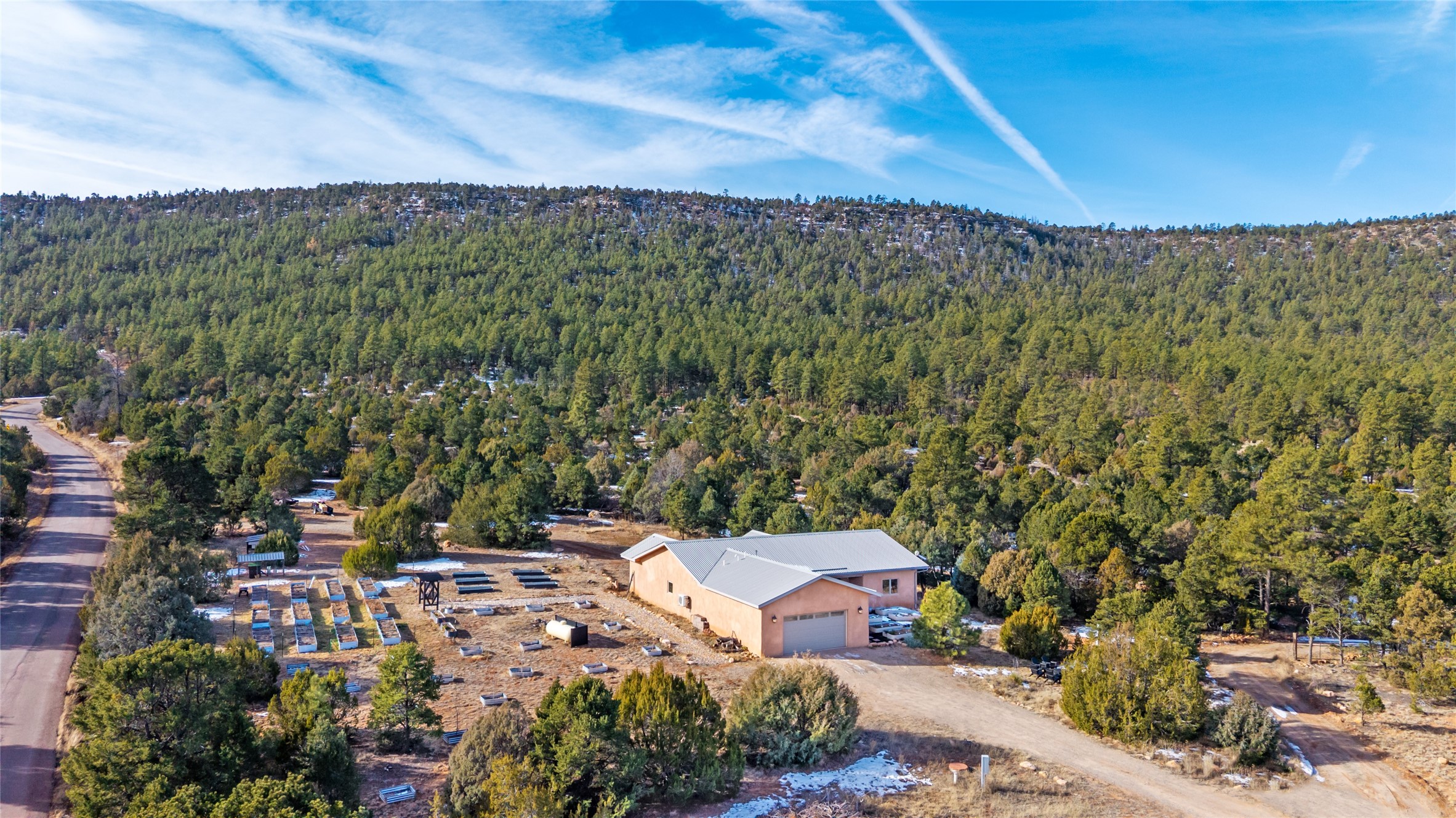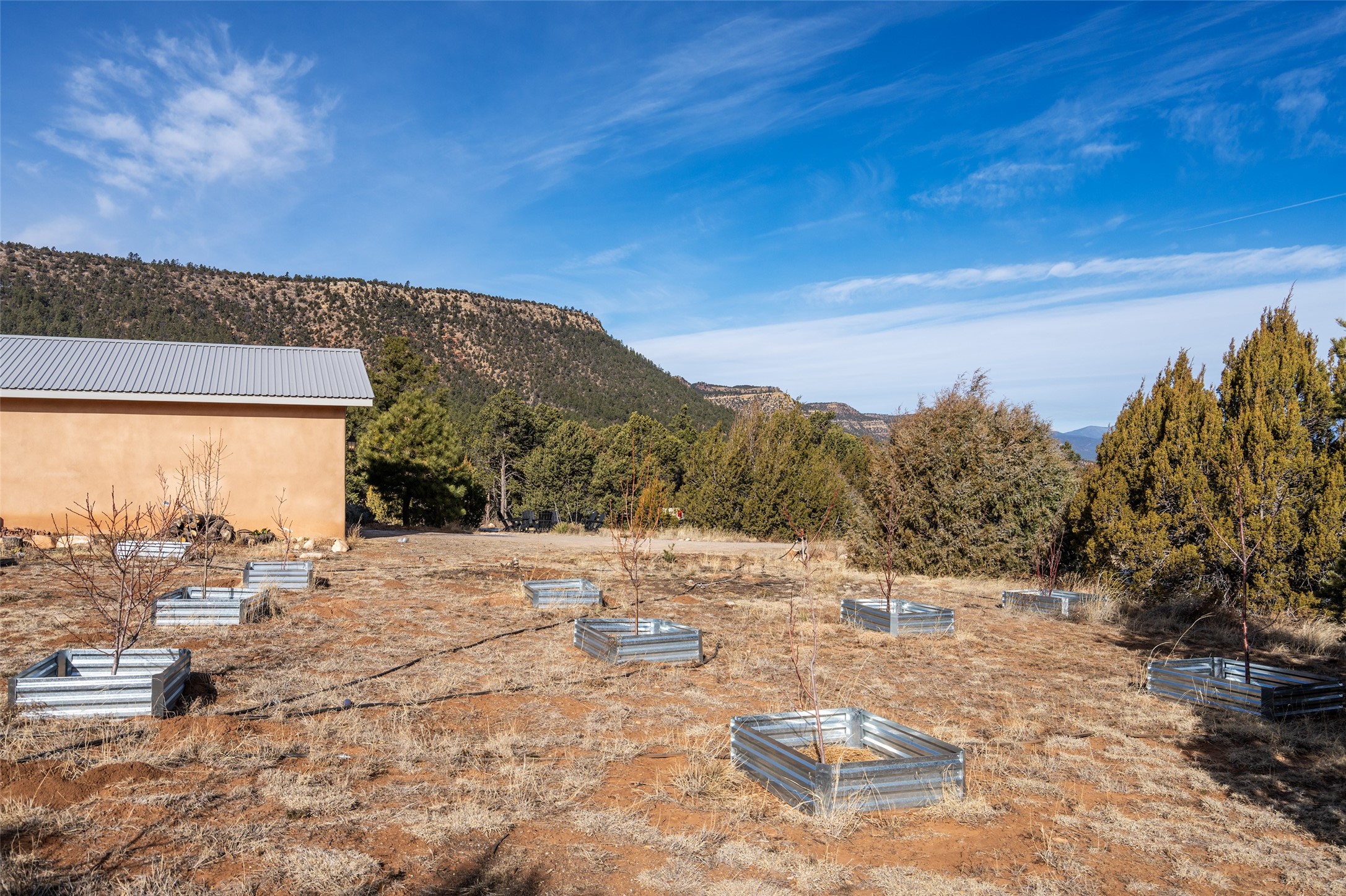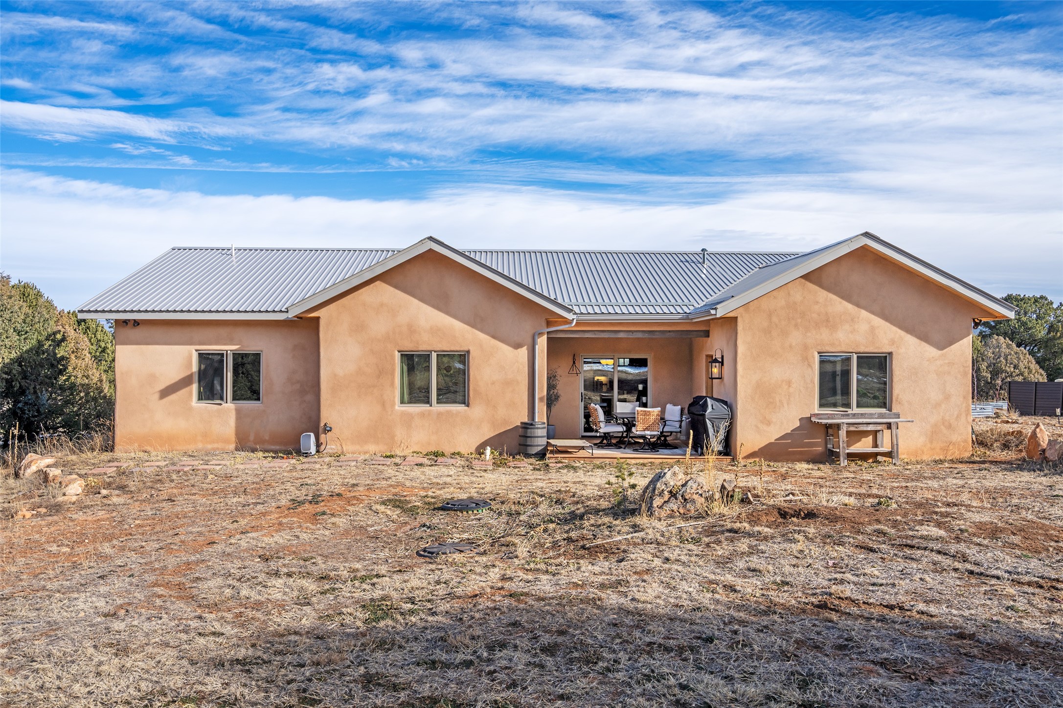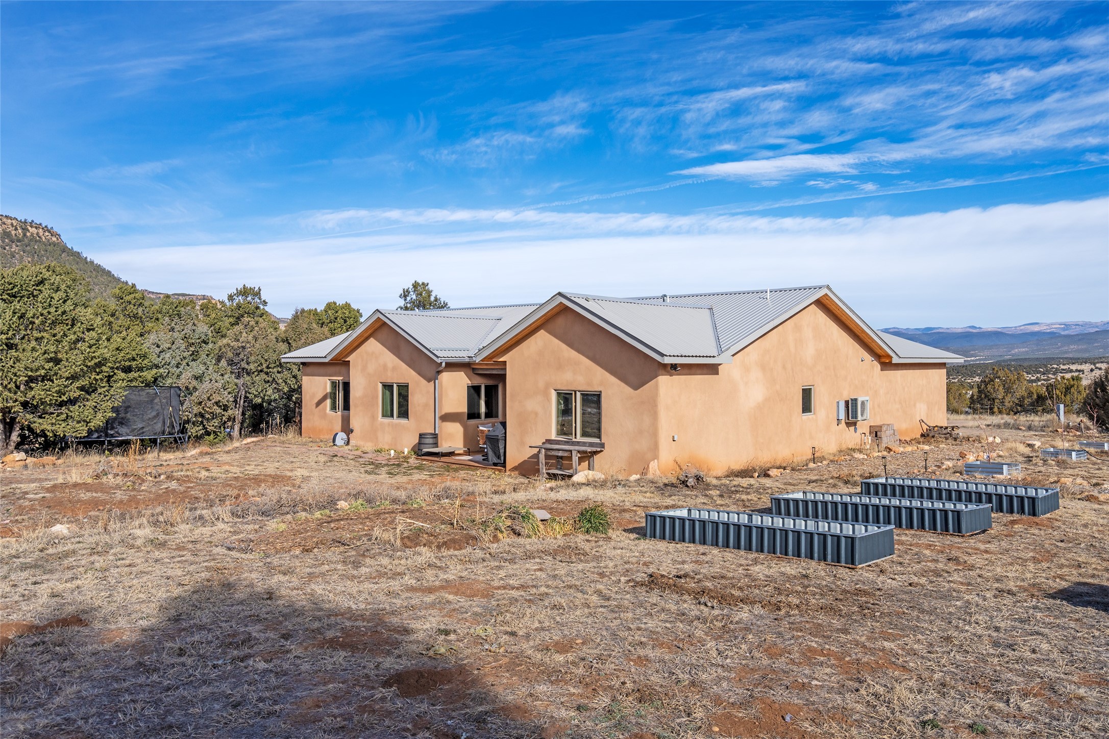 Freshly prepared for spring, this well-maintained property has been thoughtfully refreshed and is move-in ready. Recent updates include fresh interior paint, a newly installed septic system (March 2026) with a two-year warranty, deep-cleaned carpets, cleared personal property, and spruced raised garden beds. The sellers have recently moved out and are presenting a timely opportunity for the next owner. Located at the base of Rowe Mesa, this ranch-style home sits on approximately 3.7 acres of mostly level, usable land, offering expansive skies, mountain views, and a sense of rural privacy--all within an approximate 30-minute drive to Santa Fe. Built in 2021, the custom home features a modern ranch aesthetic with a pitched propanel roof, stucco exterior, and natural finishes throughout. The open-concept living and kitchen area includes island seating, a pantry, and access to the attached two-car garage. Interior details include brick flooring, wood cabinetry, subway tile accents, and wood-planked ceilings. The home offers three bedrooms and two bathrooms, providing flexible living options. Radiant in-floor heating and mini-split systems support year-round comfort. Exterior features include mature fruit trees and established raised garden beds. The property borders public lands associated with the Santa Fe National Forest, offering nearby access to outdoor recreation. This property presents a rare combination of newer construction, usable acreage, and a beautiful high-desert setting.