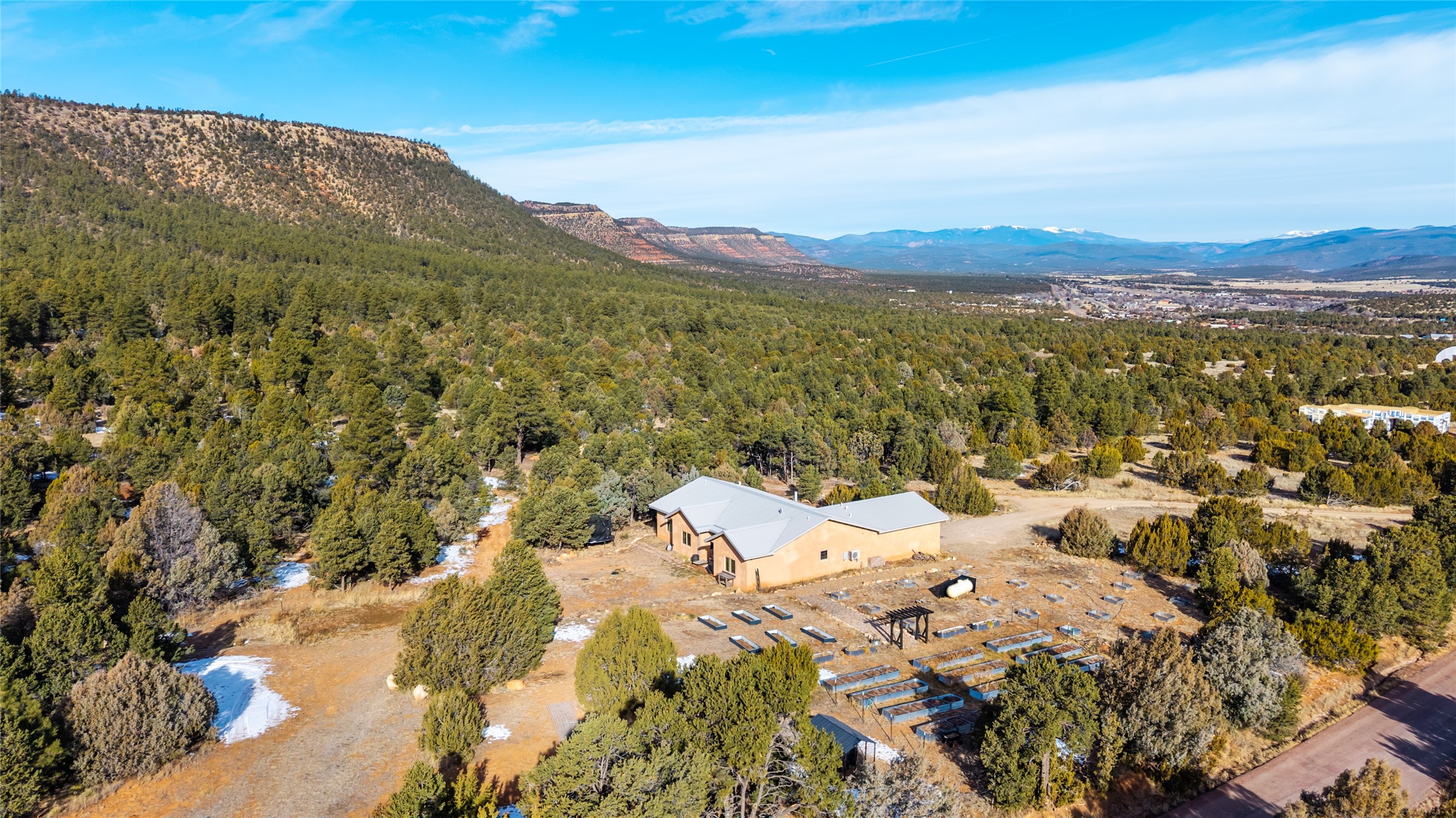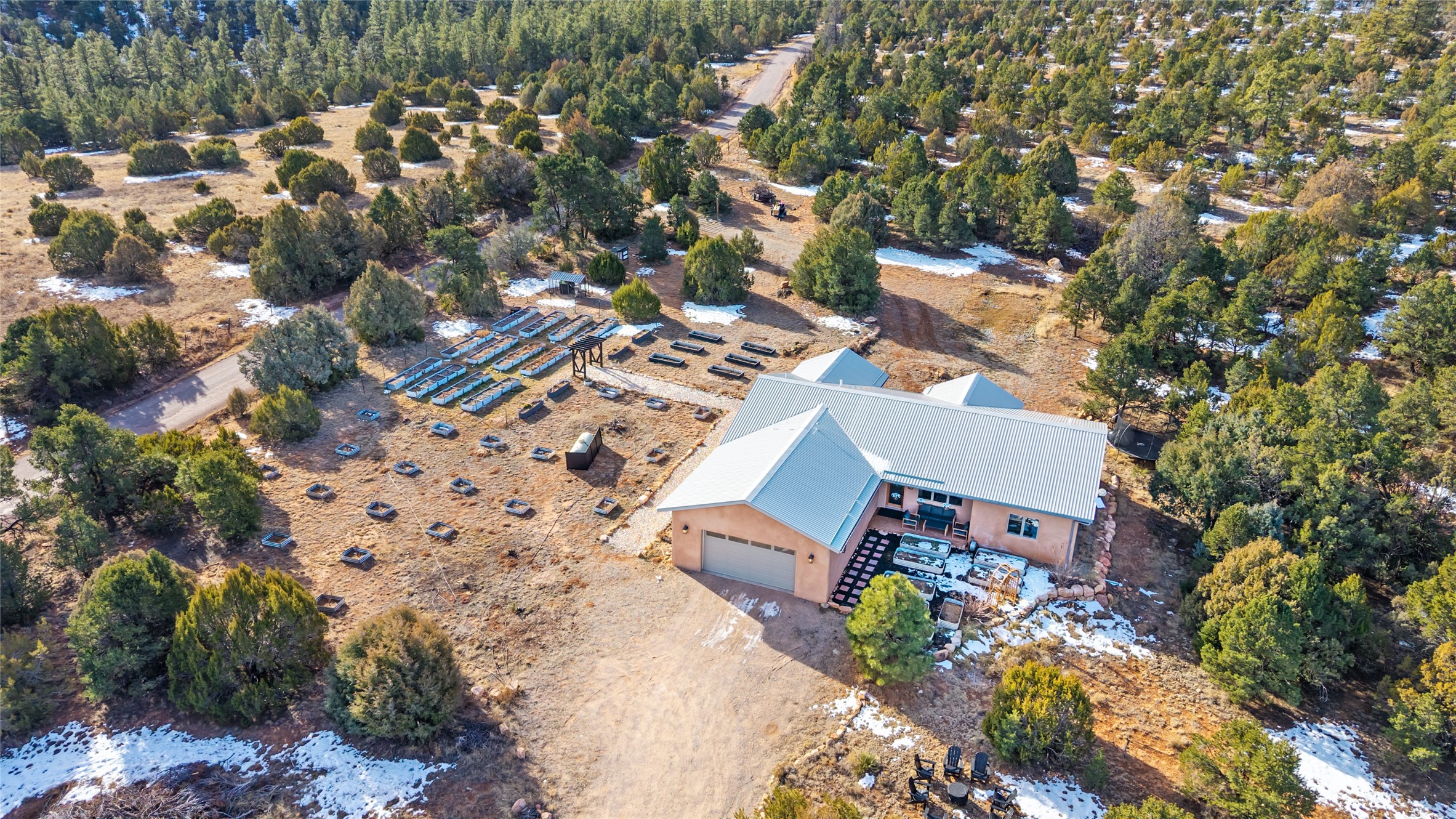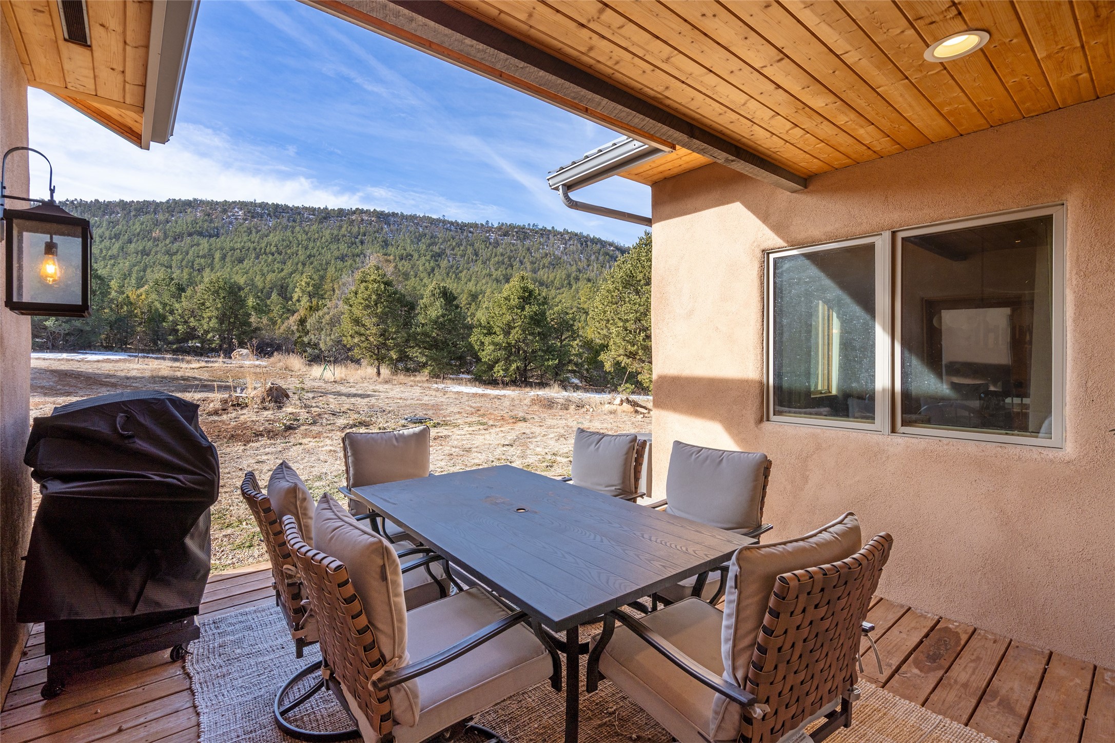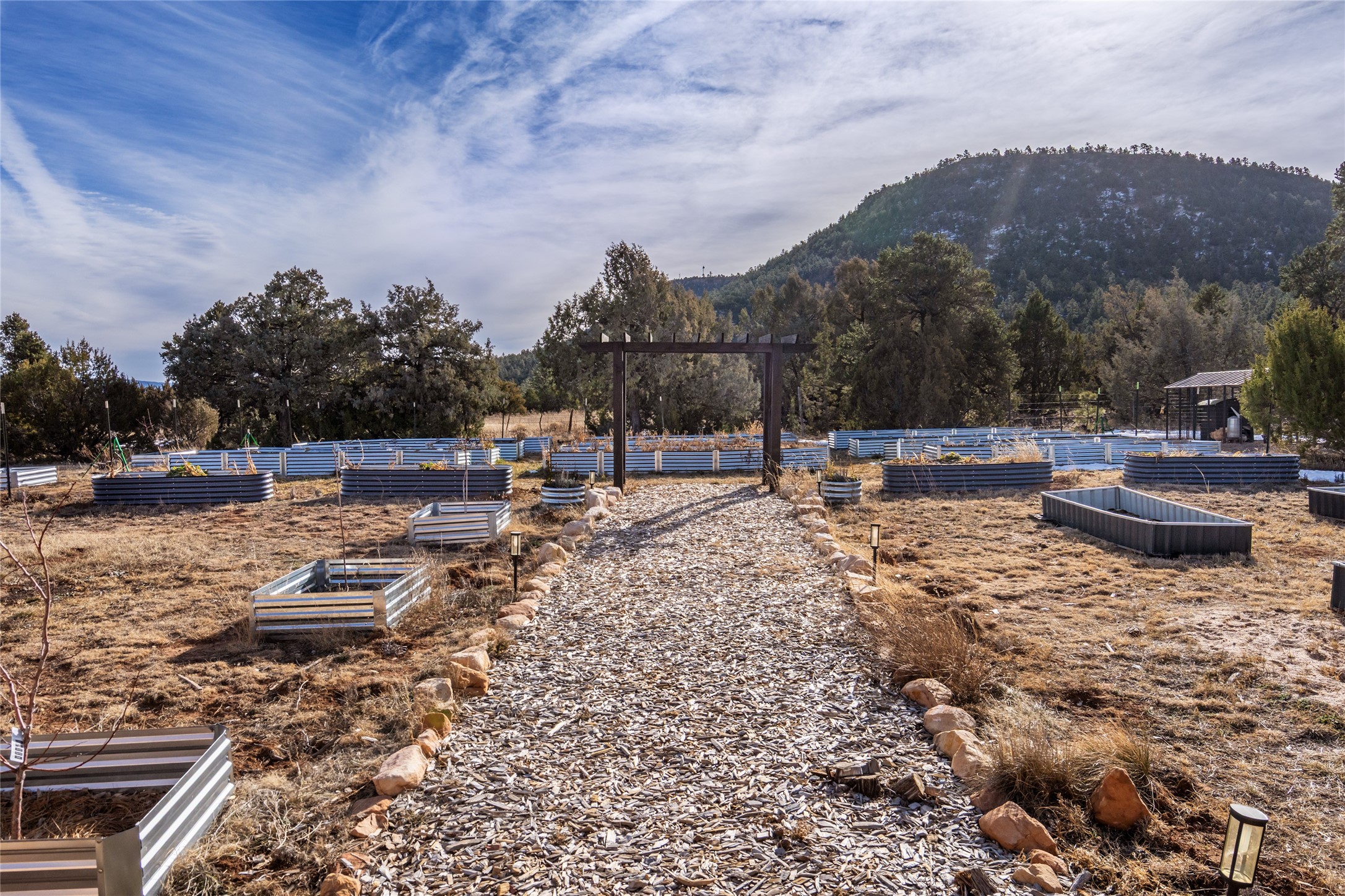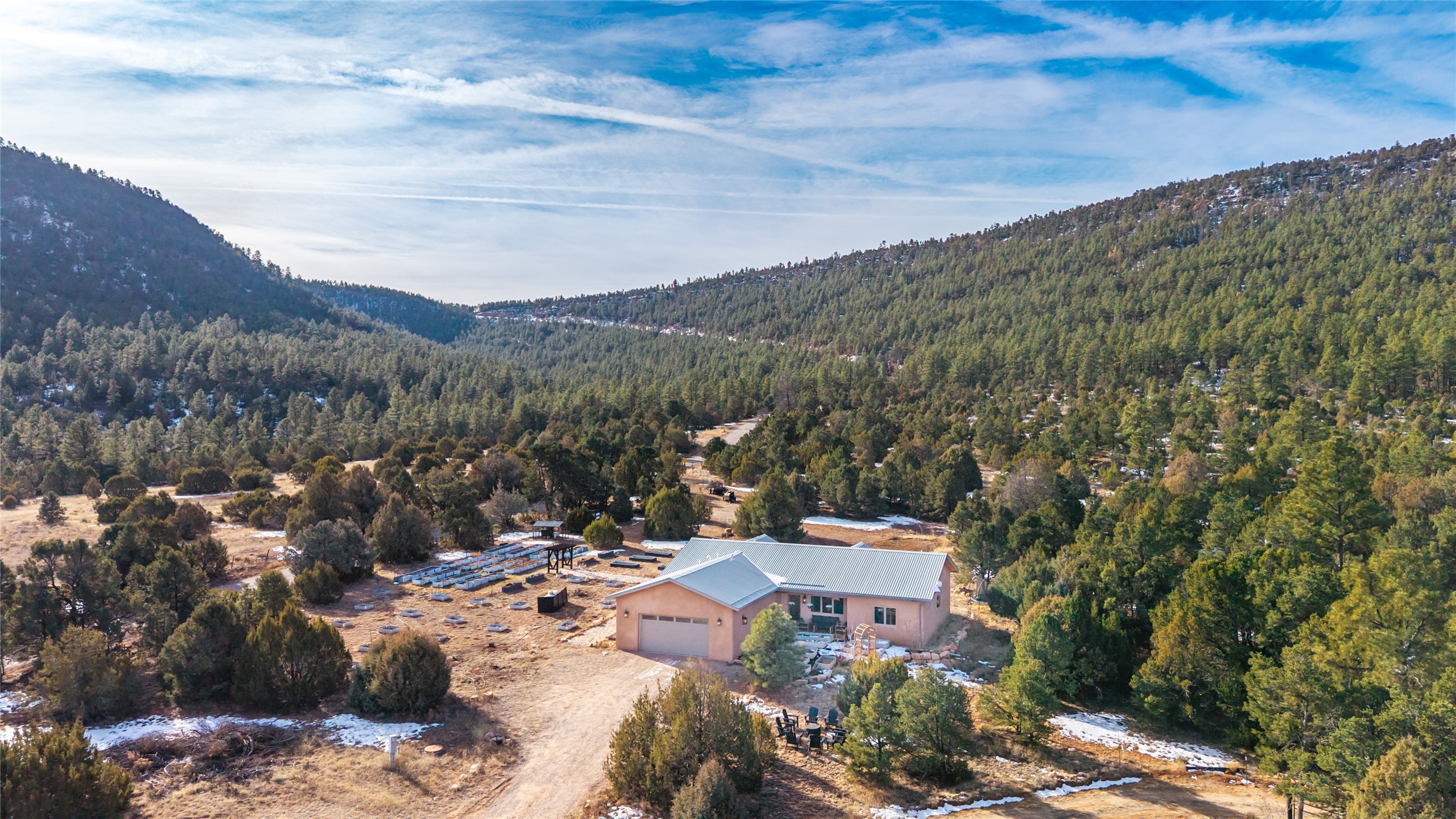 Freshly prepared for spring, this well-maintained property has been thoughtfully refreshed and is move-in ready. Recent updates include fresh interior paint, a newly installed septic system (March 2026) with a two-year warranty, deep-cleaned carpets, cleared personal property, and spruced raised garden beds. The sellers have recently moved out and are presenting a timely opportunity for the next owner. Located at the base of Rowe Mesa, this ranch-style home sits on approximately 3.7 acres of mostly level, usable land, offering expansive skies, mountain views, and a sense of rural privacy--all within an approximate 30-minute drive to Santa Fe. Built in 2021, the custom home features a modern ranch aesthetic with a pitched propanel roof, stucco exterior, and natural finishes throughout. The open-concept living and kitchen area includes island seating, a pantry, and access to the attached two-car garage. Interior details include brick flooring, wood cabinetry, subway tile accents, and wood-planked ceilings. The home offers three bedrooms and two bathrooms, providing flexible living options. Radiant in-floor heating and mini-split systems support year-round comfort. Exterior features include mature fruit trees and established raised garden beds. The property borders public lands associated with the Santa Fe National Forest, offering nearby access to outdoor recreation. This property presents a rare combination of newer construction, usable acreage, and a beautiful high-desert setting.