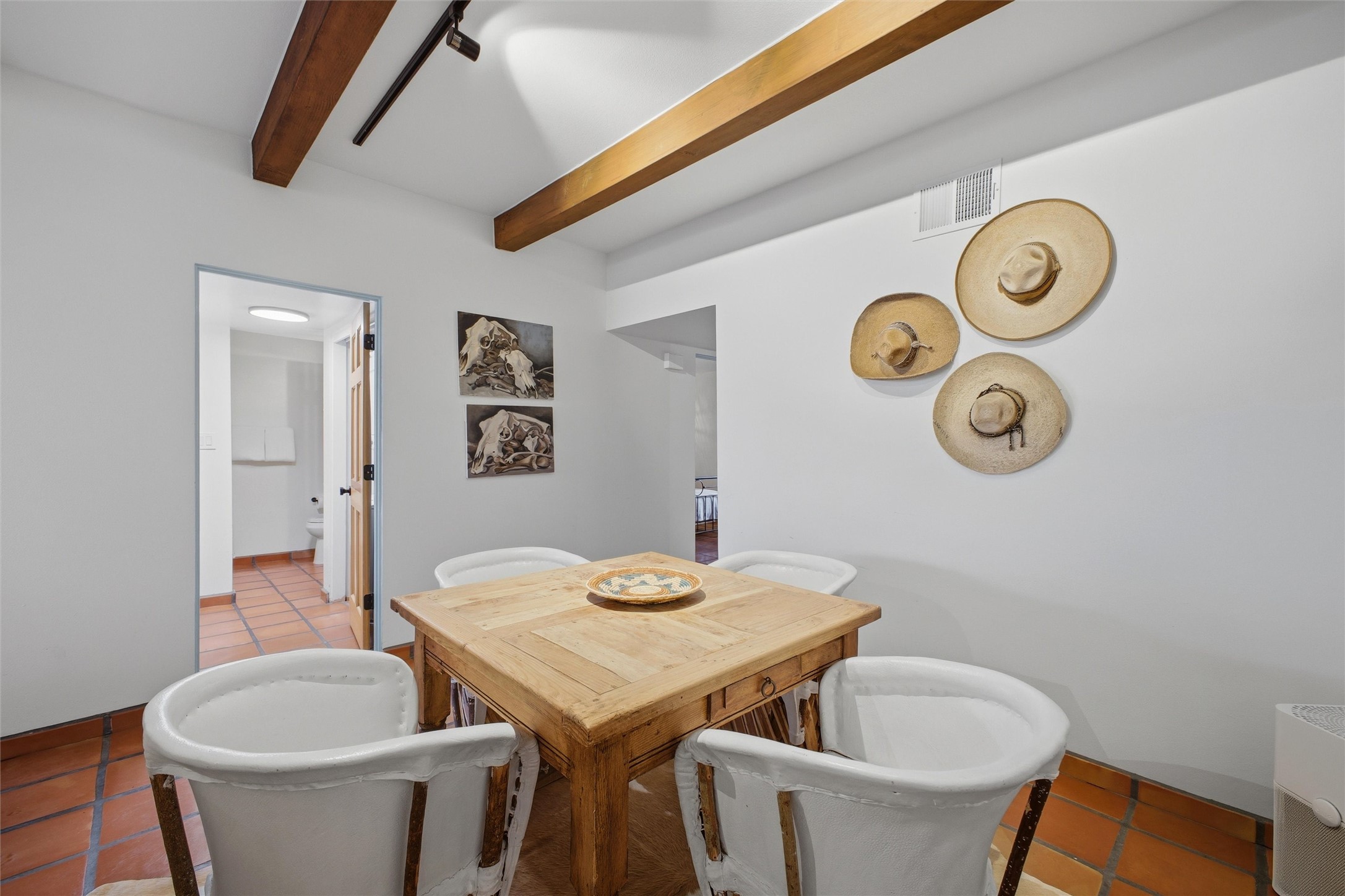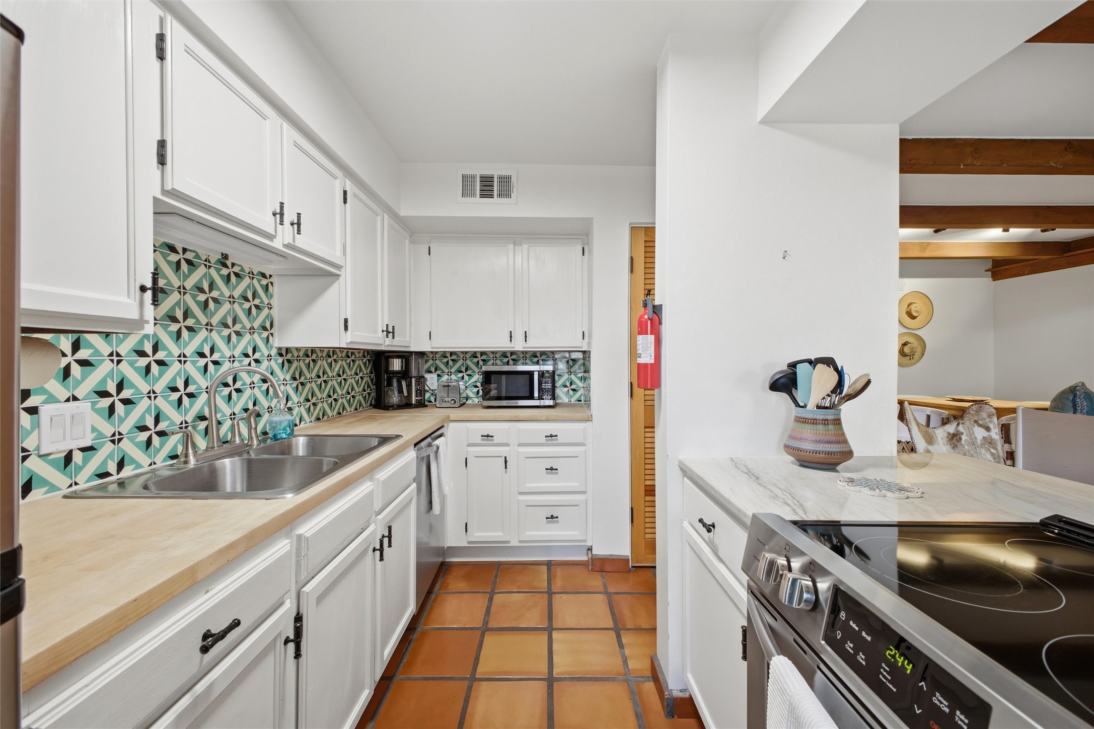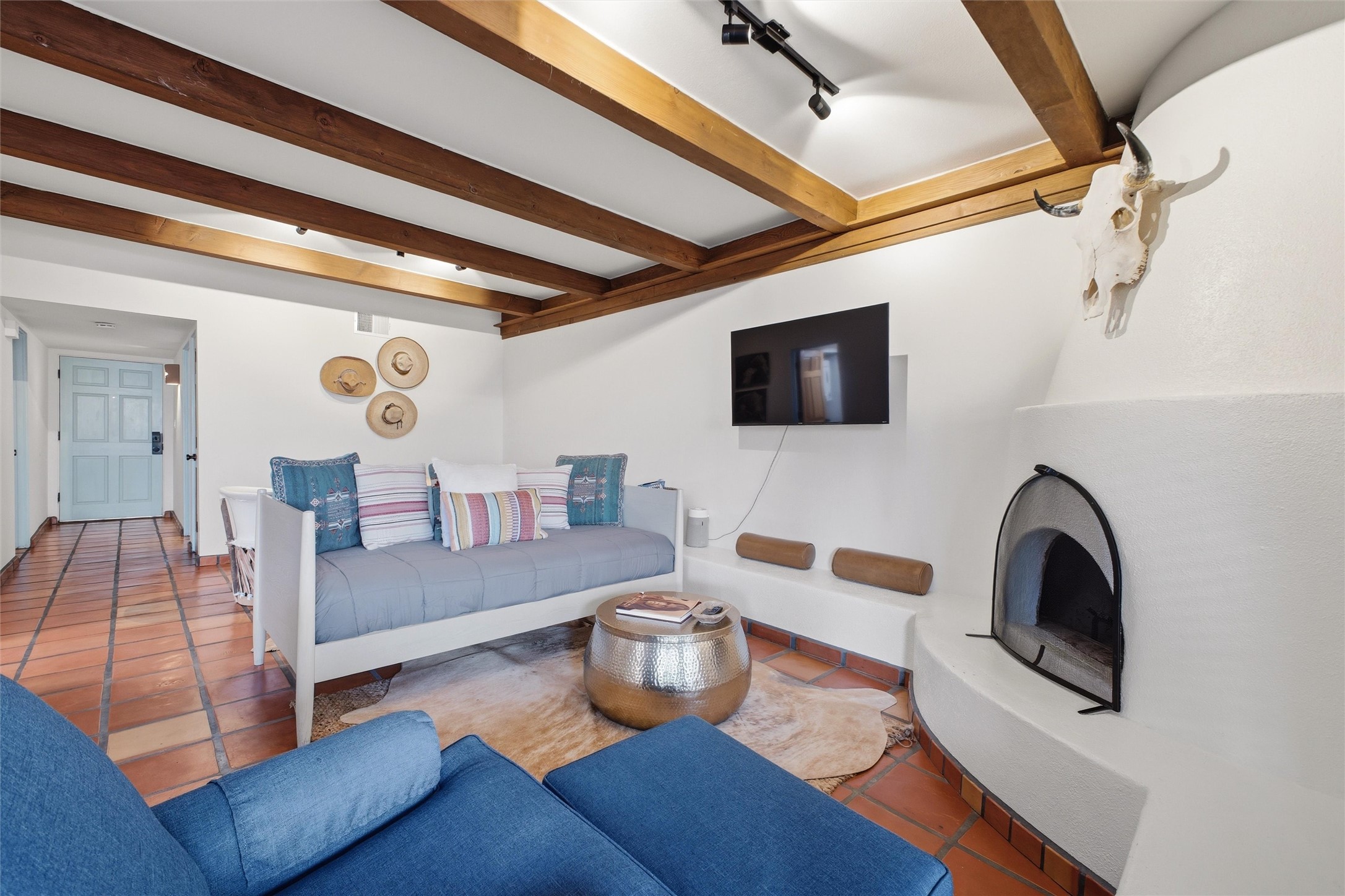 Welcome to this charming condo located on the northside, conveninetly located within close proximity to downtown & the Plaza. This wonderful property features saltillo tile flooring, vigas, solid wood doors, and more. Furnace & AC unit, as well as the water heater were all replaced in 2024. Kitchen features newer stainless steel appliances as well as a tiled backsplash. Newer vanities in both bathrooms, this one is turn-key. This complex is Short Term Rental friendly. Come see it today.