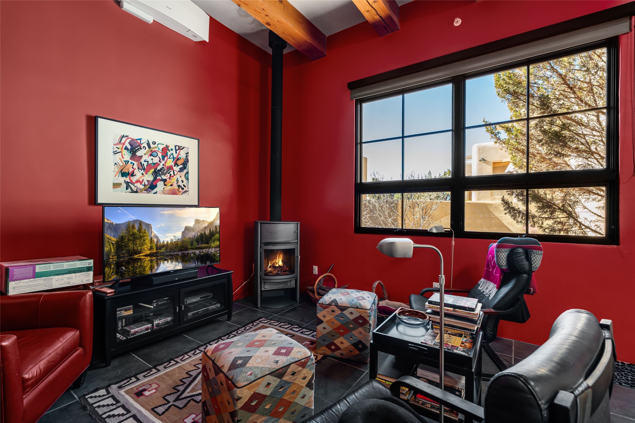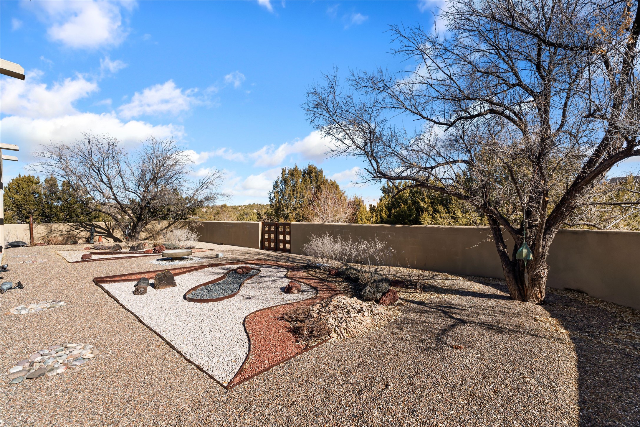Located in the desirable Heartstone community, only a ten-minute drive to the center of Santa Fe, this Santa Fean Magazine award-winning, charming and unique 3-bedroom, 3.5-bath soft contemporary home and guesthouse offers breathtaking mountain views. Single level; no interior stairs. High end architectural design with warm wood beams, plentiful built-ins and Venetian plaster. Spacious living room and library/study with 14 ft. ceilings, stately fireplace and access to outdoor portals for expanded entertaining. Chef's kitchen is appointed with double oven, 6-burner gas range, wine cooler, double sink and center island with prep sink and eating counter. Off the kitchen is a separate dining area with a wood-burning fireplace and secondary living/media room with a built-in desk area and wood burning stove--an ideal place to huddle on wintry nights. Public and private spaces radiate from the entry hall and are separated by a an Asian-inspired atrium and waterfall pond. The 898 sq. ft. guesthouse features a living/dining area, kitchen, bedroom, full bath, an office and a sizable flex space now being used as an art studio. Oversized 2-car heated garage. Newer furnace, hot water heater and roof. A spectacular, low maintenance, designer landscaped backyard includes a water feature. Heartstone is characterized by half-acre lots, thoughtfully arranged around a shared meadow and many acres of permanently dedicated open space, fostering a connection to nature and tranquility. For those who enjoy an active lifestyle, the community is surrounded by a network of trails, granting access to the La Tierra Trails--a multi-use system featuring 25 miles of paths designed for hikers, cyclists, and equestrians alike. The community house serves as a venue for social gatherings and activities, complemented by an exercise room, guest bedroom/bathroom, large dining room and media room. Located in the desirable Tano Road area, this residence provides easy access to the vibrant Santa Fe Plaza, the artistic charm of Canyon Road, the Santa Fe's Farmer's Market, and the renowned Santa Fe Opera.