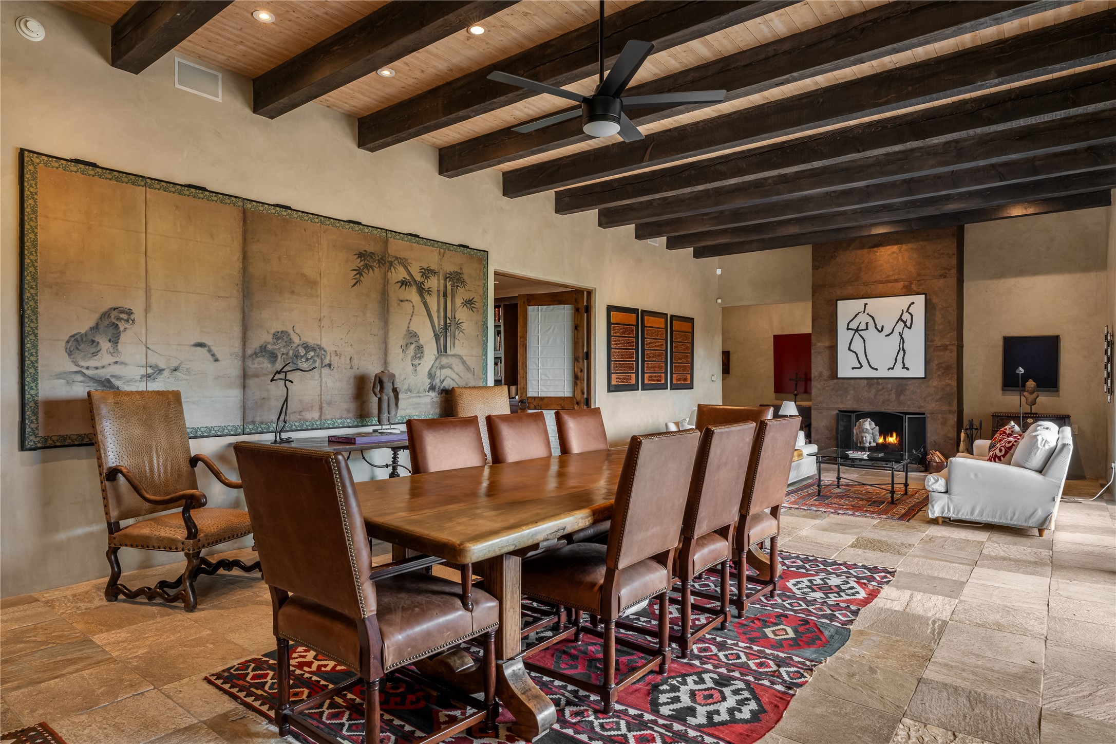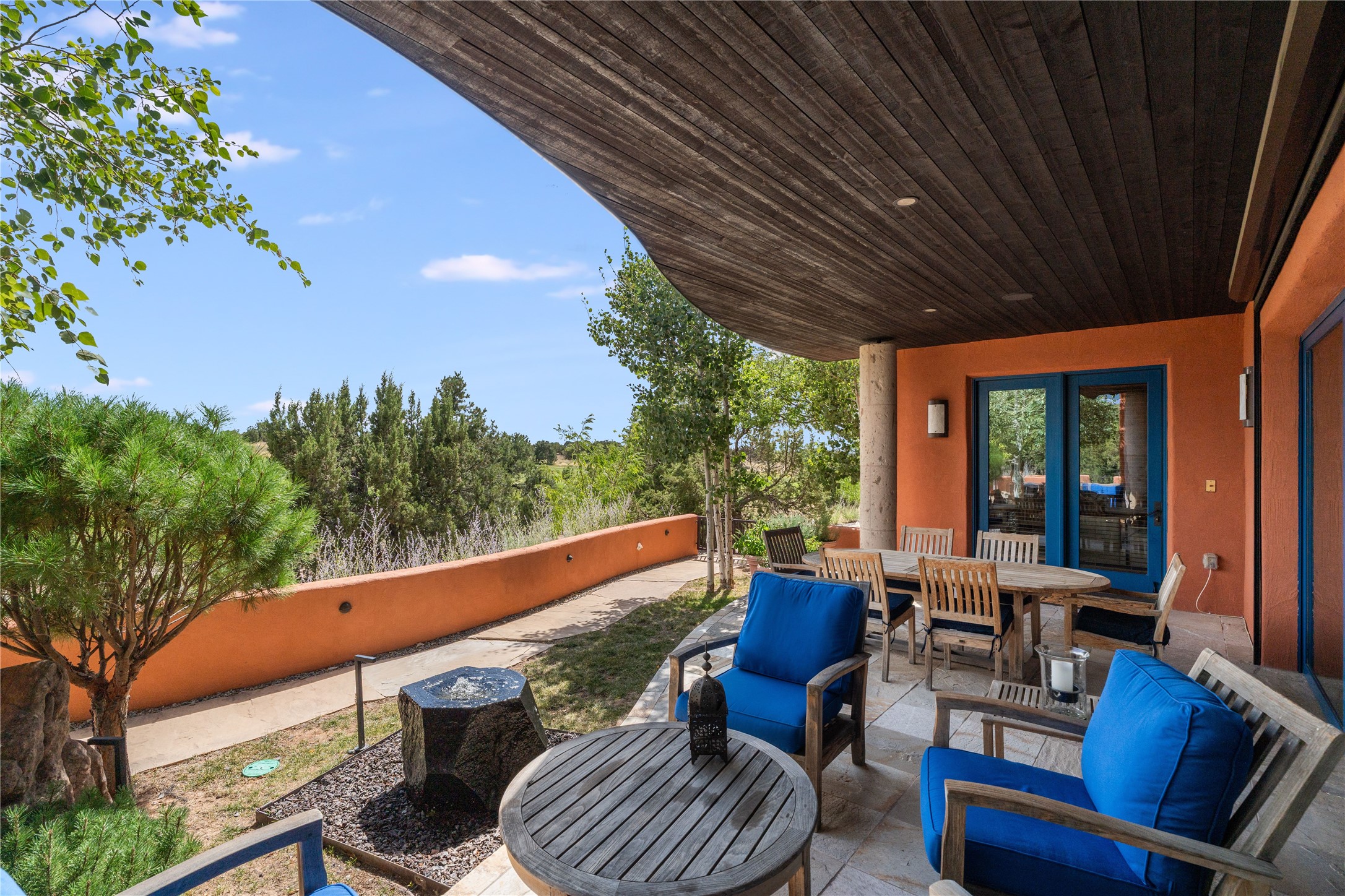 From the moment you arrive, this residence draws you in with its blend of timeless craftsmanship and modern sophistication. Set in the exclusive Puertas enclave of Las Campanas, this soft contemporary home overlooks the 10th fairway of the Jack Nicklaus designed Sunset Course, offering sweeping fairway views and year-round greenery in a serene, private setting. Designed for effortless indoor/outdoor living, with sliding glass doors that recede completely to create a dramatic 16-foot opening, bringing Santa Fe's legendary blue skies and natural light into the heart of the home. Expansive portals and patios frame multiple outdoor living areas, ideal for entertaining or relaxing, including an in-ground spa. Inside, slate and wood floors, hand troweled plaster walls, and four fireplaces--including two kivas--enhance the warm, inviting ambiance. The open-concept living and dining area flows into a chef's kitchen featuring high end appliances, granite counters, custom cabinetry, and a walk-in pantry. Adjacent to the kitchen is an informal living or dining area. The luxurious primary suite enjoys golf course views, a fireplace, private portal, spa-like bath with whirlpool tub, separate shower, custom tilework, and a generous walk-in closet. A private guest suite offers its own kiva fireplace and en-suite bath, while the third bedroom/study with built-ins and adjacent bath provides flexible space for guests or office use. Additional highlights include a two-car garage, refrigerated A/C, hand-forged hardware, hardwood accents, and an adobe entry wall with flagstone detail that sets a distinctive tone. Combining rustic authenticity with contemporary elegance, this home delivers the best of Santa Fe living in a true "lock and leave" setting with unparalleled design, fine finishes, and breathtaking fairway views.