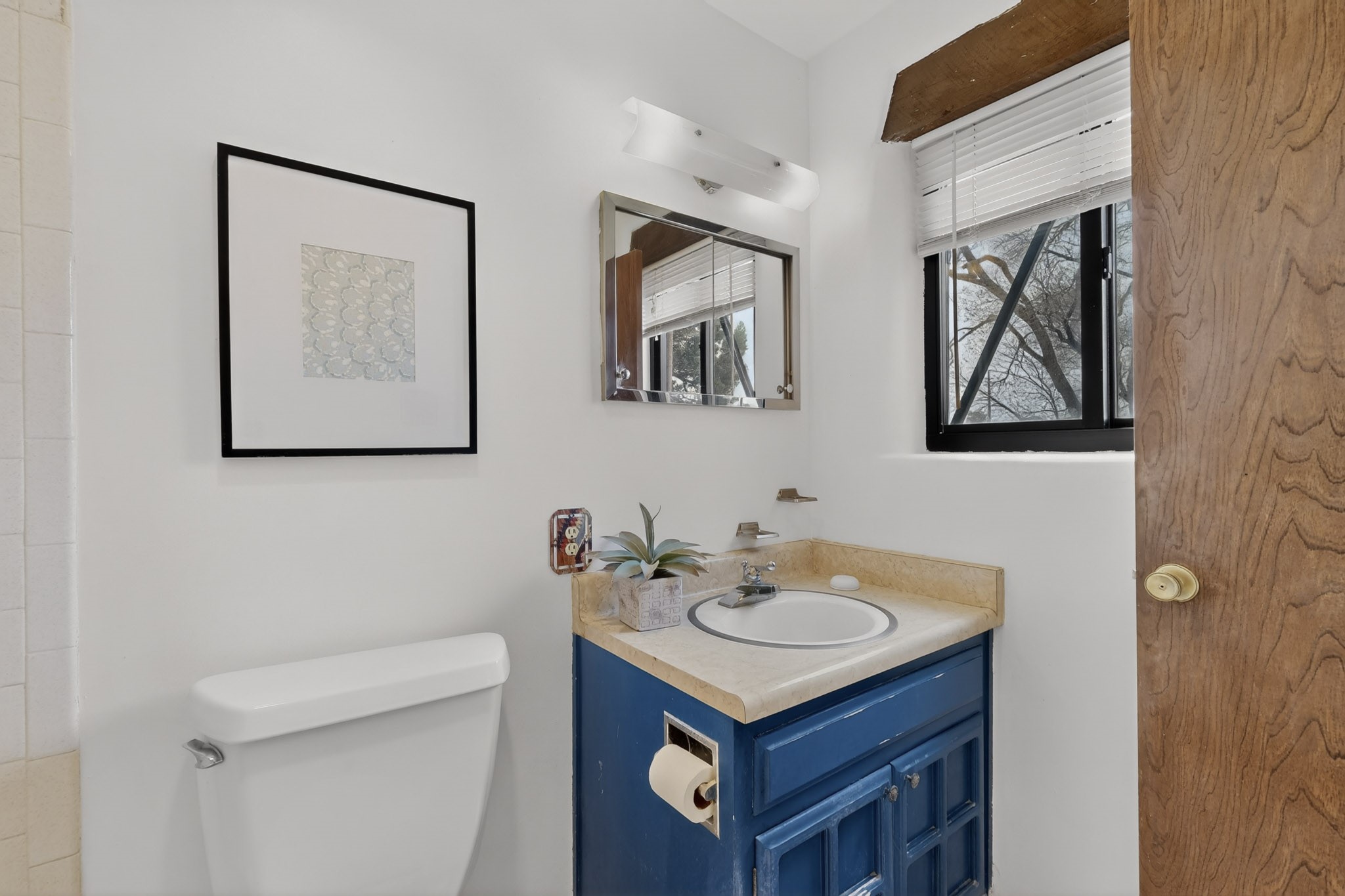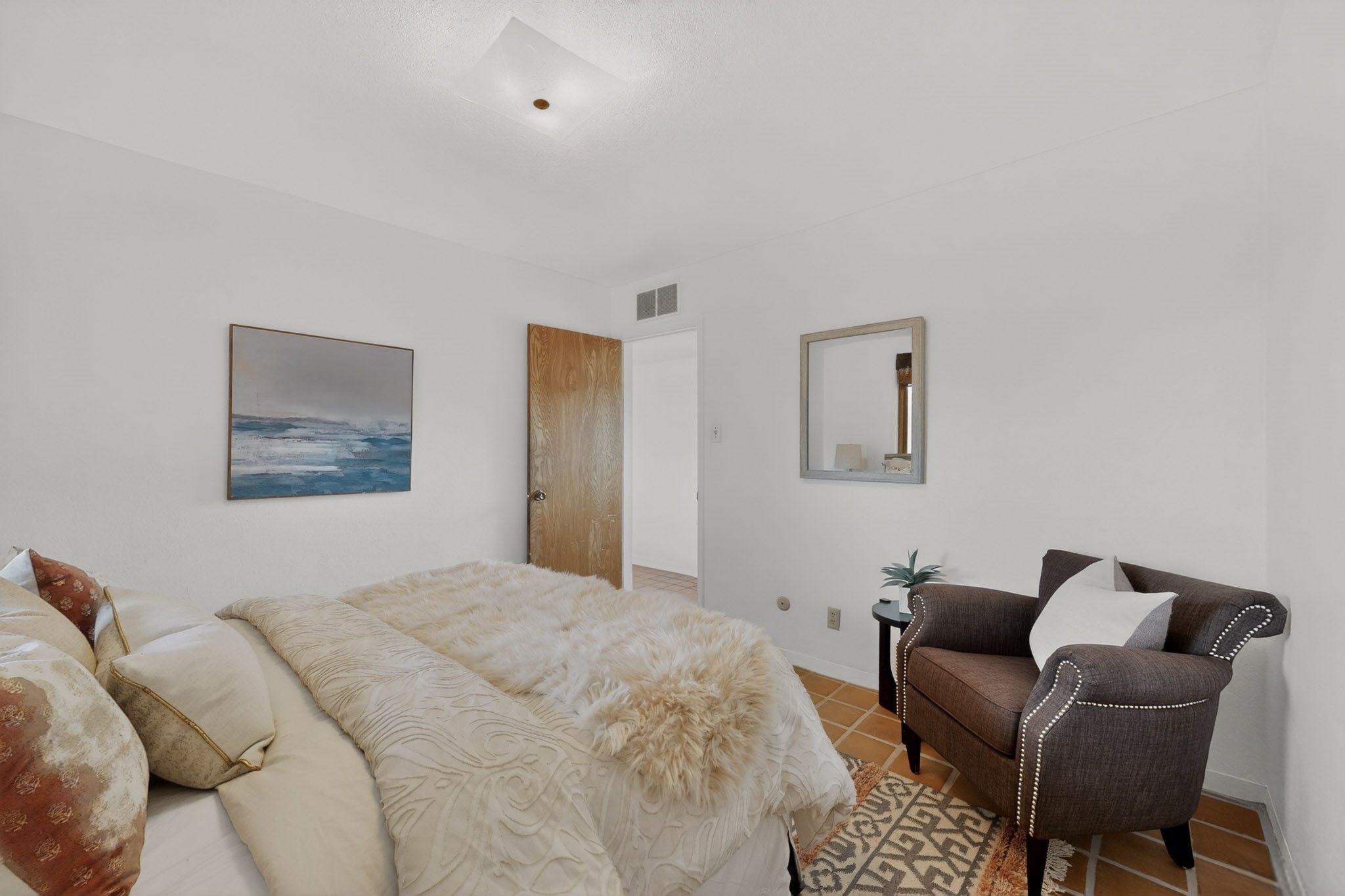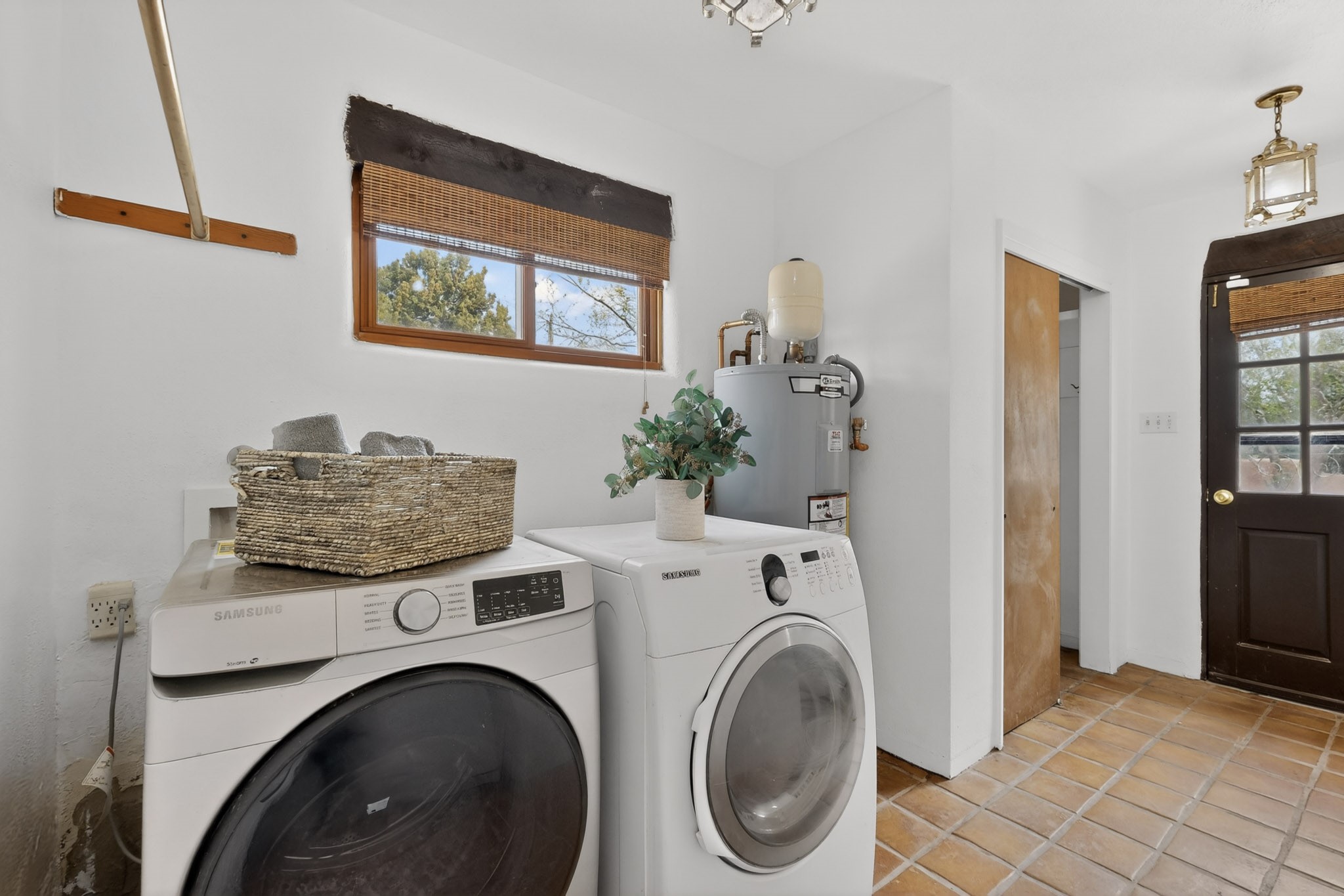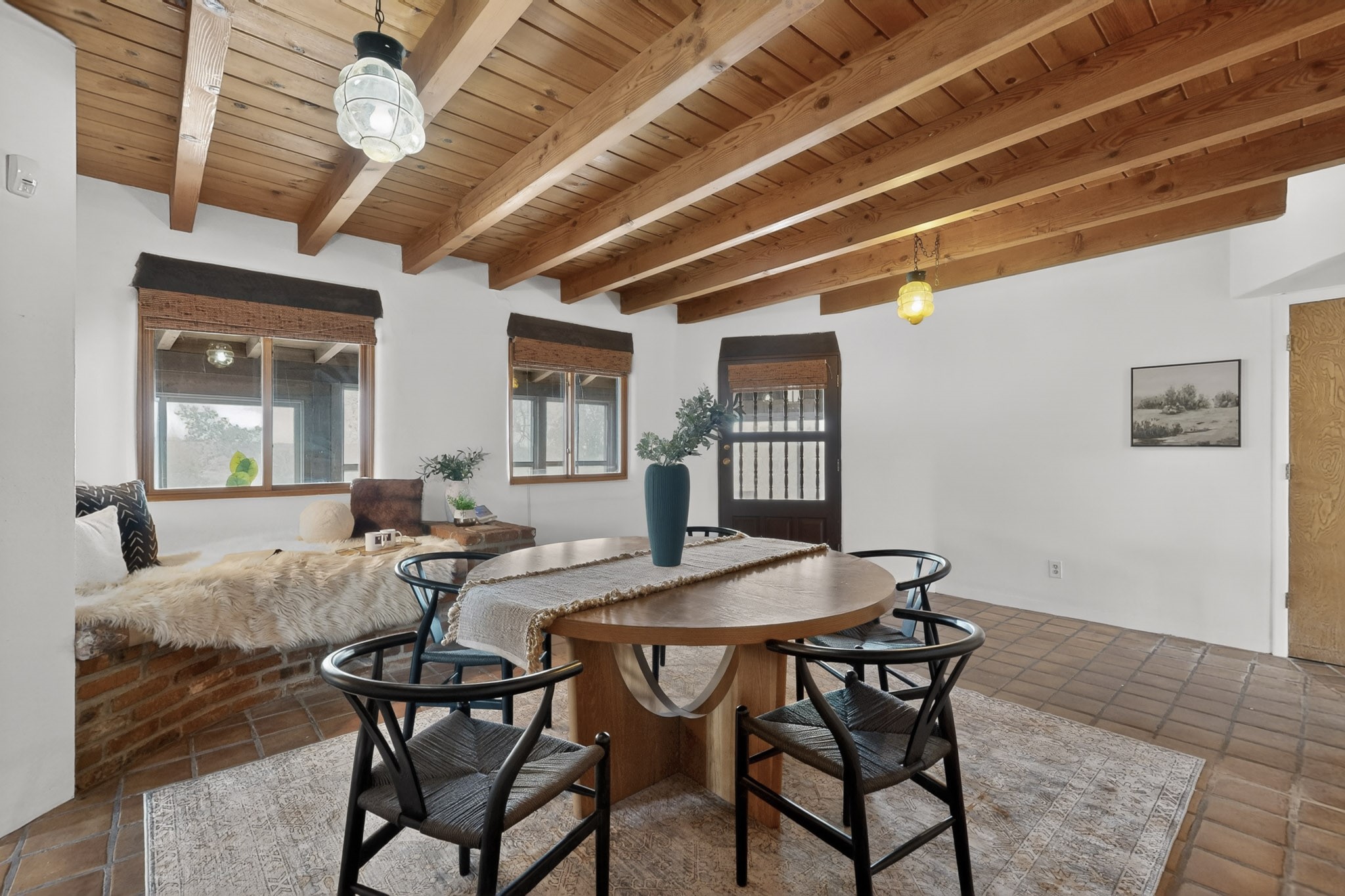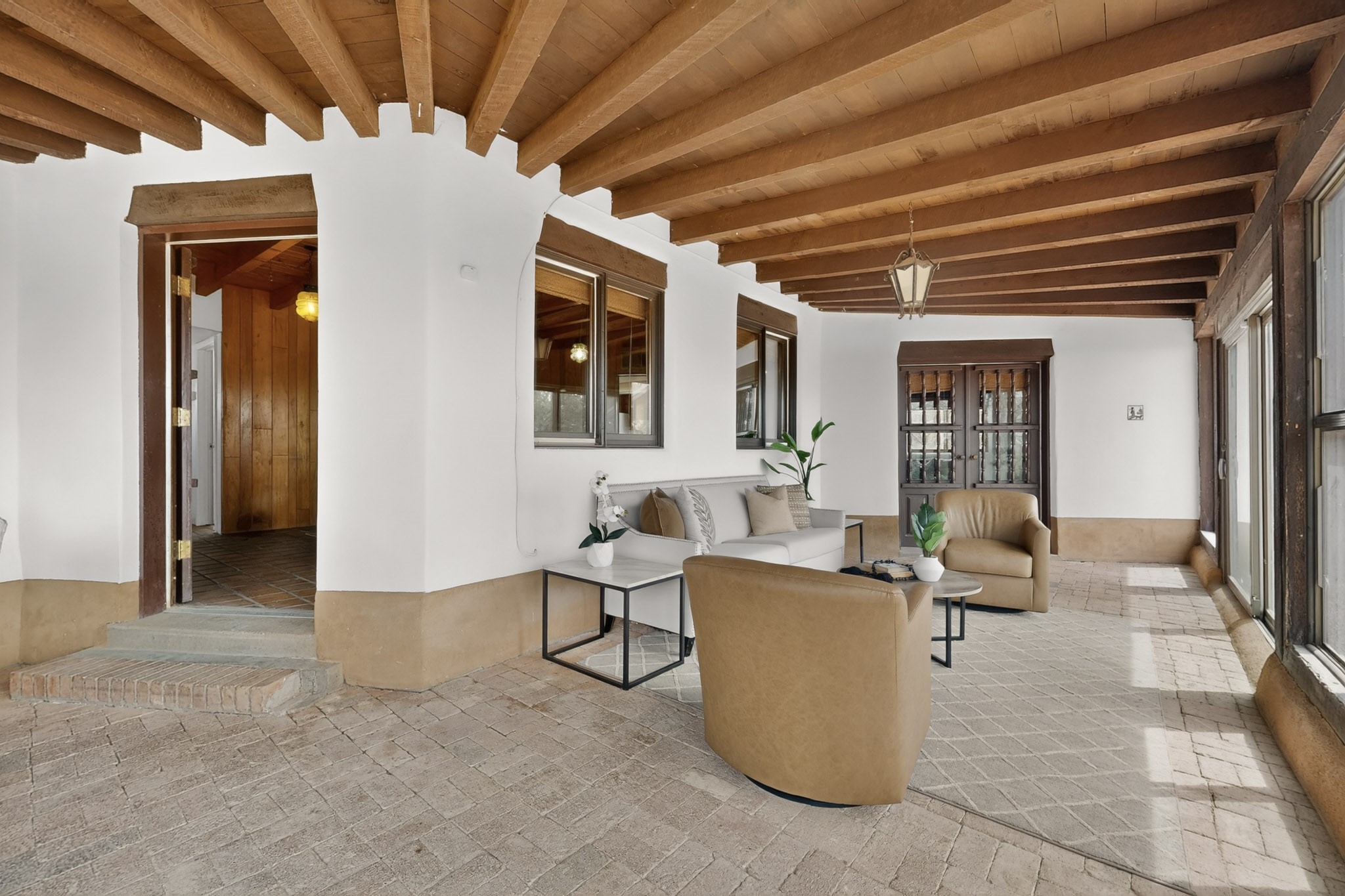 Located in the Puesta Del Sol subdivision, this Santa Fe-style charmer sits on an expansive 7.78-acre parcel in the peaceful Southern NW quadrant of Santa Fe. Built circa 1966, this 3-bedroom, 2-bath home offers approximately 2,295 sqft. of warm, rustic character with timeless Southwestern details throughout, including Saltillo tile floors, vigas and beams, wood-paneled walls, and two kiva fireplaces. The inviting main living area centers around a classic kiva fireplace, while the spacious primary suite features its own fireplace, viga ceilings, and bathroom. A bright, South-facing sunroom brings in abundant natural light, creating a comfortable year-round living space. Outdoor living is equally appealing with an enclosed East-facing courtyard, a large brick patio to the South, and a generously sized fenced yard; ideal for pets, gardening, or enjoying the surrounding landscape. Peek-a-boo views of the Sangre de Cristo Mountains add to the property's charm, while nearby arroyos offer opportunities for hiking or horseback riding. Conveniently located near Highway 599, this home provides easy access to both downtown Santa Fe and the Southside. Offered as part of an estate sale, this property presents a rare opportunity to update and personalize a classic Santa Fe home while maintaining its authentic character and setting.