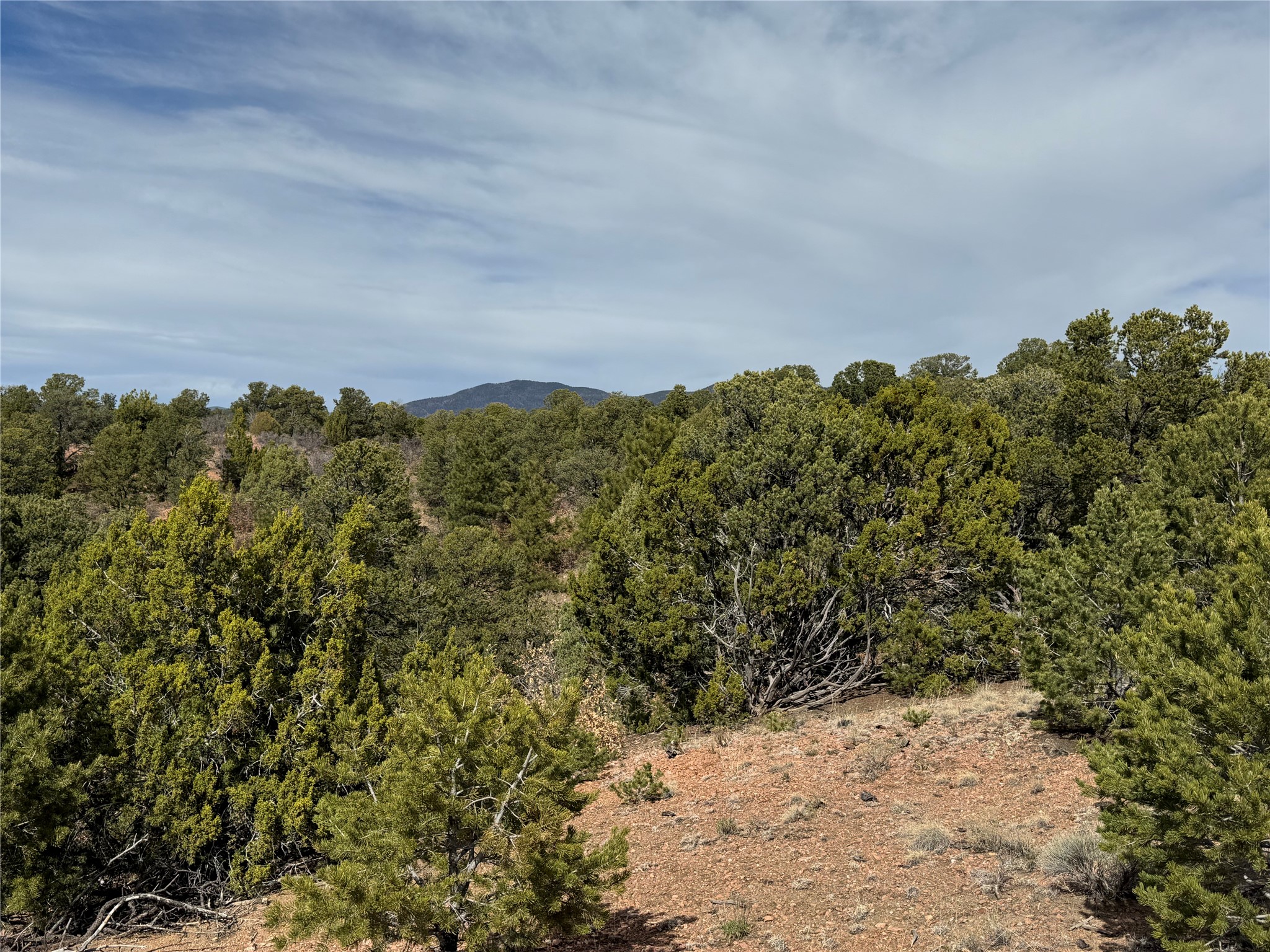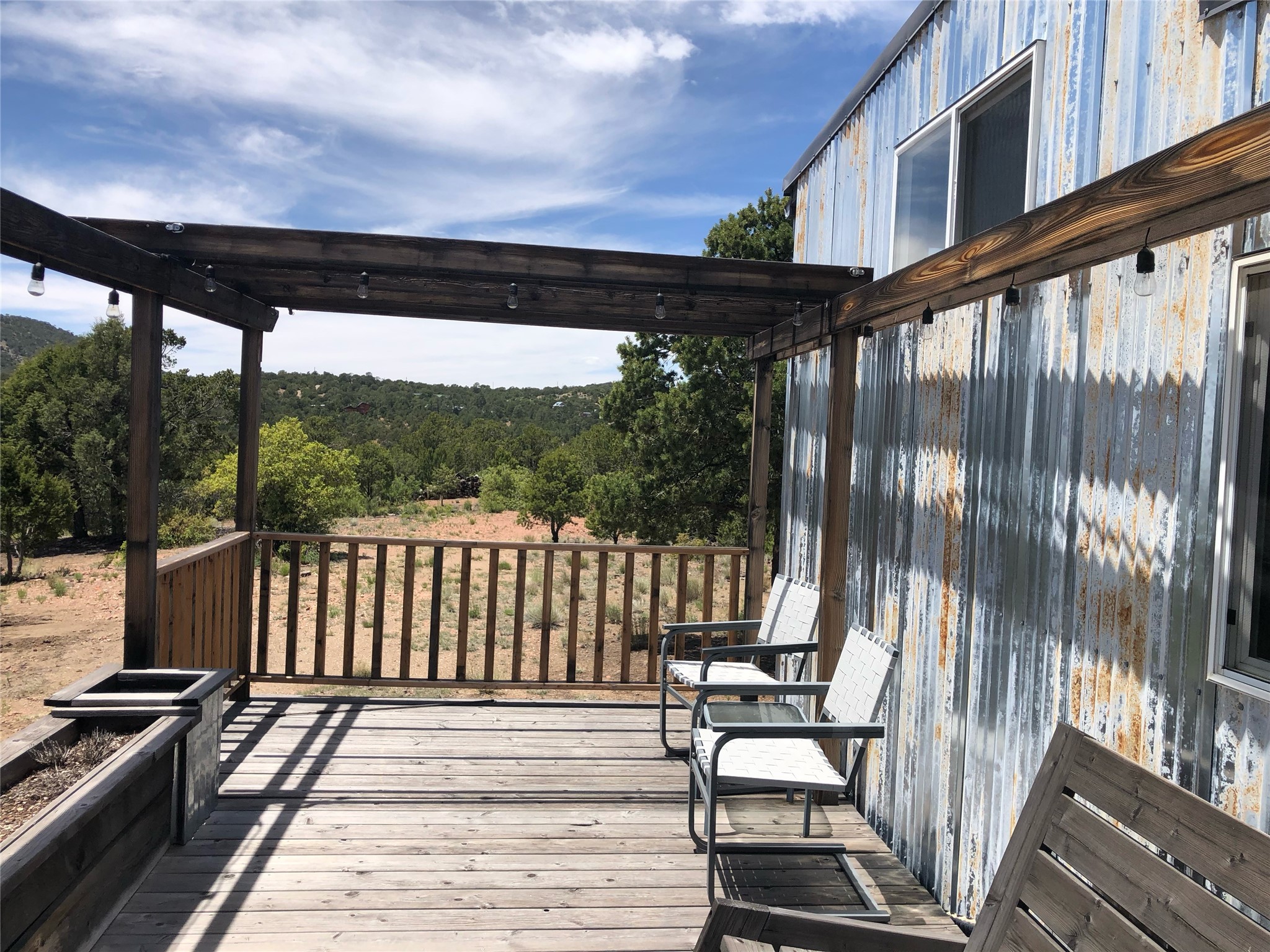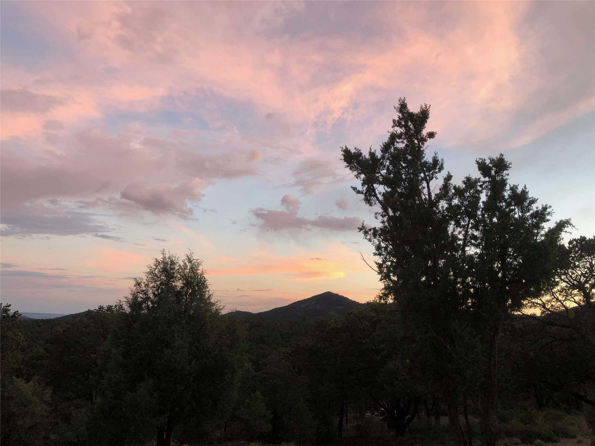 Incredible view lot at a height of land ... private, quiet with fabulous starry night sky. Looking for your own personal retreat from the world and yet only 25 minutes from the plaza ... then look no further than this special 5 acres of land that also has an insulated tiny home with a functional kitchen, shower, living / dining area and a yummy sleeping loft. Live here while you build your dream home on multiple flat building sites. The 5 acres were professionally thinned for wildfire danger in 2019 by the Soil and Water Conservation District. There is a shared well with a well agreement and a road agreement. Electricity is roughed in with easy access to the tiny home. Covenants are in place to protect the beauty of the area. There is a bath / shower deck just below the tiny house with a galvanized soaking tub and shower powered by a solar panel. Extras include a gas powered generator, extra propane tanks, easy to use outhouse and a huge water holding tank. The deep smell of pine, views all around and the depth of privacy feels amazing to experience .... Come on up and take a look!