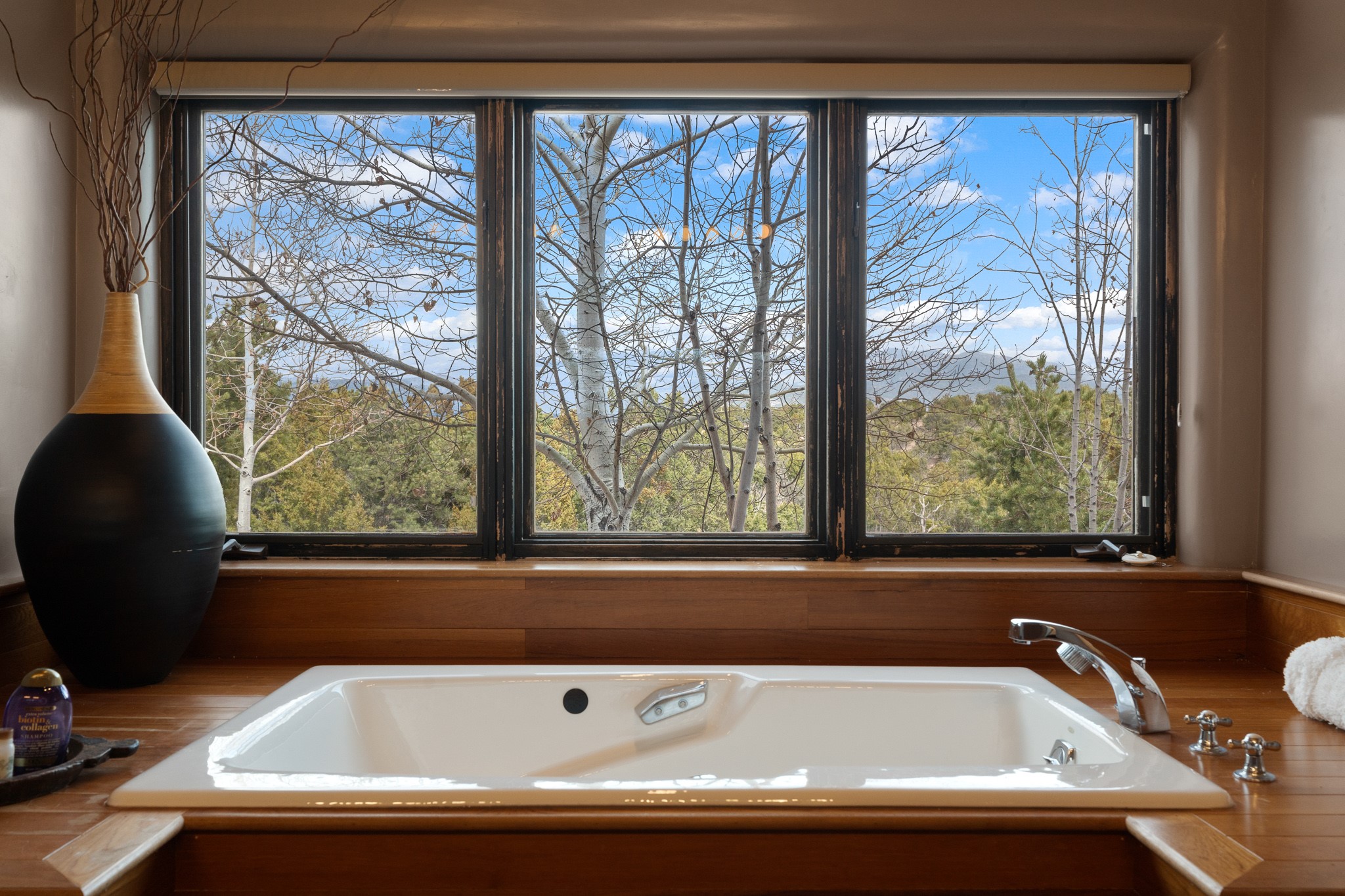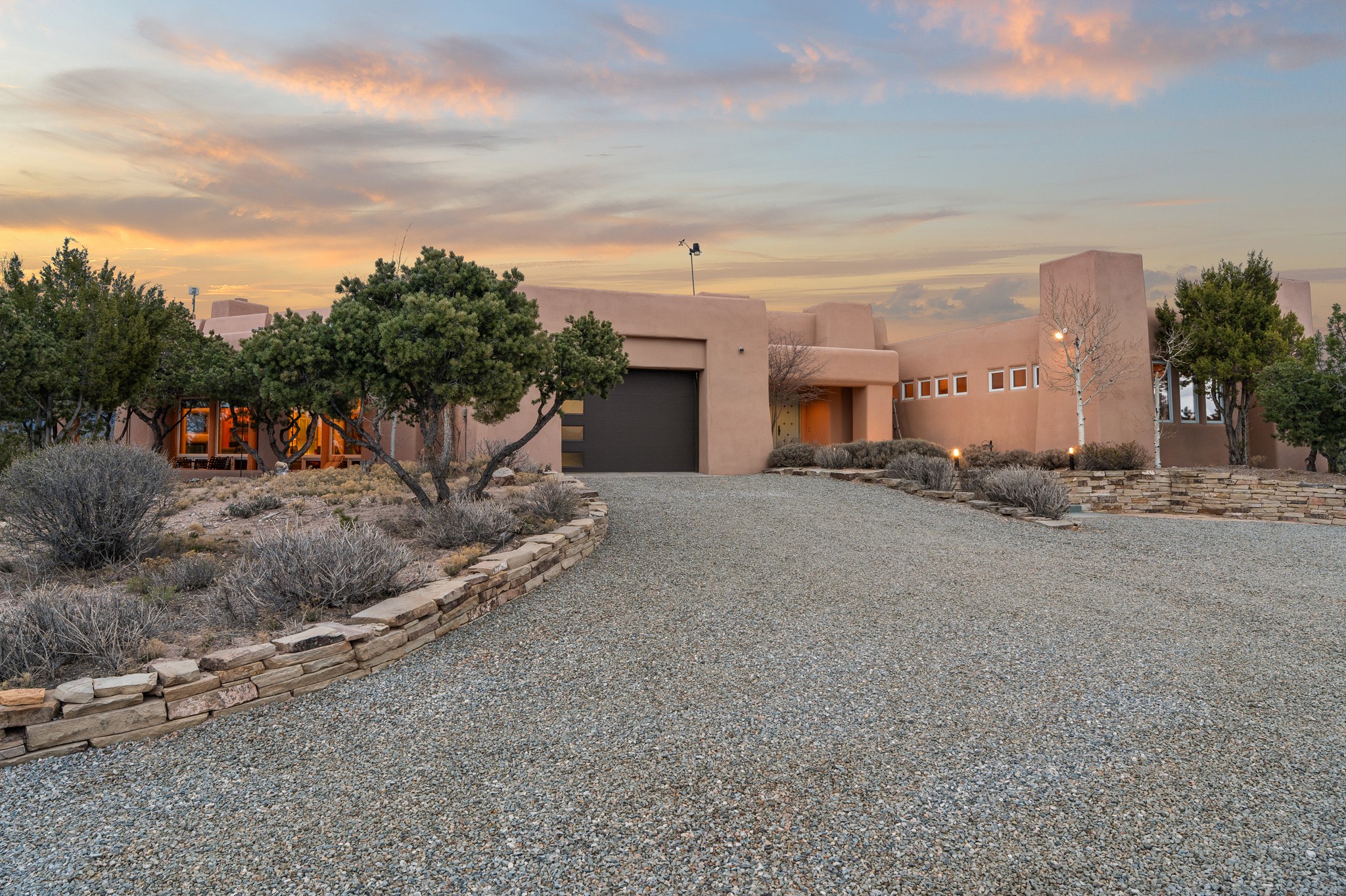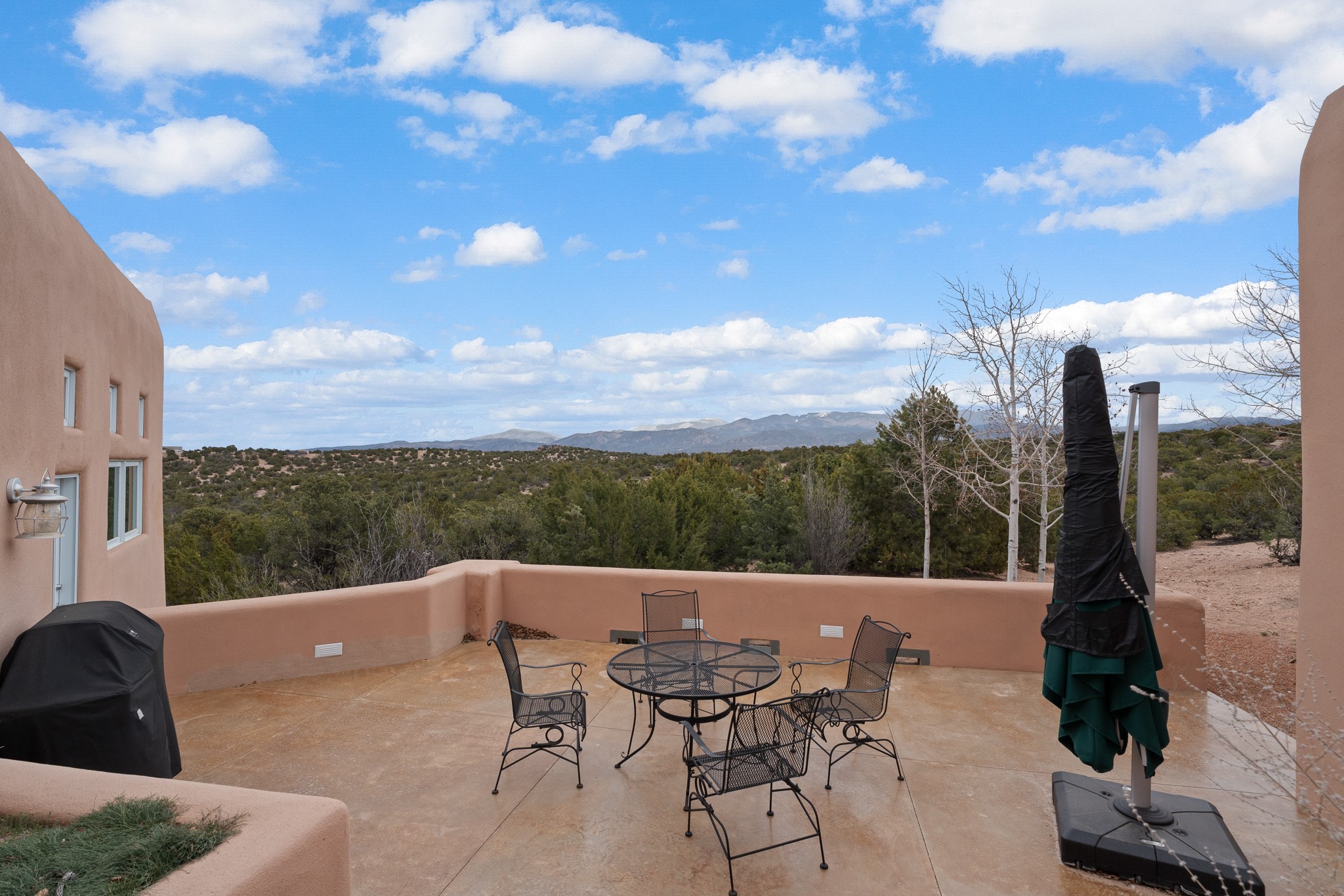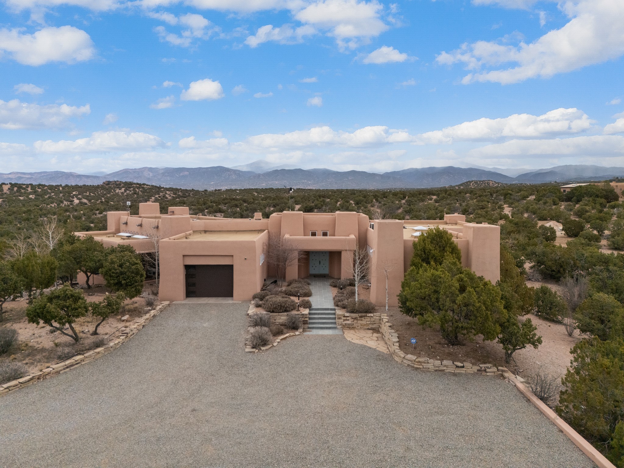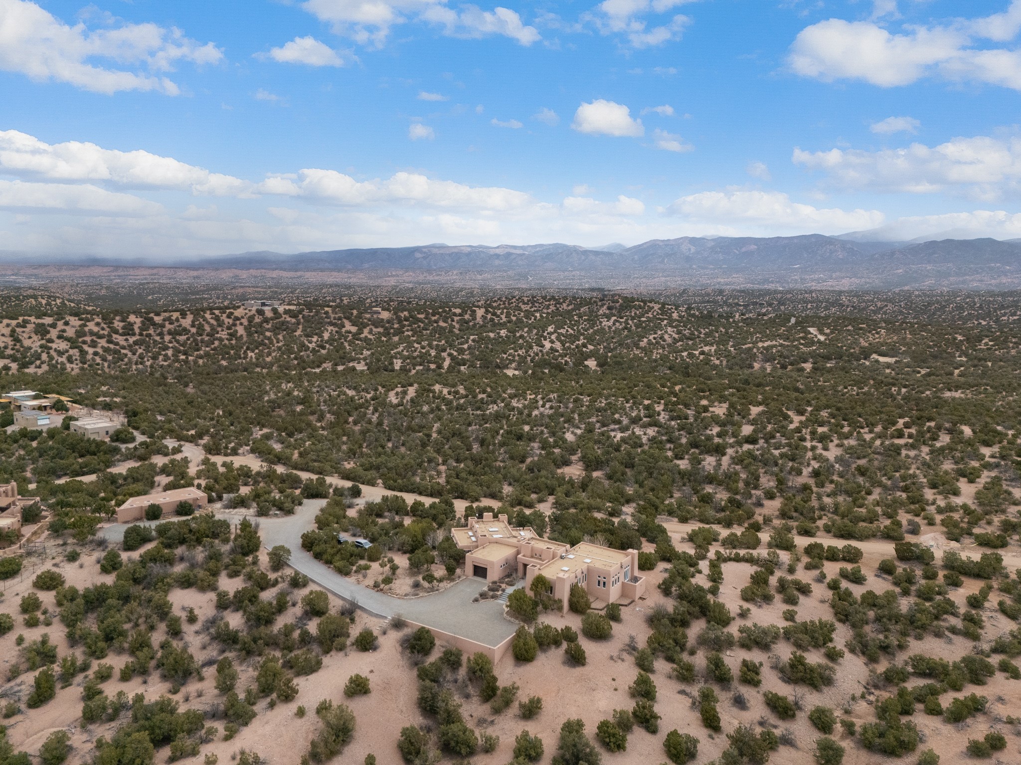 Single-level Pueblo Revival home built by Doug McDowell on 5.93 acres with sweeping mountain and sunset views, located just 8 miles (about 15 minutes) from the Santa Fe Plaza with convenient access to the 599 bypass. Set back on a private drive, this 4-bedroom, 3-bath residence offers 3,106 square feet of light-filled living space and strong indoor-outdoor flow in a peaceful setting. Classic Santa Fe details define the home, including viga and latilla ceilings, Saltillo tile floors, kiva fireplaces, and expansive windows that frame surrounding mountain views. The main living area centers around a dramatic fireplace wall and opens to a generous dining space and deep covered portal designed for entertaining and everyday living. The kitchen features a professional-grade Viking gas range, butcher-block counters, colorful tile backsplash, and mountain views from the sink. The primary suite includes a private balcony, kiva fireplace, soaking tub, walk-in closet, and separation from guest bedrooms. Three additional bedrooms provide flexibility for guests, home office, or studio use. Outdoor spaces include portals and patios oriented to the north, east, and south, capturing both sunrise and sunset light. The acreage offers room for gardens, outdoor living, and future improvements, with surrounding natural landscape and open sky views. Recent updates include 6 new minisplits in 2026 and a new septic system in January 2025. Comfort systems include in-floor radiant heat and ductless mini-split systems for cooling and supplemental heating. Additional features include a one-car garage and shared well. Located in a quiet area with proximity to shopping, dining, and downtown Santa Fe, this property combines privacy, usable acreage, and classic Southwestern architecture.