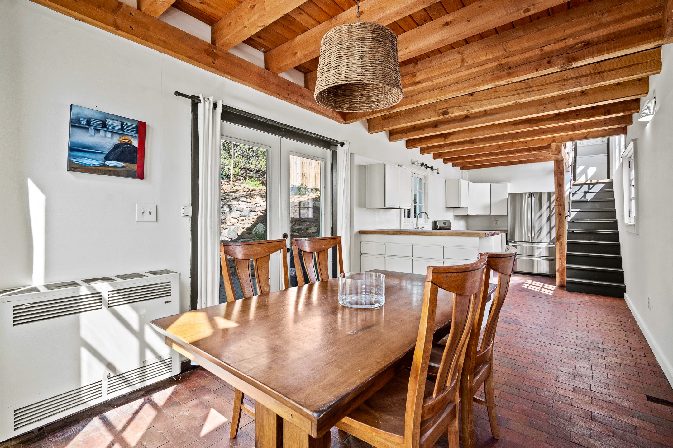 On a hillside within a few minutes walk of the entertainment and dining in Madrid, this well maintained two-story home is sure to charm. Outside, the terraced lot leads up to a separate studio space with loft. The white exterior and pitched metal roof add desert style, and a back patio provides space for outdoor relaxation. Inside, the home opens into a spacious living room with wood heat, wood flooring and a viga ceiling. The kitchen has brick flooring, large windows and a glass door to the patio, A large, open bedroom is situated on the second floor above the kitchen with ample light and The lot's elevation allows for views over the town.