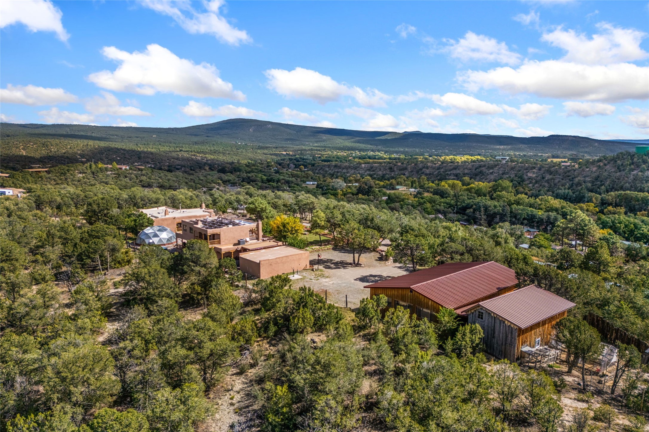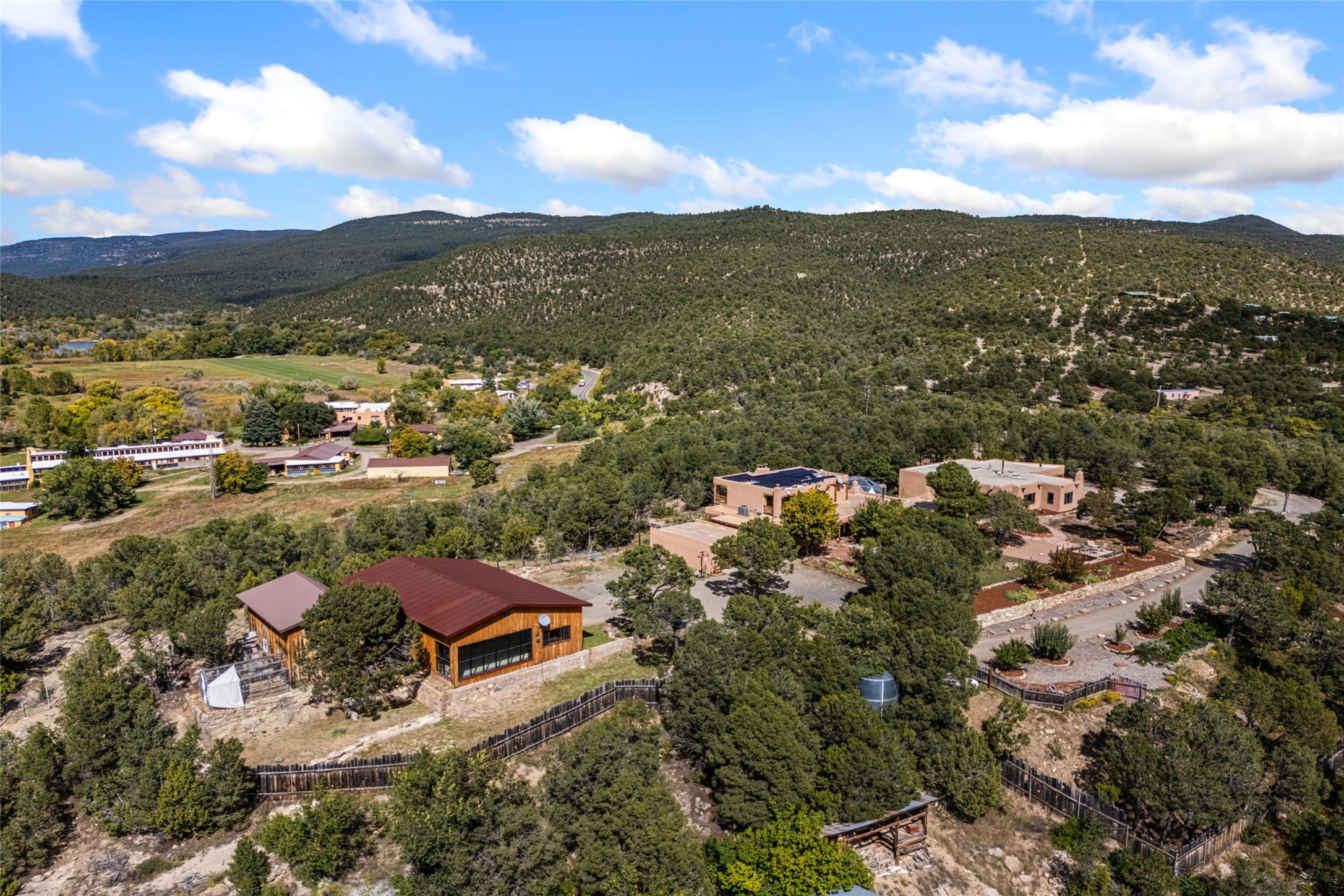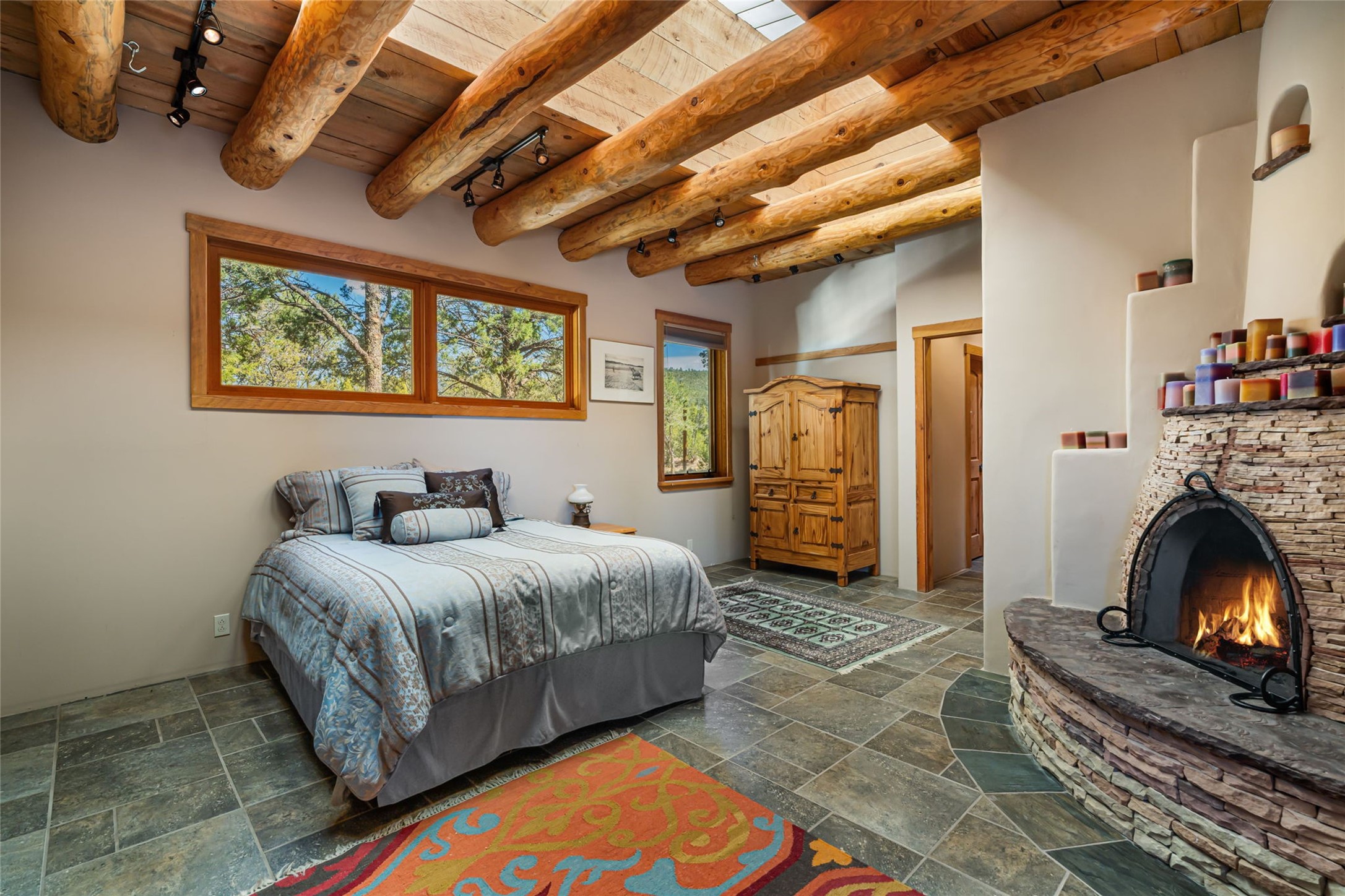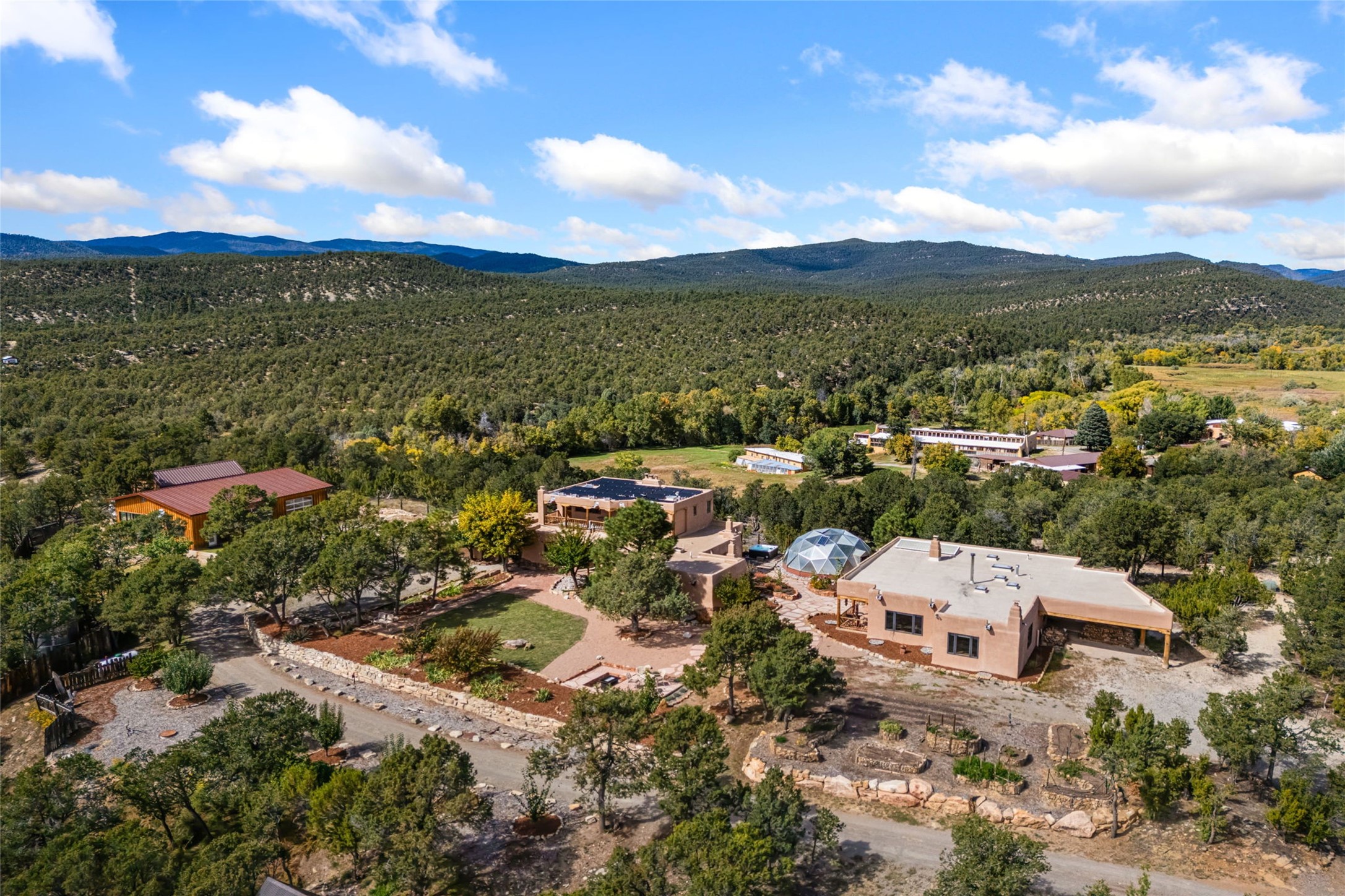 Set on nearly four acres 30 minutes from Santa Fe and only minutes from the Pecos River, 16 Hubbard Hill offers a profound and immediate sense of peace. The property overlooks serene Monastery Lake and borders more than one thousand acres of land belonging to the Benedictine Monastery, creating extraordinary privacy and an uninterrupted natural backdrop. This extraordinary estate was originally the personal residence and apex creation of renowned custom builder Richard Roybal, a true Northern New Mexico artisan whose craftsmanship is visible in every detail. Hand inlaid wood floors, sculpted stonework, vigas and latillas, aspen and willow ceilings and generous windows create a warm, soulful environment filled with natural light. The home has been thoughtfully expanded and impeccably maintained ever since, evolving into a property that supports both refined living and meaningful self-reliance.The current owners have continued this legacy with significant upgrades designed for long-term comfort and sustainability. A powerful solar system with a three-plus-day battery backup provides dependable energy independence. Improvements to water and power systems were completed with durability and ease of living in mind. New fruit trees and hundreds of berry plants complement the existing mature plantings, contributing to a landscape that functions as a flourishing food forest. Landscaping throughout the property has been refined to minimize maintenance, maximize automation and support a thriving ecosystem for humans, birds and bees. A private gate marks the entrance to the estate, and the grounds are fully fenced to accommodate dogs, making the land as welcoming as it is expansive.One of the most exceptional features of the estate is the expansive detached garage and south-facing studio, where dramatic glass garage doors fill the space with natural light. This luminous building is ideal for an artist, maker, healer or collector and functions beautifully as a workshop, gallery, creative studio or retreat space.The greenhouse beautifully supports a lifestyle of intentional, sustainable living. It includes a large hydroponic water enclosure, solar-operated fans, automated roof ventilation and raised beds with full drip irrigation, all designed for maximum growing efficiency and year-round cultivation.The fully appointed guest house is a complete home of its own, not a simple casita. High ceilings and large windows create an airy, spacious feel, while thoughtfully placed skylights bring in abundant natural light. Heated tile floors throughout add comfort and warmth, and the full amenities offer exceptional flexibility for hosting, multigenerational living or generating rental income.With approximately eight thousand square feet of living and studio space, exceptional craftsmanship, modern enhancements and a landscape that feels both magical and deeply grounding, 16 Hubbard Hill stands as a truly singular offering. It is a home built to endure, expanded with care and aligned with a lifestyle that values beauty, creativity and self-reliance. A rare sanctuary with endless potential.