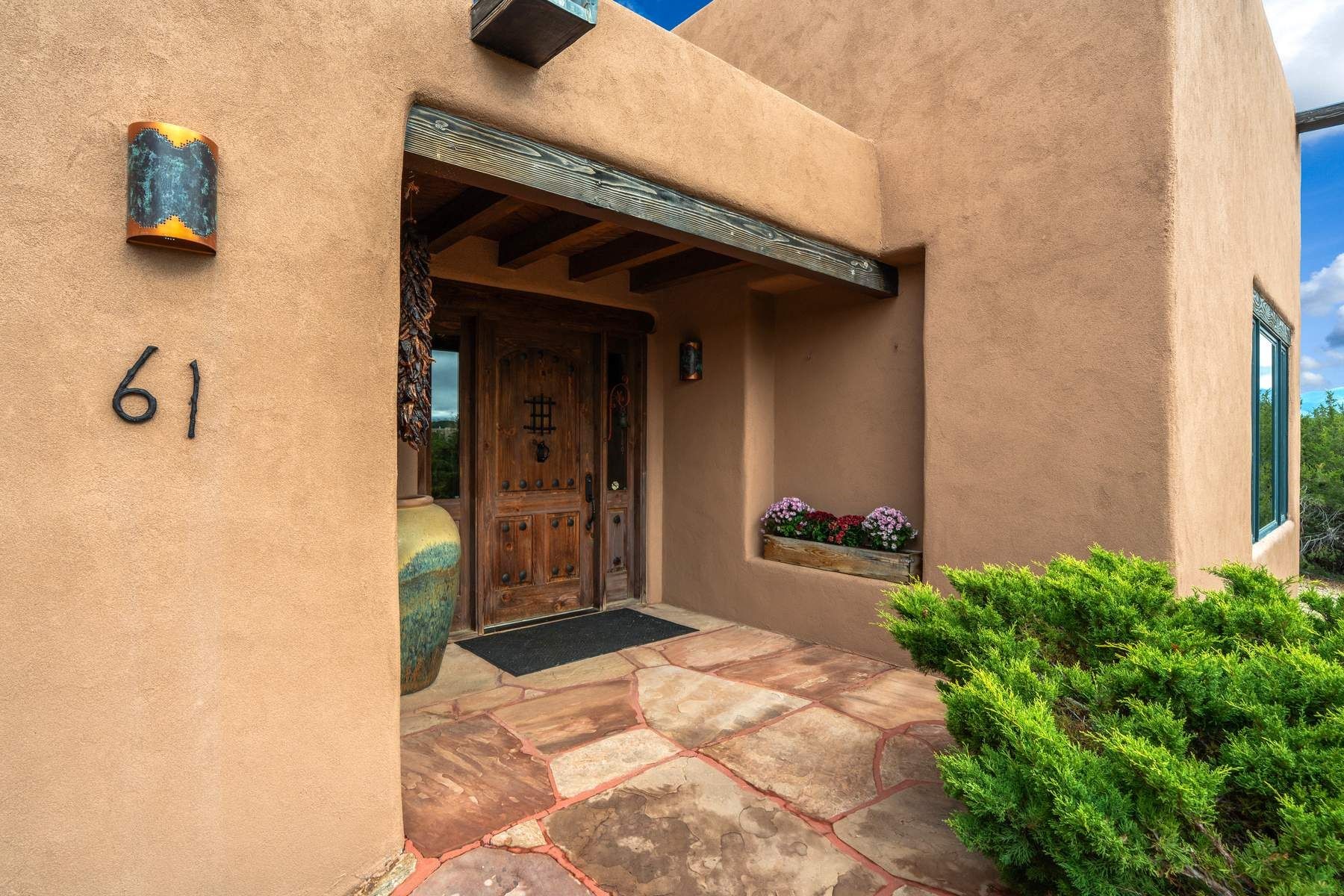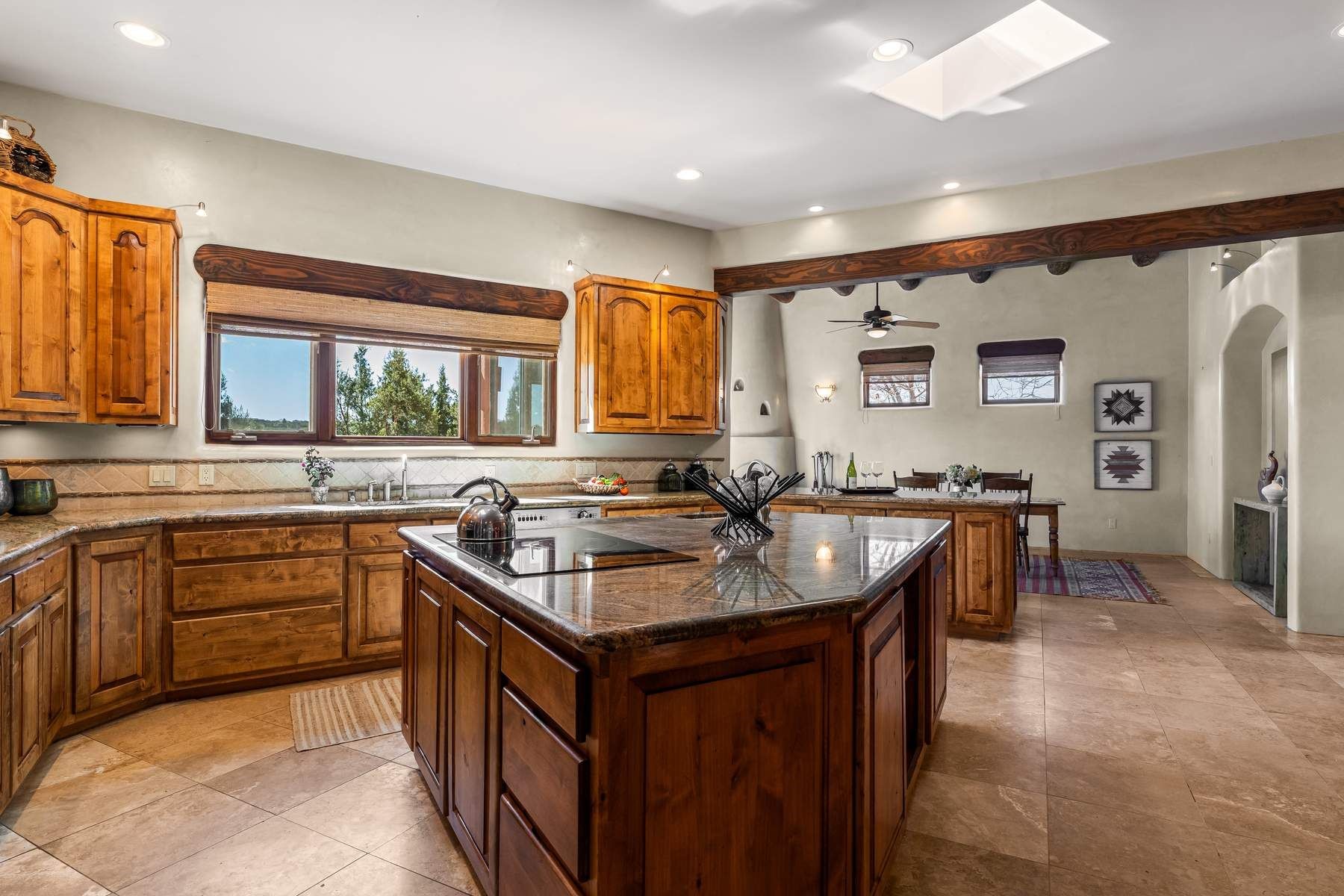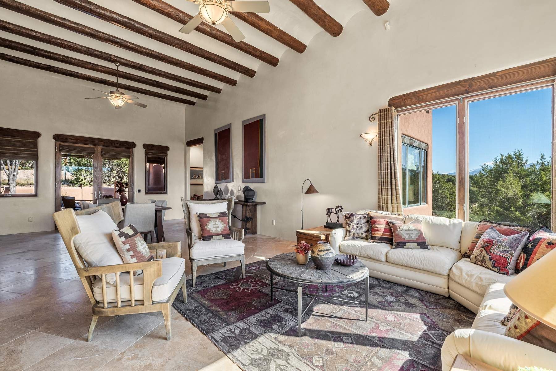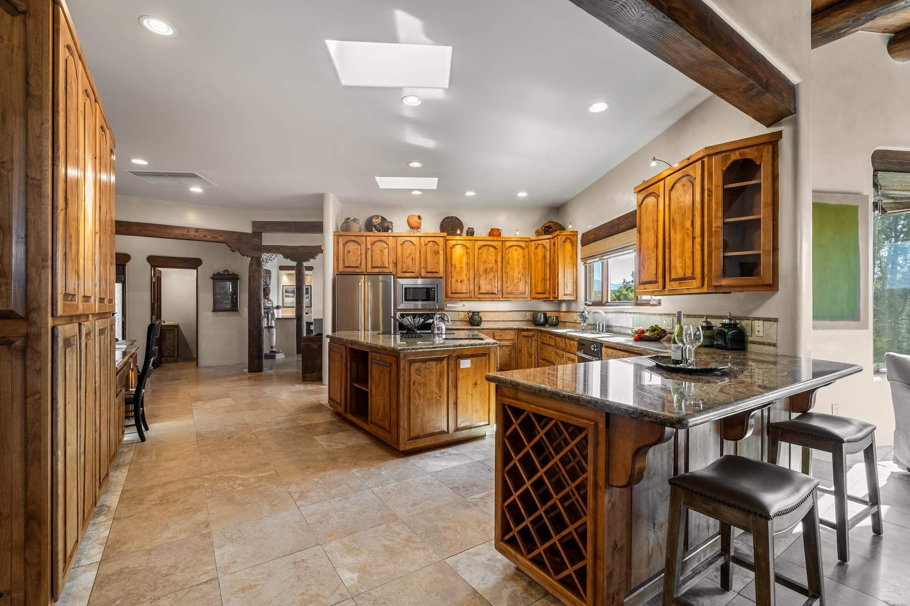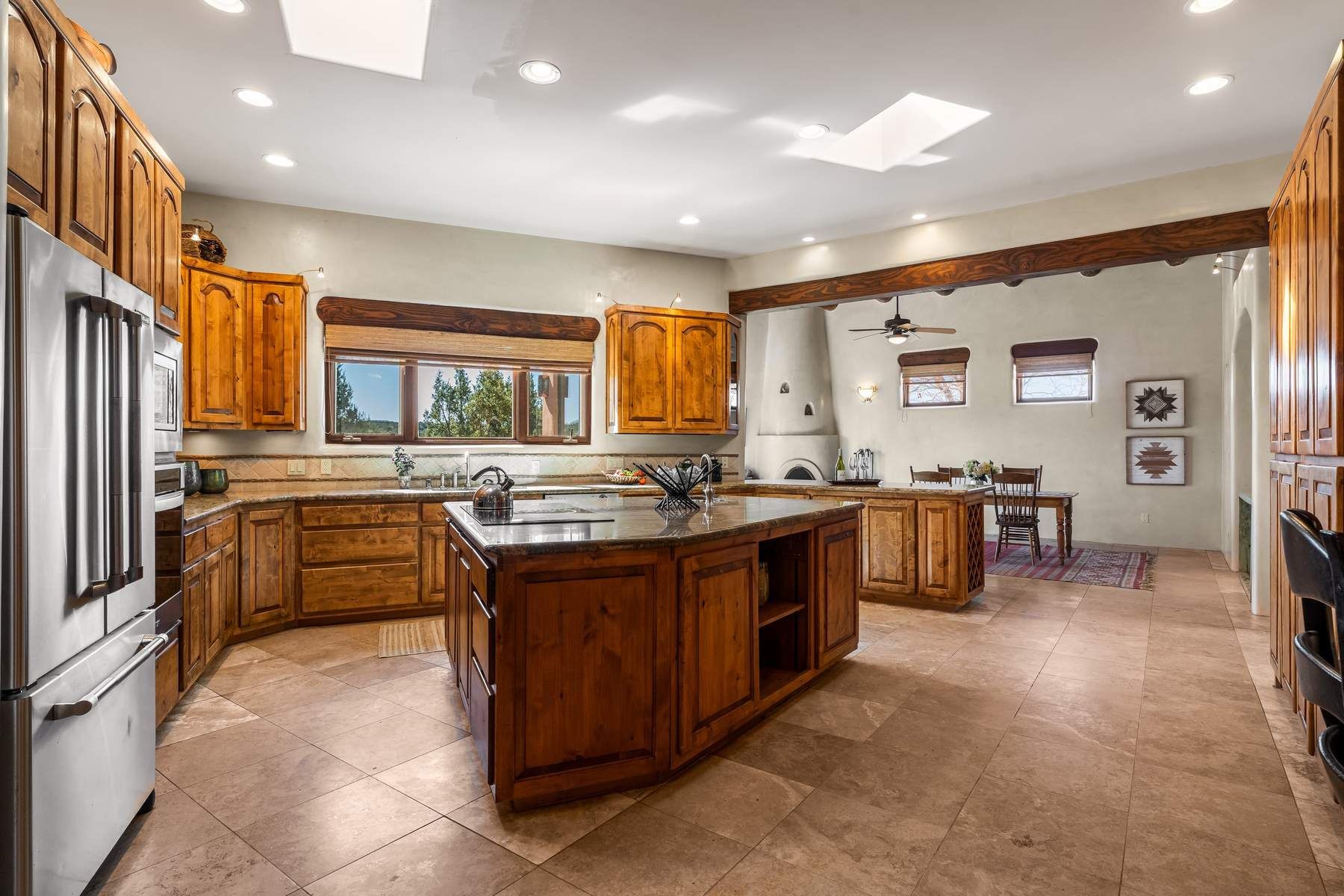 Single-level Pueblo Revival home on 2.86 acres with Sangre de Cristo mountain views, located just 13 minutes from the Santa Fe Plaza. Built in 2005, this 3,486 sq ft residence offers no interior steps, high ceilings, and classic Santa Fe architectural details designed for comfortable living and entertaining. Diamond plaster walls, coved viga ceilings, travertine tile floors, nichos, bancos, skylights, and corbels define the interior, along with four wood-burning kiva fireplaces, including one on the outdoor portal. The great room opens through French doors to a covered rear portal with kiva fireplace, sunshade, and landscaped privacy wall, creating a strong indoor-outdoor living connection. The kitchen features abundant wood cabinetry, granite countertops, a large island with second sink, built-in desk area, and flows into an additional gathering space with its own kiva fireplace. A separate laundry room with sink and cabinetry opens to a side yard with an established herb garden. Three en-suite bedrooms and five bathrooms provide flexibility and privacy. The primary suite includes a kiva fireplace, large walk-in closet, French doors to a portal, and a generous flex space suitable for office, gym, or studio use. ADA-compliant front entry and primary bathroom shower add accessibility. Comfort systems include in-floor radiant heating and evaporative cooling. Recent improvements include full re-stucco of the home and rear privacy wall (2023) and partial TPO roof replacement (2023). Additional features include a heated 3-car garage with RV bay, workshop or studio space, central vacuum, ample parking, rock fountain, native plant landscaping, and flagstone walkways. Located near La Tierra trail access and with no HOA, this property offers a combination of single-level living, acreage, architectural detail, and proximity to Santa Fe.