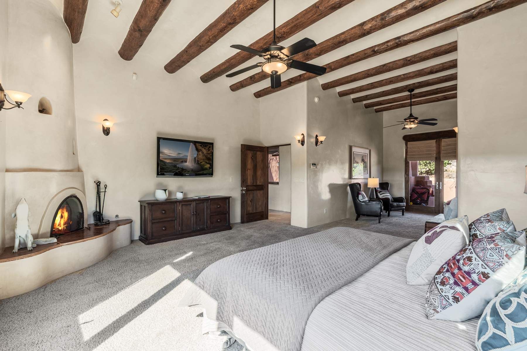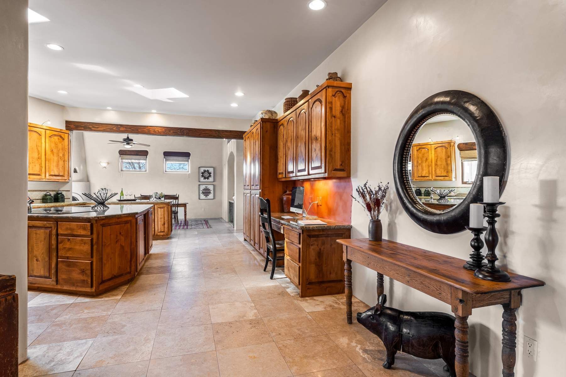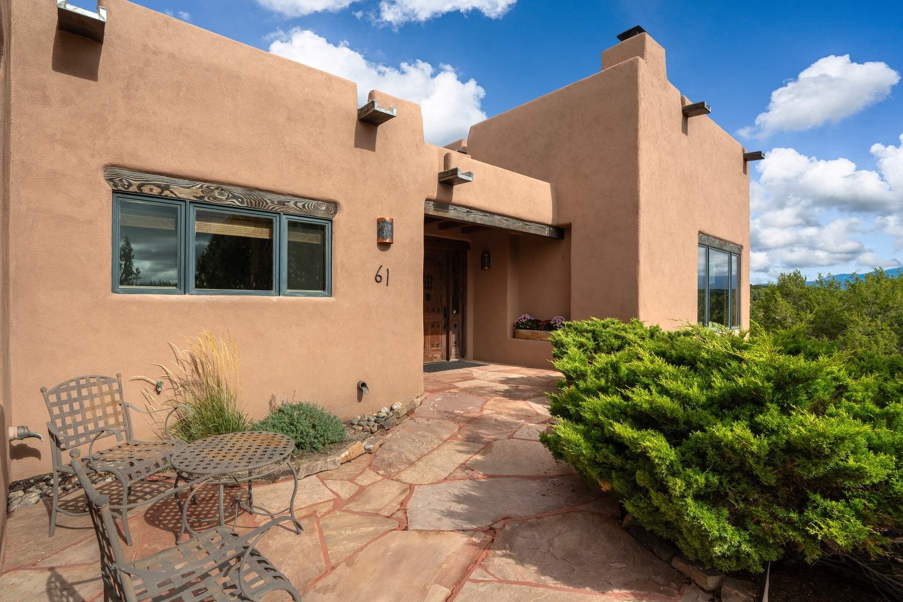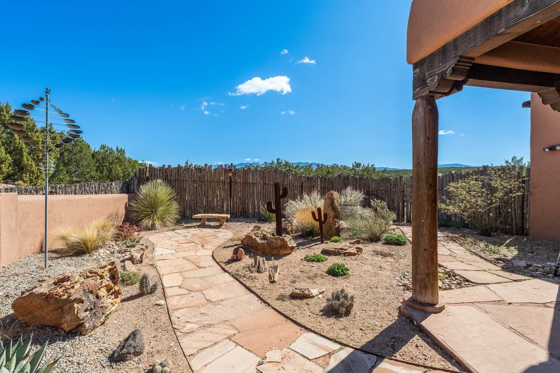 Single-level Pueblo Revival home on 2.86 acres with Sangre de Cristo mountain views, located just 13 minutes from the Santa Fe Plaza. Built in 2005, this 3,486 sq ft residence offers no interior steps, high ceilings, and classic Santa Fe architectural details designed for comfortable living and entertaining. Diamond plaster walls, coved viga ceilings, travertine tile floors, nichos, bancos, skylights, and corbels define the interior, along with four wood-burning kiva fireplaces, including one on the outdoor portal. The great room opens through French doors to a covered rear portal with kiva fireplace, sunshade, and landscaped privacy wall, creating a strong indoor-outdoor living connection. The kitchen features abundant wood cabinetry, granite countertops, a large island with second sink, built-in desk area, and flows into an additional gathering space with its own kiva fireplace. A separate laundry room with sink and cabinetry opens to a side yard with an established herb garden. Three en-suite bedrooms and five bathrooms provide flexibility and privacy. The primary suite includes a kiva fireplace, large walk-in closet, French doors to a portal, and a generous flex space suitable for office, gym, or studio use. ADA-compliant front entry and primary bathroom shower add accessibility. Comfort systems include in-floor radiant heating and evaporative cooling. Recent improvements include full re-stucco of the home and rear privacy wall (2023) and partial TPO roof replacement (2023). Additional features include a heated 3-car garage with RV bay, workshop or studio space, central vacuum, ample parking, rock fountain, native plant landscaping, and flagstone walkways. Located near La Tierra trail access and with no HOA, this property offers a combination of single-level living, acreage, architectural detail, and proximity to Santa Fe.