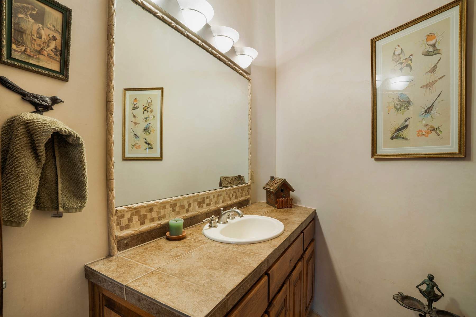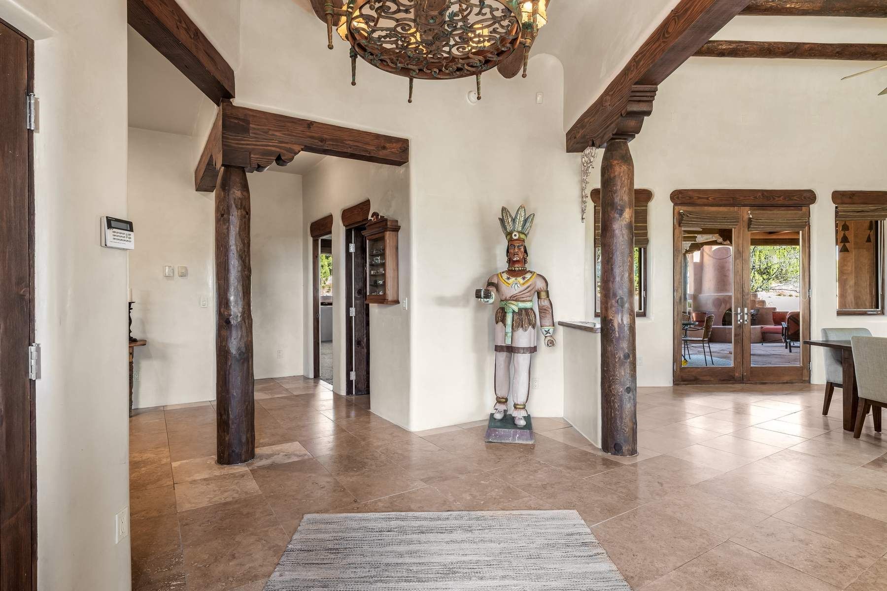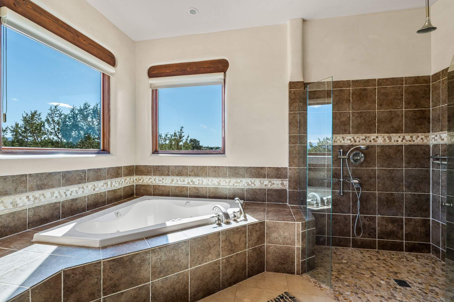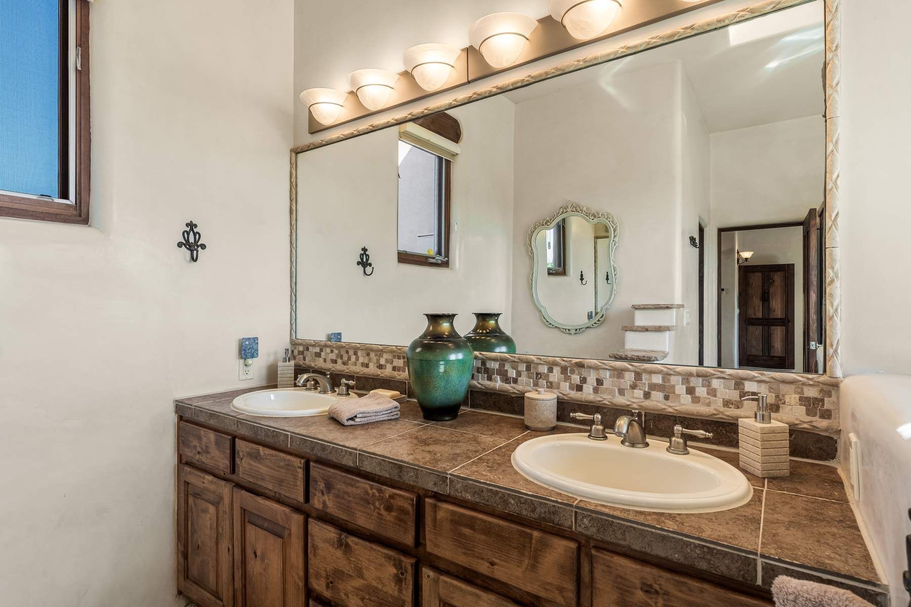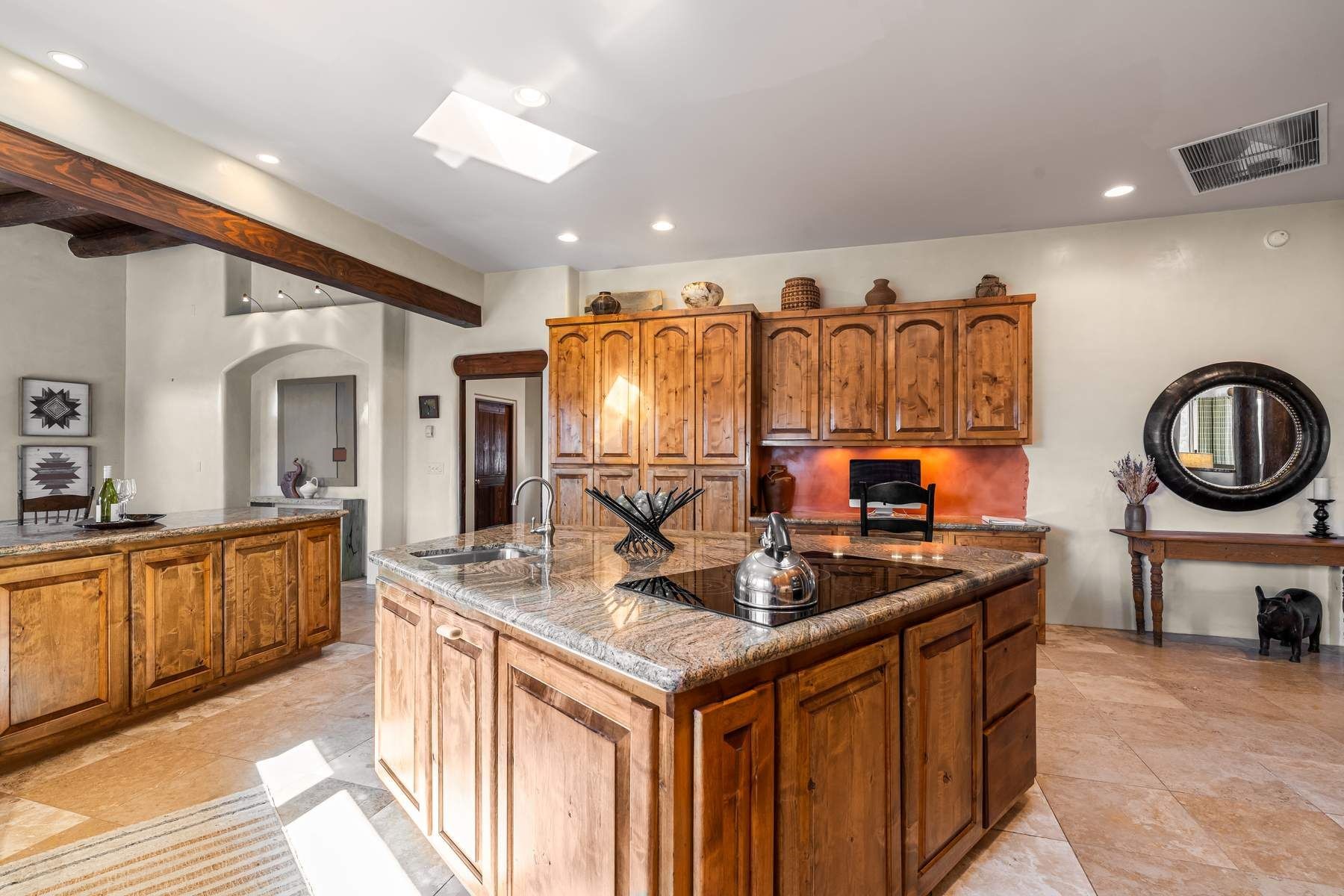 Single-level Pueblo Revival home on 2.86 acres with Sangre de Cristo mountain views, located just 13 minutes from the Santa Fe Plaza. Built in 2005, this 3,486 sq ft residence offers no interior steps, high ceilings, and classic Santa Fe architectural details designed for comfortable living and entertaining. Diamond plaster walls, coved viga ceilings, travertine tile floors, nichos, bancos, skylights, and corbels define the interior, along with four wood-burning kiva fireplaces, including one on the outdoor portal. The great room opens through French doors to a covered rear portal with kiva fireplace, sunshade, and landscaped privacy wall, creating a strong indoor-outdoor living connection. The kitchen features abundant wood cabinetry, granite countertops, a large island with second sink, built-in desk area, and flows into an additional gathering space with its own kiva fireplace. A separate laundry room with sink and cabinetry opens to a side yard with an established herb garden. Three en-suite bedrooms and five bathrooms provide flexibility and privacy. The primary suite includes a kiva fireplace, large walk-in closet, French doors to a portal, and a generous flex space suitable for office, gym, or studio use. ADA-compliant front entry and primary bathroom shower add accessibility. Comfort systems include in-floor radiant heating and evaporative cooling. Recent improvements include full re-stucco of the home and rear privacy wall (2023) and partial TPO roof replacement (2023). Additional features include a heated 3-car garage with RV bay, workshop or studio space, central vacuum, ample parking, rock fountain, native plant landscaping, and flagstone walkways. Located near La Tierra trail access and with no HOA, this property offers a combination of single-level living, acreage, architectural detail, and proximity to Santa Fe.