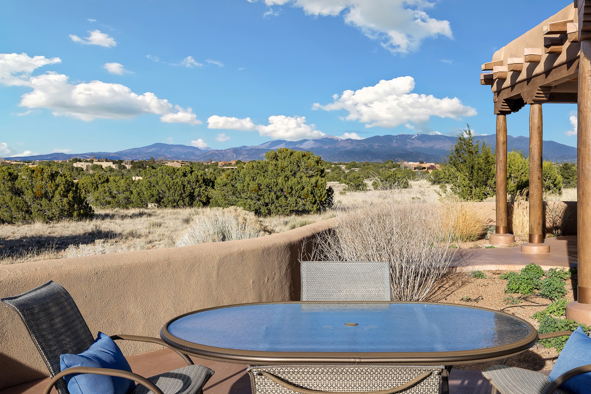 Panoramic views of the Jemez and Sangre de Cristo Mountains set the stage for this beautifully composed 3,833 sq. ft. residence on 2.67 acres in Las Campanas. As you enter the tree-filled front courtyard, a sense of quiet elegance unfolds--an immediate feeling of calm, privacy, and thoughtful design.The entry opens into a formal living room, where vigas fan gracefully toward the horizon, drawing the eye outward to the ever-changing mountain landscape. Just beyond, the dining room opens through glass doors to an expansive covered portal--nearly 1,000 sq. ft.--designed for seamless indoor-outdoor living. An outdoor fireplace and heater create an inviting setting for dining and gathering beneath Santa Fe's vast skies.Arched passageways lead into a striking kitchen and living space, where sculptural curves and a commanding kiva fireplace anchor the room. Granite countertops, stainless steel appliances, double ovens, and a 6-burner gas cooktop are complemented by a generous island with prep sink. A built-in banco offers a quintessential Southwestern moment--casual, intimate, and always oriented toward the view.The primary suite is a private retreat, opening to the portal and framed by breathtaking vistas. Its bath is equally serene, with dual vanities, a soaking tub, and a walk-in shower. A thoughtfully separated guest wing offers two spacious bedrooms, each enjoying its own connection to the surrounding landscape. Even the laundry room captures a quiet view of the front courtyard.Additional features include an 850 sq. ft. three-car garage, radiant in-floor heat, mini-split cooling, new stucco (2021), and a new $120K foam roof to be completed prior to closing.Set on 2.67 acres within Las Campanas, 81 Calle Ventoso W offers a rare opportunity to live immersed in light, landscape, and the timeless beauty of Santa Fe--where every moment is shaped by sky, horizon, and home.
