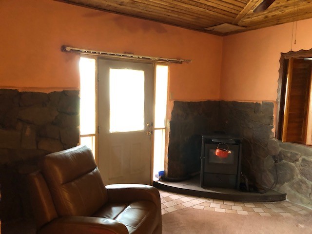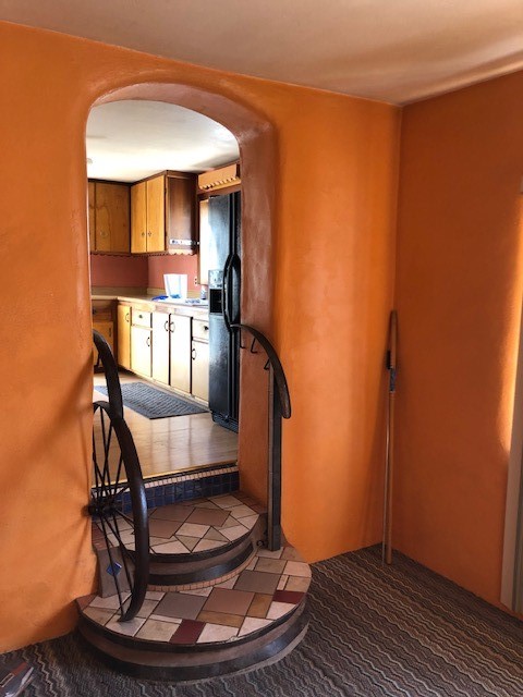 Small 1b1b adobe in the charming community of San Antonio in Las Vegas. Beautifully renovated interior features a patterned wood plank ceiling in the living room, arched doorways, updated bathroom and kitchen, stainless steel refrigerator and gas stove, and pellet stove with stone back wall. There is a second room which doesn't have a closet but could be a second bedroom with a wardrobe, or an office. The dining room could be an office. New carpet and new propanel roof. A garage in the back yard could hold at least two vehicles, and a workshop is attached to it. The backyard is fenced. Very rural feeling on the north end of Las Vegas.