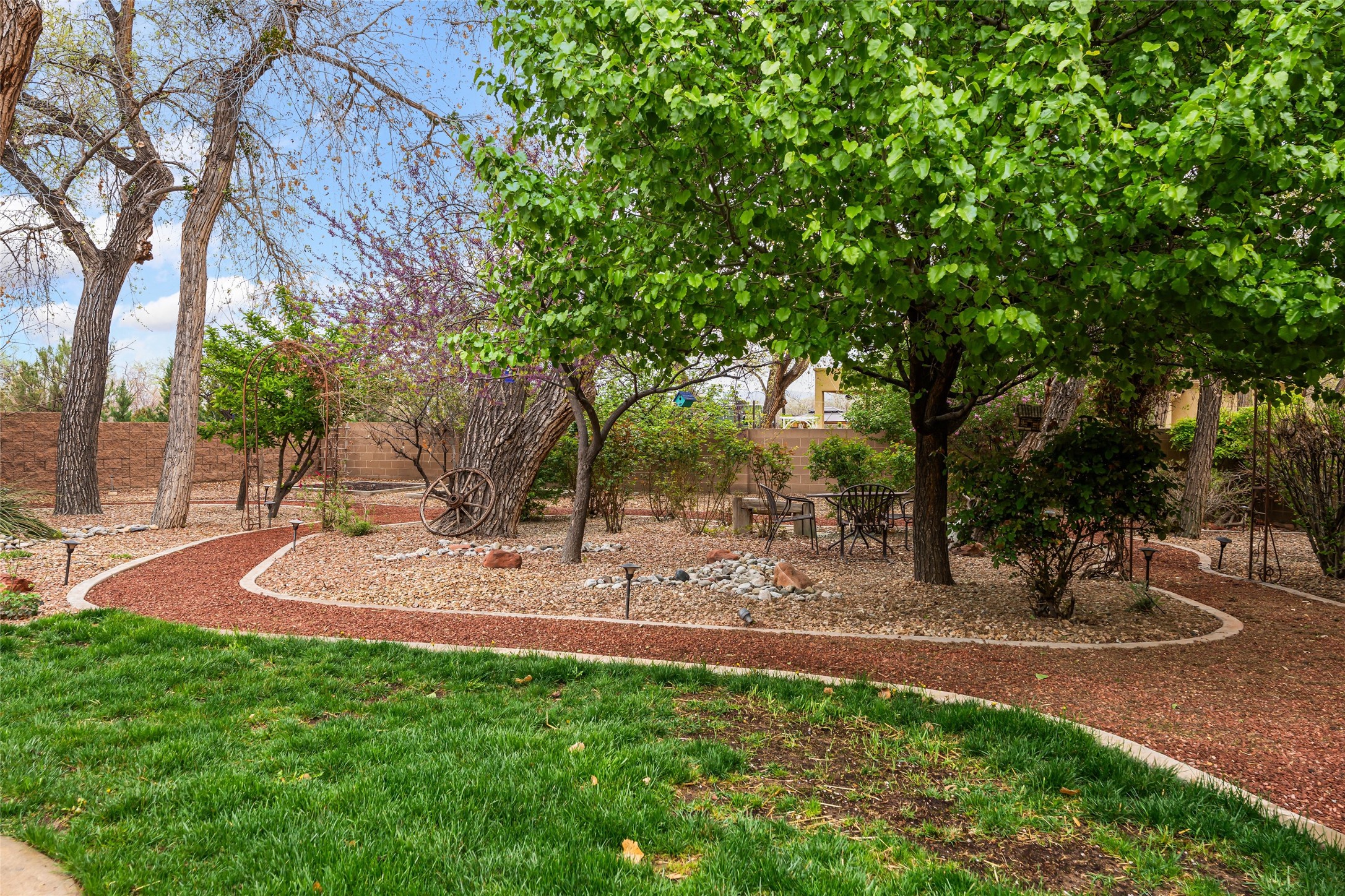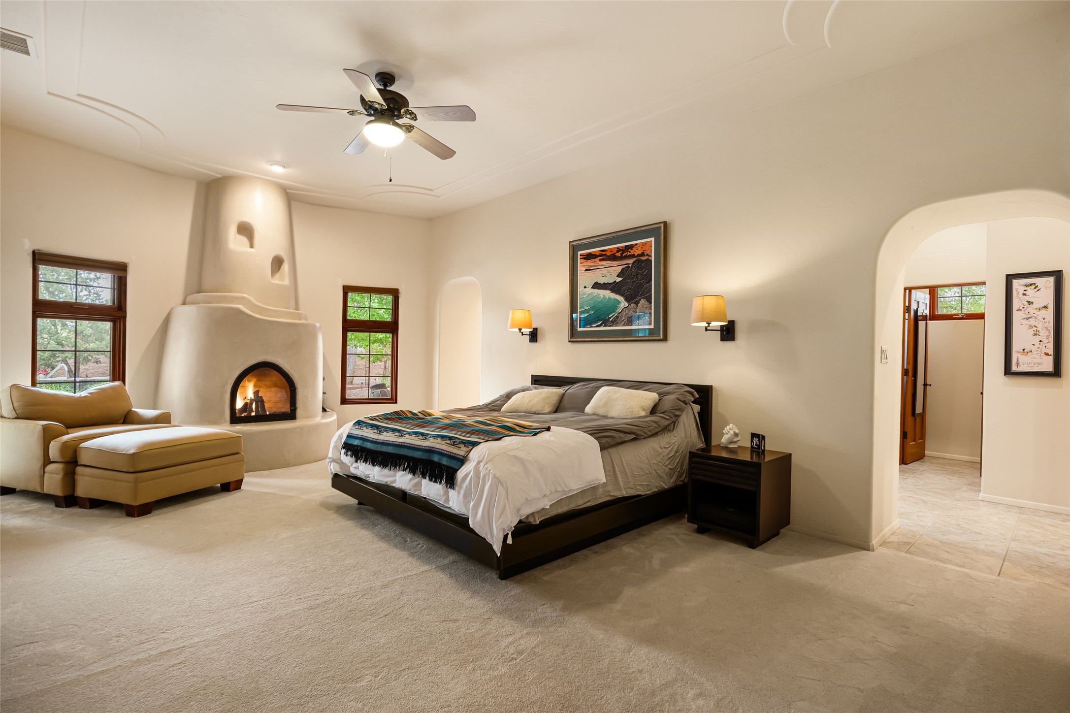 Unparalleled beauty and luxurious style exude not only from the picturesque backdrop of the Sandia Mountains, but also from this stunning custom home built in 2001 located in the gated Bosque Encantado community, a hidden gem near Bernalillo. The home sits on a little over 1 acre with a private irrigation well in place to accommodate the sumptuous landscaping. A heated pool is a focal point of the back yard with plenty of shade from mature trees and gardens, perfect for spring and summer outdoor entertaining. A covered patio, hot tub and outdoor kitchen complete the outdoor space. Inside, the large and open feel of the living and dining areas is dramatically defined by high ceilings with vigas, latillas and accented by lovely kiva fireplaces in the living room and kitchen. The well-appointed chef's kitchen has high-end stainless steel appliances, warm lighting and granite countertops in place. The primary suite is separated from the two secondary bedrooms to ensure privacy. The primary en-suite has a spa-like feel with a large wood-burning fireplace in the bedroom, a soaking tub, spiral shower and walk-in closet with custom cabinets nearby. There is a work out area, in addition to two separate offices, one with a Murphy bed adding versatility for overnight guests. The property itself also has a two-car garage with an additional oversized RV bay with nearby hookup for sewer, water and electricity (30 amp inside and outside). The home has been impeccably maintained with newer mechanicals in place. The location is convenient for those looking for access to nearby shopping, but with exceptional trail access to the nearby Rio Grande Bosque.