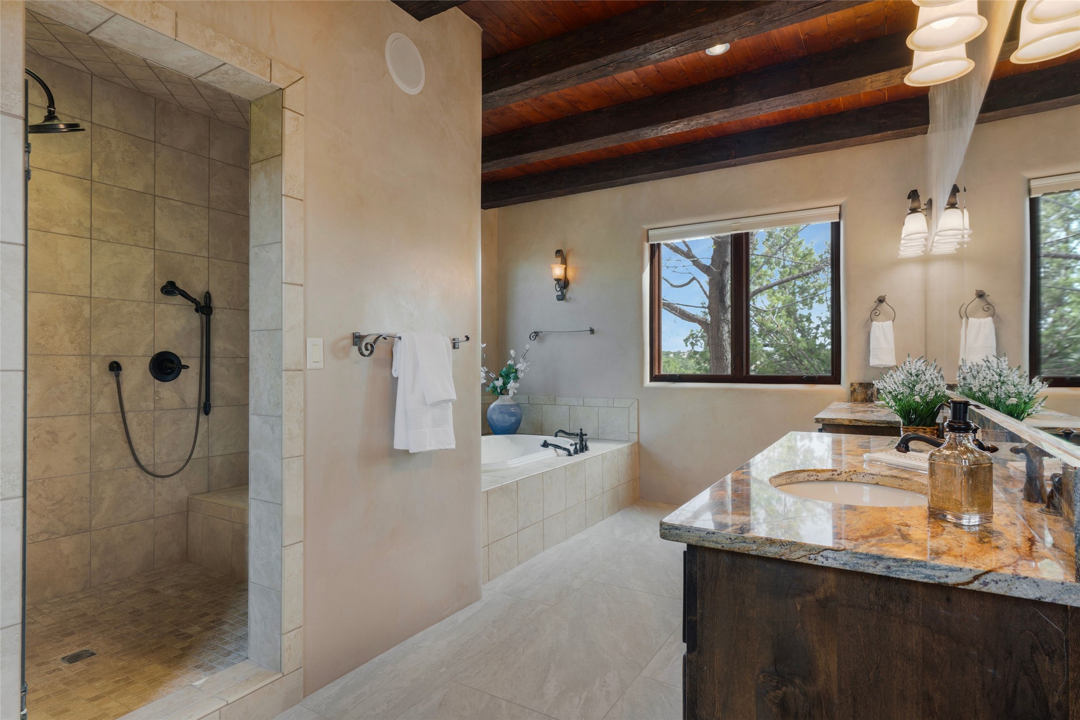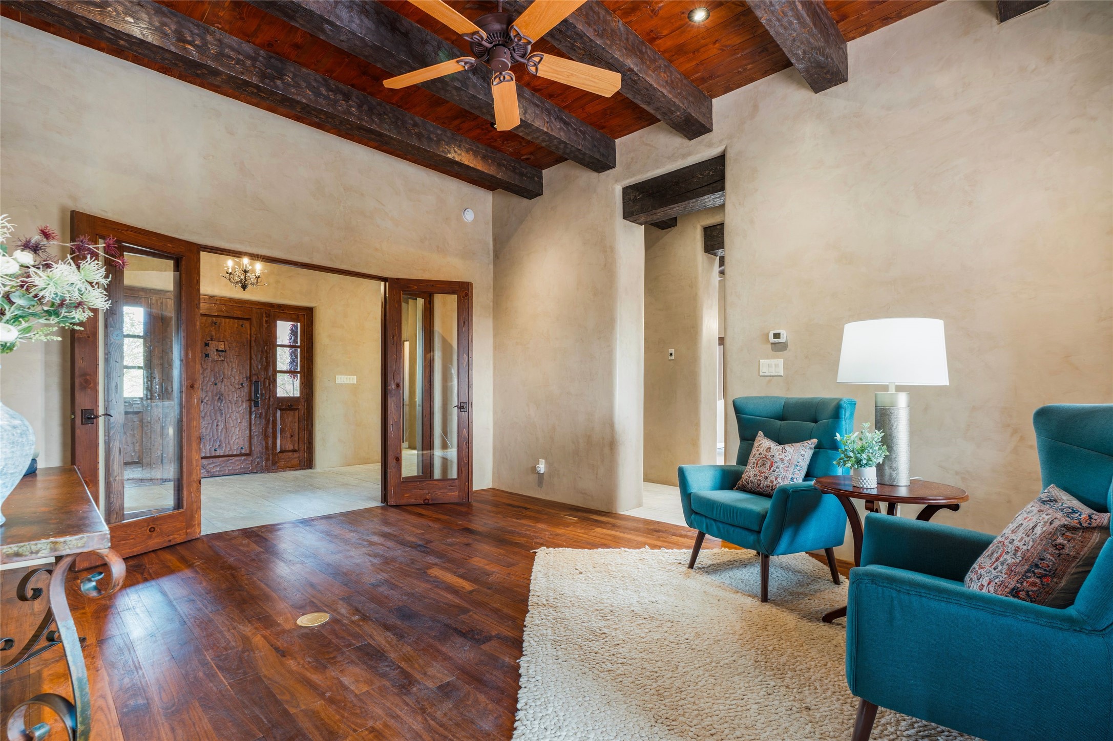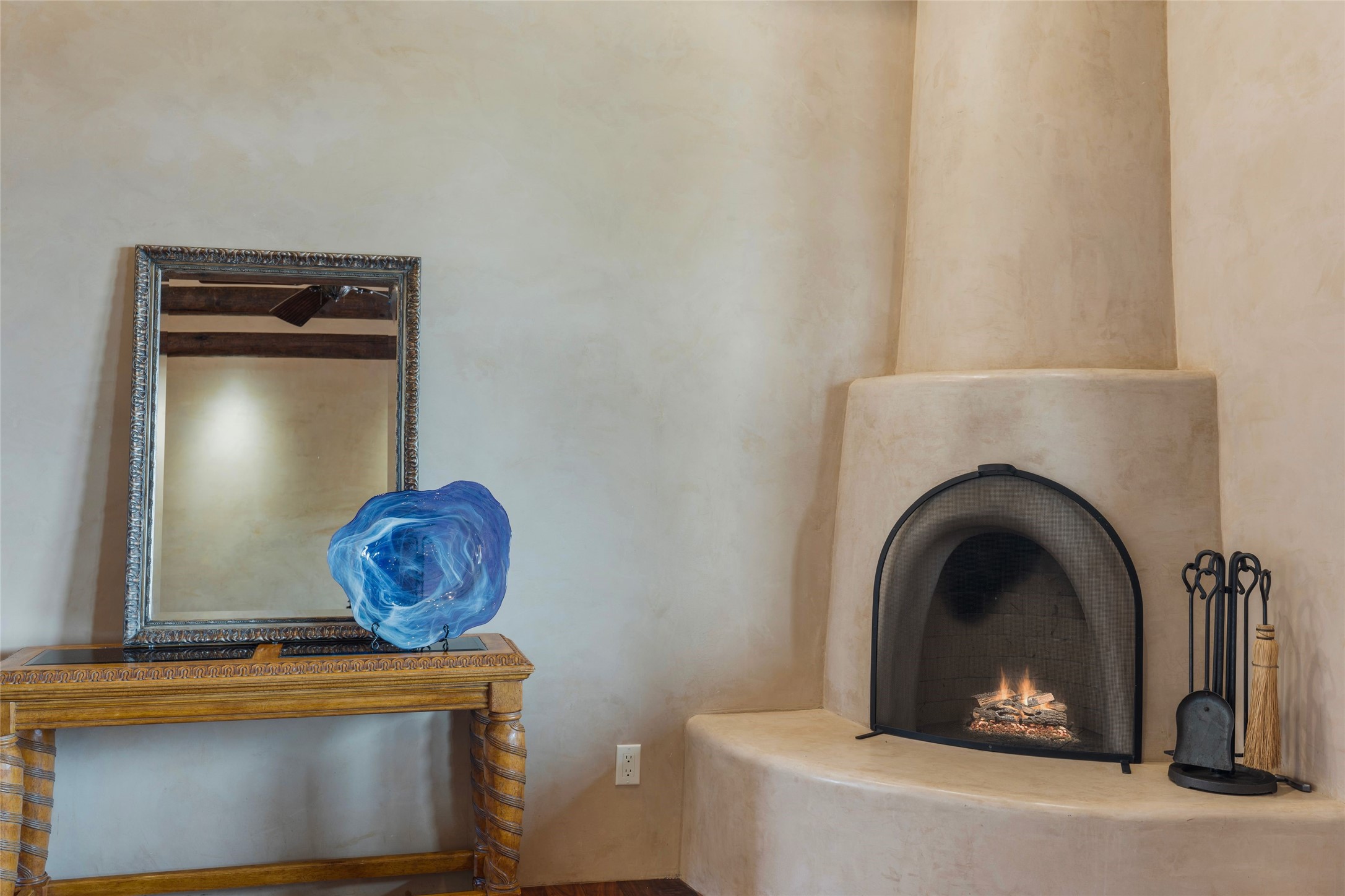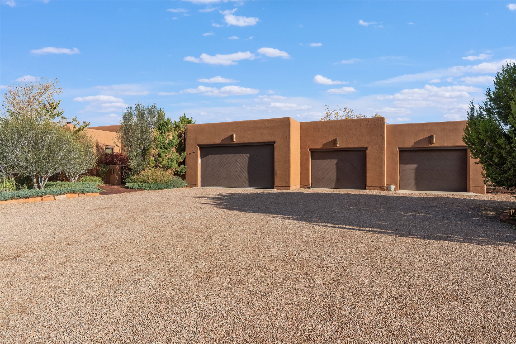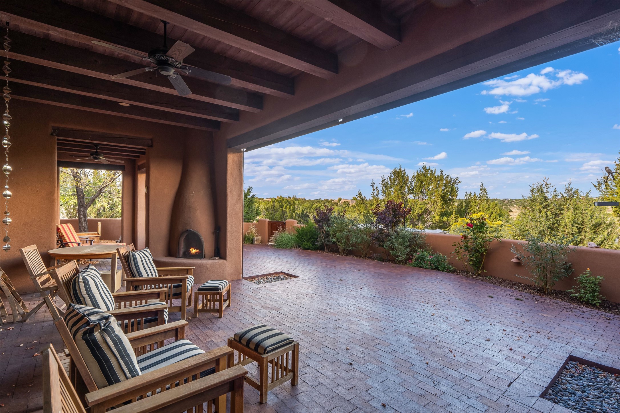 Overlooking unencumbered Sangre Mountain views, as well as the world-class equestrian center of Las Campanas, this extraordinary property is a display of sumptuous detailing and magnificent design. Situated on approximately 2 manicured acres, this 3,658 sq. ft. single-story home was built in 2008 with an extra garage (total of 4 garages) and heated 200 sq.ft. +/- studio added in 2019. Consisting of three large bedrooms suites, 3-1/2 bathrooms, formal living and dining areas as well as an open chef's kitchen with separate wet bar, sun room and library/office all with views and access to the outdoor gardens. Extensive flagstone walkways meander through yard with a stunning wall of living room glass doors opening onto the deep bricked portal with outdoor kiva fireplace. Attention to detail is evident in the custom cabinetry, granite counters, and the vast expanse of private space and formal entertaining space. The home flows with a warm andairy feel, completely integrated with custom lighting, radiant floor heating, as well as mini-split heating/air-conditioning and evaporative cooling in place. The owners' suite is separated from the secondary en-suite bedrooms with a spa-like bathroom, large soaking tub, and nearby walk-in closet. Large stone floors, wood floors, smooth plaster walls, high ceilings with traditional vigas and ceiling treatments are blended seamlessly together, notably exuding classic Santa Fe style all within close proximity to the Las Campanas Club, Spa, Equestrian and Golf Amenities.