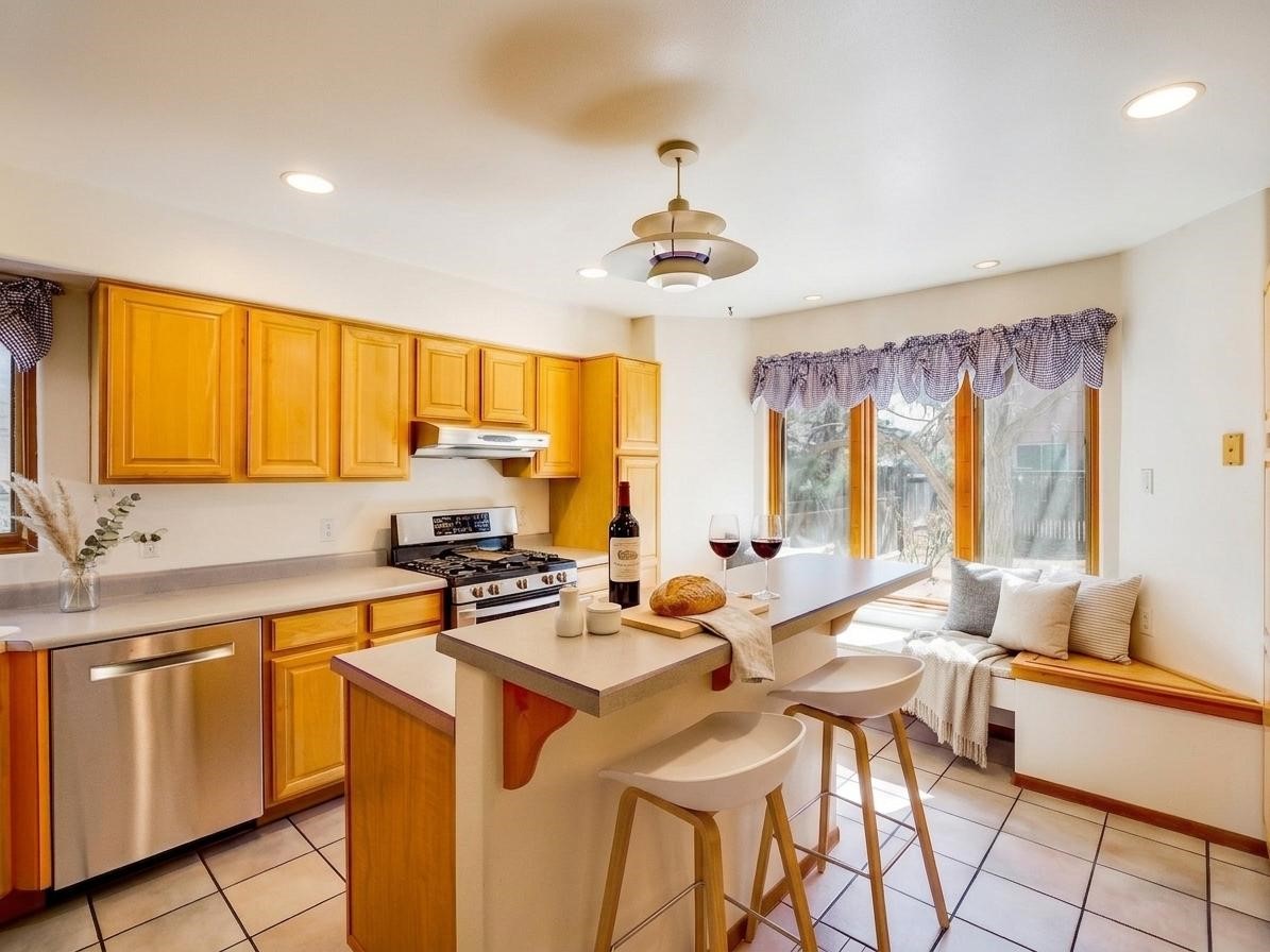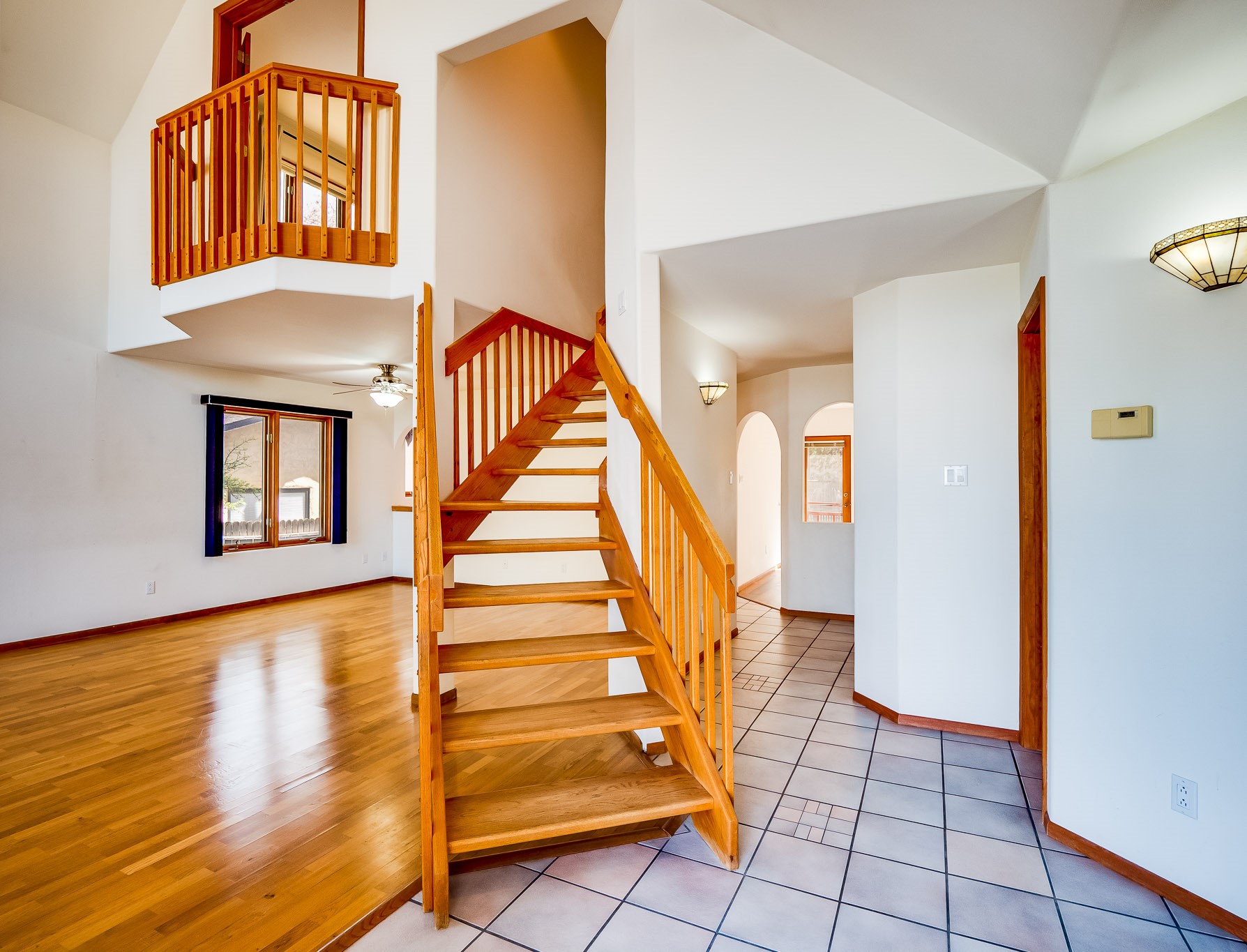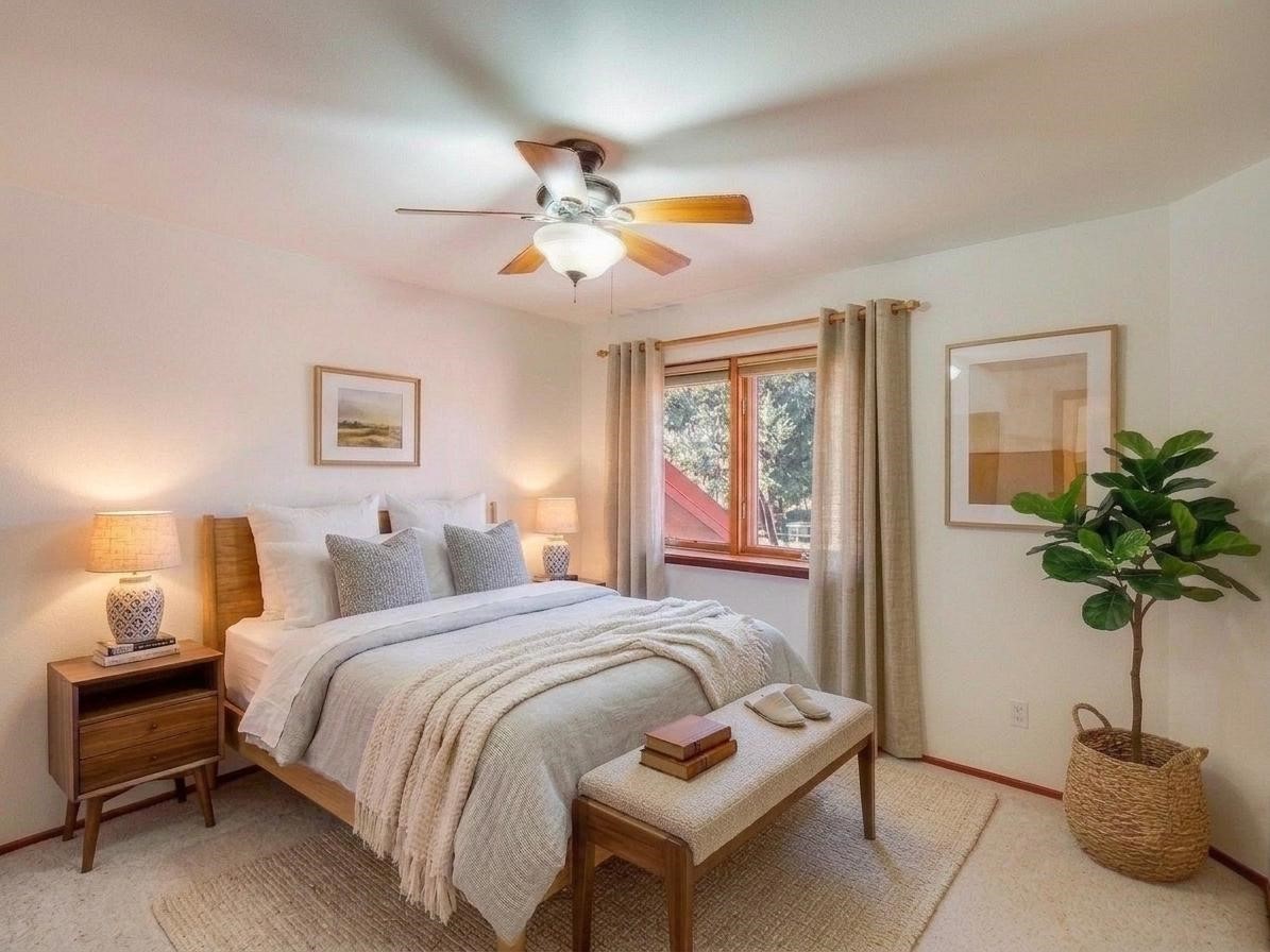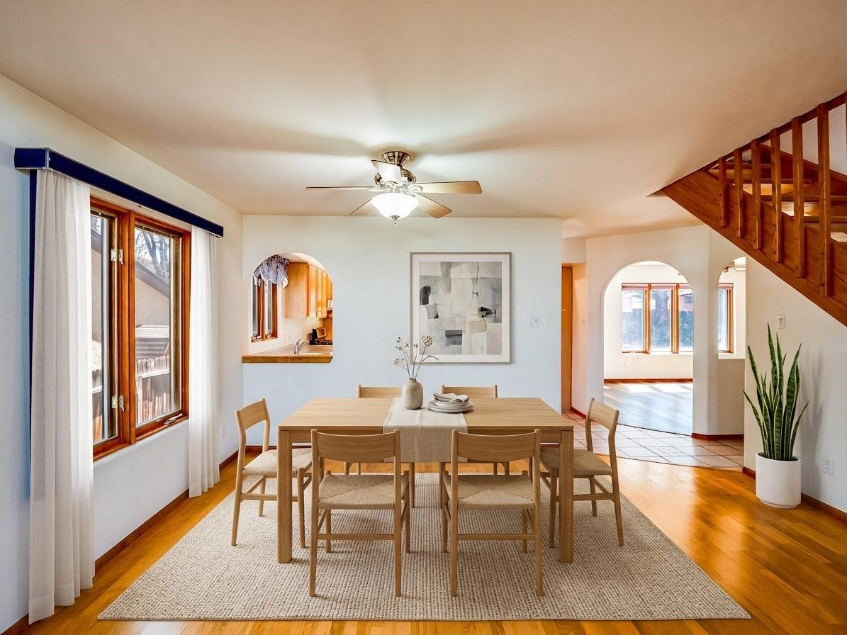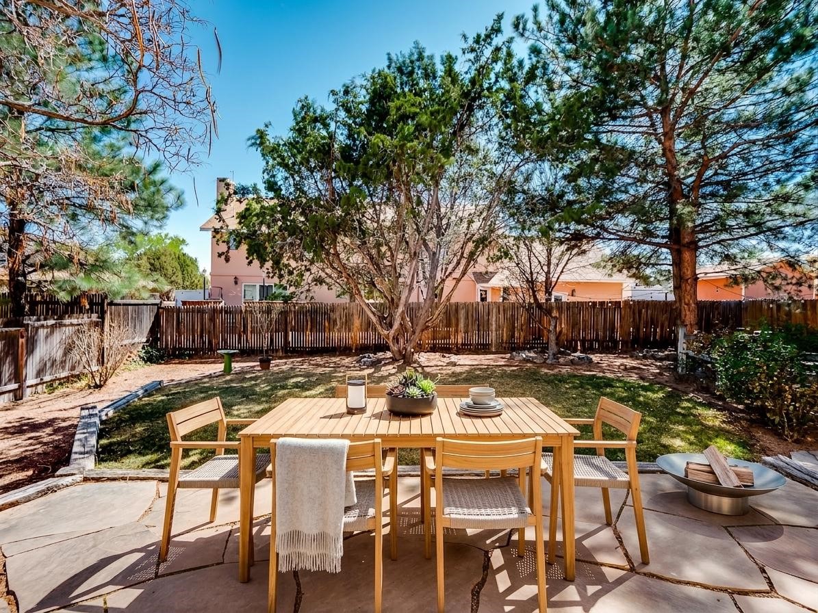 Welcome to this inviting two-story residence in White Rock offering wonderful curb appeal, mature shade trees, and a low-maintenance front yard that welcomes you the moment you arrive. Step through the front door into the foyer, where a striking centered staircase sets the tone for the rest of the home. To your left, an open living and dining space creates an ideal setting for both everyday living and entertaining. The living room features vaulted ceilings, floor-to-ceiling windows that flood the room with natural light, and warm wood flooring that adds to the sense of openness. Sharing the space is the dining area, highlighted by a dropped ceiling that helps create a more intimate, defined atmosphere for gatherings. Tucked just off the main living area is the bright, cheerful kitchen. Here you'll find abundant wood cabinetry, tile flooring, a central island with bar-top seating, stainless steel appliances, and a charming bay window with built-in seating. A comfortable family room provides an additional place to relax, with wood flooring, a wood-burning fireplace framed by built-in shelving, and windows overlooking the backyard. This room has access to the patio and yard, making indoor-outdoor living easy. A convenient powder room and a dedicated laundry room with access to the attached two-car garage complete the main level. Upstairs is fully carpeted with two nicely sized guest bedrooms and a guest bath with a tiled walk-in shower. The spacious primary suite is a true retreat, offering mountain views and an observation overlook to the living room. Large walk-in closet with built-in organization and an en-suite bathroom with a single-sink vanity, deep jetted tub, and separate walk-in shower. Lovely backyard with grass, mature trees, and planter areas with room to expand your garden. A generous flagstone patio sets the stage for outdoor dining, barbecues, or simply relaxing with your favorite drink at the end of the day. View this fantastic home today!