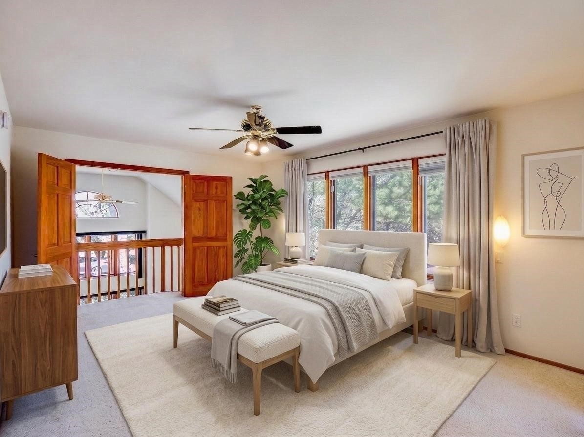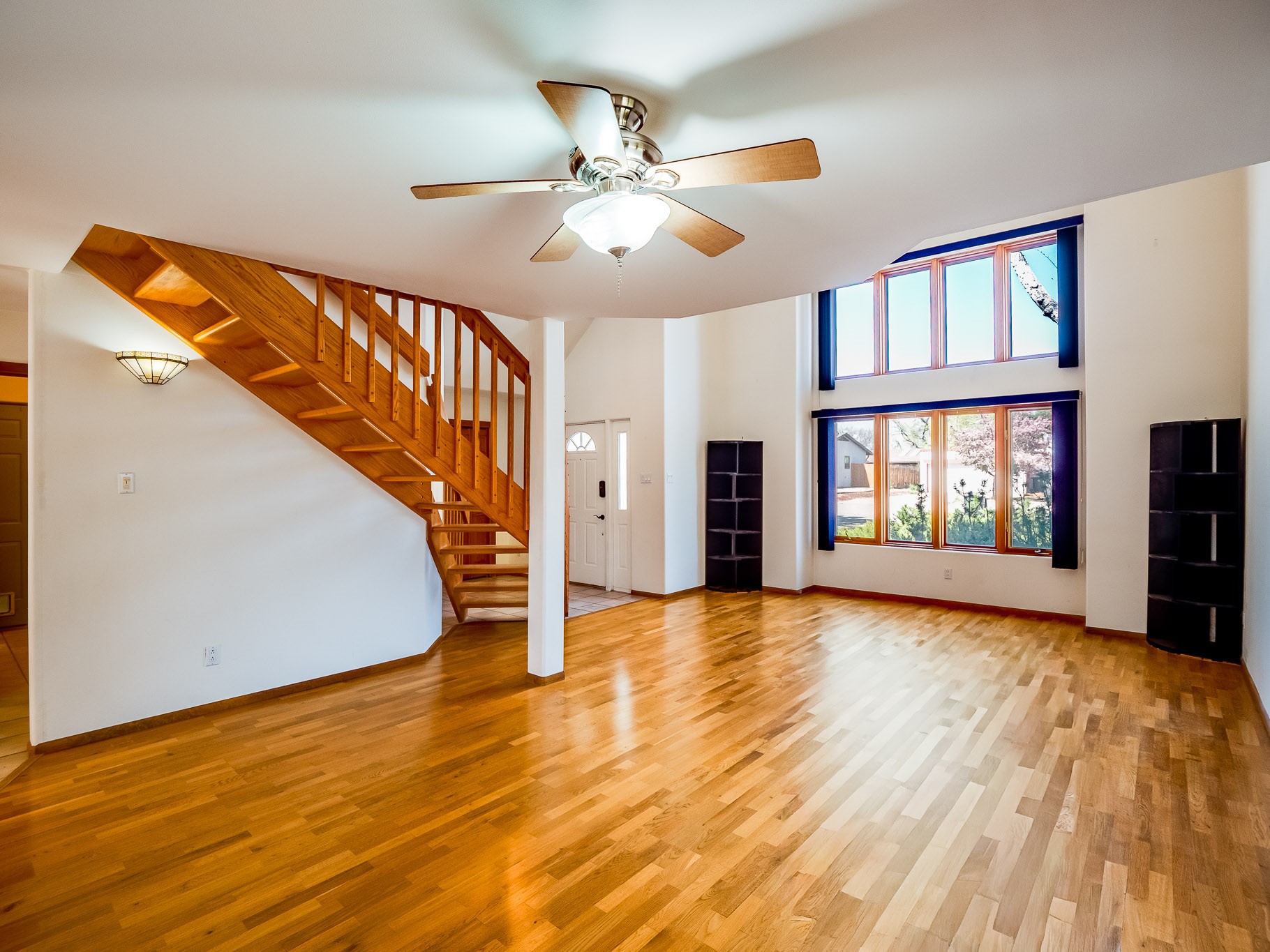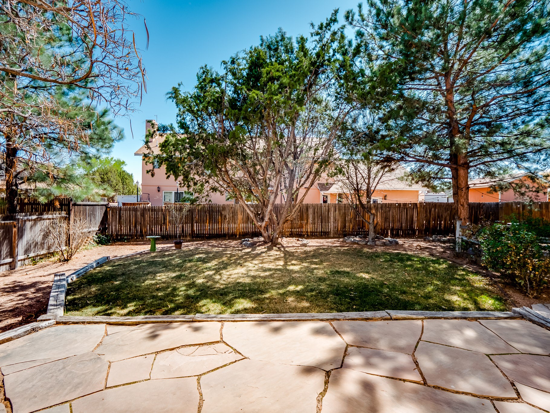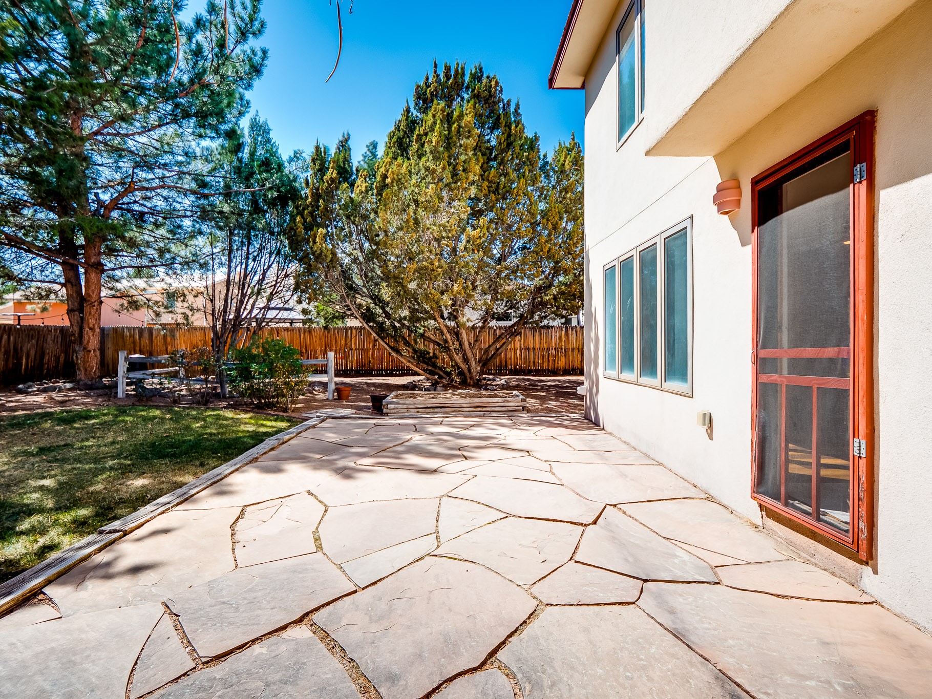 Welcome to this inviting two-story residence in White Rock offering wonderful curb appeal, mature shade trees, and a low-maintenance front yard that welcomes you the moment you arrive. Step through the front door into the foyer, where a striking centered staircase sets the tone for the rest of the home. To your left, an open living and dining space creates an ideal setting for both everyday living and entertaining. The living room features vaulted ceilings, floor-to-ceiling windows that flood the room with natural light, and warm wood flooring that adds to the sense of openness. Sharing the space is the dining area, highlighted by a dropped ceiling that helps create a more intimate, defined atmosphere for gatherings. Tucked just off the main living area is the bright, cheerful kitchen. Here you'll find abundant wood cabinetry, tile flooring, a central island with bar-top seating, stainless steel appliances, and a charming bay window with built-in seating. A comfortable family room provides an additional place to relax, with wood flooring, a wood-burning fireplace framed by built-in shelving, and windows overlooking the backyard. This room has access to the patio and yard, making indoor-outdoor living easy. A convenient powder room and a dedicated laundry room with access to the attached two-car garage complete the main level. Upstairs is fully carpeted with two nicely sized guest bedrooms and a guest bath with a tiled walk-in shower. The spacious primary suite is a true retreat, offering mountain views and an observation overlook to the living room. Large walk-in closet with built-in organization and an en-suite bathroom with a single-sink vanity, deep jetted tub, and separate walk-in shower. Lovely backyard with grass, mature trees, and planter areas with room to expand your garden. A generous flagstone patio sets the stage for outdoor dining, barbecues, or simply relaxing with your favorite drink at the end of the day. View this fantastic home today!