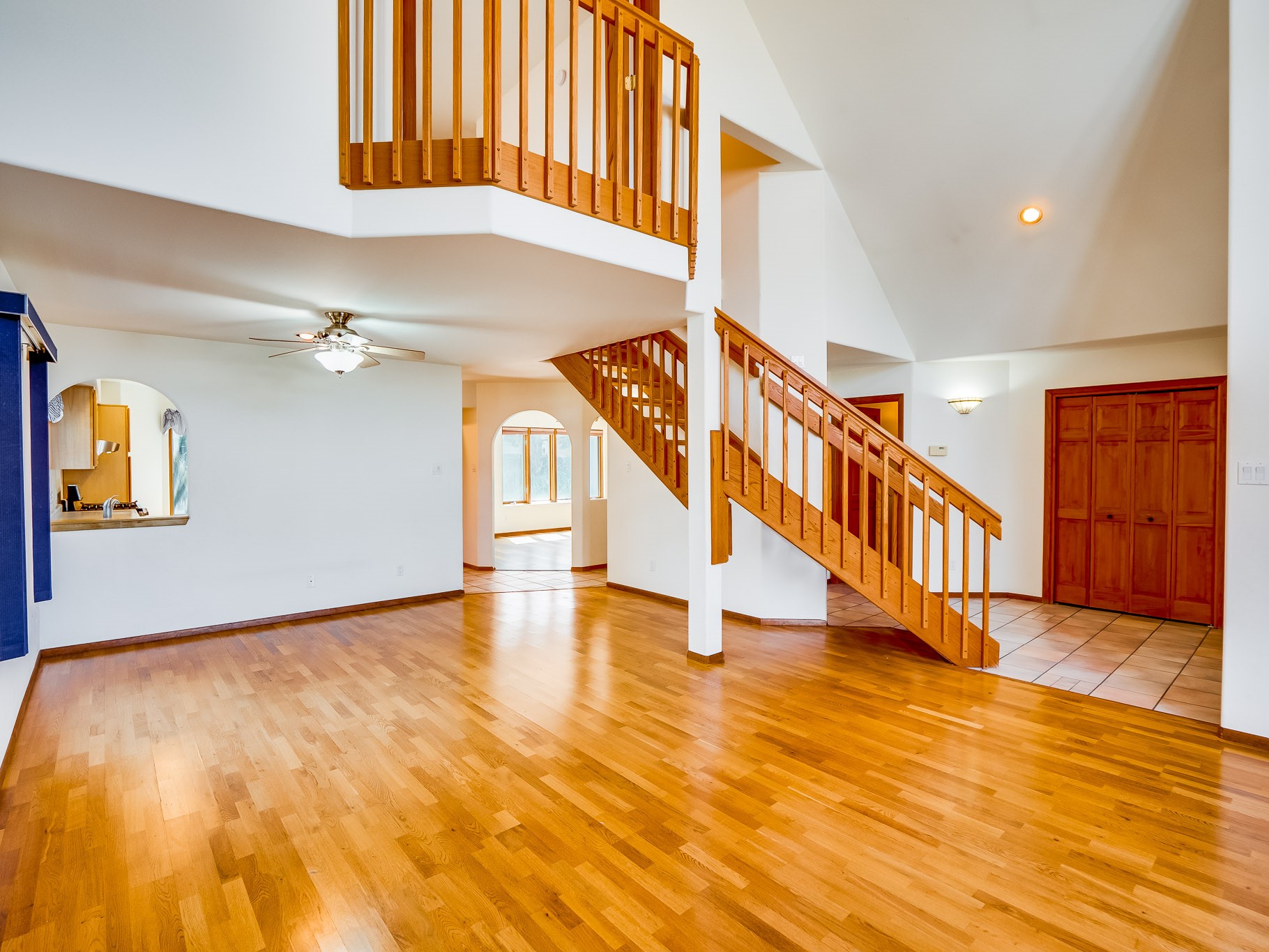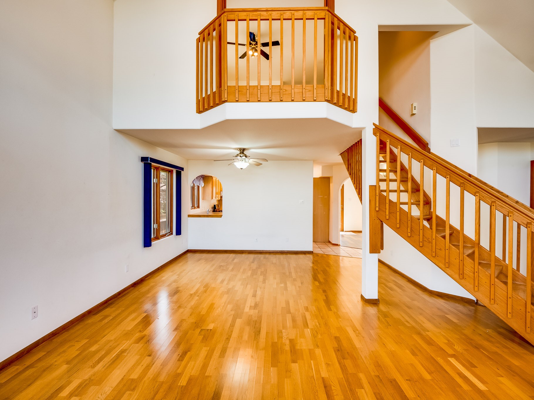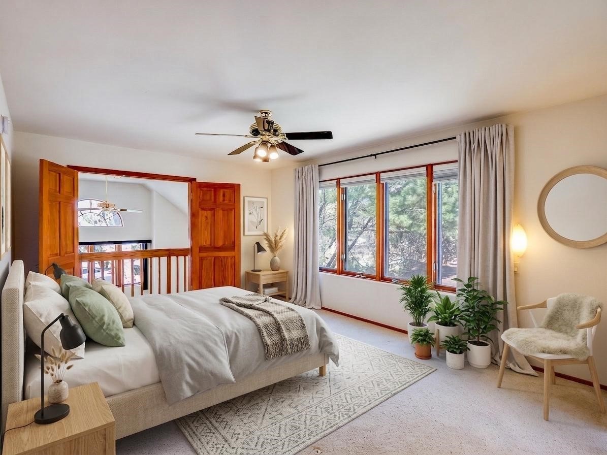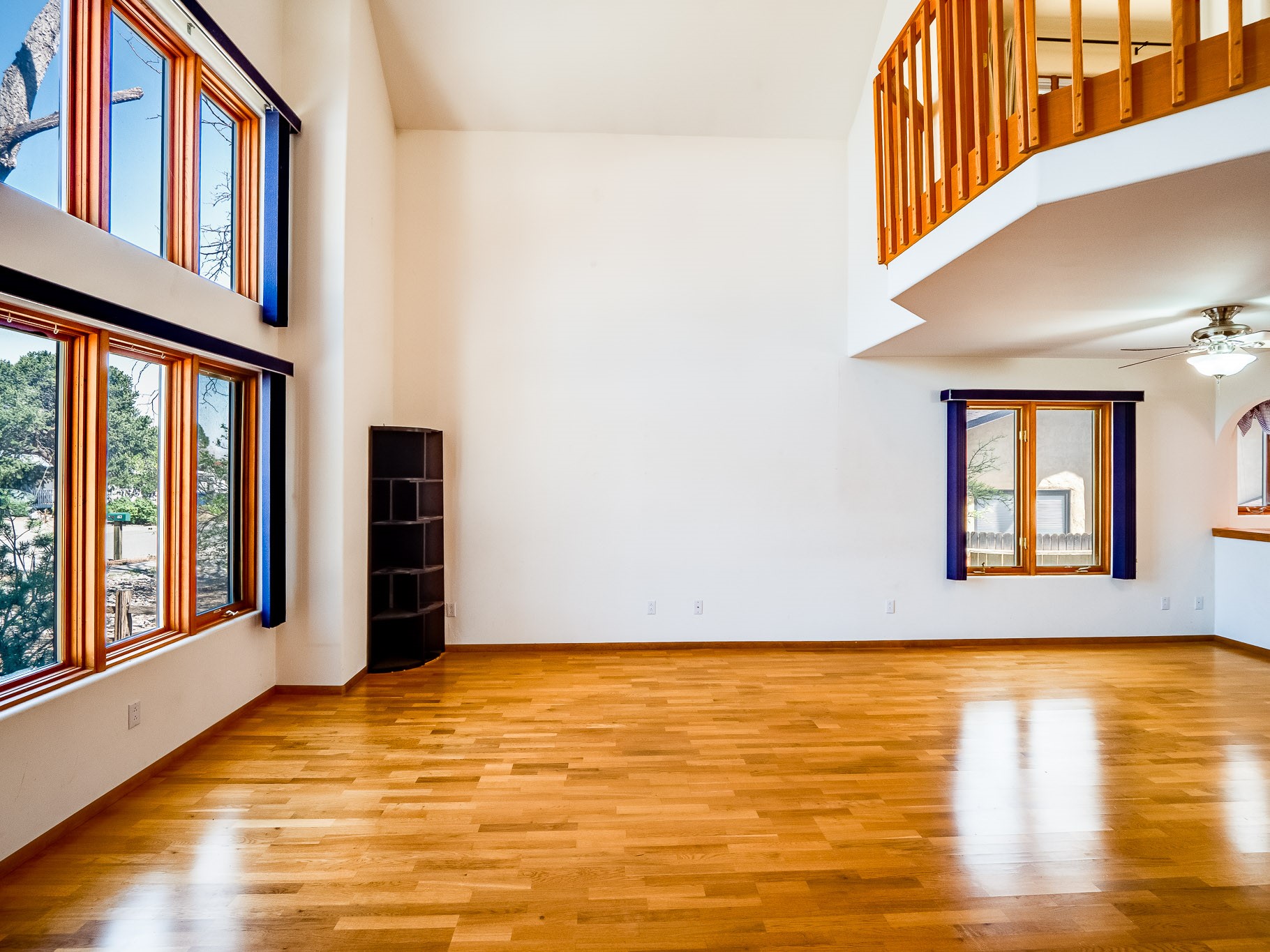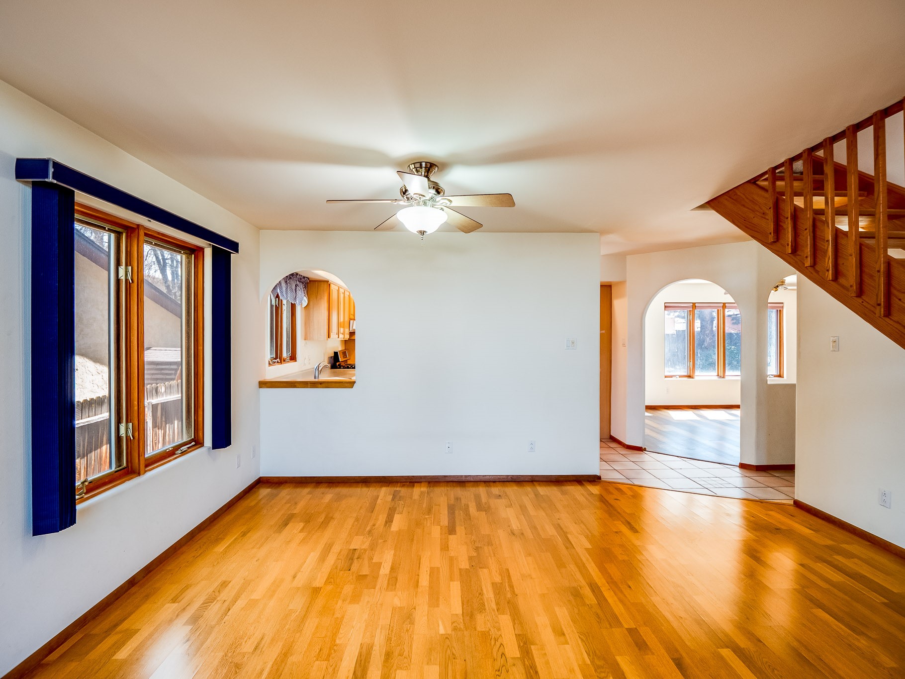 Welcome to this inviting two-story residence in White Rock offering wonderful curb appeal, mature shade trees, and a low-maintenance front yard that welcomes you the moment you arrive. Step through the front door into the foyer, where a striking centered staircase sets the tone for the rest of the home. To your left, an open living and dining space creates an ideal setting for both everyday living and entertaining. The living room features vaulted ceilings, floor-to-ceiling windows that flood the room with natural light, and warm wood flooring that adds to the sense of openness. Sharing the space is the dining area, highlighted by a dropped ceiling that helps create a more intimate, defined atmosphere for gatherings. Tucked just off the main living area is the bright, cheerful kitchen. Here you'll find abundant wood cabinetry, tile flooring, a central island with bar-top seating, stainless steel appliances, and a charming bay window with built-in seating. A comfortable family room provides an additional place to relax, with wood flooring, a wood-burning fireplace framed by built-in shelving, and windows overlooking the backyard. This room has access to the patio and yard, making indoor-outdoor living easy. A convenient powder room and a dedicated laundry room with access to the attached two-car garage complete the main level. Upstairs is fully carpeted with two nicely sized guest bedrooms and a guest bath with a tiled walk-in shower. The spacious primary suite is a true retreat, offering mountain views and an observation overlook to the living room. Large walk-in closet with built-in organization and an en-suite bathroom with a single-sink vanity, deep jetted tub, and separate walk-in shower. Lovely backyard with grass, mature trees, and planter areas with room to expand your garden. A generous flagstone patio sets the stage for outdoor dining, barbecues, or simply relaxing with your favorite drink at the end of the day. View this fantastic home today!