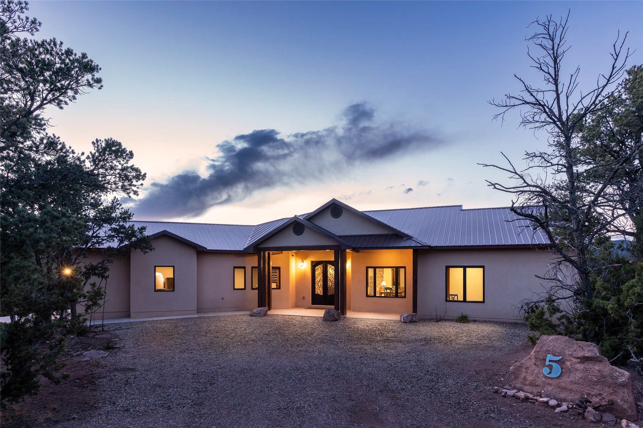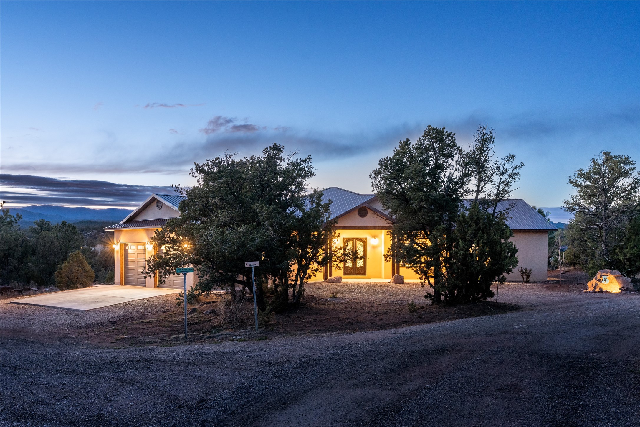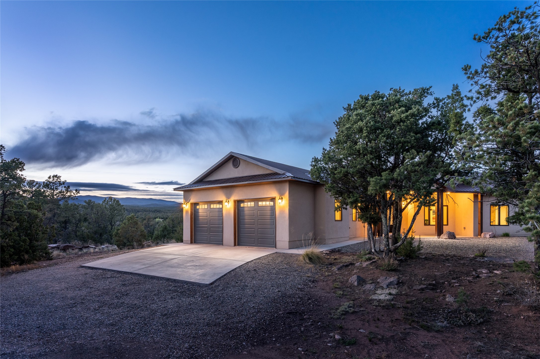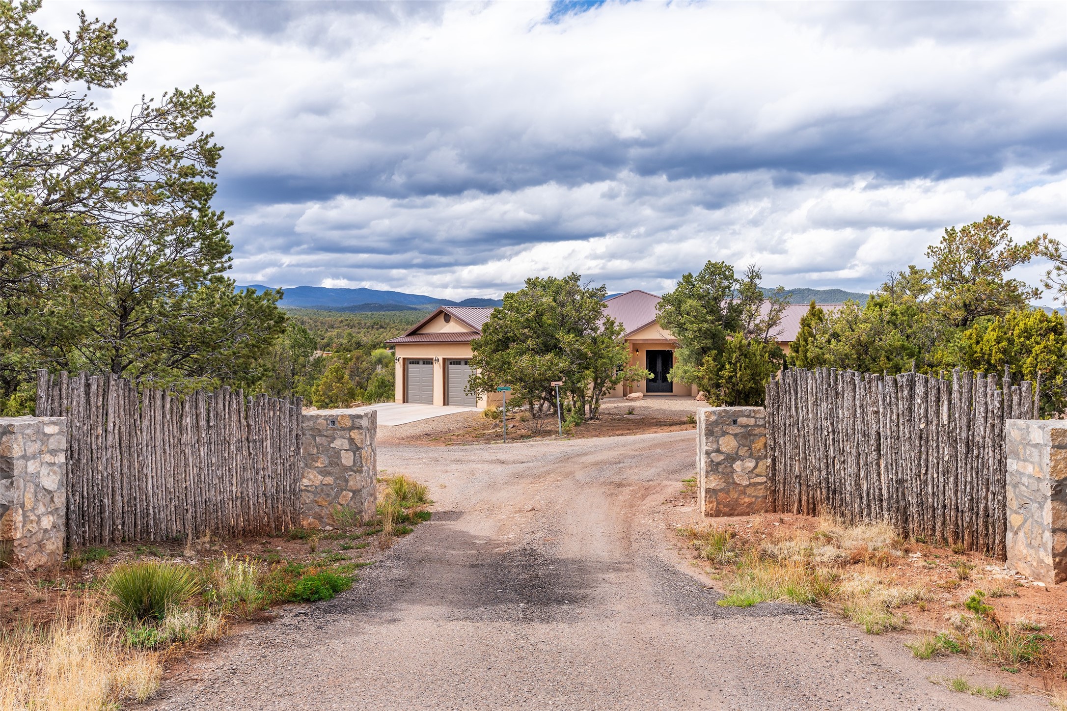 Built in 2021, this beautiful Pecos retreat is the perfect blend of modern comfort and cabin-like living with easy access to the amenities of Santa Fe and the Pecos Wilderness for outdoor enthusiasts. Located directly off of a county-maintained road, this is ideal for year-round living. Designed for both everyday living and entertaining, the open-concept kitchen features soft-close cabinetry, a large pantry and an Elmira Stove Works retro-inspired gas and electric range with convection oven. The spacious living room showcases vaulted ceilings with wood beams and opens to a covered rear portal perfect for taking in the surrounding scenery and enjoying the clear, starry night skies. The split floor plan provides excellent privacy. The generous primary suite includes a luxurious ensuite bath with dual vanities, granite counters, a custom tiled shower, two walk-in closets with built-ins, and separate commode areas. On the opposite side of the home, two well-sized guest bedrooms, one with dual walk-in closets, share a Jack-and-Jill bath with double sinks and granite finishes.Additional highlights include a spacious office with French doors, a finished 2-car garage with overhead storage and direct entry into a large laundry room, Pella windows and doors, forced air heating with central refrigerated A/C, a pitched pro-panel roof, tankless hot water heater, and a whole-house water softener. Serviced by Village of Pecos water and sewer, Mora-San Miguel Electric, and propane gas, this thoughtfully designed property offers comfort, functionality, and stunning views in a peaceful setting.