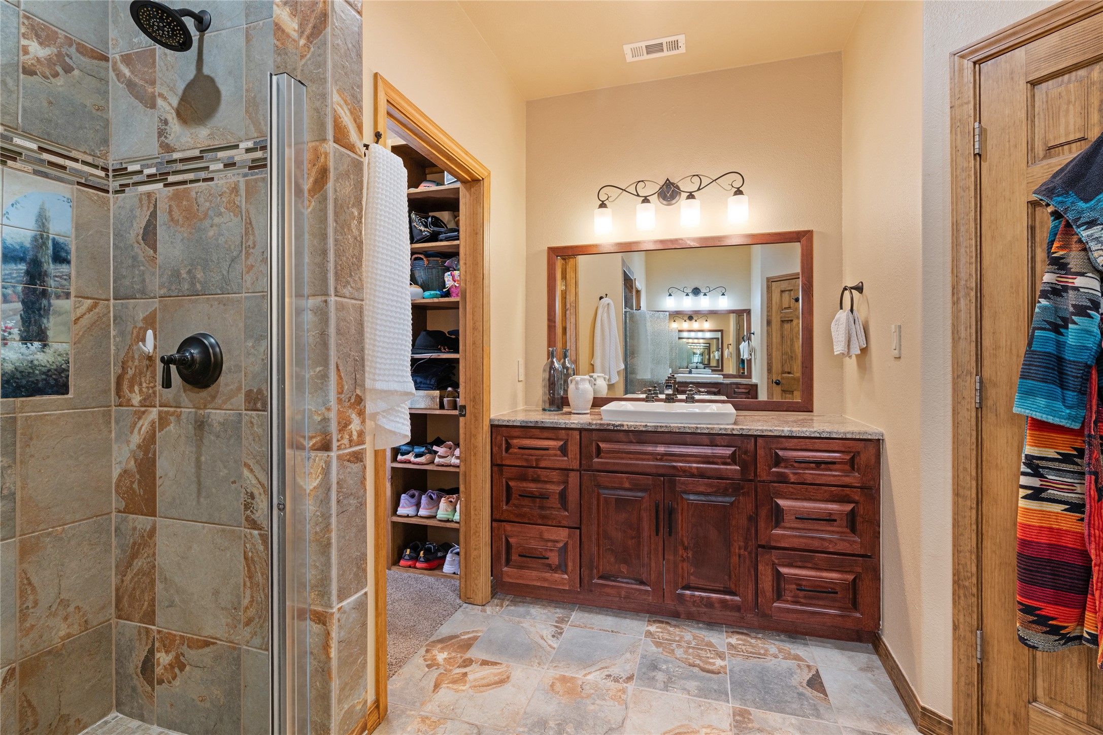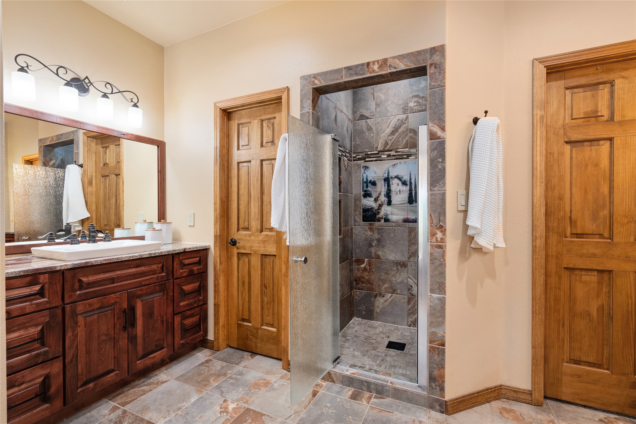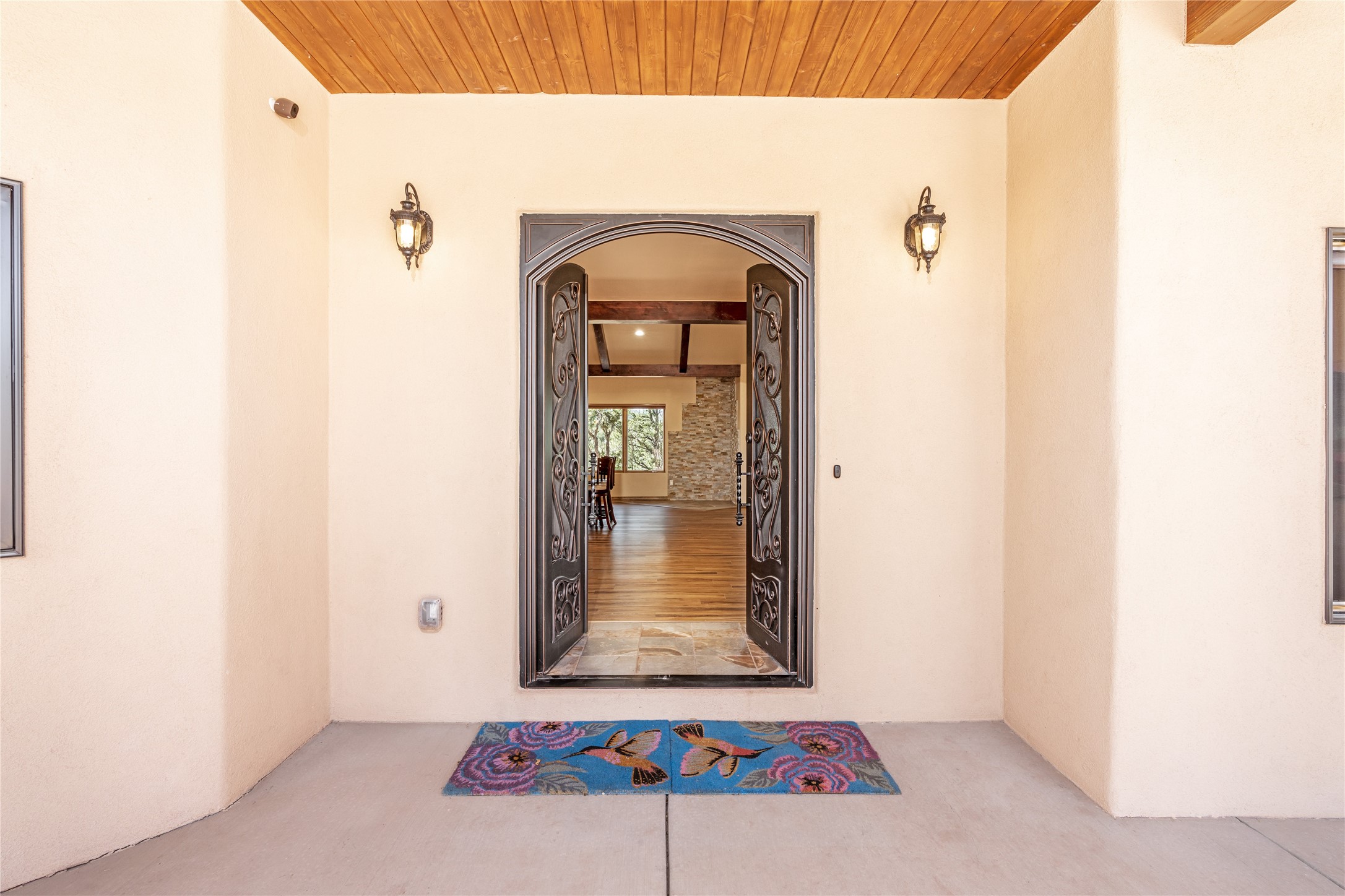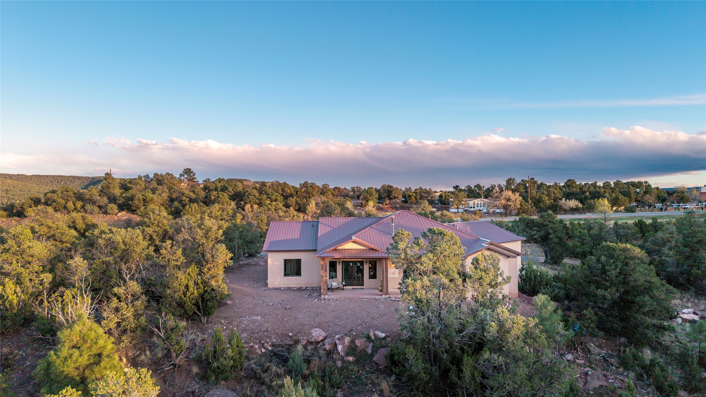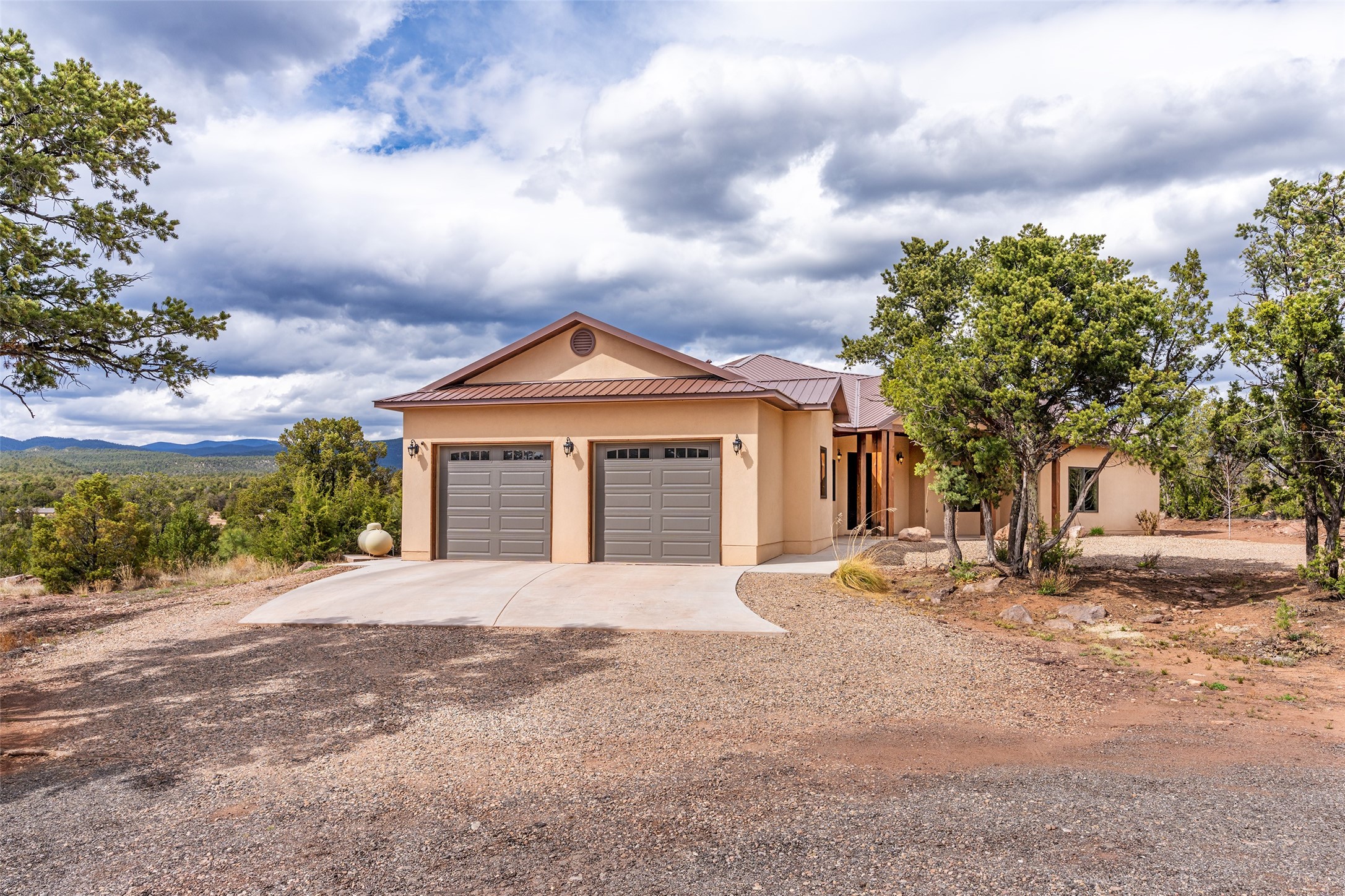 Built in 2021, this beautiful Pecos retreat is the perfect blend of modern comfort and cabin-like living with easy access to the amenities of Santa Fe and the Pecos Wilderness for outdoor enthusiasts. Located directly off of a county-maintained road, this is ideal for year-round living. Designed for both everyday living and entertaining, the open-concept kitchen features soft-close cabinetry, a large pantry and an Elmira Stove Works retro-inspired gas and electric range with convection oven. The spacious living room showcases vaulted ceilings with wood beams and opens to a covered rear portal perfect for taking in the surrounding scenery and enjoying the clear, starry night skies. The split floor plan provides excellent privacy. The generous primary suite includes a luxurious ensuite bath with dual vanities, granite counters, a custom tiled shower, two walk-in closets with built-ins, and separate commode areas. On the opposite side of the home, two well-sized guest bedrooms, one with dual walk-in closets, share a Jack-and-Jill bath with double sinks and granite finishes.Additional highlights include a spacious office with French doors, a finished 2-car garage with overhead storage and direct entry into a large laundry room, Pella windows and doors, forced air heating with central refrigerated A/C, a pitched pro-panel roof, tankless hot water heater, and a whole-house water softener. Serviced by Village of Pecos water and sewer, Mora-San Miguel Electric, and propane gas, this thoughtfully designed property offers comfort, functionality, and stunning views in a peaceful setting.