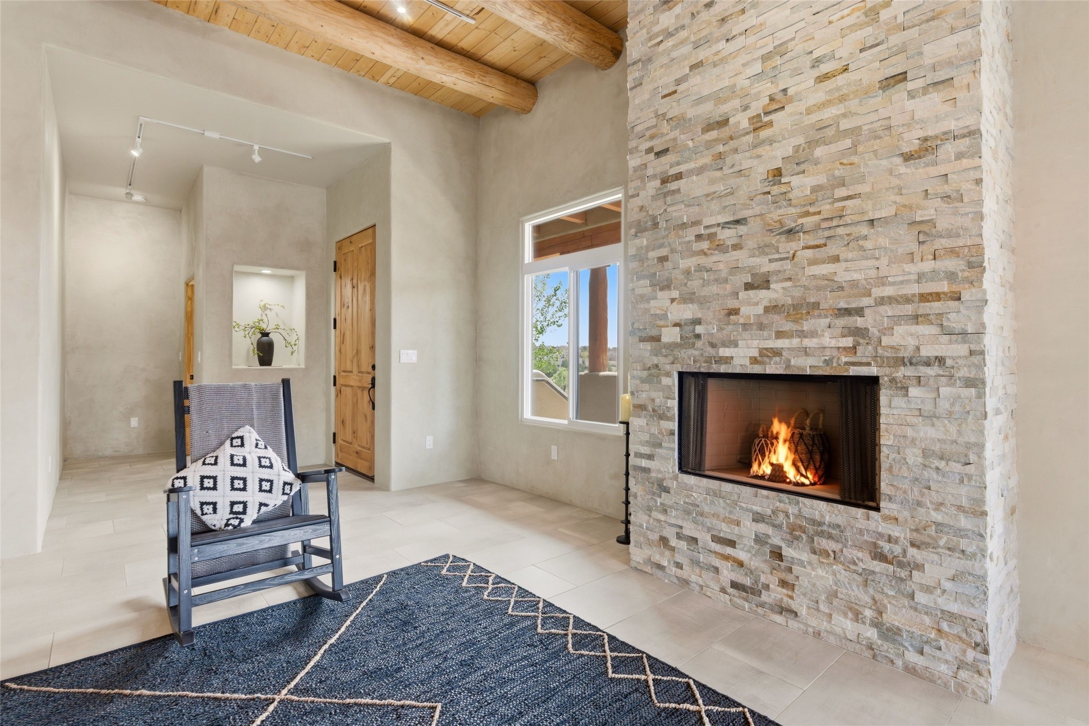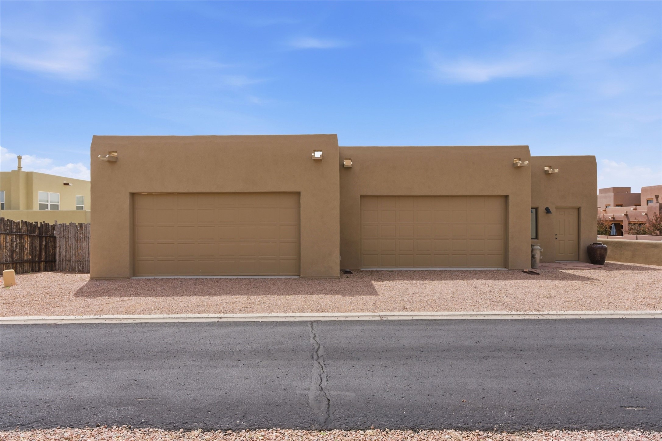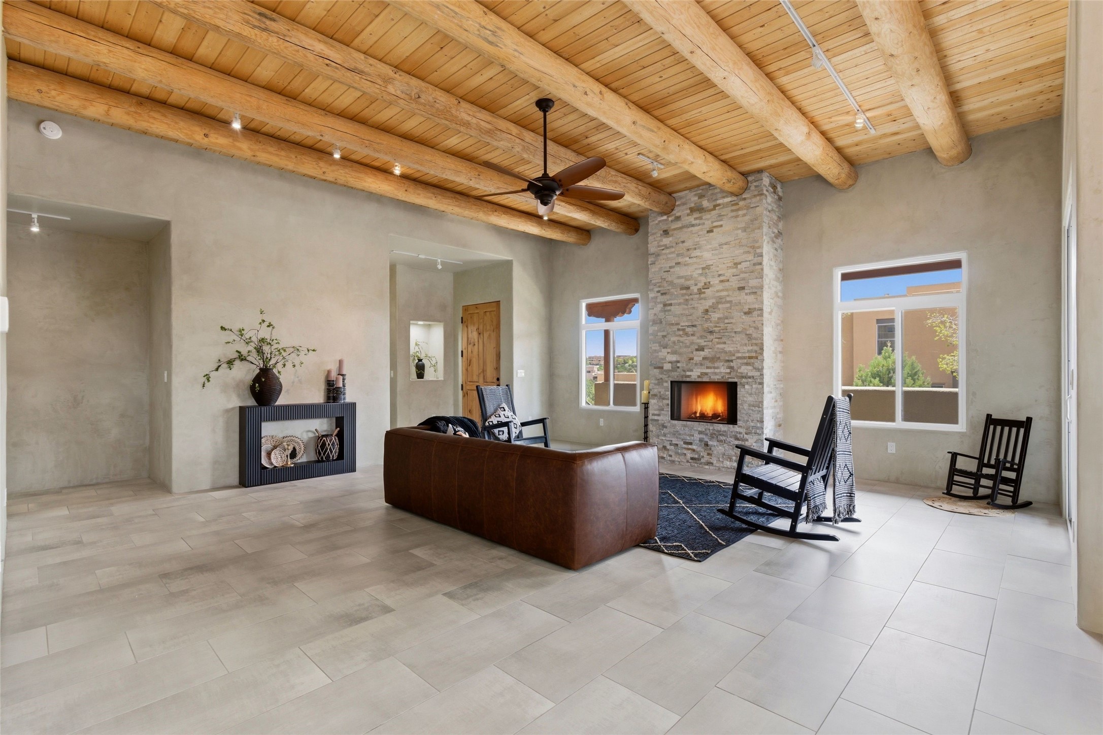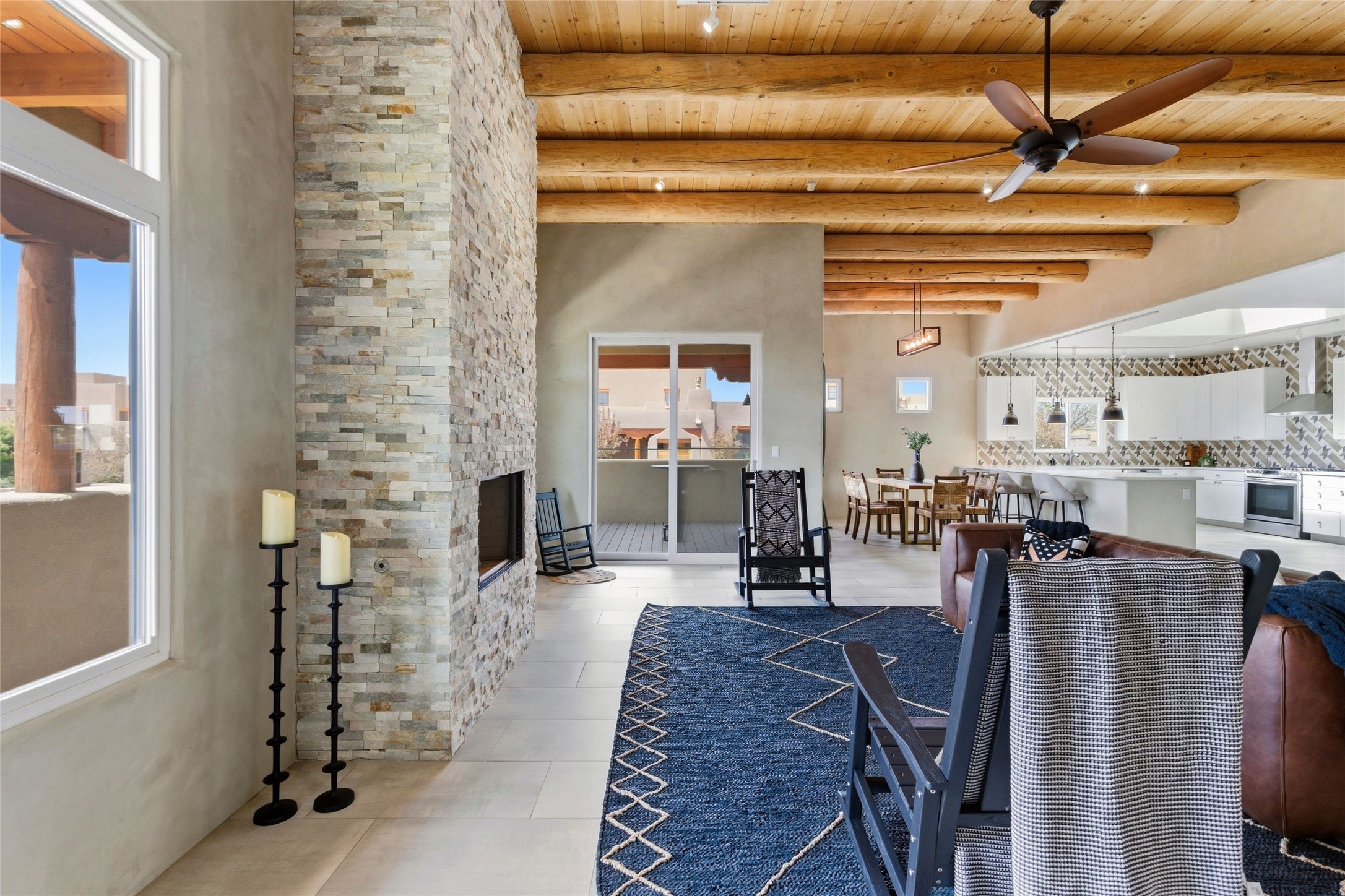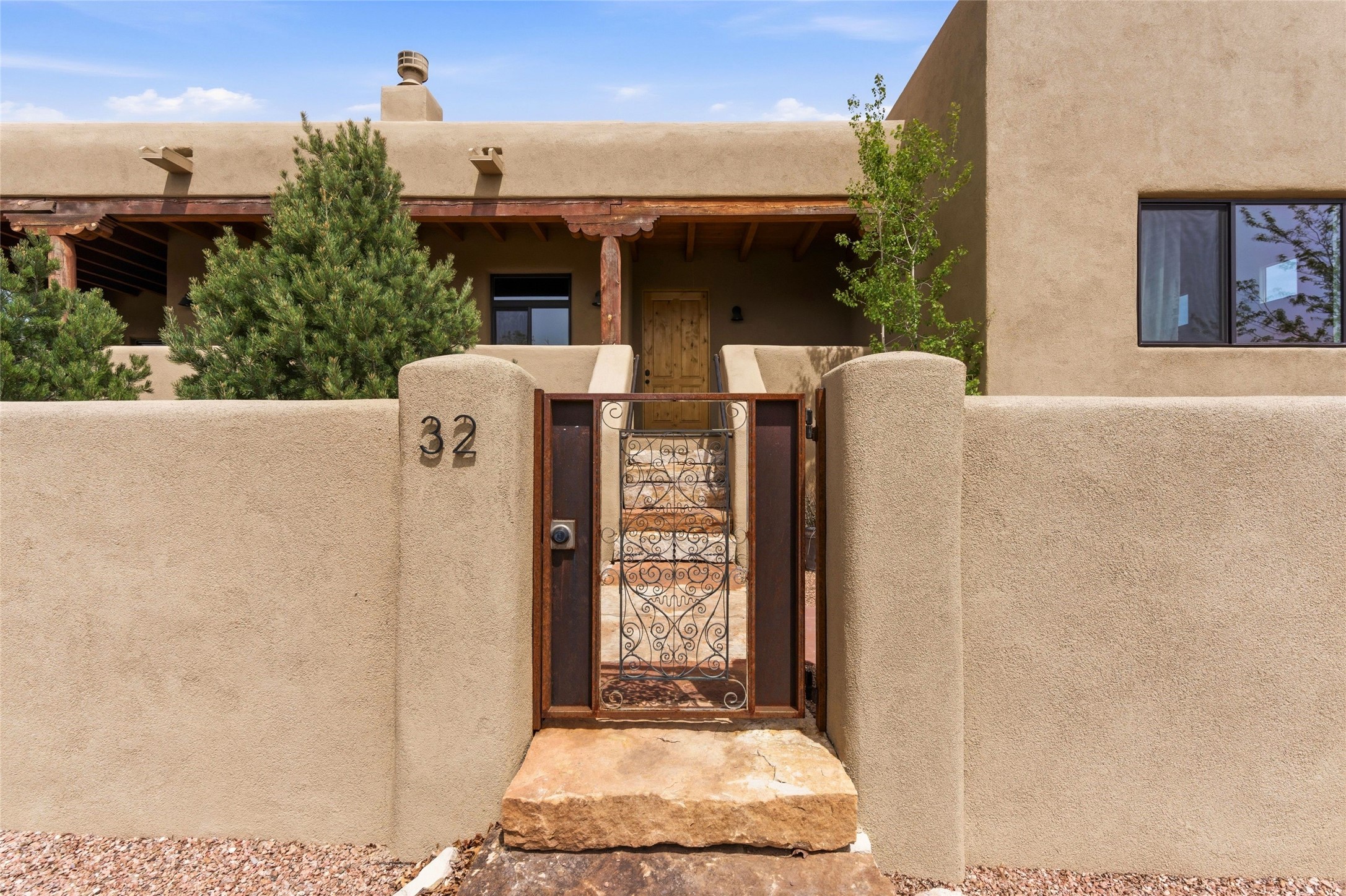Sophistication meets classic Santa Fe style at 32 Calle Lemita, a beautifully designed home in the sought-after Aldea de Santa Fe community. This 3-bedroom, 3-bath residence sits on a 0.16-acre lot, offering abundant natural light and partial sunset views. The open-concept layout features soaring ceilings, upscale finishes, and seamless flow between the living, dining, and kitchen areas--ideal for everyday living and entertaining. The living room showcases a stacked stone fireplace, traditional vigas, and plaster walls throughout the main living spaces. The chef's kitchen is equipped with premium cabinetry with soft-close drawers, quartz countertops, designer tile backsplash, stainless steel appliances, and an large pantry/storage room (other options are wine storage/tasting room/office space). The primary suite offers a spa-like bath, an exceptionally customized walk-in closet, a separate shower, and a jacuzzi tub. Two additional oversized bedrooms provide flexibility for guests, office space, or hobbies. A dedicated laundry room includes a sink and built-in cabinetry. The home also features whole-house radiant heating and cooling. Adjacent to the heated and cooled four-car garage is a versatile flex space, ideal for a home gym or studio. Outdoor living includes a private enclosed courtyard and elevated patio designed to capture Santa Fe's stunning sunsets. There is also a side yard with dog run and doggy door into the heated/cooled garage.Additional upgrades include LED recessed lighting, floor-to-ceiling tile in select bathrooms, carved stone sinks, and other custom touches. Located about 20 minutes from the Santa Fe Plaza, Aldea de Santa Fe offers walking trails, pickleball, tennis, basketball courts, and community spaces near dining, galleries, and cultural attractions. Whether you're looking for a full-time residence or a lock-and-leave getaway, this home offers a perfect combination of comfort, privacy, and connection to Santa Fe's vibrant lifestyle.