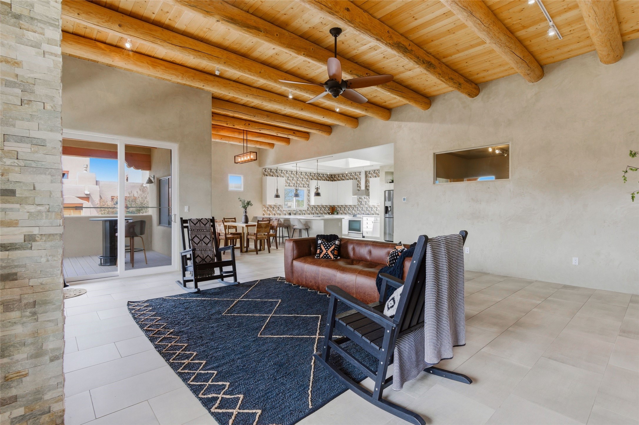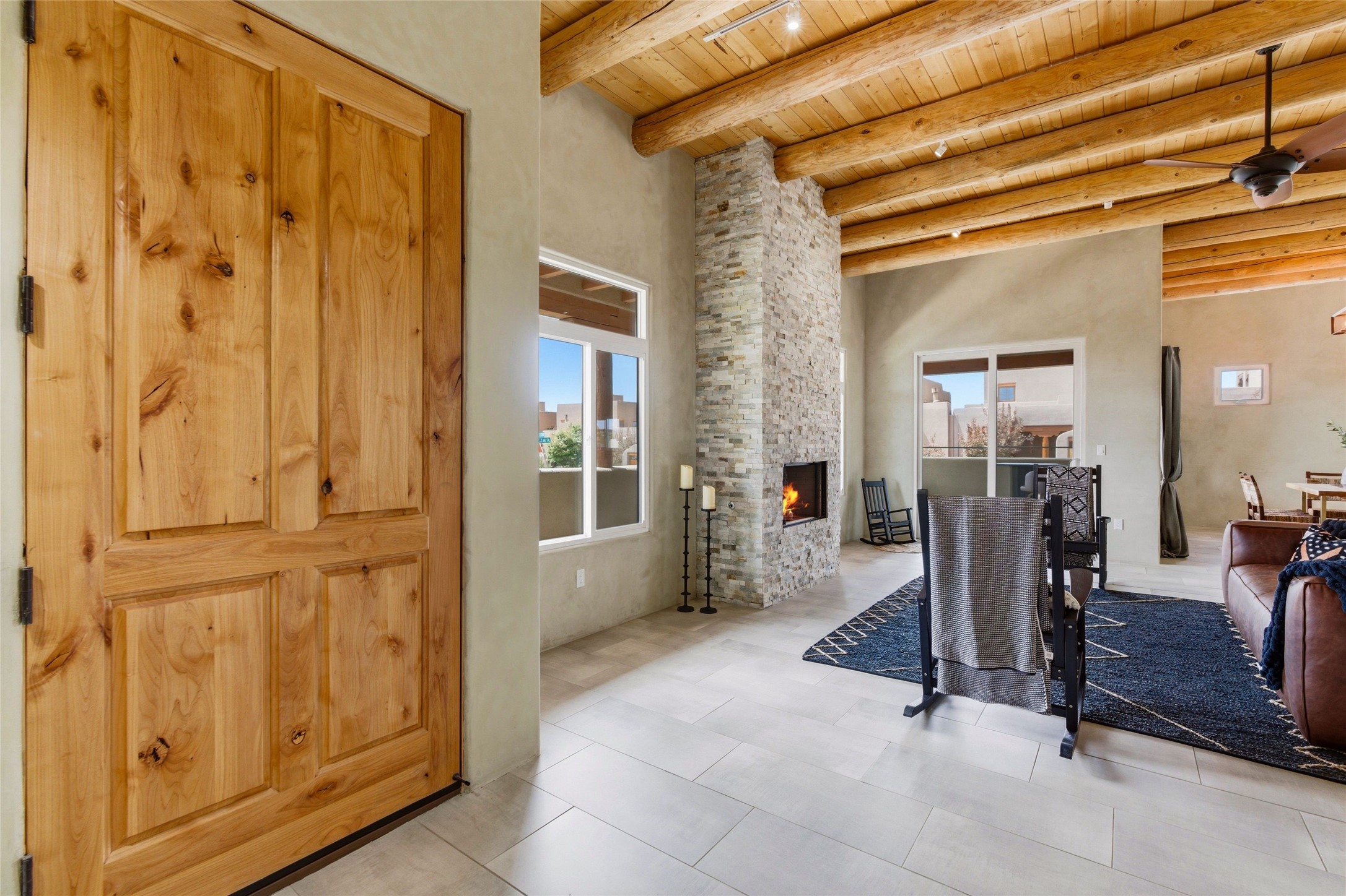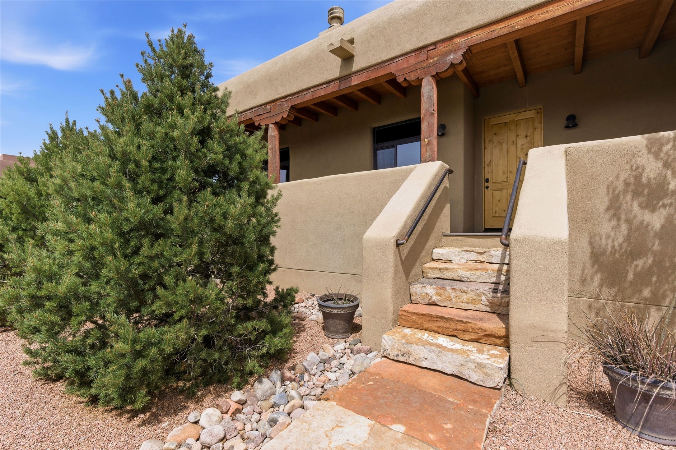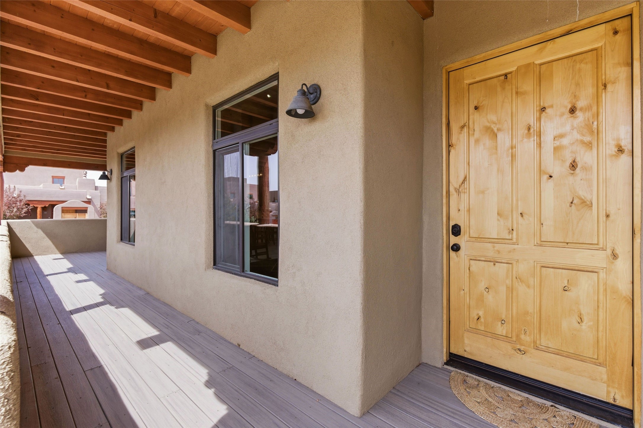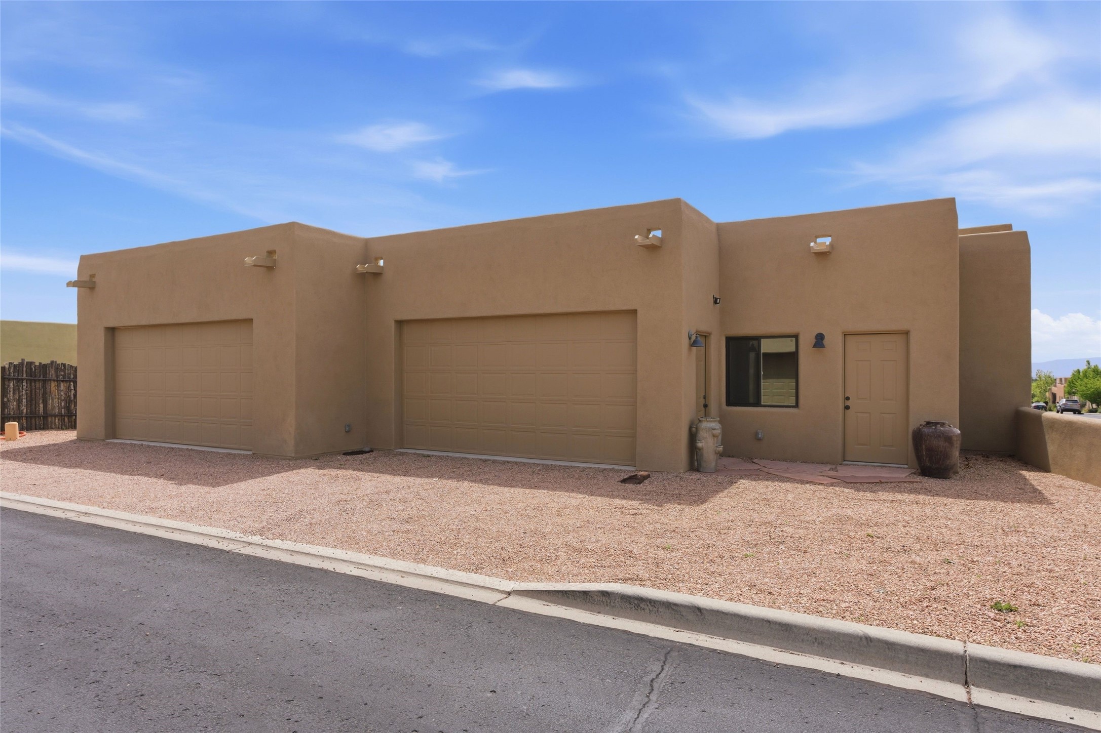 Sophistication meets classic Santa Fe style at 32 Calle Lemita, a beautifully designed home in the sought-after Aldea de Santa Fe community. This 3-bedroom, 3-bath residence sits on a 0.16-acre lot, offering abundant natural light and partial sunset views. The open-concept layout features soaring ceilings, upscale finishes, and seamless flow between the living, dining, and kitchen areas--ideal for everyday living and entertaining. The living room showcases a stacked stone fireplace, traditional vigas, and plaster walls throughout the main living spaces. The chef's kitchen is equipped with premium cabinetry with soft-close drawers, quartz countertops, designer tile backsplash, stainless steel appliances, and an large pantry/storage room (other options are wine storage/tasting room/office space). The primary suite offers a spa-like bath, an exceptionally customized walk-in closet, a separate shower, and a jacuzzi tub. Two additional oversized bedrooms provide flexibility for guests, office space, or hobbies. A dedicated laundry room includes a sink and built-in cabinetry. The home also features whole-house radiant heating and cooling. Adjacent to the heated and cooled four-car garage is a versatile flex space, ideal for a home gym or studio. Outdoor living includes a private enclosed courtyard and elevated patio designed to capture Santa Fe's stunning sunsets. There is also a side yard with dog run and doggy door into the heated/cooled garage.Additional upgrades include LED recessed lighting, floor-to-ceiling tile in select bathrooms, carved stone sinks, and other custom touches. Located about 20 minutes from the Santa Fe Plaza, Aldea de Santa Fe offers walking trails, pickleball, tennis, basketball courts, and community spaces near dining, galleries, and cultural attractions. Whether you're looking for a full-time residence or a lock-and-leave getaway, this home offers a perfect combination of comfort, privacy, and connection to Santa Fe's vibrant lifestyle.