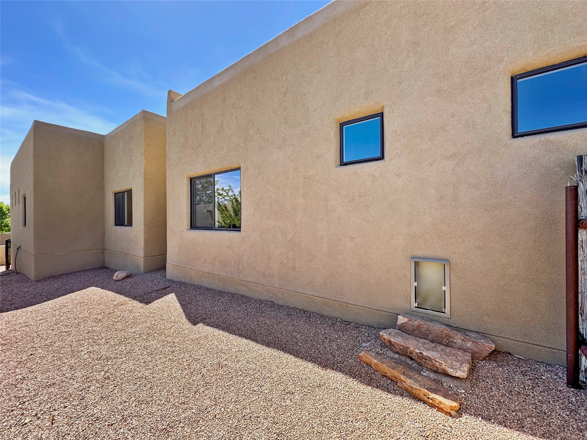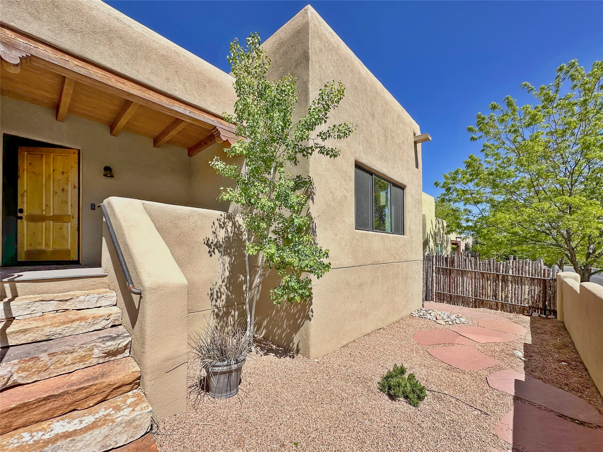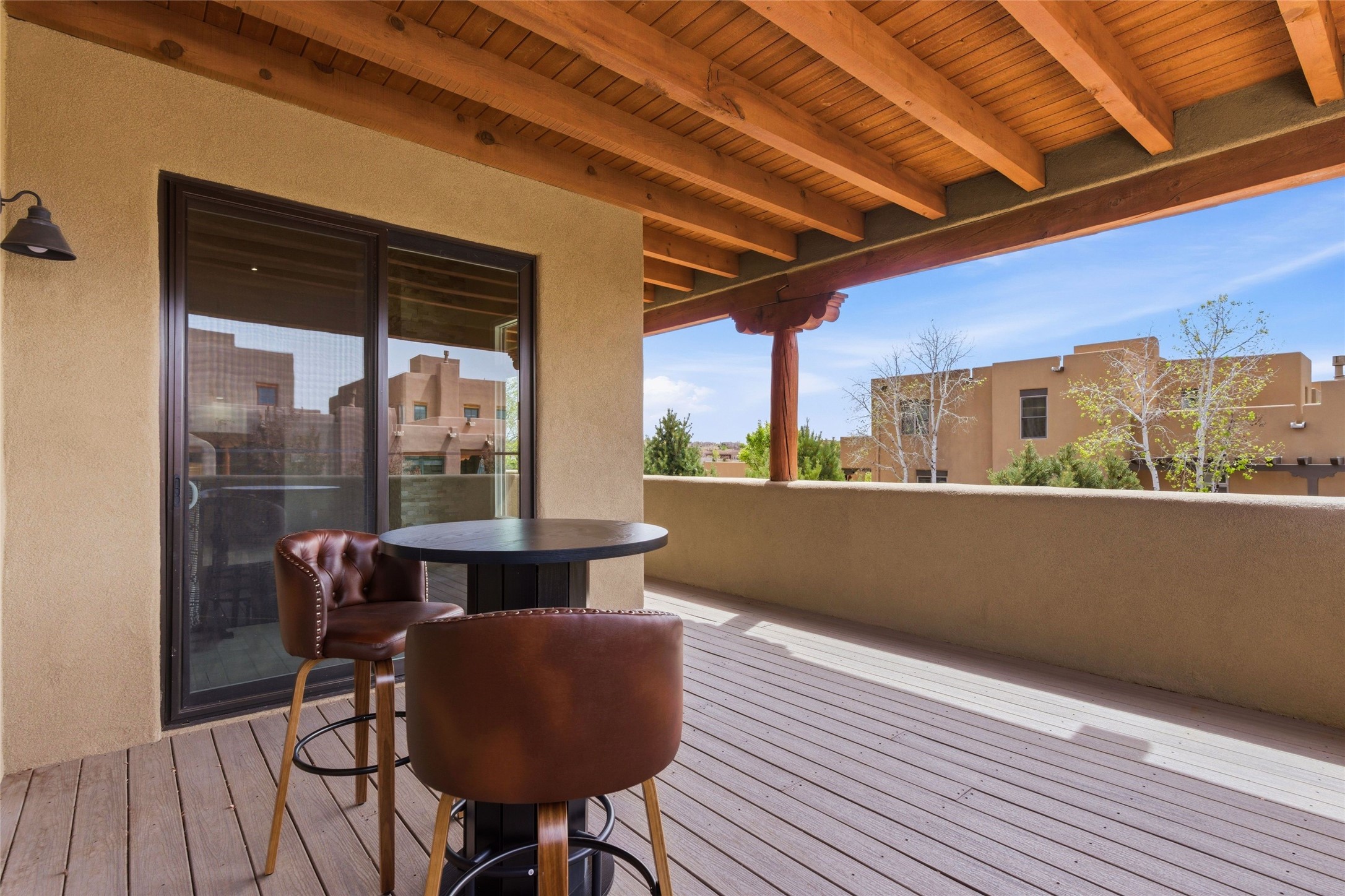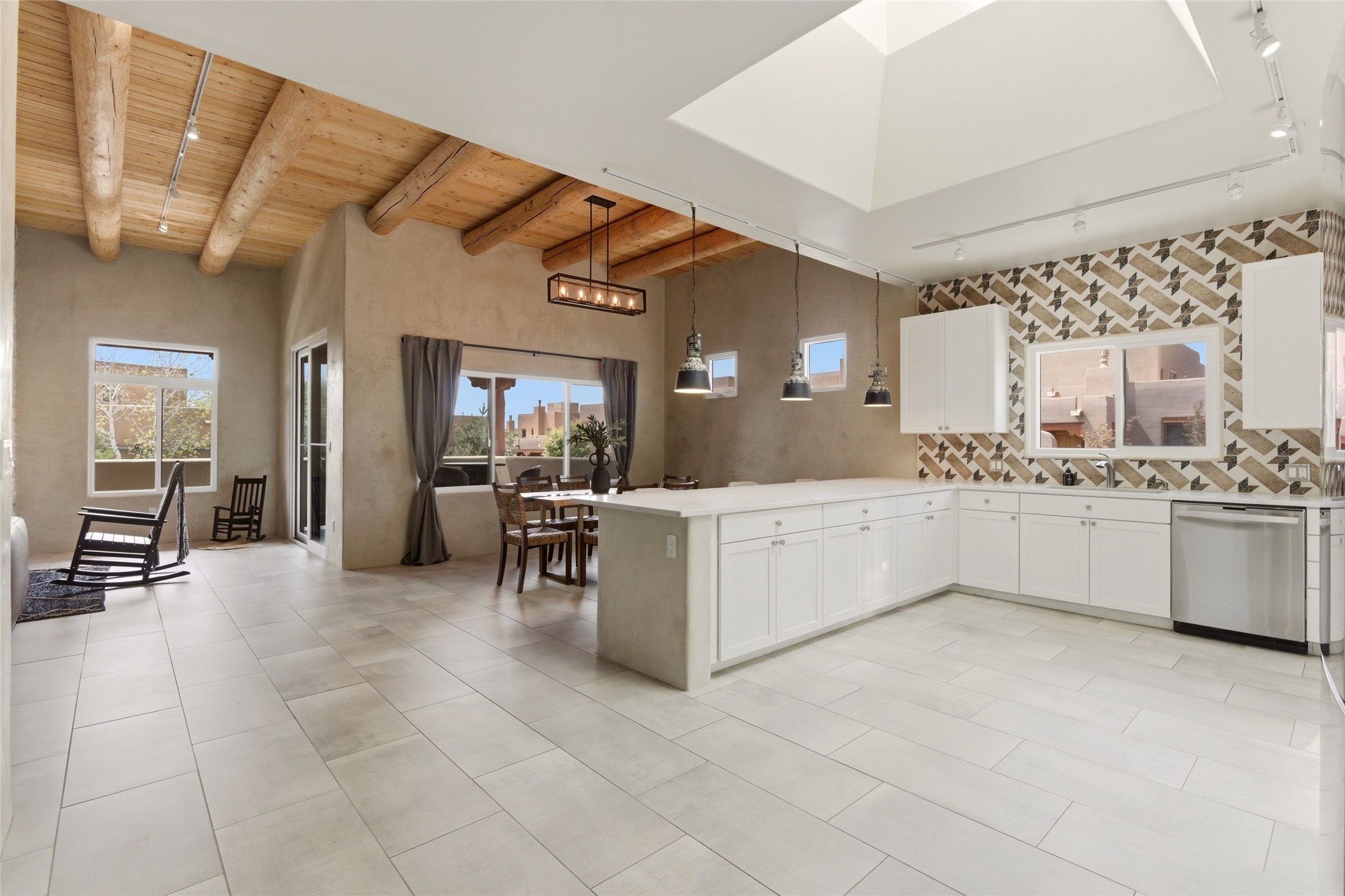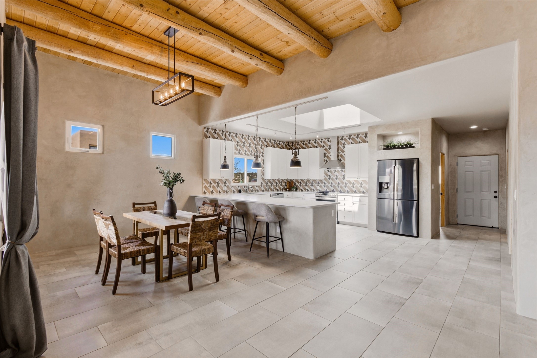 Sophistication meets classic Santa Fe style at 32 Calle Lemita, a beautifully designed home in the sought-after Aldea de Santa Fe community. This 3-bedroom, 3-bath residence sits on a 0.16-acre lot, offering abundant natural light and partial sunset views. The open-concept layout features soaring ceilings, upscale finishes, and seamless flow between the living, dining, and kitchen areas--ideal for everyday living and entertaining. The living room showcases a stacked stone fireplace, traditional vigas, and plaster walls throughout the main living spaces. The chef's kitchen is equipped with premium cabinetry with soft-close drawers, quartz countertops, designer tile backsplash, stainless steel appliances, and an large pantry/storage room (other options are wine storage/tasting room/office space). The primary suite offers a spa-like bath, an exceptionally customized walk-in closet, a separate shower, and a jacuzzi tub. Two additional oversized bedrooms provide flexibility for guests, office space, or hobbies. A dedicated laundry room includes a sink and built-in cabinetry. The home also features whole-house radiant heating and cooling. Adjacent to the heated and cooled four-car garage is a versatile flex space, ideal for a home gym or studio. Outdoor living includes a private enclosed courtyard and elevated patio designed to capture Santa Fe's stunning sunsets. There is also a side yard with dog run and doggy door into the heated/cooled garage.Additional upgrades include LED recessed lighting, floor-to-ceiling tile in select bathrooms, carved stone sinks, and other custom touches. Located about 20 minutes from the Santa Fe Plaza, Aldea de Santa Fe offers walking trails, pickleball, tennis, basketball courts, and community spaces near dining, galleries, and cultural attractions. Whether you're looking for a full-time residence or a lock-and-leave getaway, this home offers a perfect combination of comfort, privacy, and connection to Santa Fe's vibrant lifestyle.