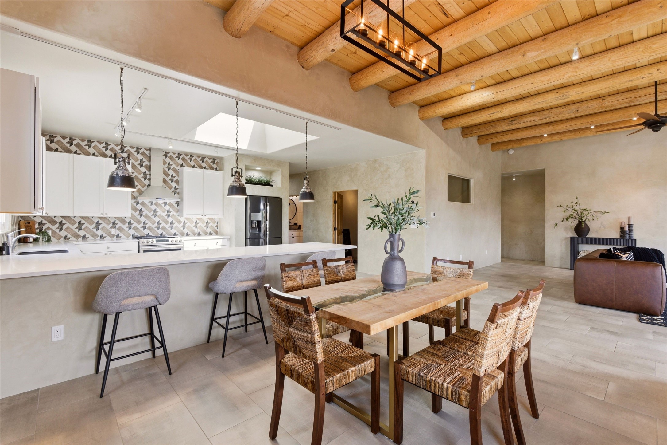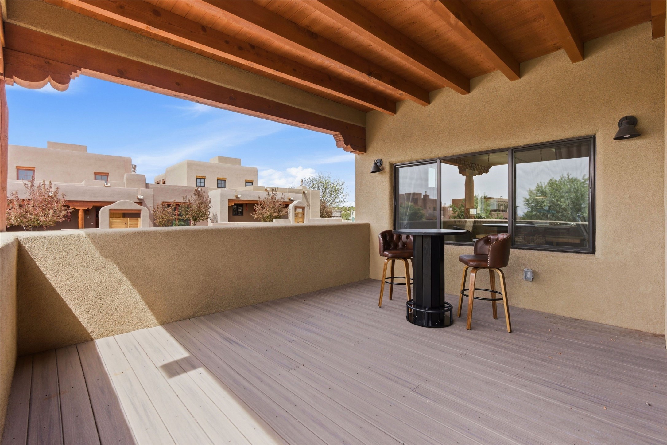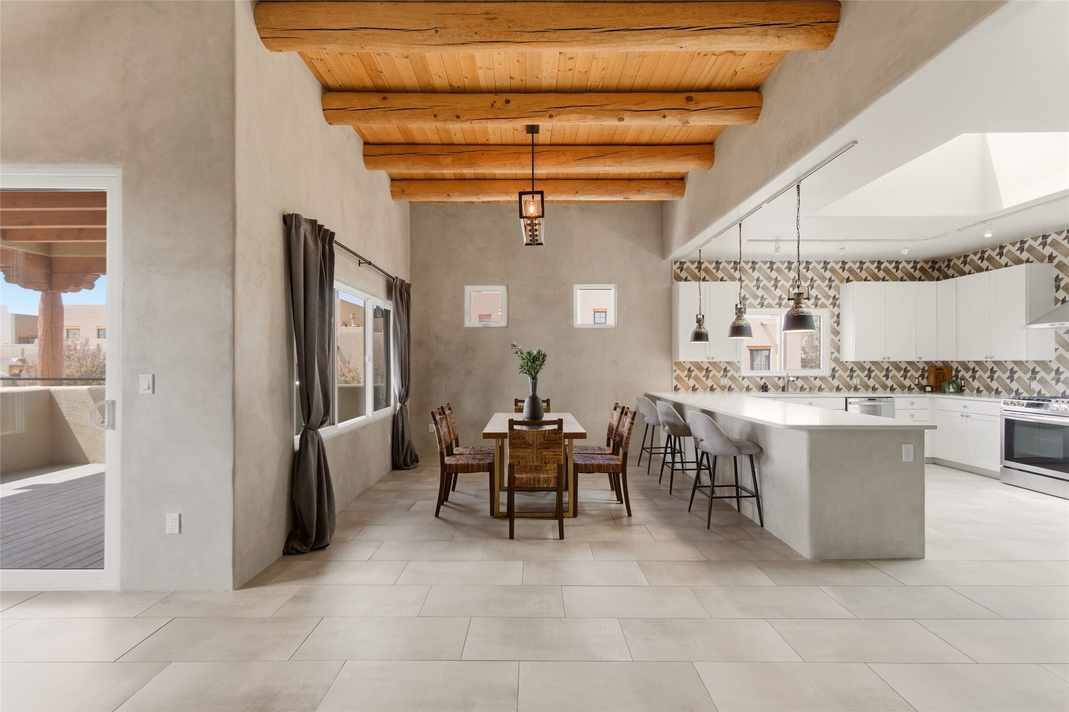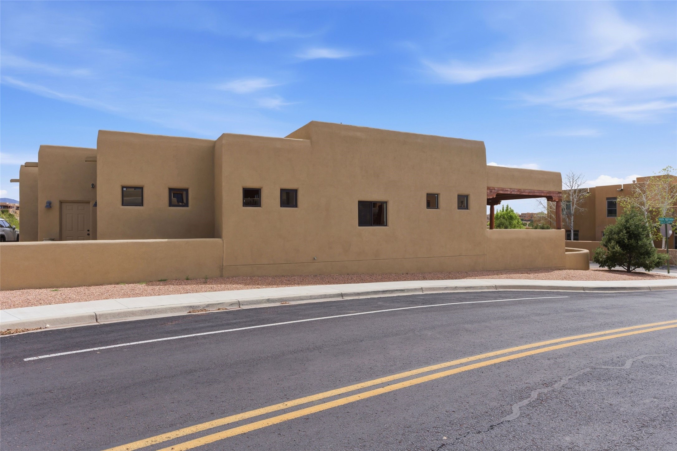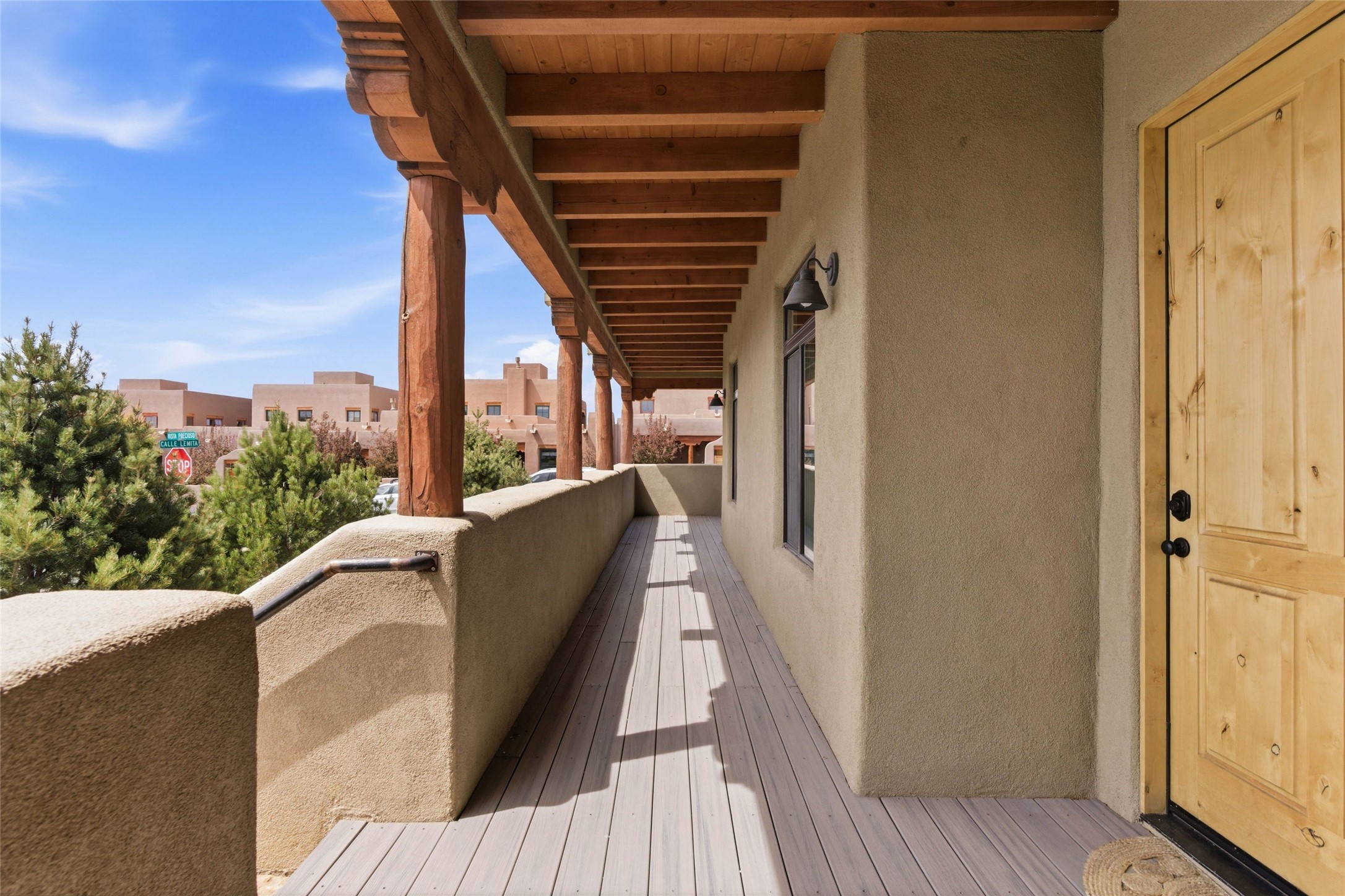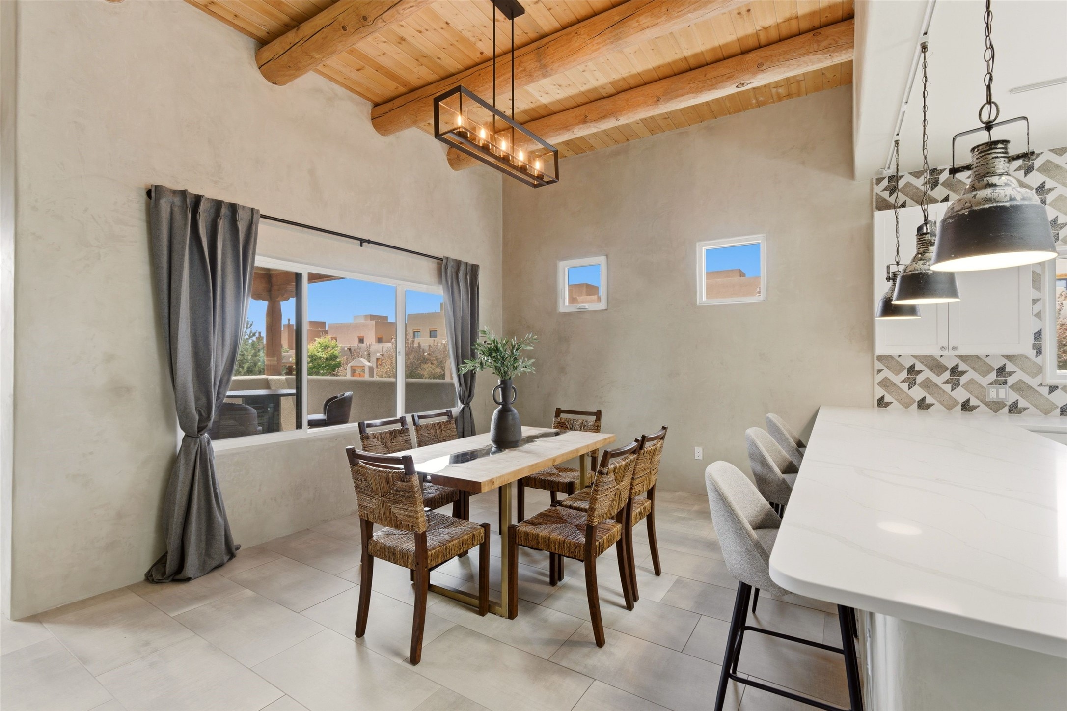 Sophistication meets classic Santa Fe style at 32 Calle Lemita, a beautifully designed home in the sought-after Aldea de Santa Fe community. This 3-bedroom, 3-bath residence sits on a 0.16-acre lot, offering abundant natural light and partial sunset views. The open-concept layout features soaring ceilings, upscale finishes, and seamless flow between the living, dining, and kitchen areas--ideal for everyday living and entertaining. The living room showcases a stacked stone fireplace, traditional vigas, and plaster walls throughout the main living spaces. The chef's kitchen is equipped with premium cabinetry with soft-close drawers, quartz countertops, designer tile backsplash, stainless steel appliances, and an large pantry/storage room (other options are wine storage/tasting room/office space). The primary suite offers a spa-like bath, an exceptionally customized walk-in closet, a separate shower, and a jacuzzi tub. Two additional oversized bedrooms provide flexibility for guests, office space, or hobbies. A dedicated laundry room includes a sink and built-in cabinetry. The home also features whole-house radiant heating and cooling. Adjacent to the heated and cooled four-car garage is a versatile flex space, ideal for a home gym or studio. Outdoor living includes a private enclosed courtyard and elevated patio designed to capture Santa Fe's stunning sunsets. There is also a side yard with dog run and doggy door into the heated/cooled garage.Additional upgrades include LED recessed lighting, floor-to-ceiling tile in select bathrooms, carved stone sinks, and other custom touches. Located about 20 minutes from the Santa Fe Plaza, Aldea de Santa Fe offers walking trails, pickleball, tennis, basketball courts, and community spaces near dining, galleries, and cultural attractions. Whether you're looking for a full-time residence or a lock-and-leave getaway, this home offers a perfect combination of comfort, privacy, and connection to Santa Fe's vibrant lifestyle.