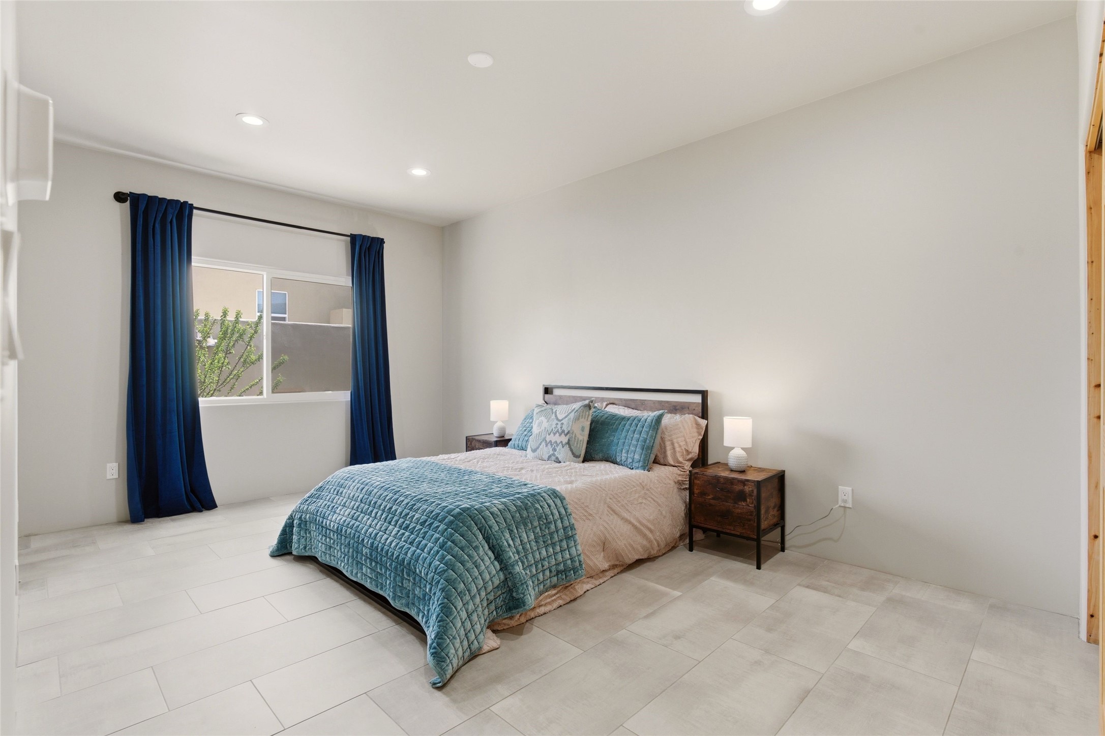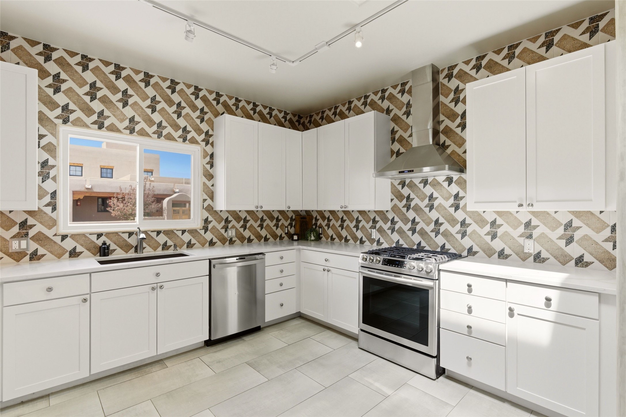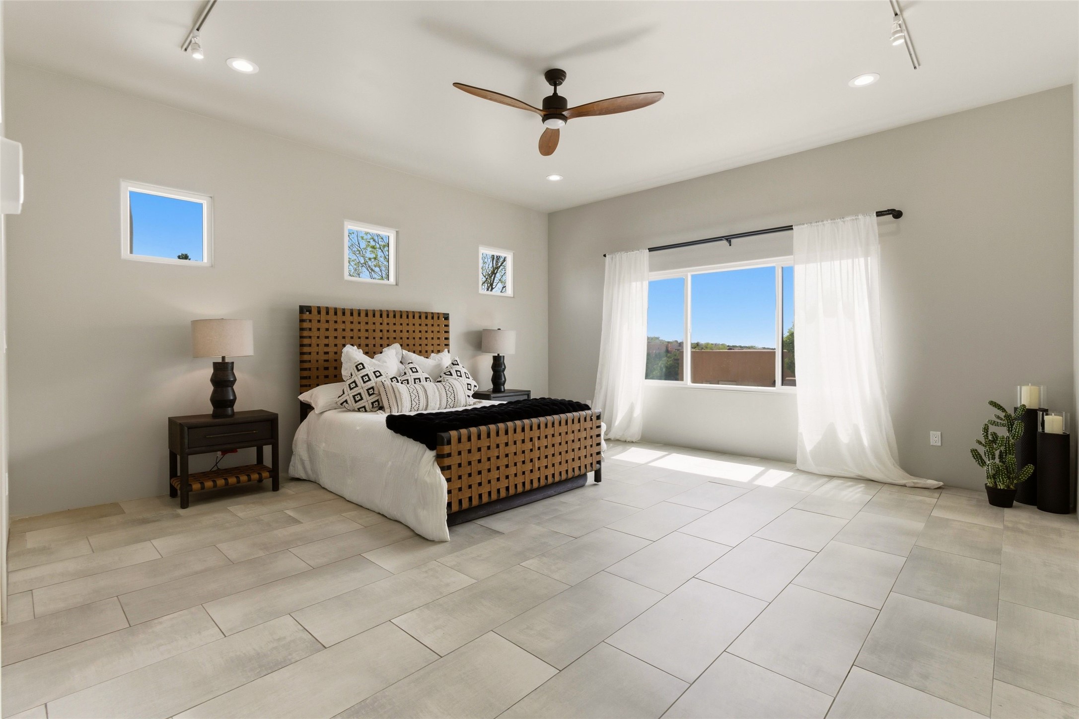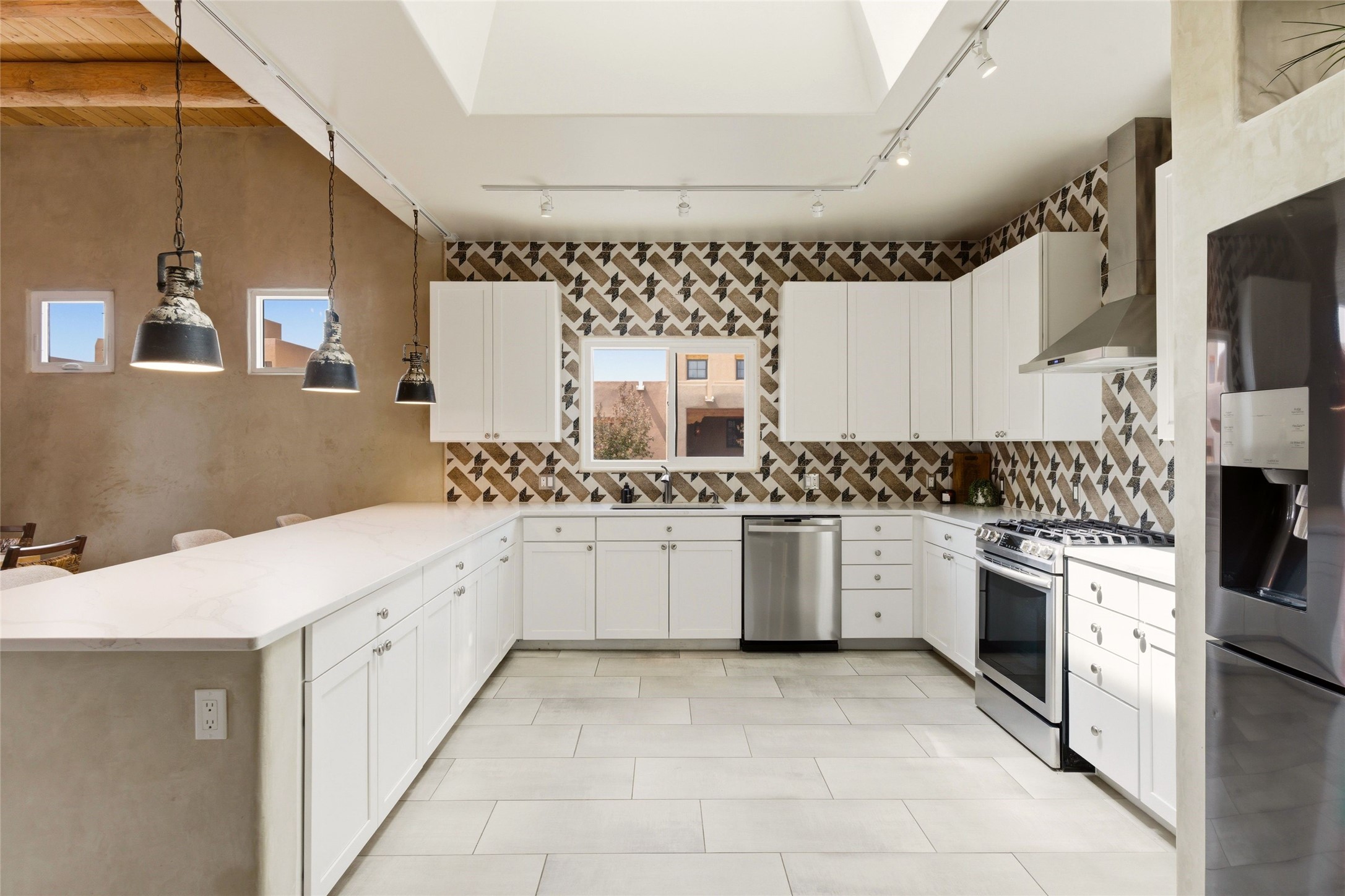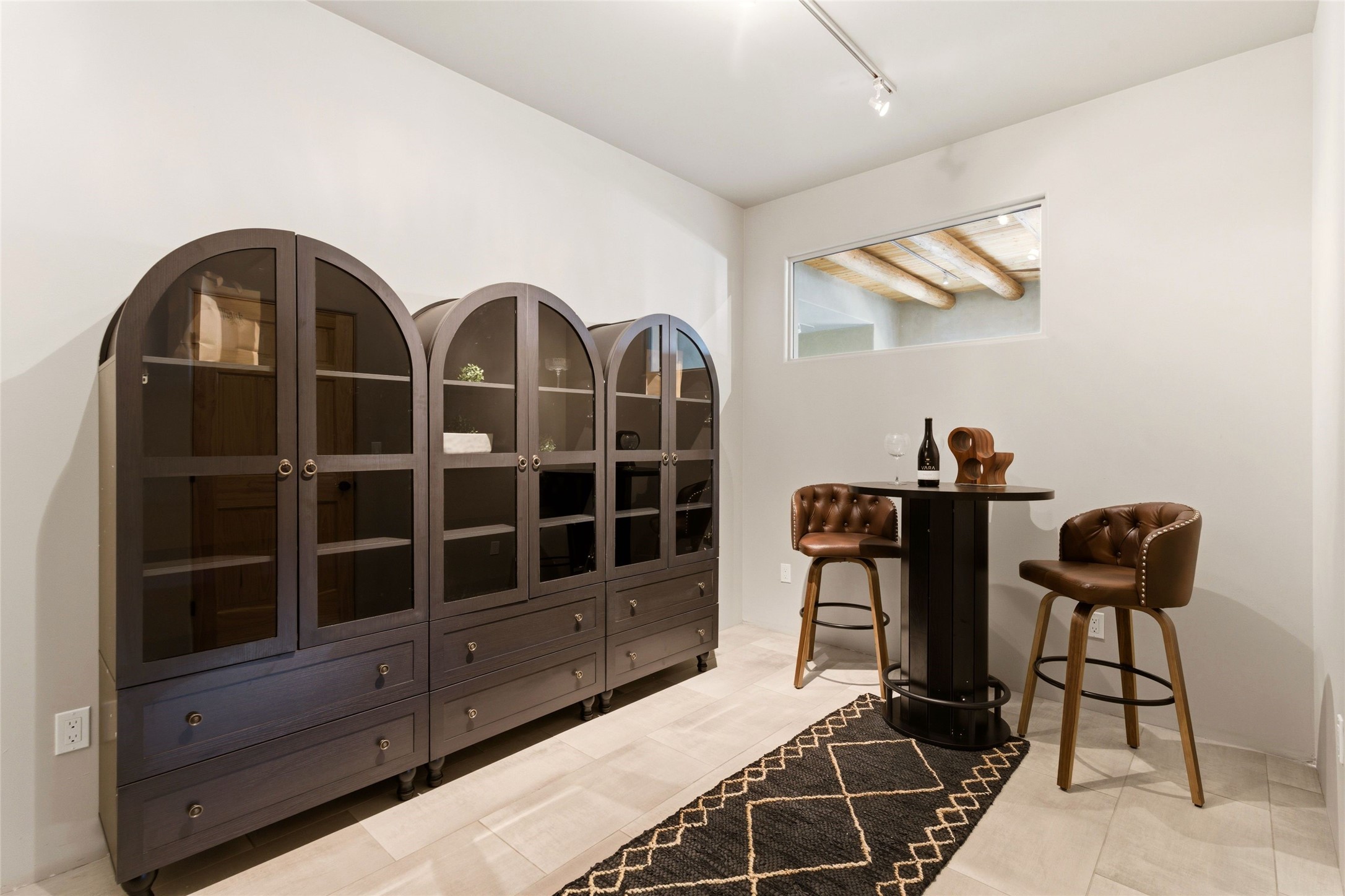 Sophistication meets classic Santa Fe style at 32 Calle Lemita, a beautifully designed home in the sought-after Aldea de Santa Fe community. This 3-bedroom, 3-bath residence sits on a 0.16-acre lot, offering abundant natural light and partial sunset views. The open-concept layout features soaring ceilings, upscale finishes, and seamless flow between the living, dining, and kitchen areas--ideal for everyday living and entertaining. The living room showcases a stacked stone fireplace, traditional vigas, and plaster walls throughout the main living spaces. The chef's kitchen is equipped with premium cabinetry with soft-close drawers, quartz countertops, designer tile backsplash, stainless steel appliances, and an large pantry/storage room (other options are wine storage/tasting room/office space). The primary suite offers a spa-like bath, an exceptionally customized walk-in closet, a separate shower, and a jacuzzi tub. Two additional oversized bedrooms provide flexibility for guests, office space, or hobbies. A dedicated laundry room includes a sink and built-in cabinetry. The home also features whole-house radiant heating and cooling. Adjacent to the heated and cooled four-car garage is a versatile flex space, ideal for a home gym or studio. Outdoor living includes a private enclosed courtyard and elevated patio designed to capture Santa Fe's stunning sunsets. There is also a side yard with dog run and doggy door into the heated/cooled garage.Additional upgrades include LED recessed lighting, floor-to-ceiling tile in select bathrooms, carved stone sinks, and other custom touches. Located about 20 minutes from the Santa Fe Plaza, Aldea de Santa Fe offers walking trails, pickleball, tennis, basketball courts, and community spaces near dining, galleries, and cultural attractions. Whether you're looking for a full-time residence or a lock-and-leave getaway, this home offers a perfect combination of comfort, privacy, and connection to Santa Fe's vibrant lifestyle.