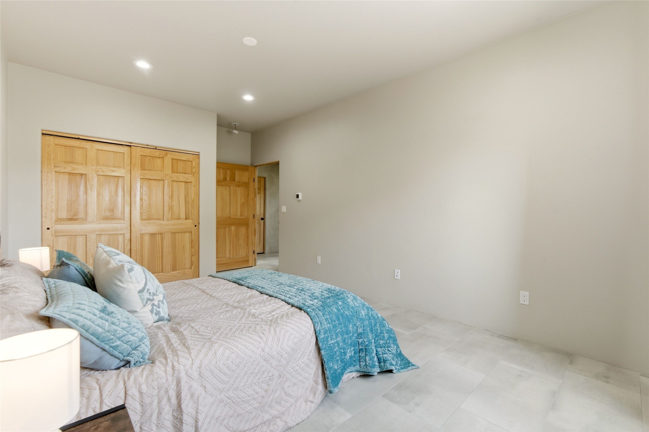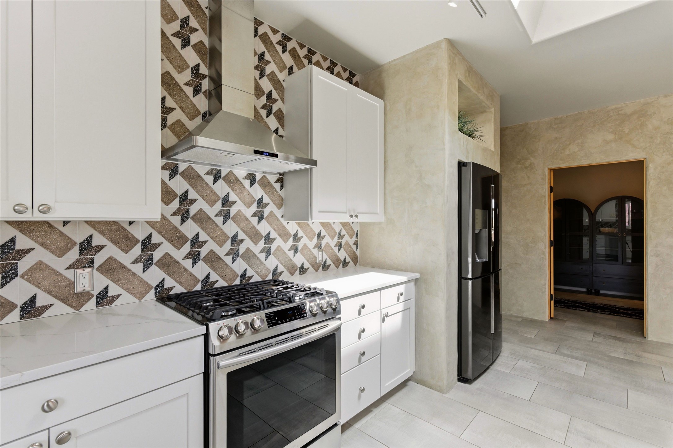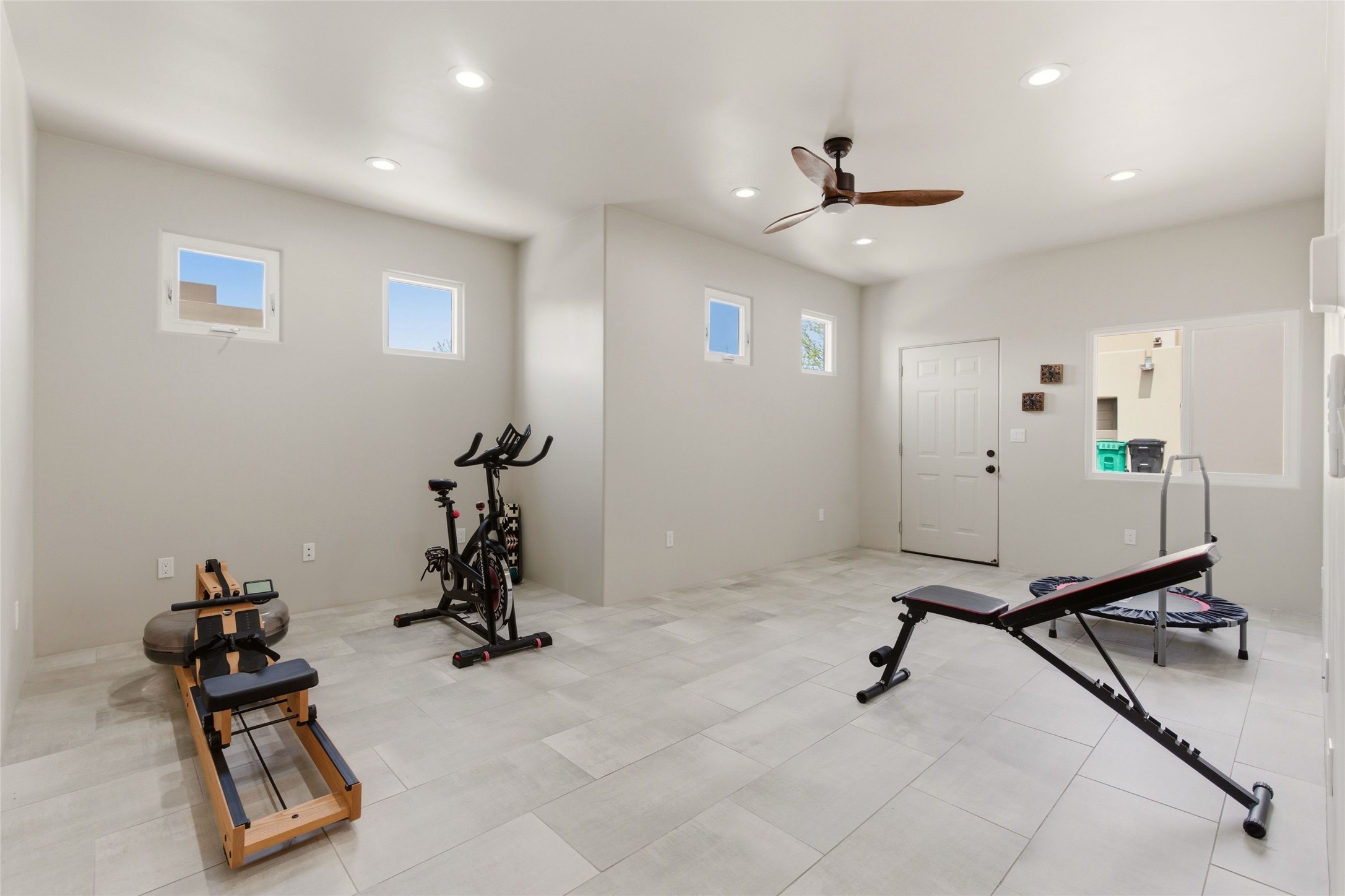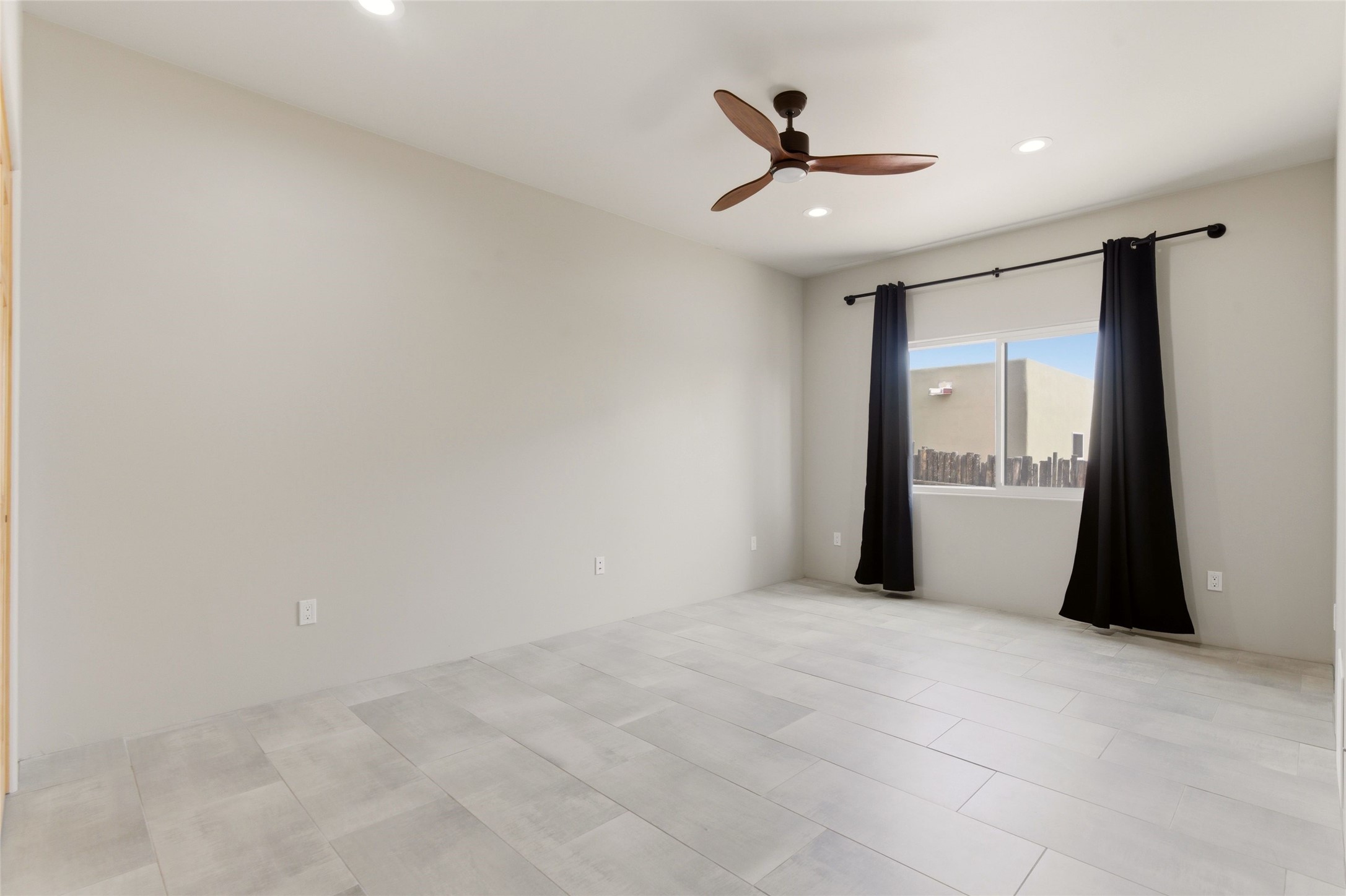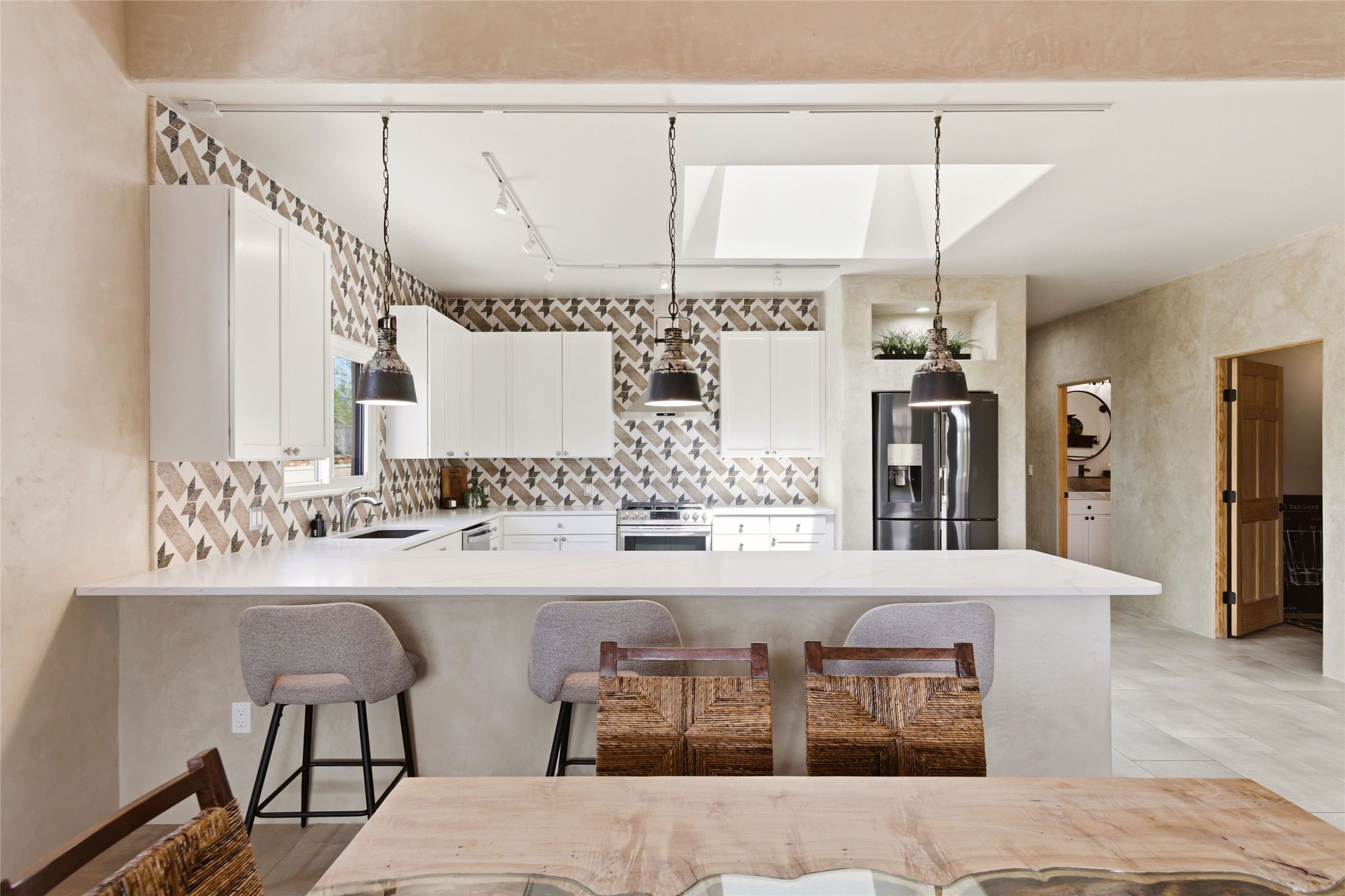 Sophistication meets classic Santa Fe style at 32 Calle Lemita, a beautifully designed home in the sought-after Aldea de Santa Fe community. This 3-bedroom, 3-bath residence sits on a 0.16-acre lot, offering abundant natural light and partial sunset views. The open-concept layout features soaring ceilings, upscale finishes, and seamless flow between the living, dining, and kitchen areas--ideal for everyday living and entertaining. The living room showcases a stacked stone fireplace, traditional vigas, and plaster walls throughout the main living spaces. The chef's kitchen is equipped with premium cabinetry with soft-close drawers, quartz countertops, designer tile backsplash, stainless steel appliances, and an large pantry/storage room (other options are wine storage/tasting room/office space). The primary suite offers a spa-like bath, an exceptionally customized walk-in closet, a separate shower, and a jacuzzi tub. Two additional oversized bedrooms provide flexibility for guests, office space, or hobbies. A dedicated laundry room includes a sink and built-in cabinetry. The home also features whole-house radiant heating and cooling. Adjacent to the heated and cooled four-car garage is a versatile flex space, ideal for a home gym or studio. Outdoor living includes a private enclosed courtyard and elevated patio designed to capture Santa Fe's stunning sunsets. There is also a side yard with dog run and doggy door into the heated/cooled garage.Additional upgrades include LED recessed lighting, floor-to-ceiling tile in select bathrooms, carved stone sinks, and other custom touches. Located about 20 minutes from the Santa Fe Plaza, Aldea de Santa Fe offers walking trails, pickleball, tennis, basketball courts, and community spaces near dining, galleries, and cultural attractions. Whether you're looking for a full-time residence or a lock-and-leave getaway, this home offers a perfect combination of comfort, privacy, and connection to Santa Fe's vibrant lifestyle.