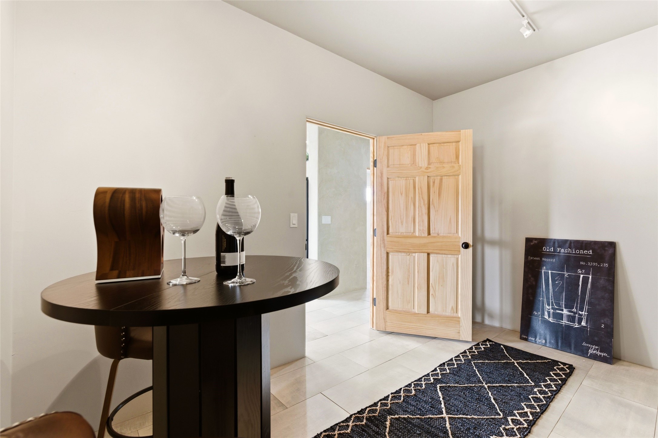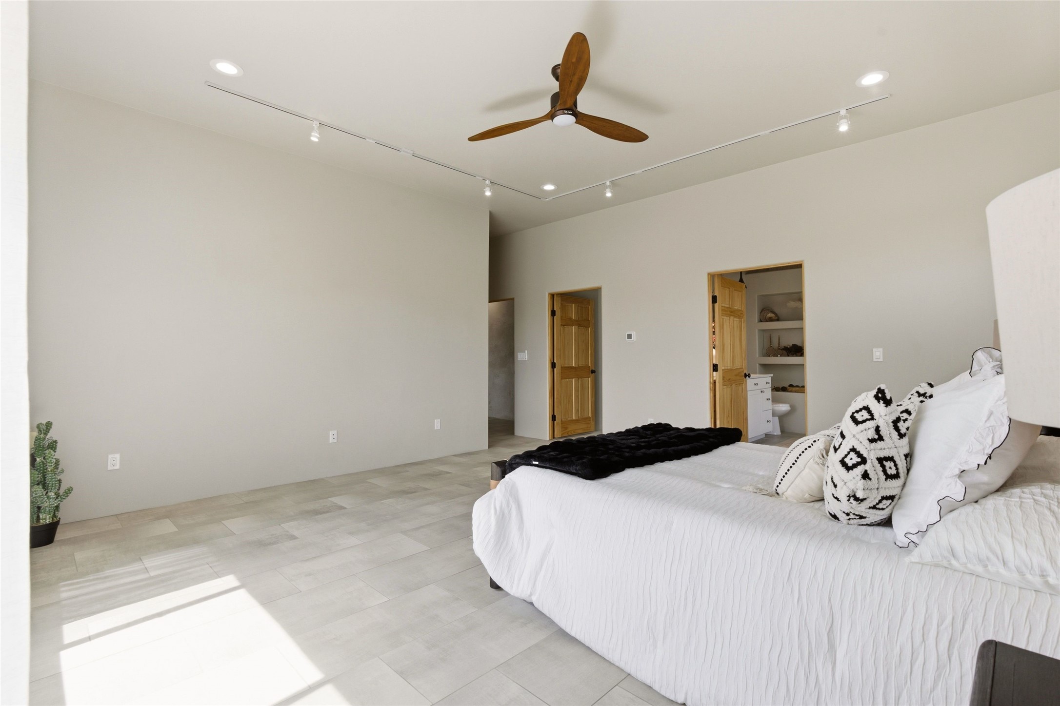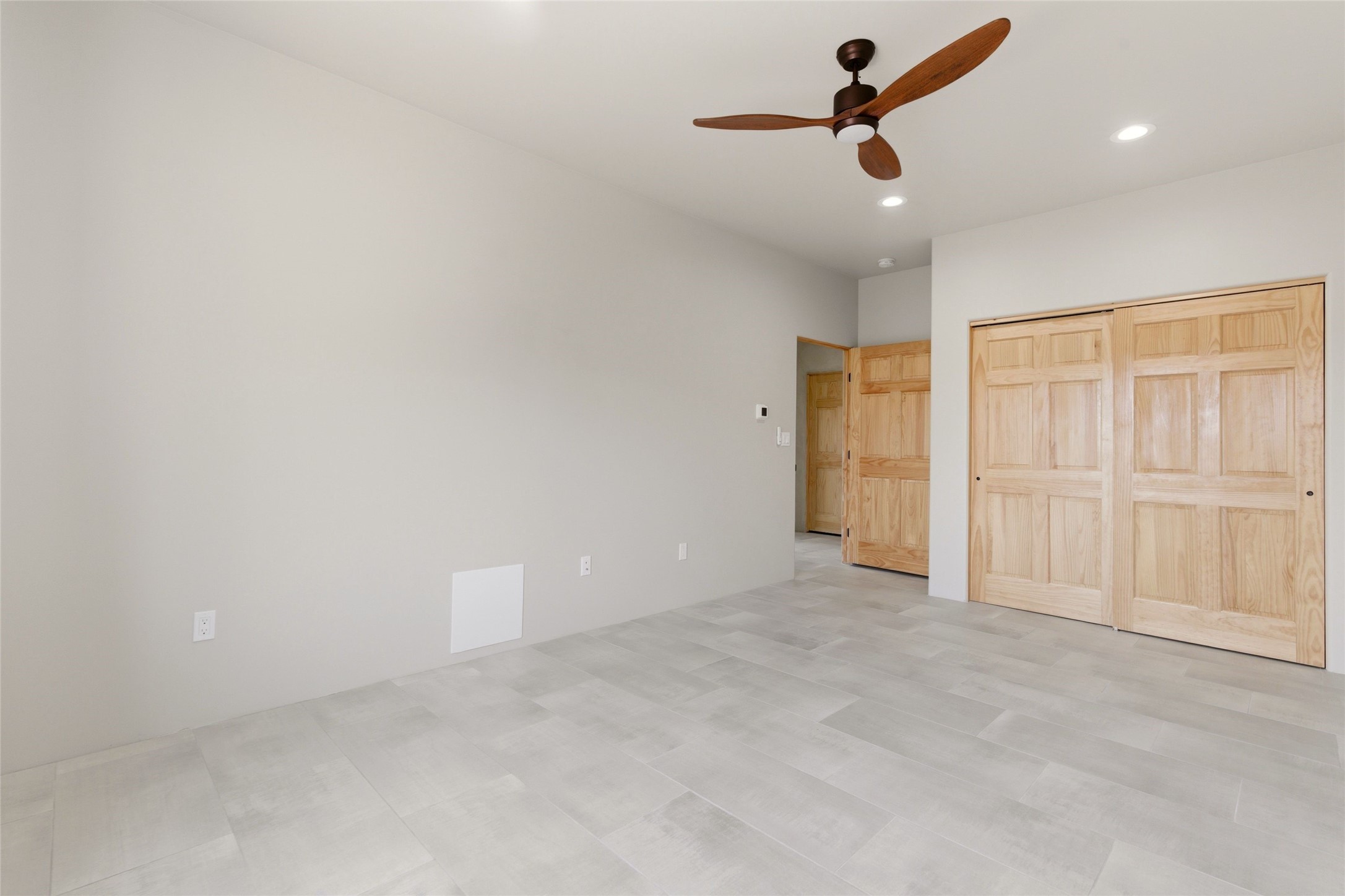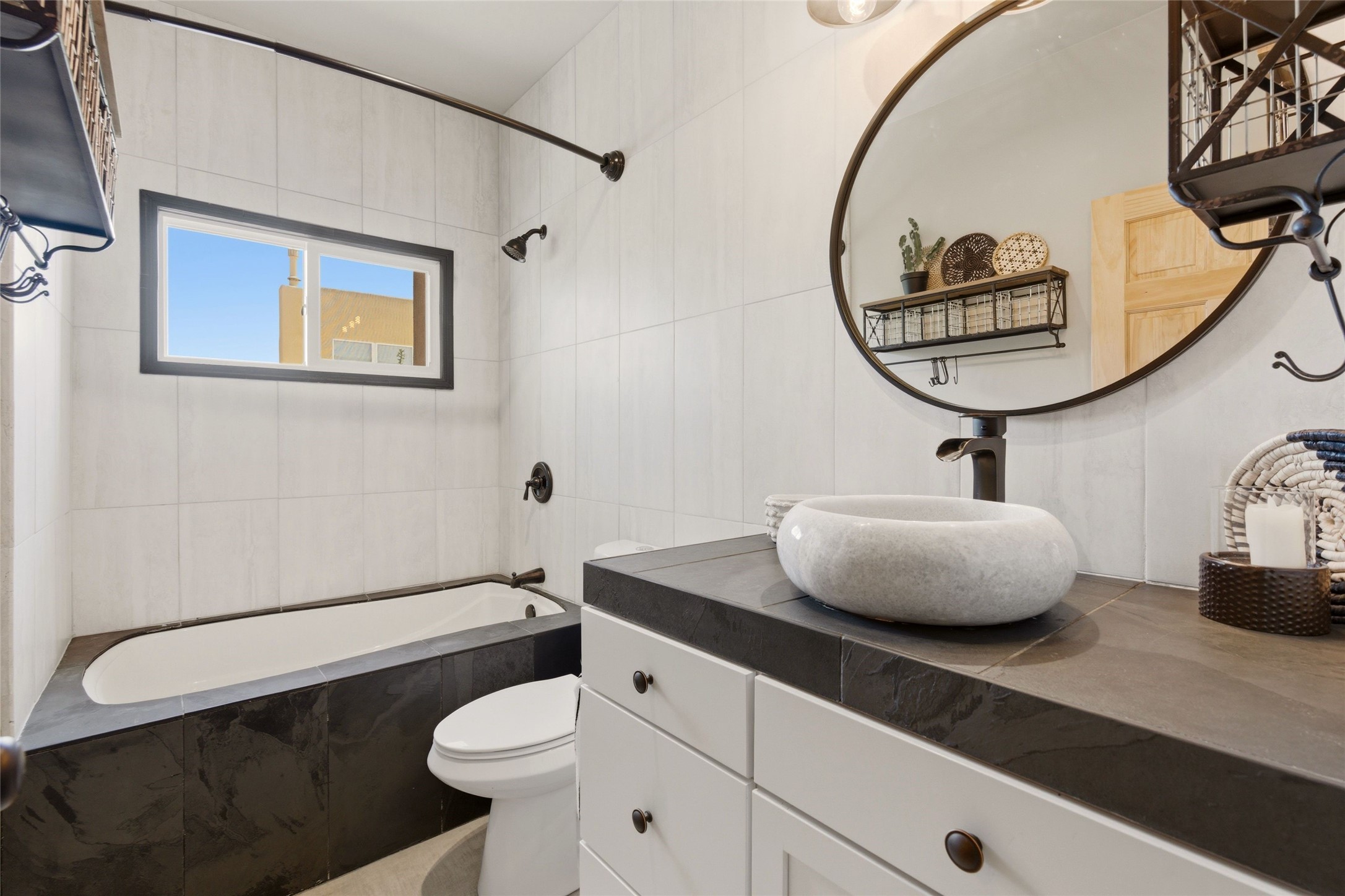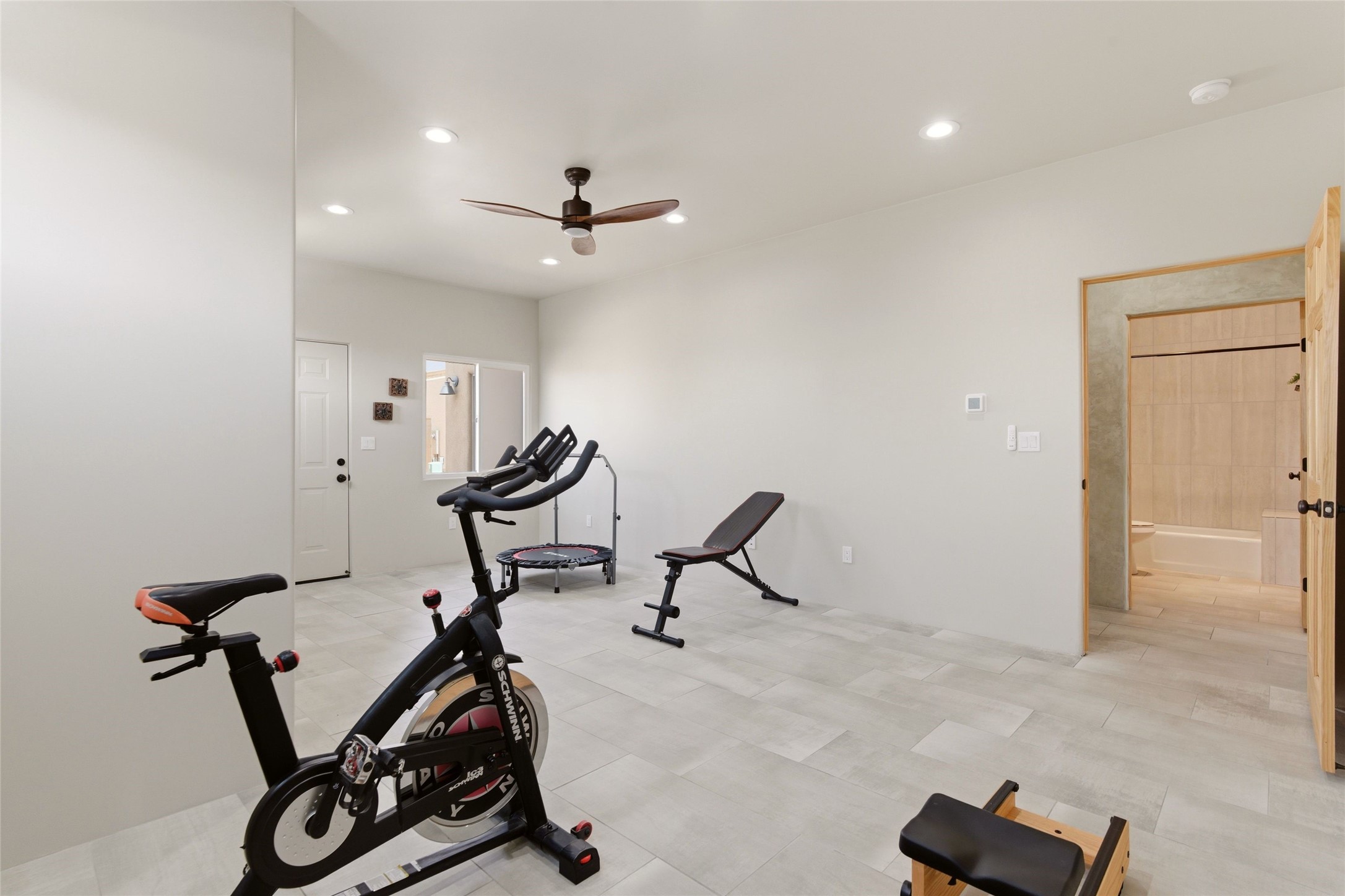 Sophistication meets classic Santa Fe style at 32 Calle Lemita, a beautifully designed home in the sought-after Aldea de Santa Fe community. This 3-bedroom, 3-bath residence sits on a 0.16-acre lot, offering abundant natural light and partial sunset views. The open-concept layout features soaring ceilings, upscale finishes, and seamless flow between the living, dining, and kitchen areas--ideal for everyday living and entertaining. The living room showcases a stacked stone fireplace, traditional vigas, and plaster walls throughout the main living spaces. The chef's kitchen is equipped with premium cabinetry with soft-close drawers, quartz countertops, designer tile backsplash, stainless steel appliances, and an large pantry/storage room (other options are wine storage/tasting room/office space). The primary suite offers a spa-like bath, an exceptionally customized walk-in closet, a separate shower, and a jacuzzi tub. Two additional oversized bedrooms provide flexibility for guests, office space, or hobbies. A dedicated laundry room includes a sink and built-in cabinetry. The home also features whole-house radiant heating and cooling. Adjacent to the heated and cooled four-car garage is a versatile flex space, ideal for a home gym or studio. Outdoor living includes a private enclosed courtyard and elevated patio designed to capture Santa Fe's stunning sunsets. There is also a side yard with dog run and doggy door into the heated/cooled garage.Additional upgrades include LED recessed lighting, floor-to-ceiling tile in select bathrooms, carved stone sinks, and other custom touches. Located about 20 minutes from the Santa Fe Plaza, Aldea de Santa Fe offers walking trails, pickleball, tennis, basketball courts, and community spaces near dining, galleries, and cultural attractions. Whether you're looking for a full-time residence or a lock-and-leave getaway, this home offers a perfect combination of comfort, privacy, and connection to Santa Fe's vibrant lifestyle.